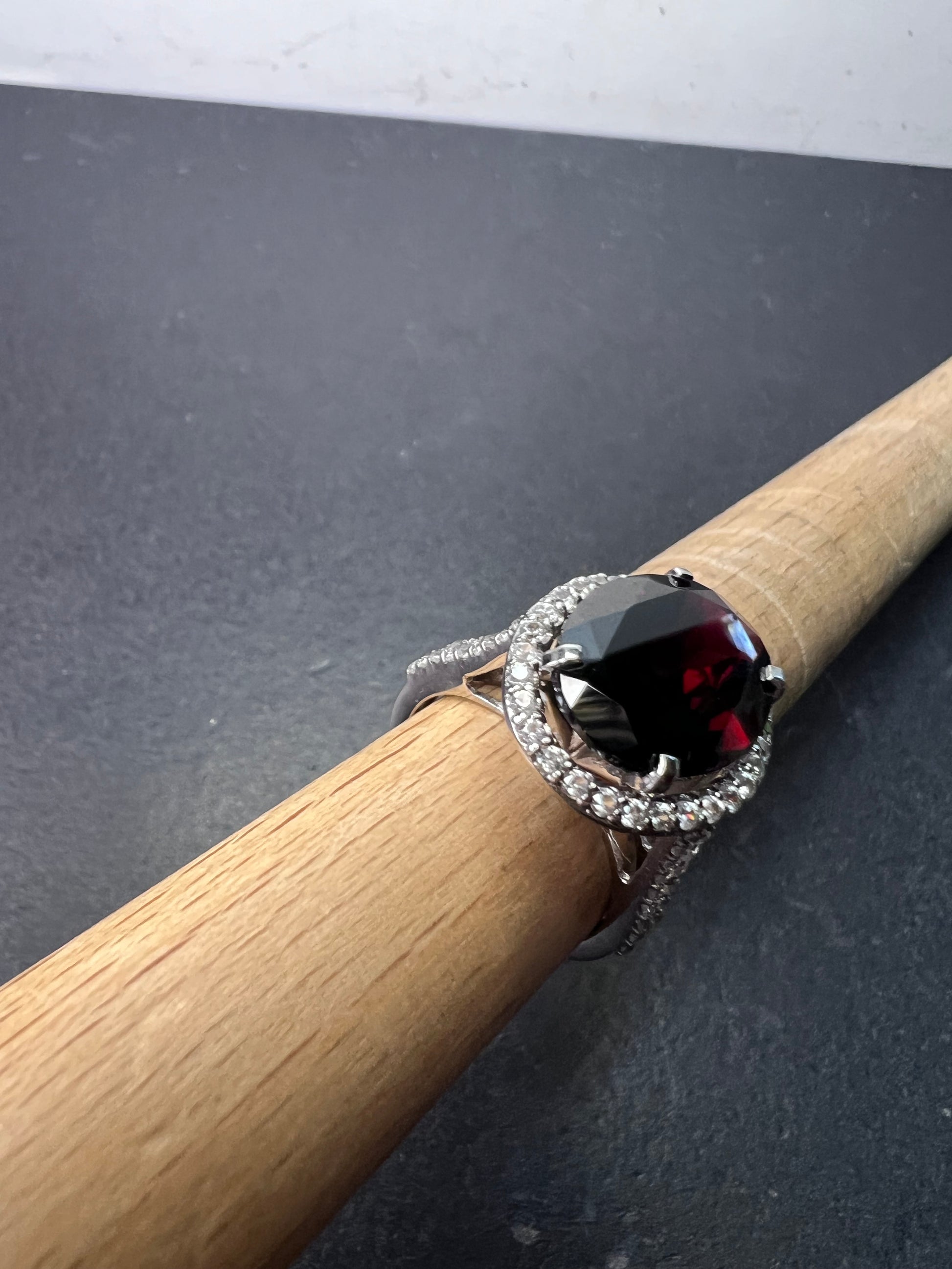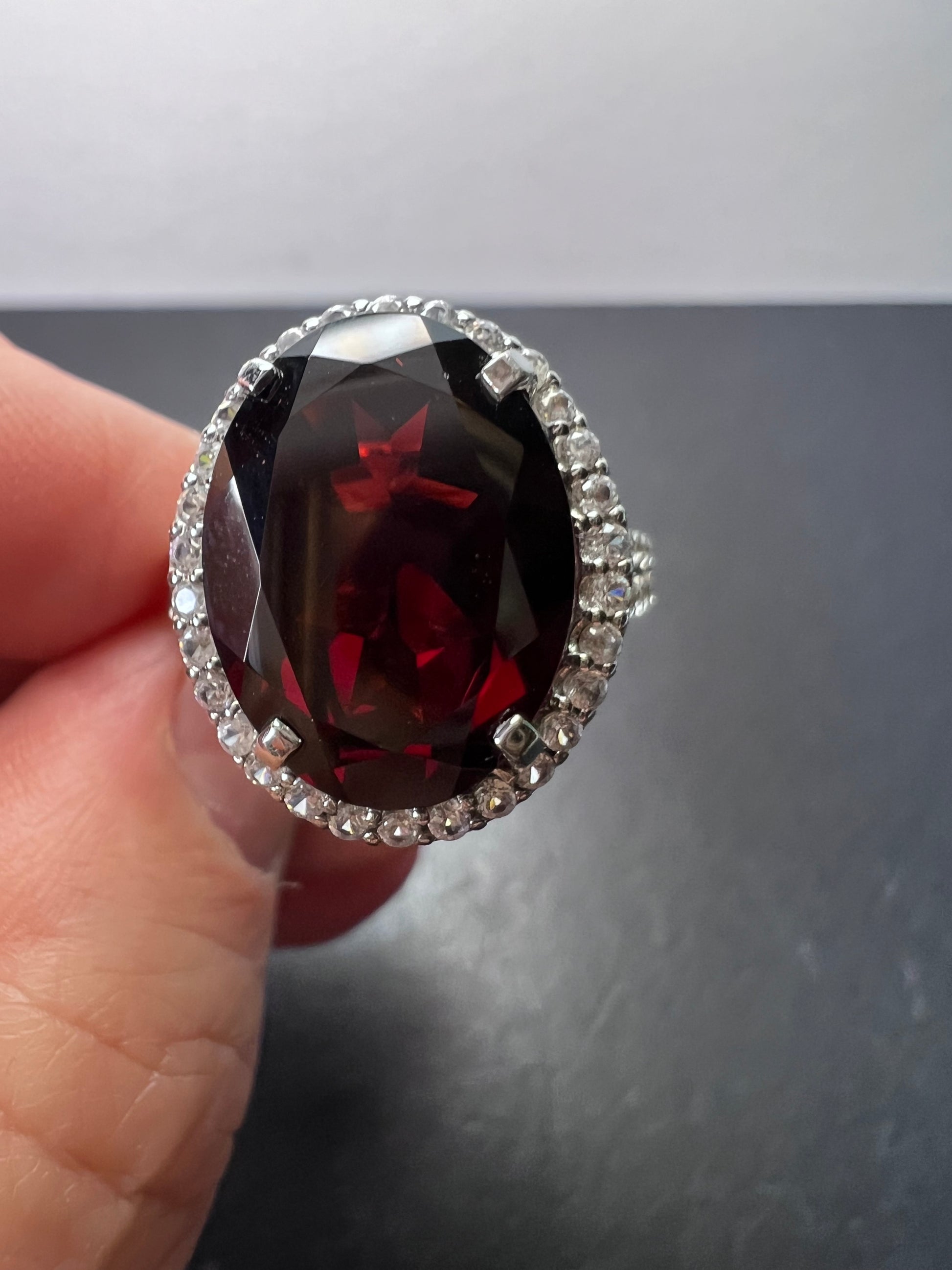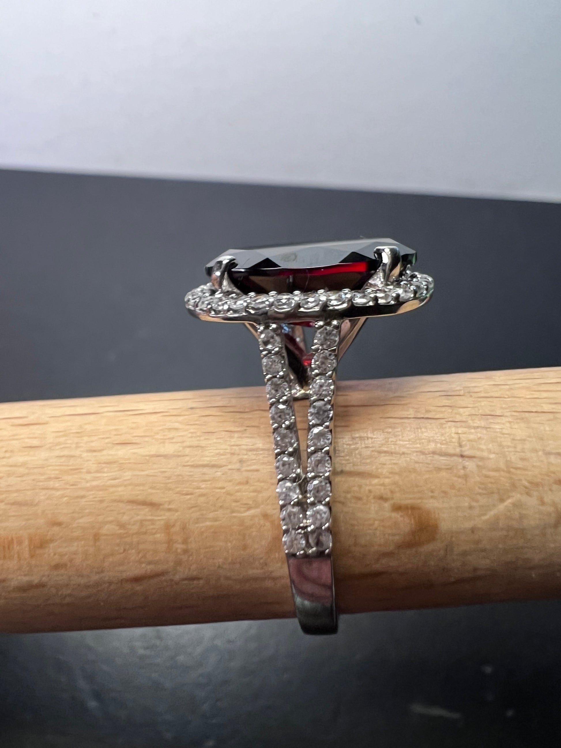Big huge genuine red oval cut garnet gemstone surrounded by white zircon accent stones around the halo. This is rhodium or platinum plated over authentic 925 sterling silver. Size 9 . STS for Chuck Clemency
