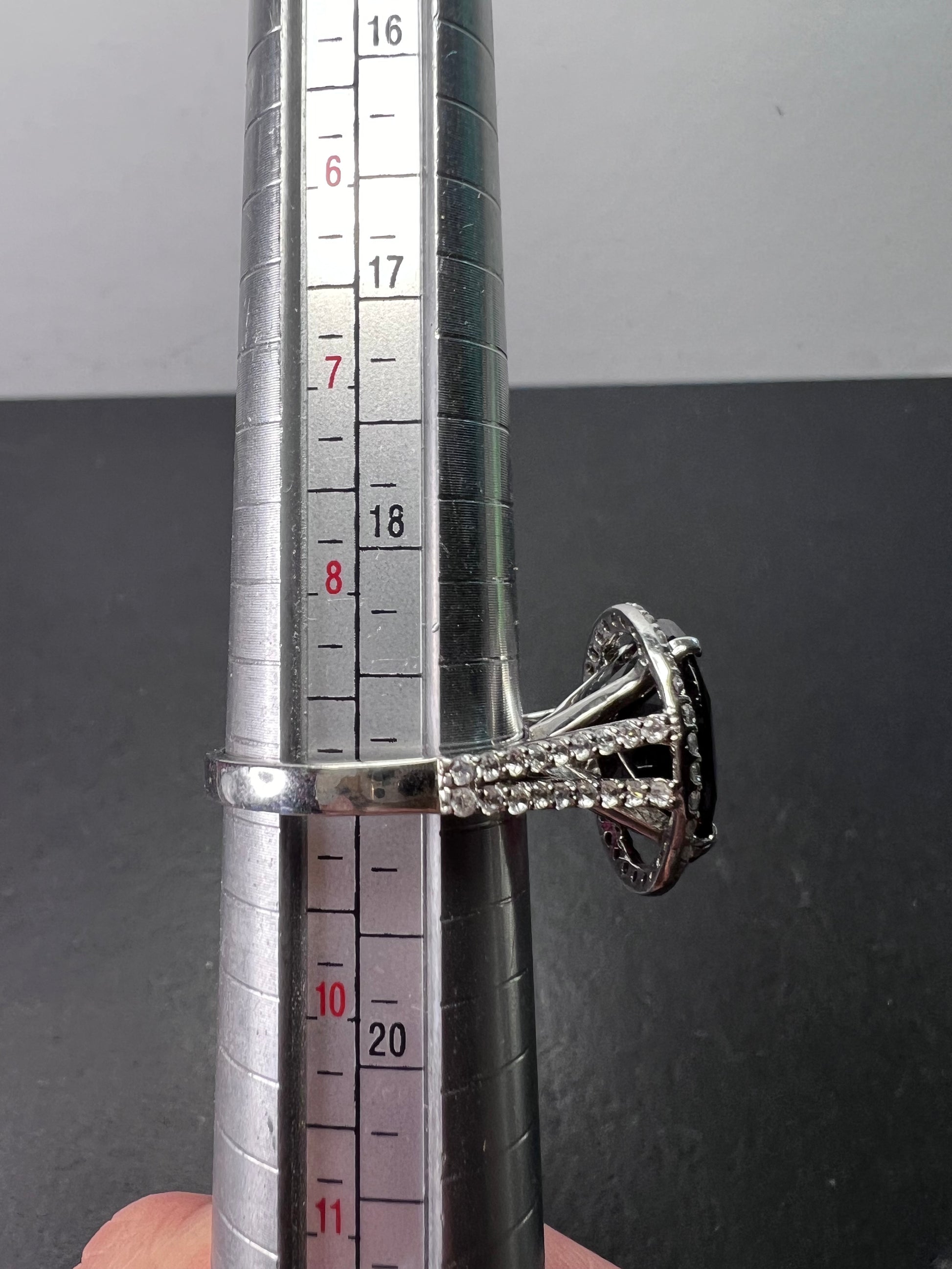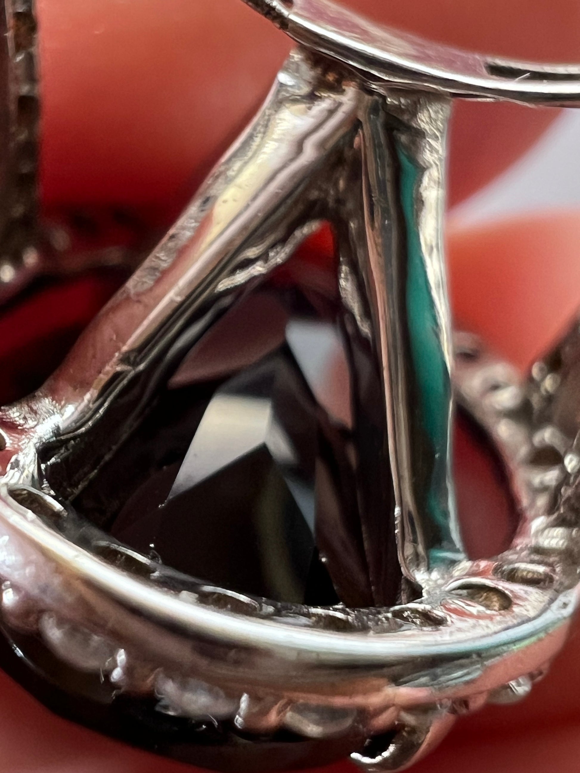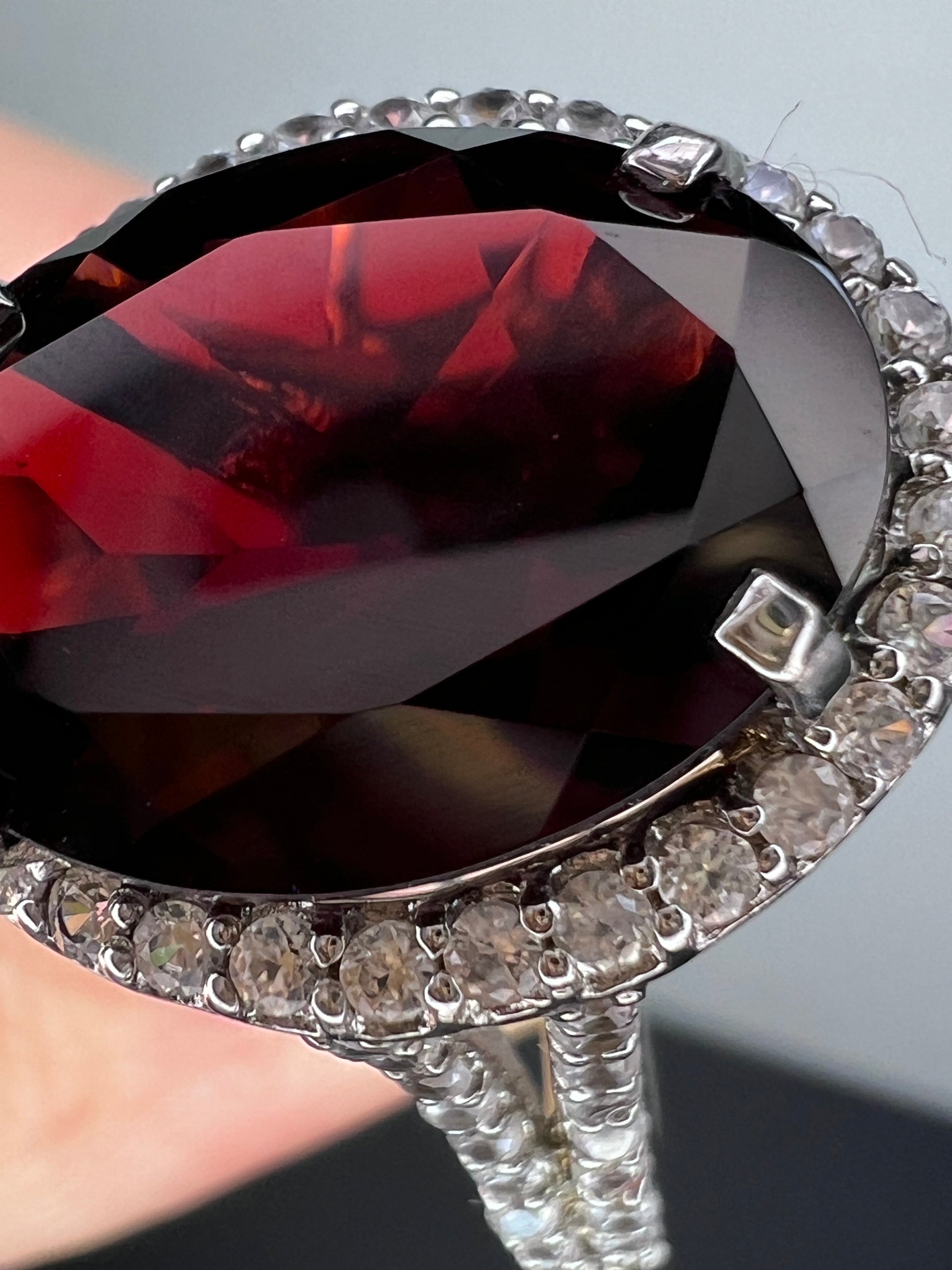 Big huge genuine red oval cut garnet gemstone surrounded by white zircon accent stones around the halo. This is rhodium or platinum plated over authentic 925 sterling silver. Size 9 . STS for Chuck Clemency