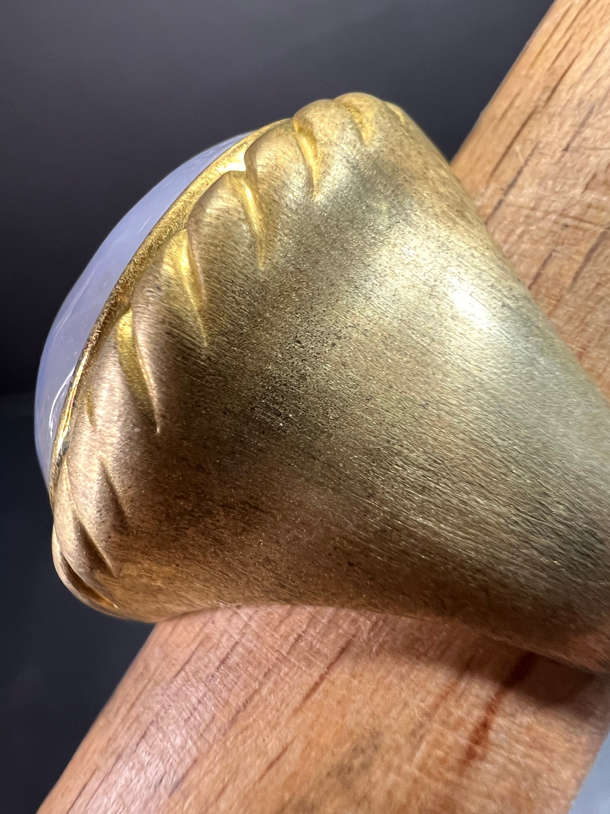 Glow By Sheila Fajl Signed 18k yellow brushed gold plate with a blue agate / chalcedony stone. Size 7. Made in Thailand.