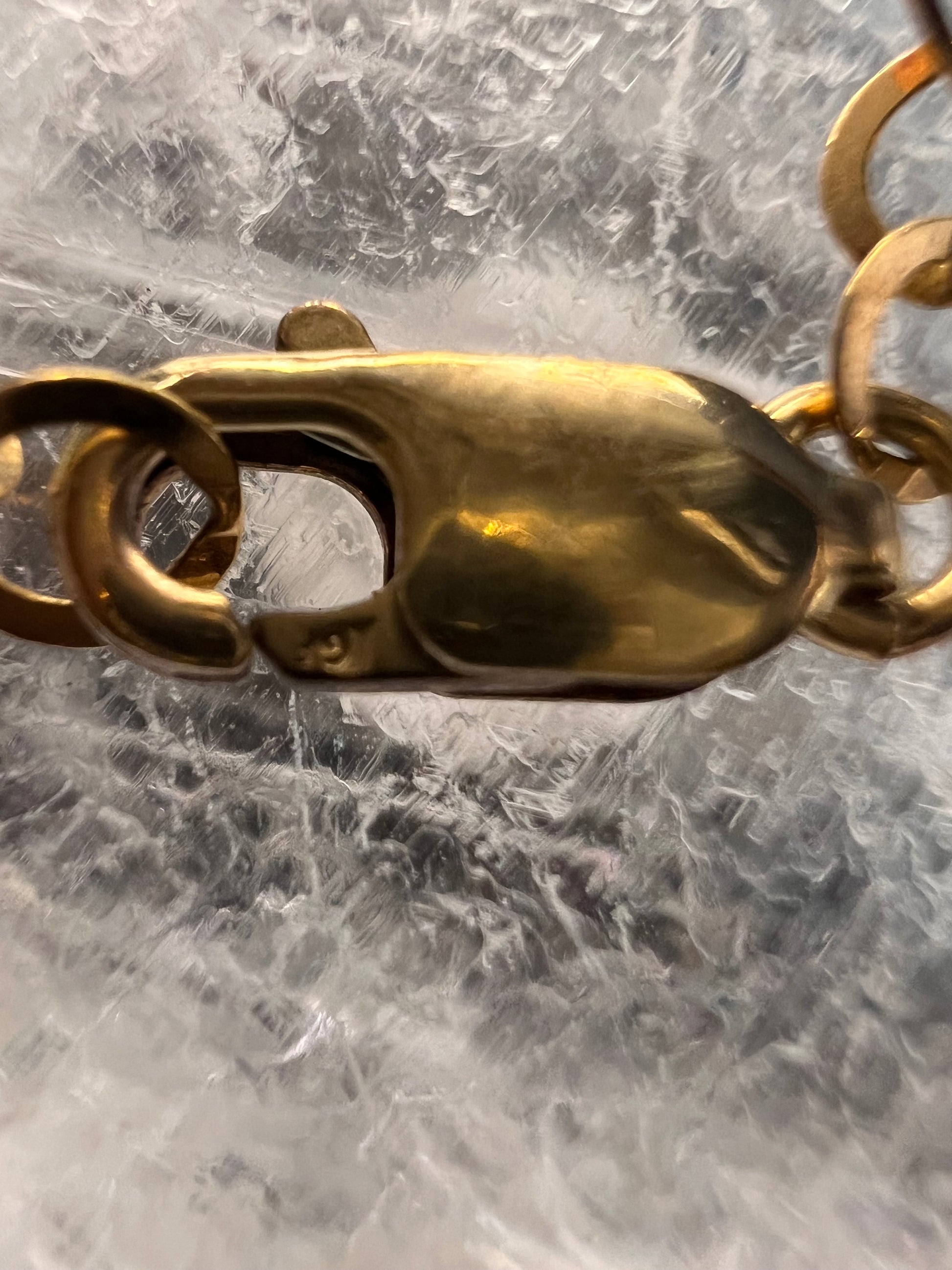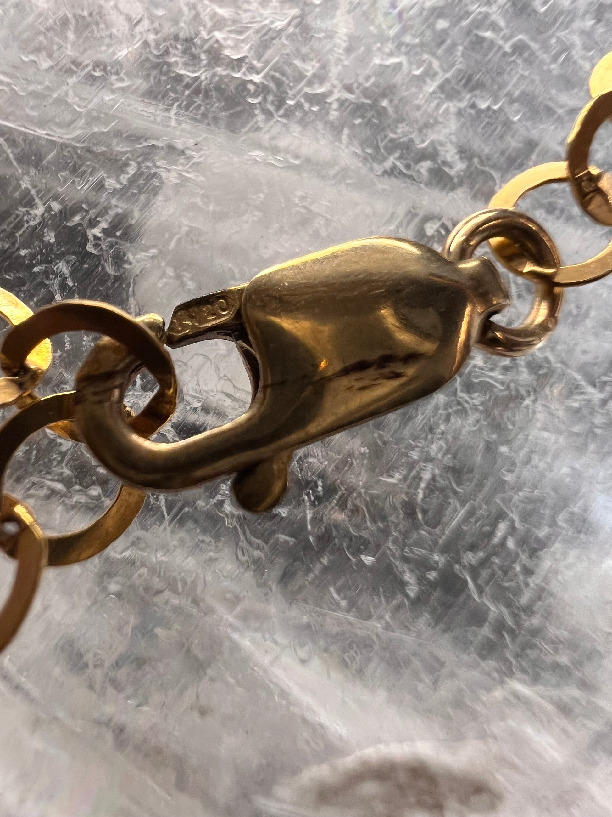 The necklace is made with Gold-Filled (GF) metal, confirmed by the 1/20 GF stamp on the lobster clasp. This durable construction ensures a quality finish. This piece is perfect for wearing alone or layering.