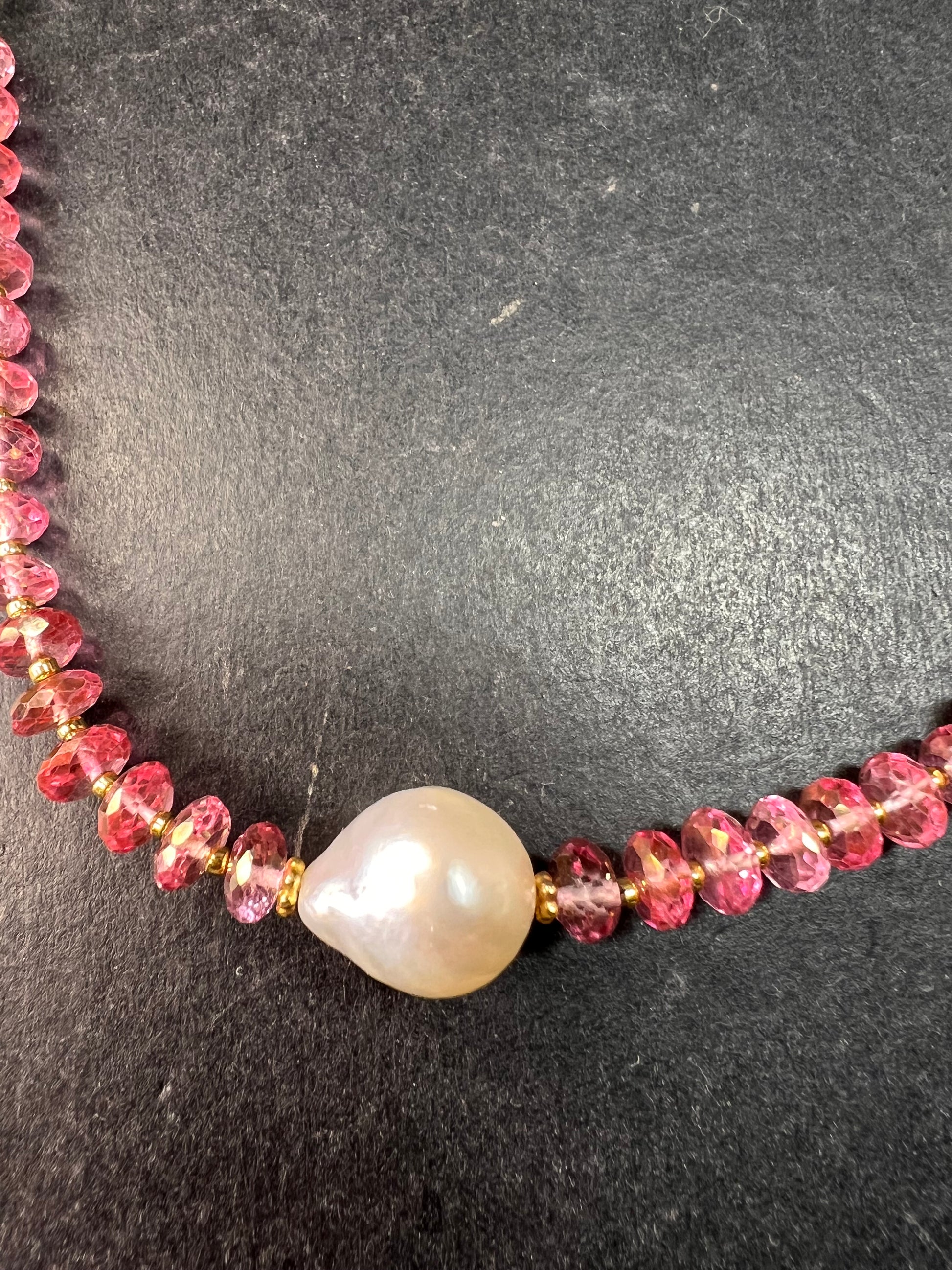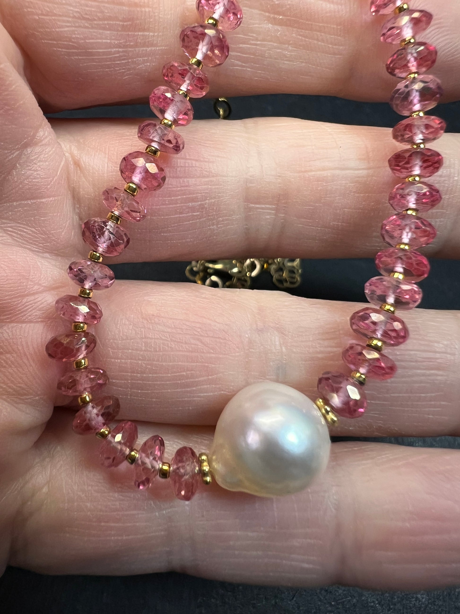 Gold Filled Necklace with Baroque Pearl and Pink Faceted Gemstone Beads