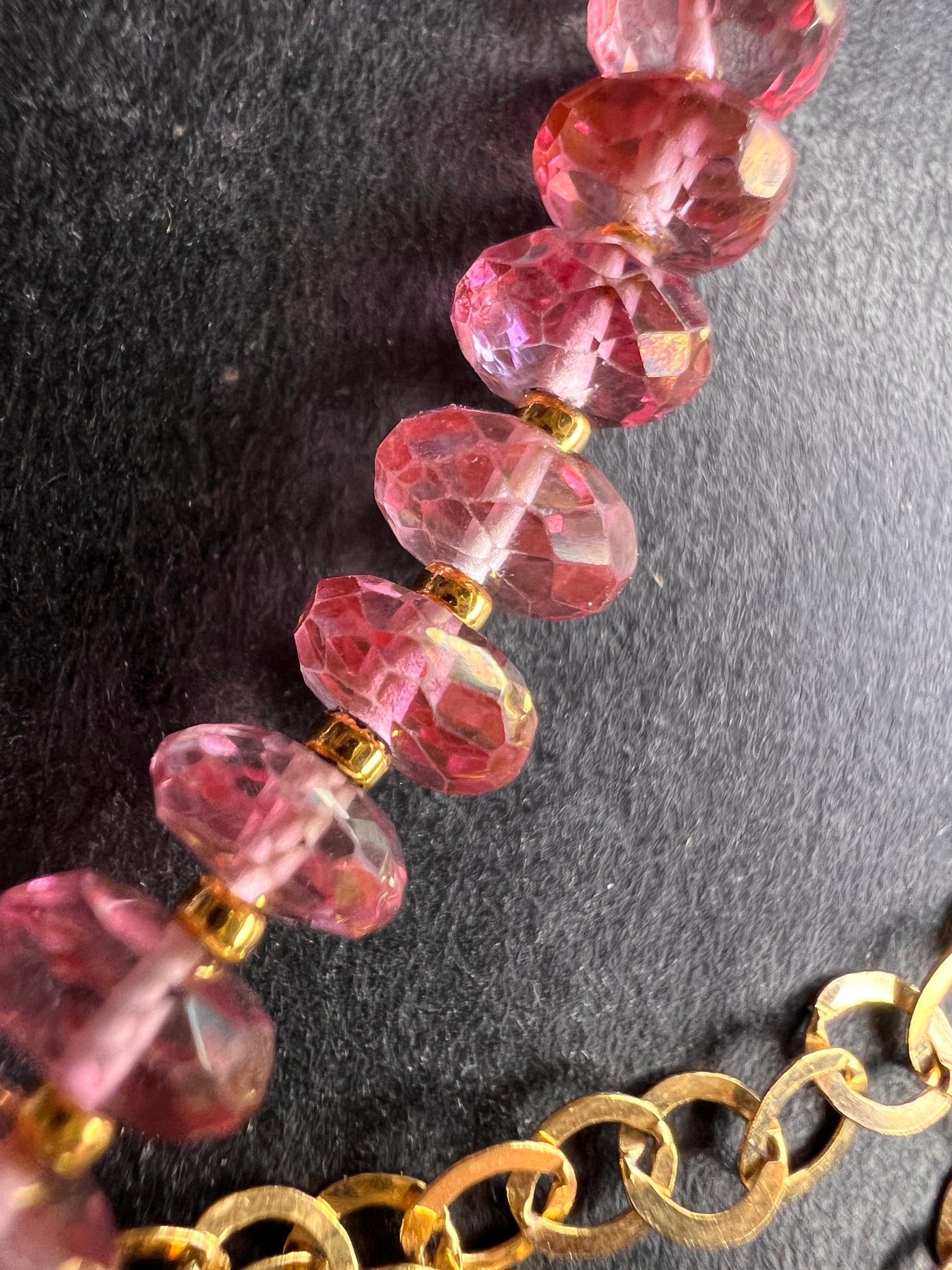 The pink faceted beads were tested as either topaz or spinel. The coloring suggests the stones have been color-enhanced to achieve the pink shade, a common practice that may involve heating or surface treatment.