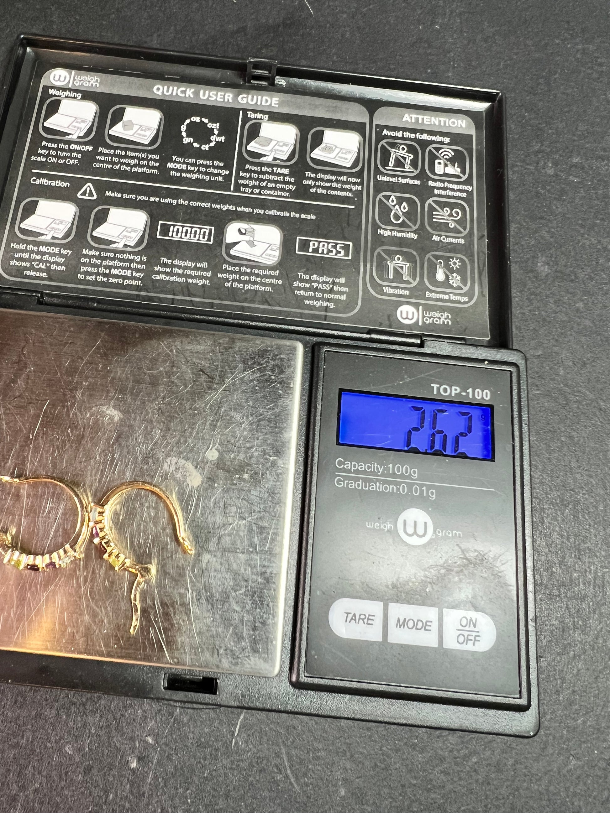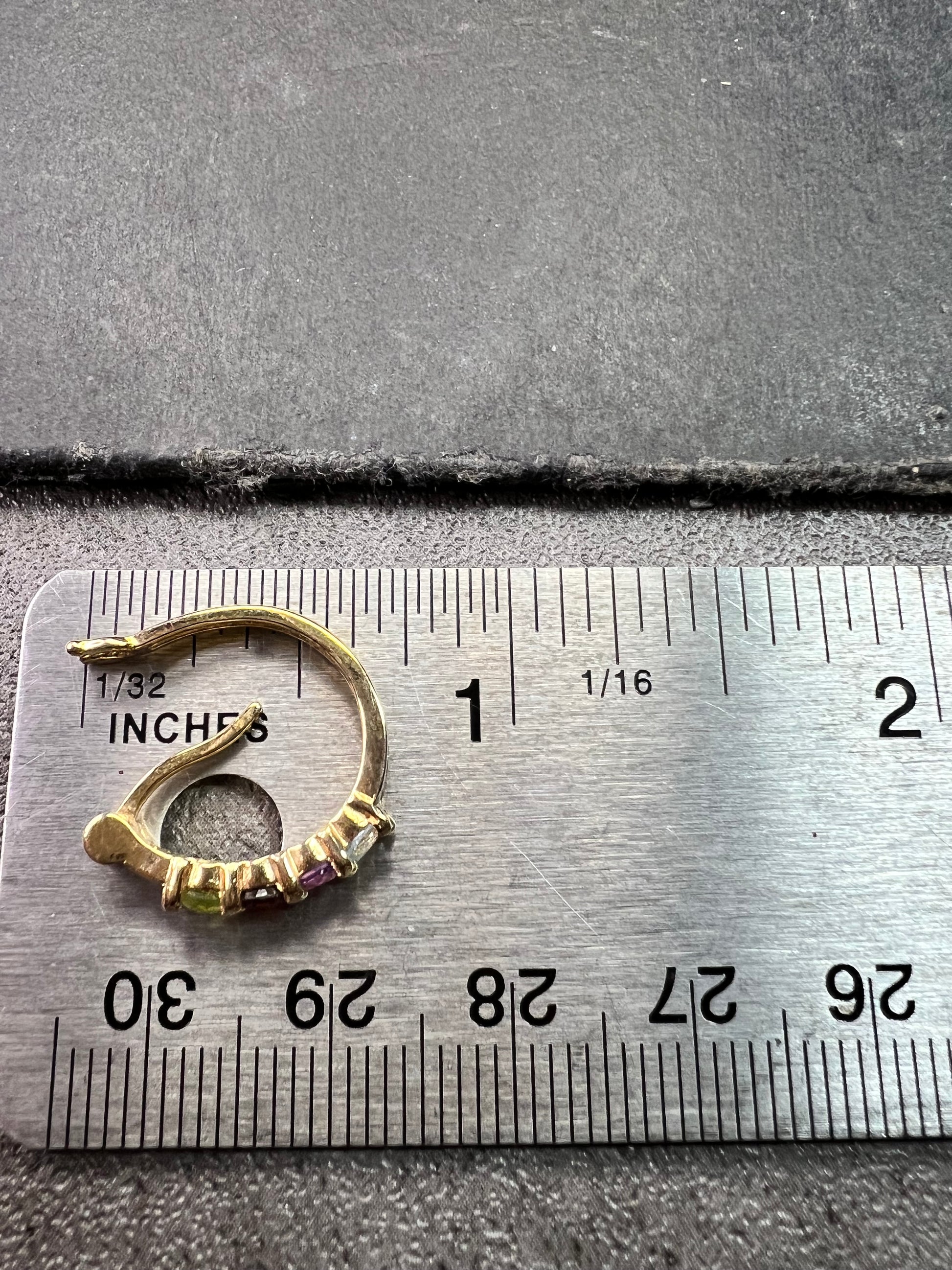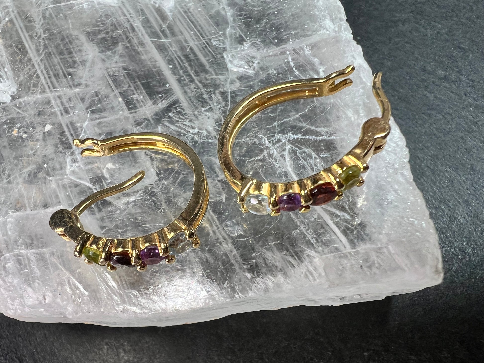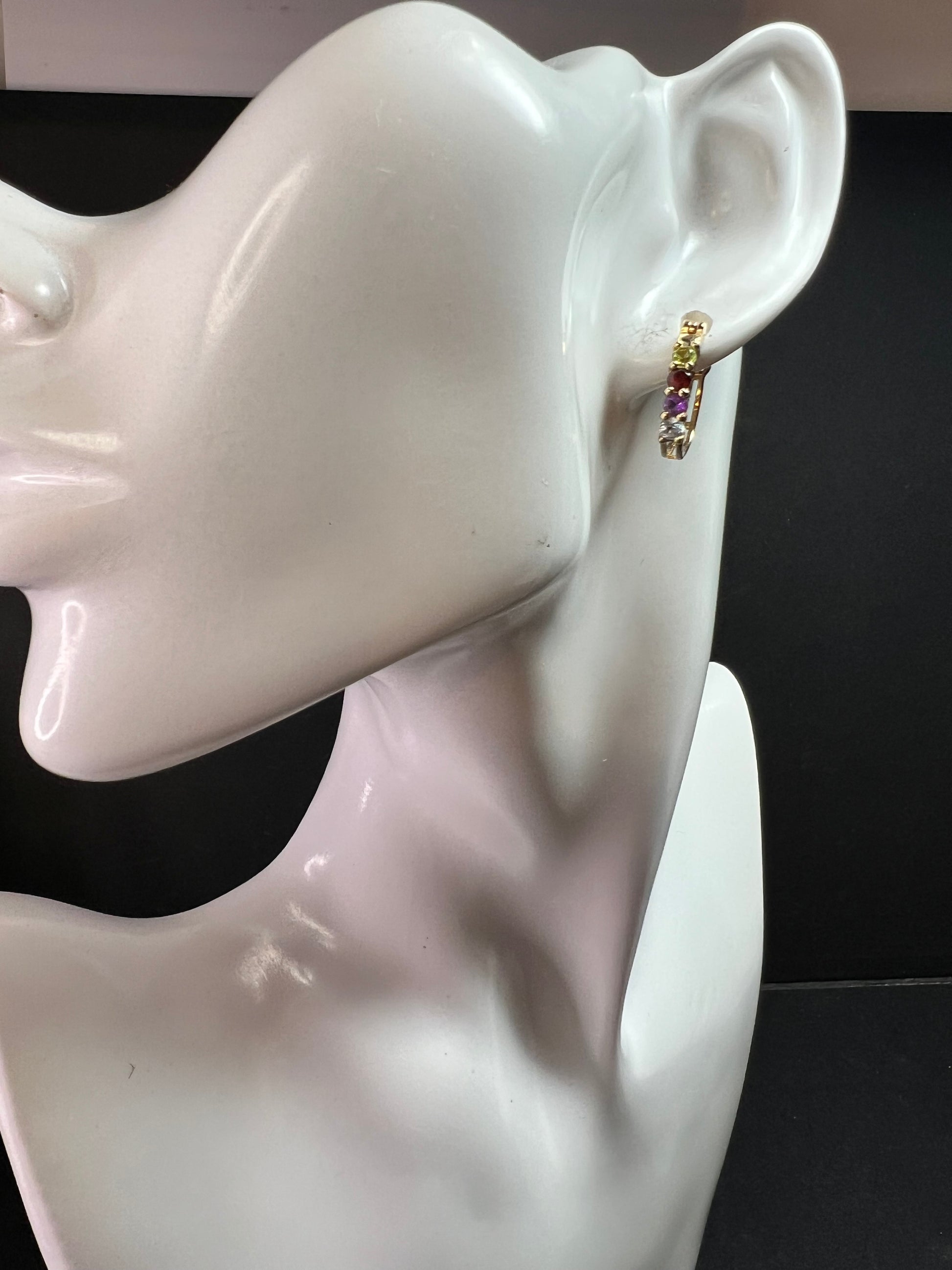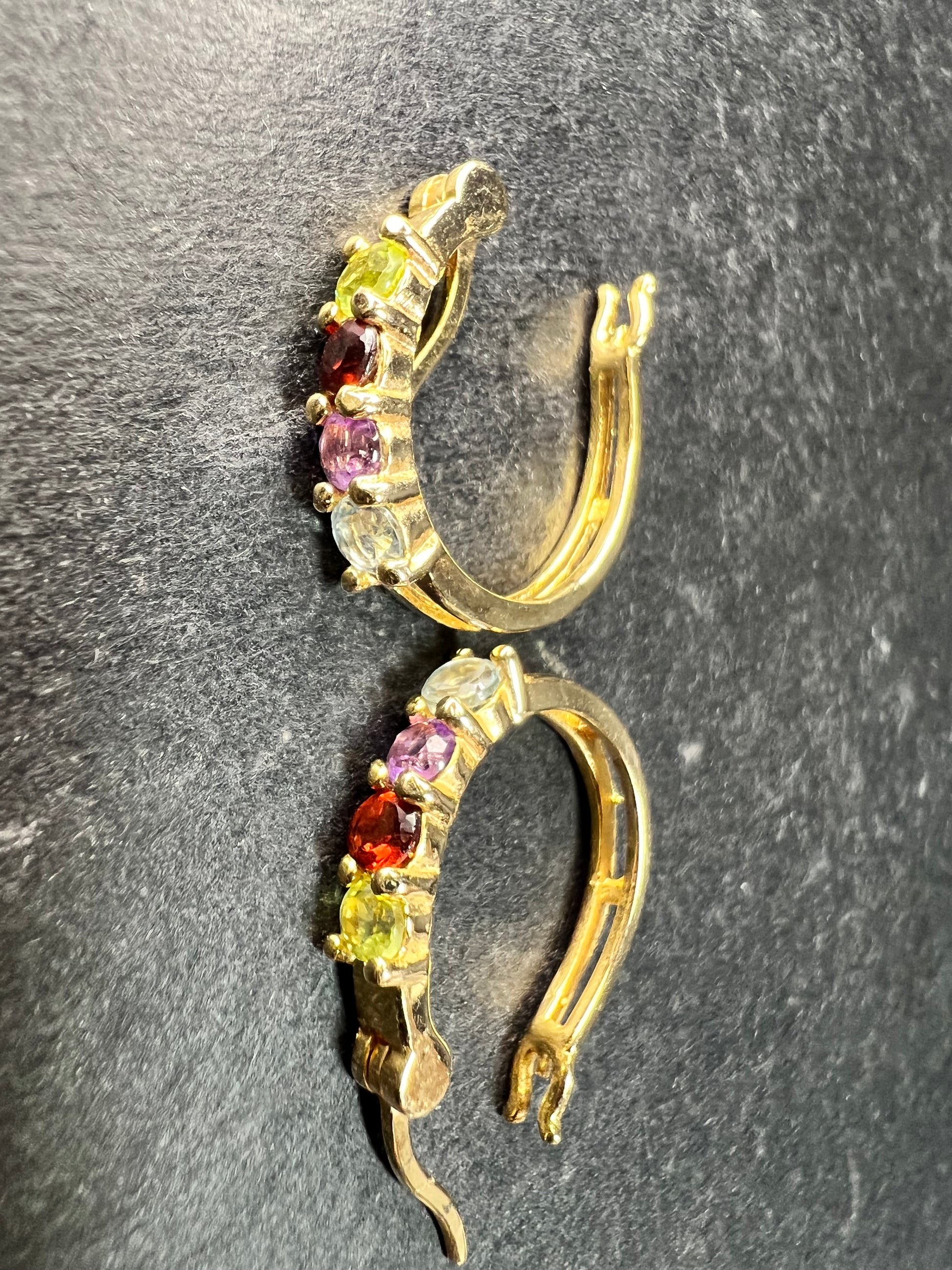 Gently pre-owned pair of gold-over-sterling silver hoop earrings featuring prong-set multi-gemstones including peridot, garnet, amethyst, and blue topaz in a curved graduated design. Earrings measure approximately ¾ inch in length and have a combined total weight of about 2.52 grams. The sterling silver base has been purity tested and verified, with PAJ 925 China clearly stamped on the inside. Estate acquired, carefully inspected, with light wear consistent with prior use and no missing stones.