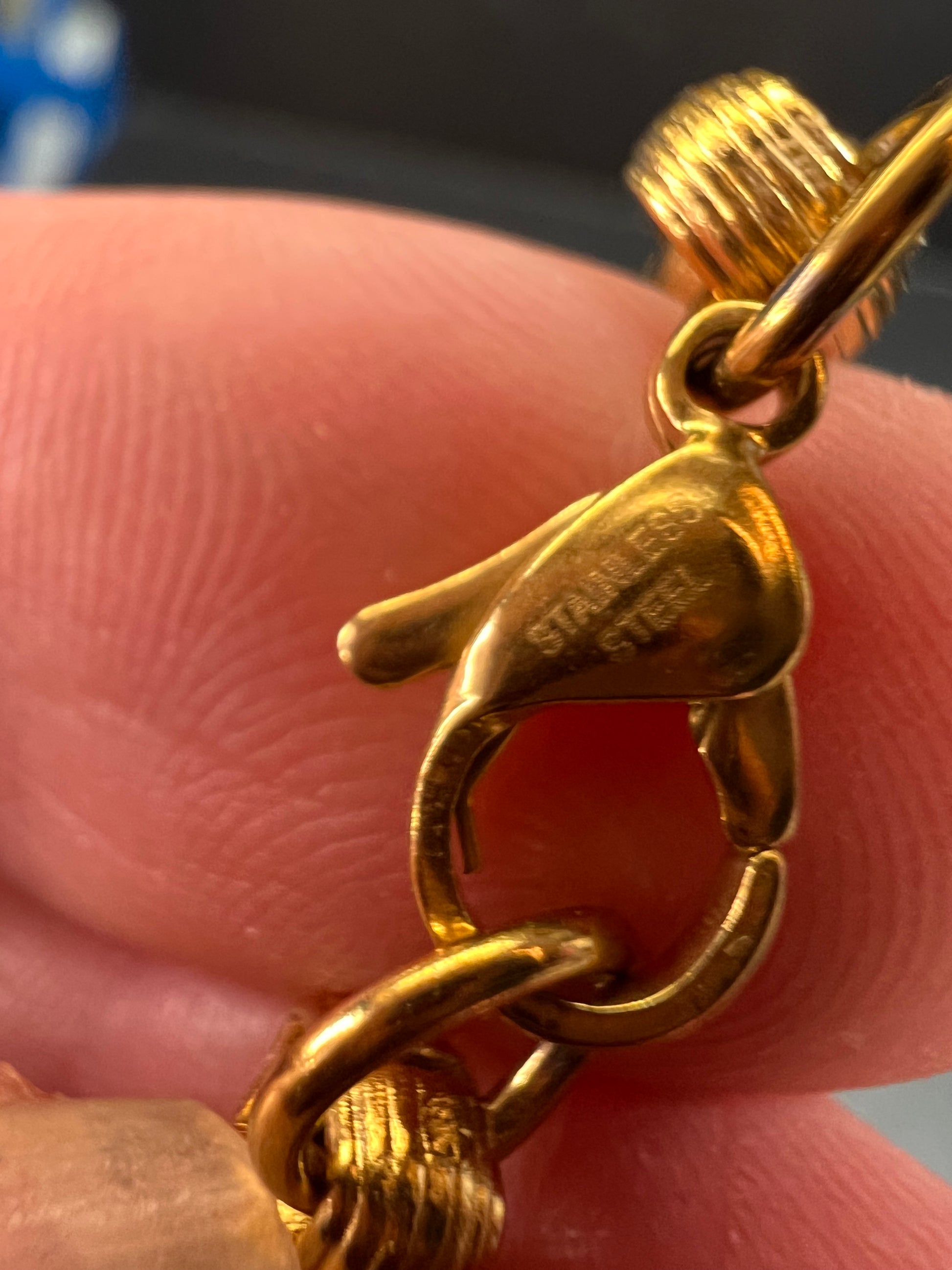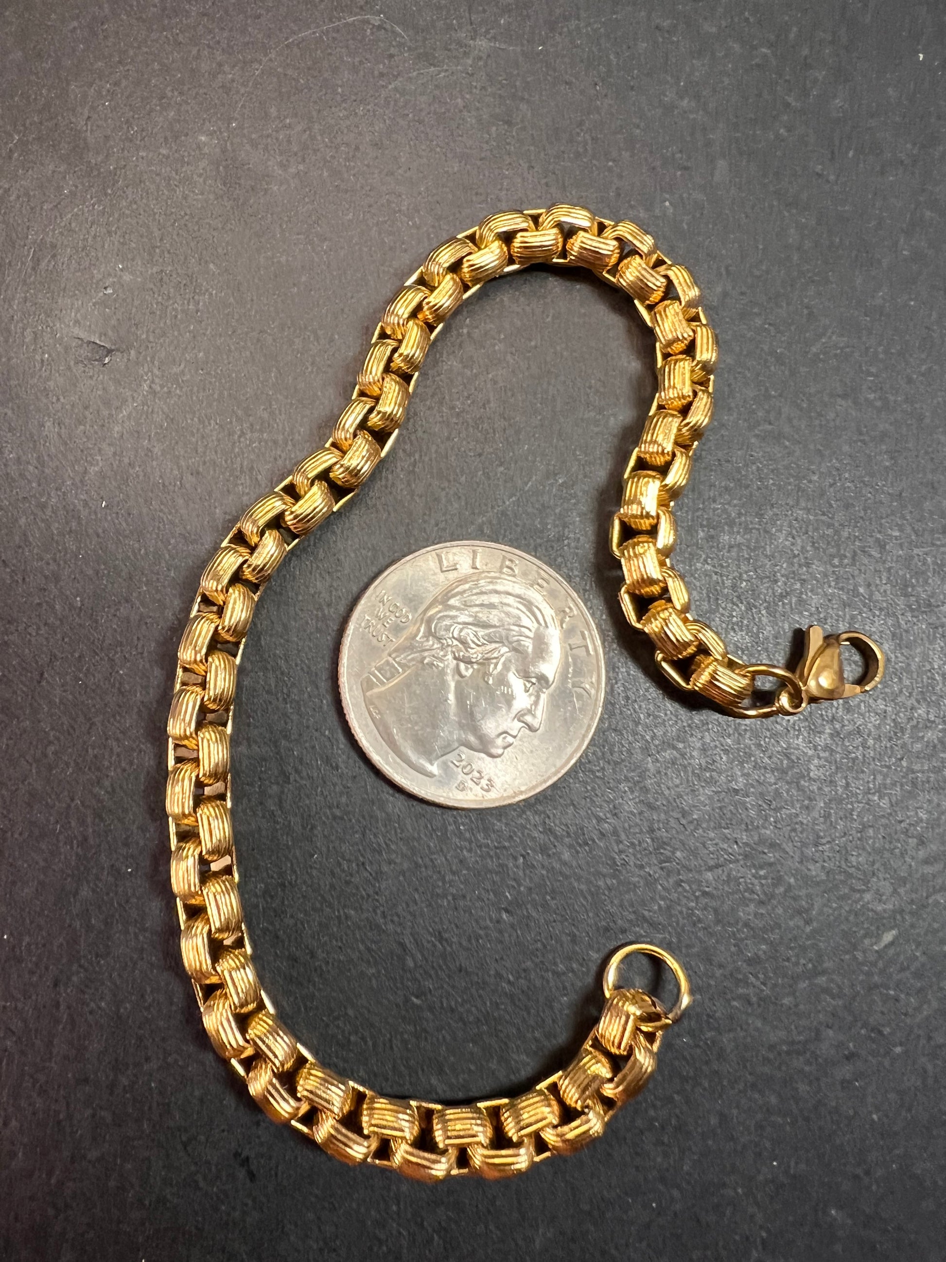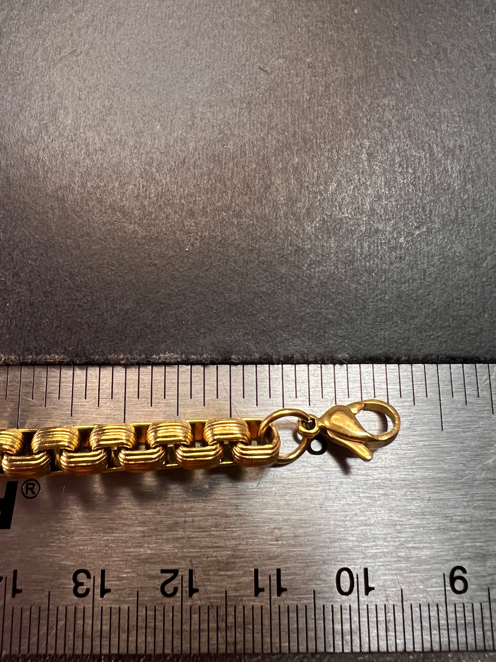 Yellow gold plated over stainless steel. Measures about 8.25 inches and weighs just over 20 grams.