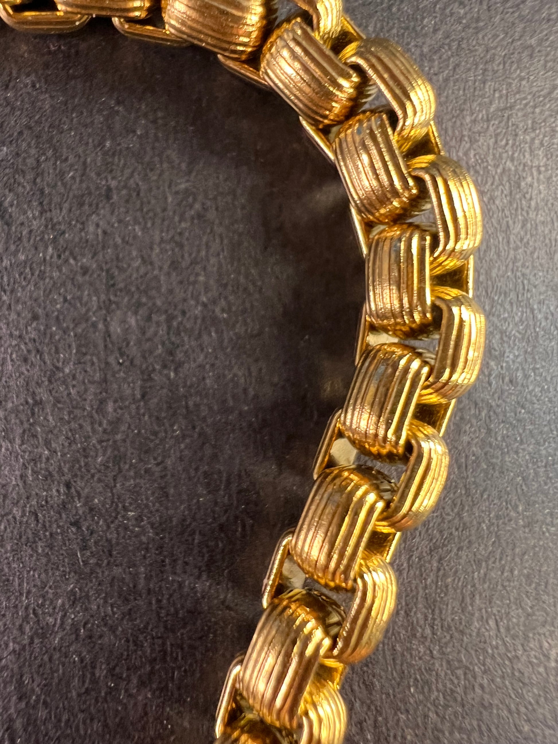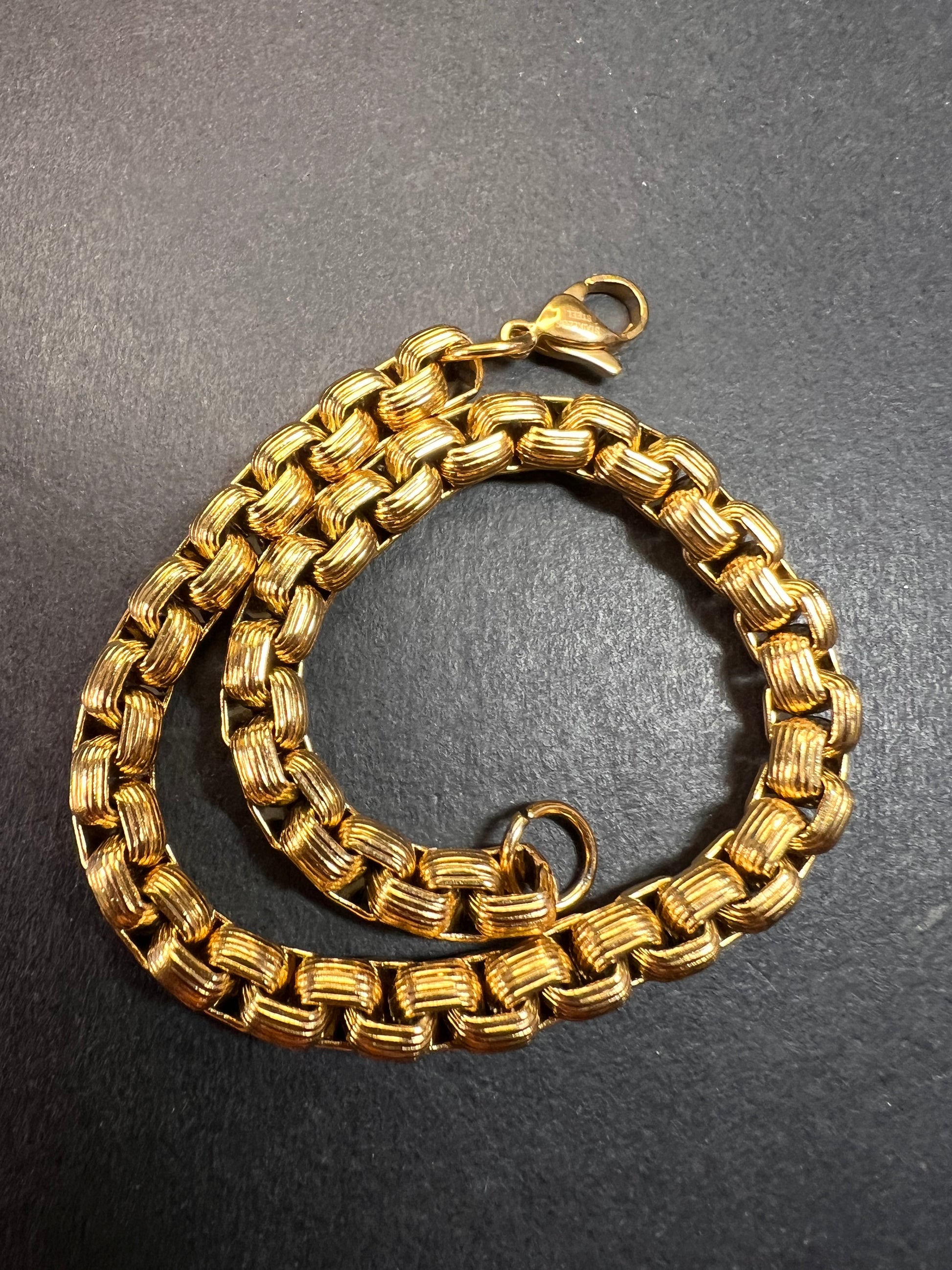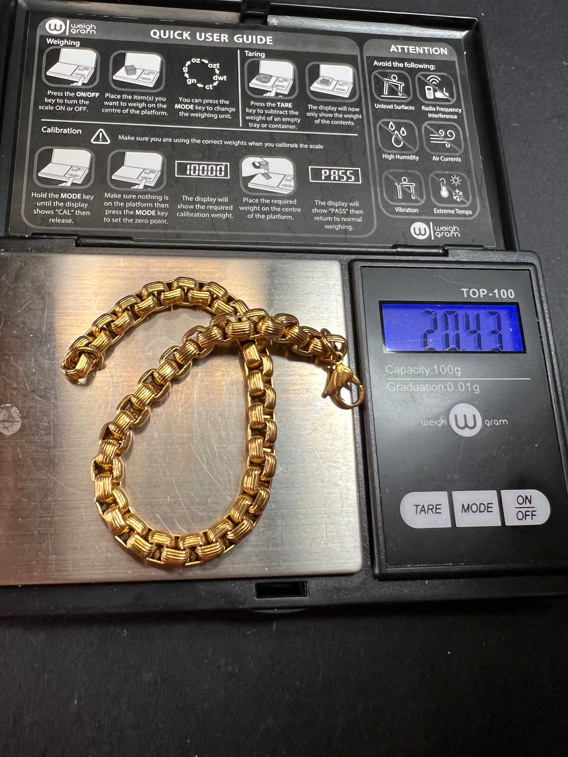 Yellow gold plated over stainless steel. Measures about 8.25 inches and weighs just over 20 grams.