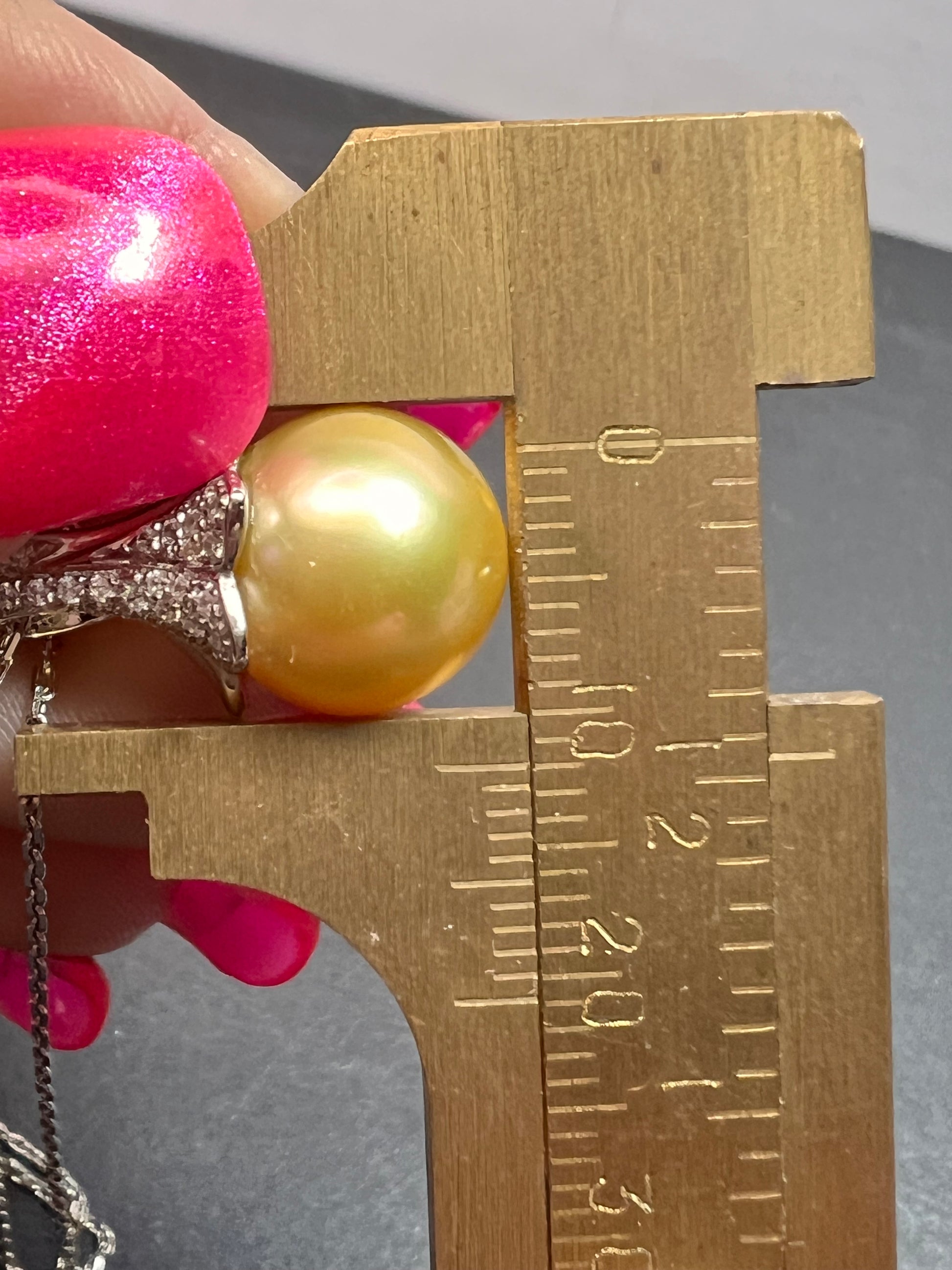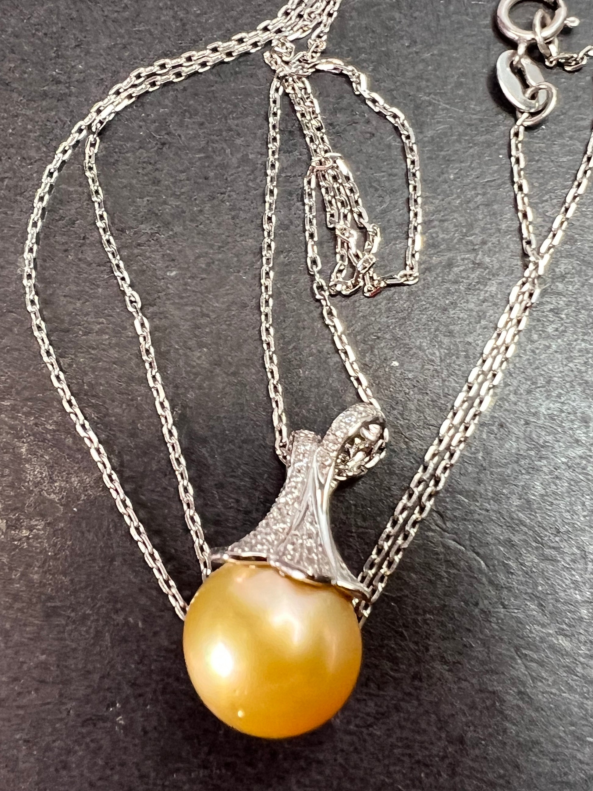 Golden colored cultured south seas pearl set in a rhodium plated over sterling silver setting. Tiny white accent stones are too small to get an accurate reading but mostly likely cubic zirconia. Chain measures 20 inches in length with spring clasp. 925