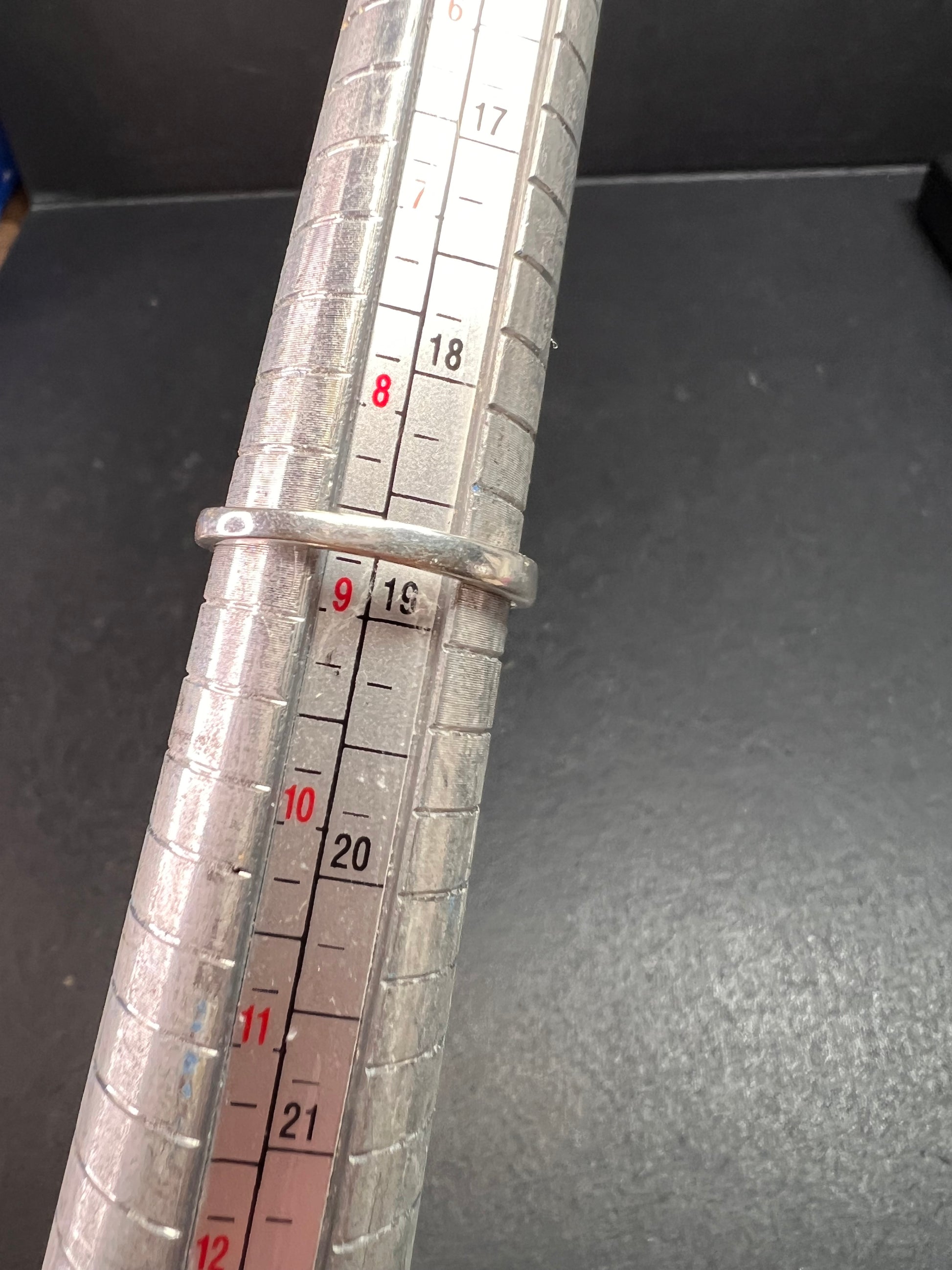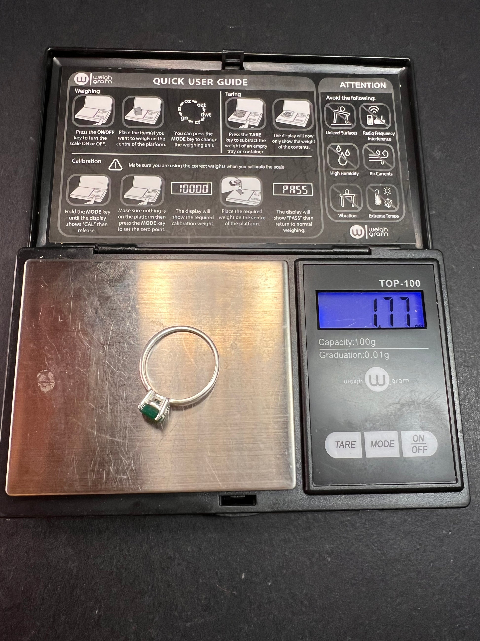 Green onyx round cut gemstone prong set in authentic 925 sterling silver. Measures a size 9. No hallmarks found. Total weight is 2.80 grams. Stone measures about 7mm in diameter.