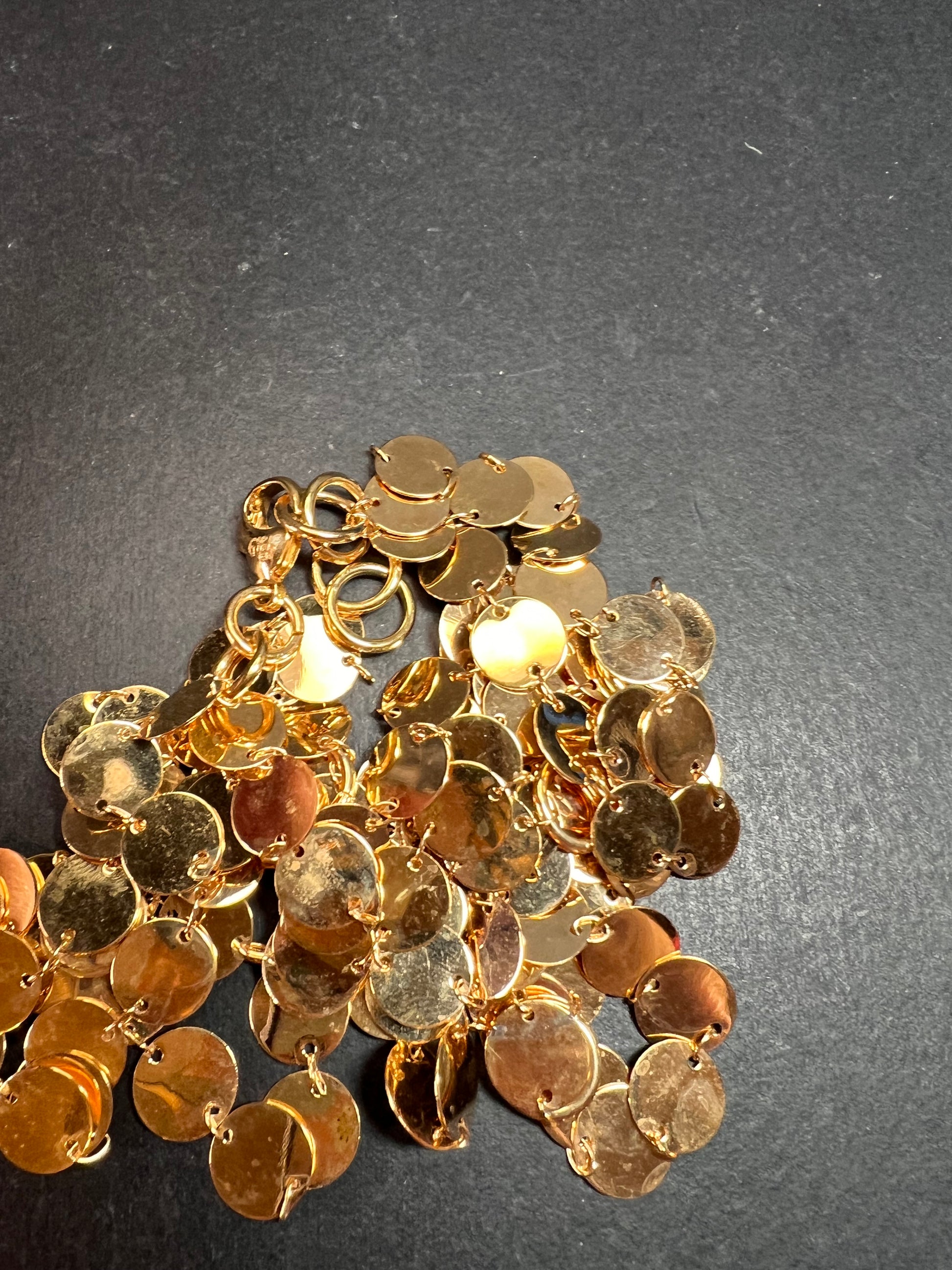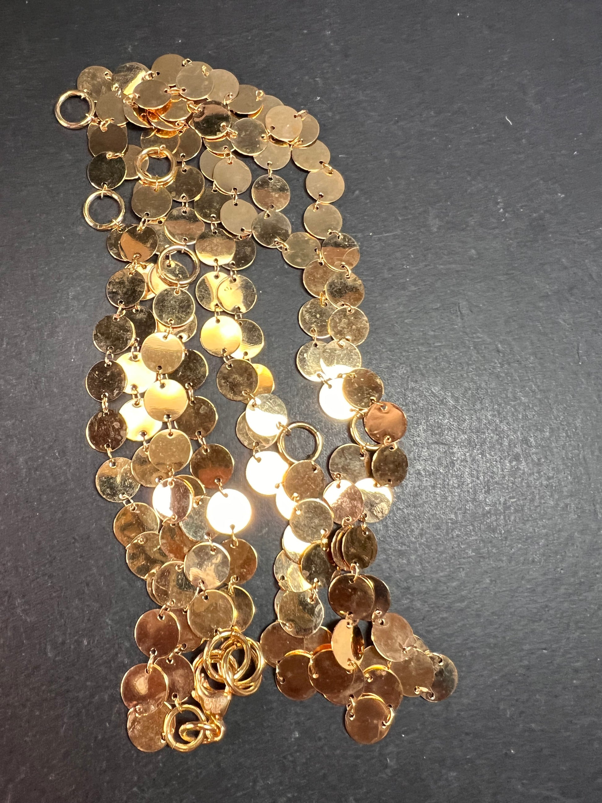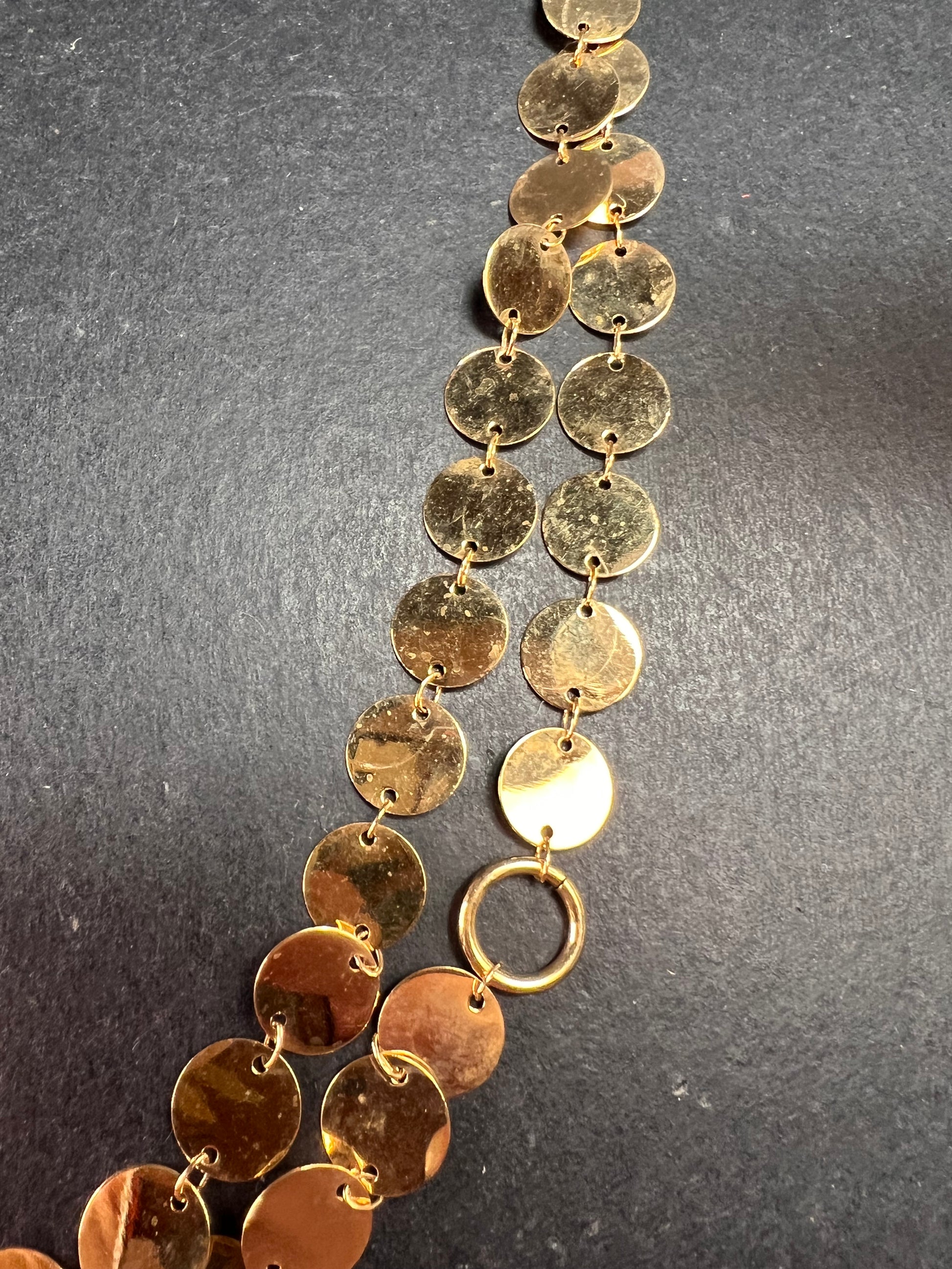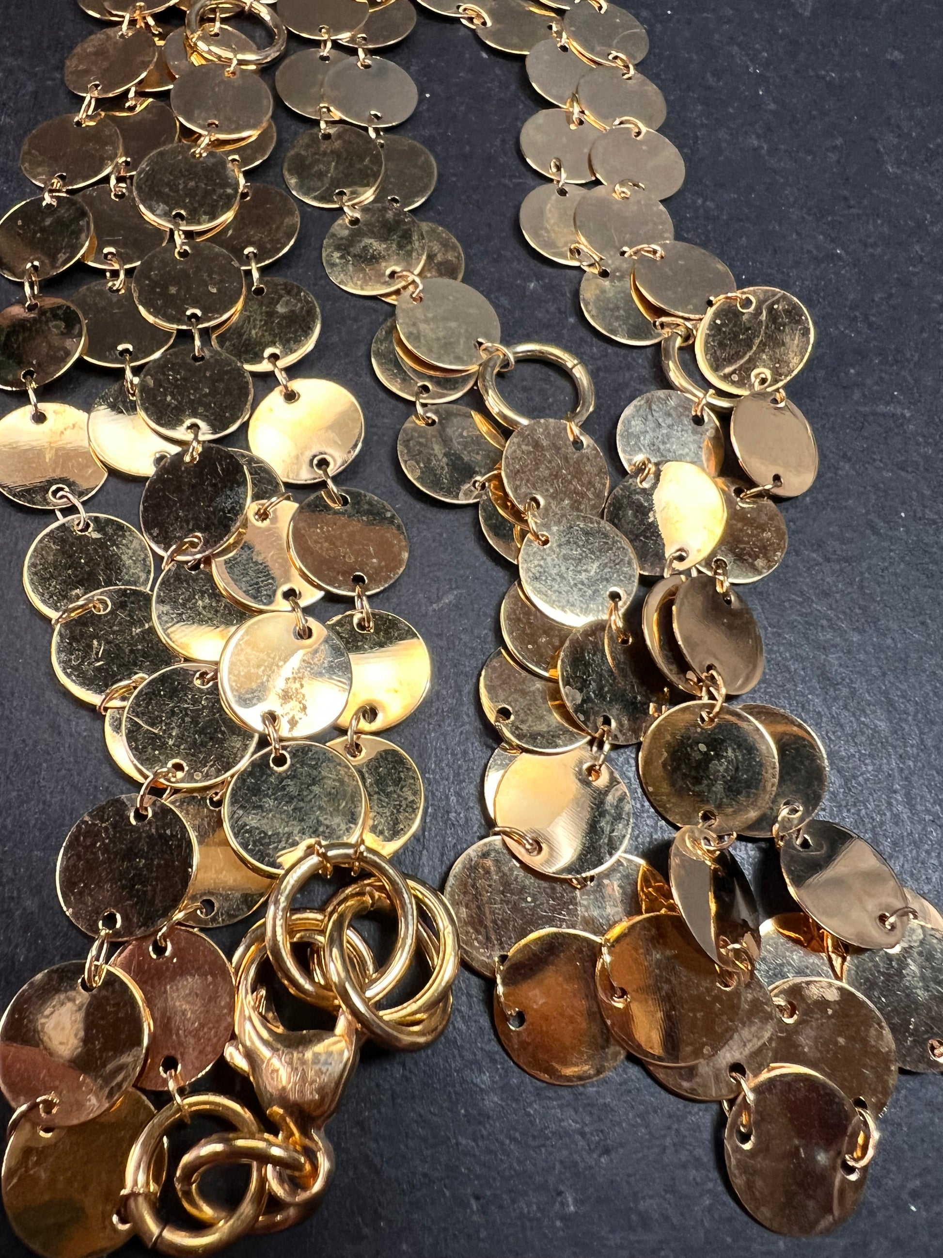 Estate acquired pre-owned Italian made necklace featuring layered flat disc links in warm 18k yellow gold plating over bronze. This striking piece measures approximately 32 inches in full length and includes multiple jump rings for adjustable wear at shorter lengths for easy layering. Crafted in Italy as stamped on the lobster clasp. The cascading polished disc design creates beautiful movement and light reflection. In excellent pre-owned condition with normal light surface wear consistent with prior use. A bold statement necklace that works beautifully alone or layered with other chains.
