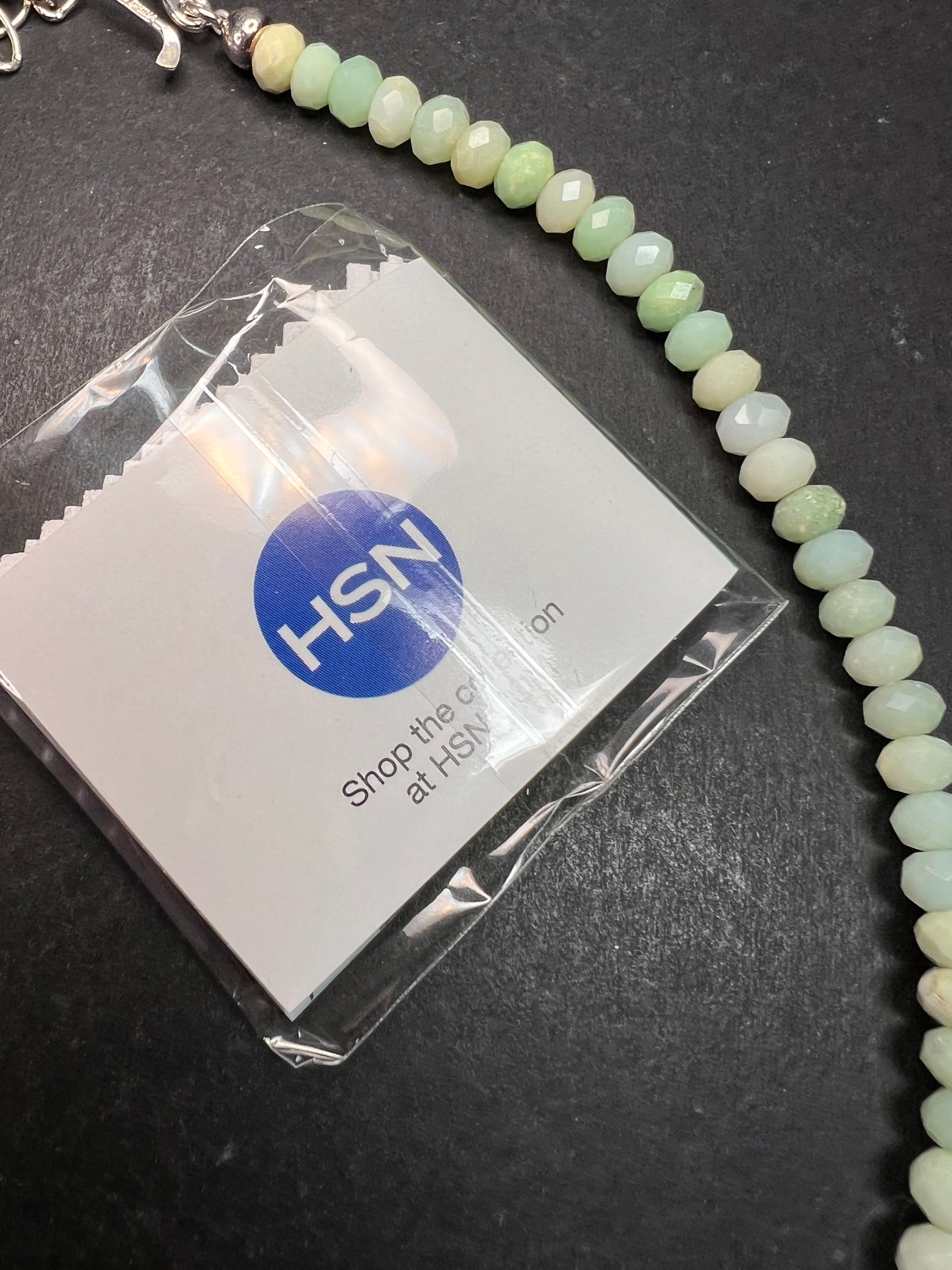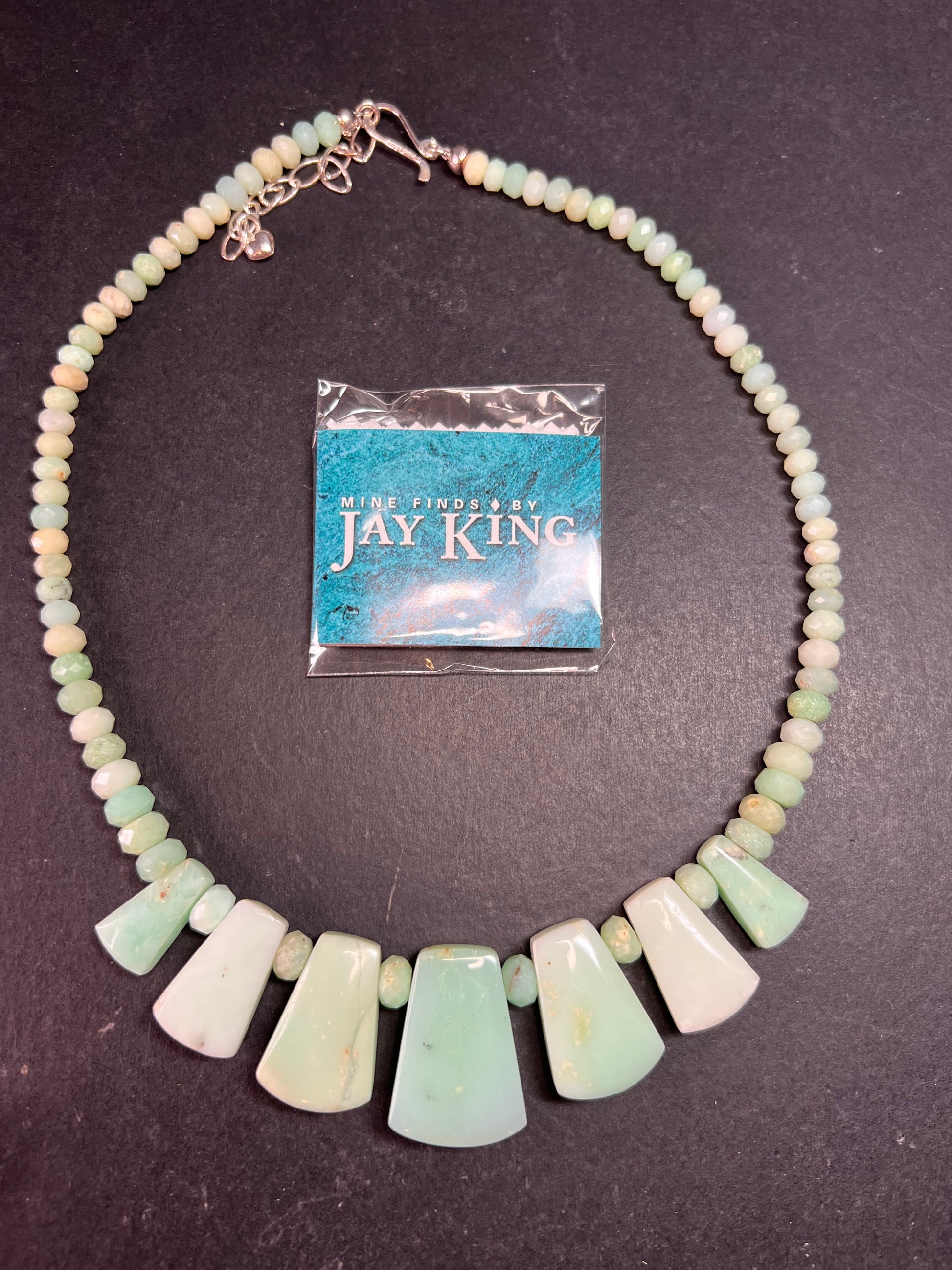 Brand new Jay King genuine chrysoprase statement necklace, never worn and still in original packaging. Features beautifully polished trapezoid-cut chrysoprase center stones in soft mint-to-apple green hues, paired with faceted chrysoprase rondelle beads along the strand. Finished with a solid sterling silver hook clasp and a coordinating 2–3 inch sterling extender chain for adjustable fit. Necklace measures approximately 18 inches plus extender. Maker card from Mine Finds by Jay King (HSN) included. Stones display natural matrix and color variation typical of real chrysoprase. Exceptional quality and craftsmanship. Perfect statement piece for collectors of Jay King, or HSN gemstone jewelry.
