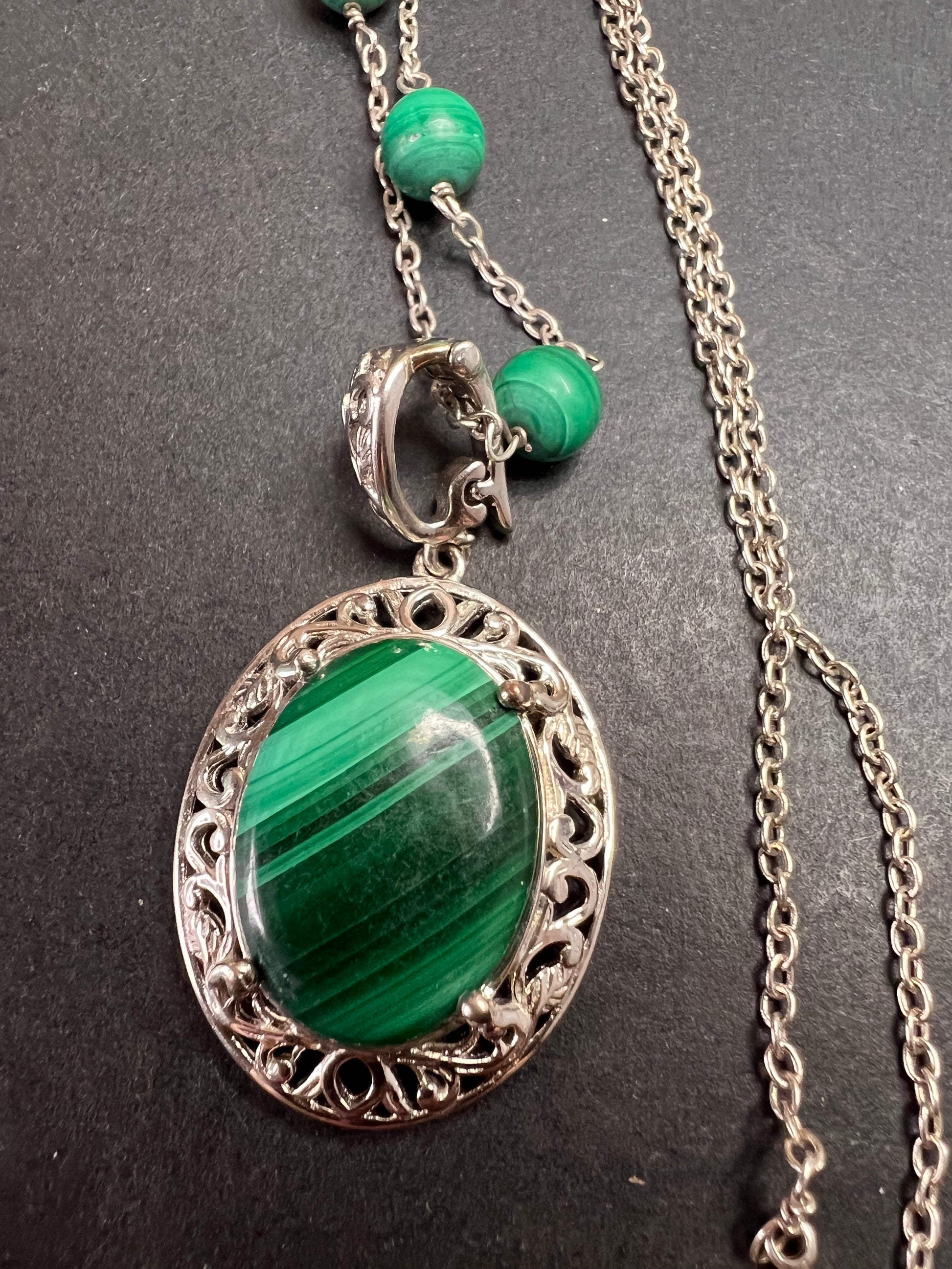 Genuine African malachite stone beads and enhancer pendant. Beads measure roughly 7 mm in diameter. Enhancer opens at bale for easy removal to be worn with other jewelry. Lobster clasp. Set in platinum bond ( platinum plated over stainless steel). Mark on back of pendant is Karis STS