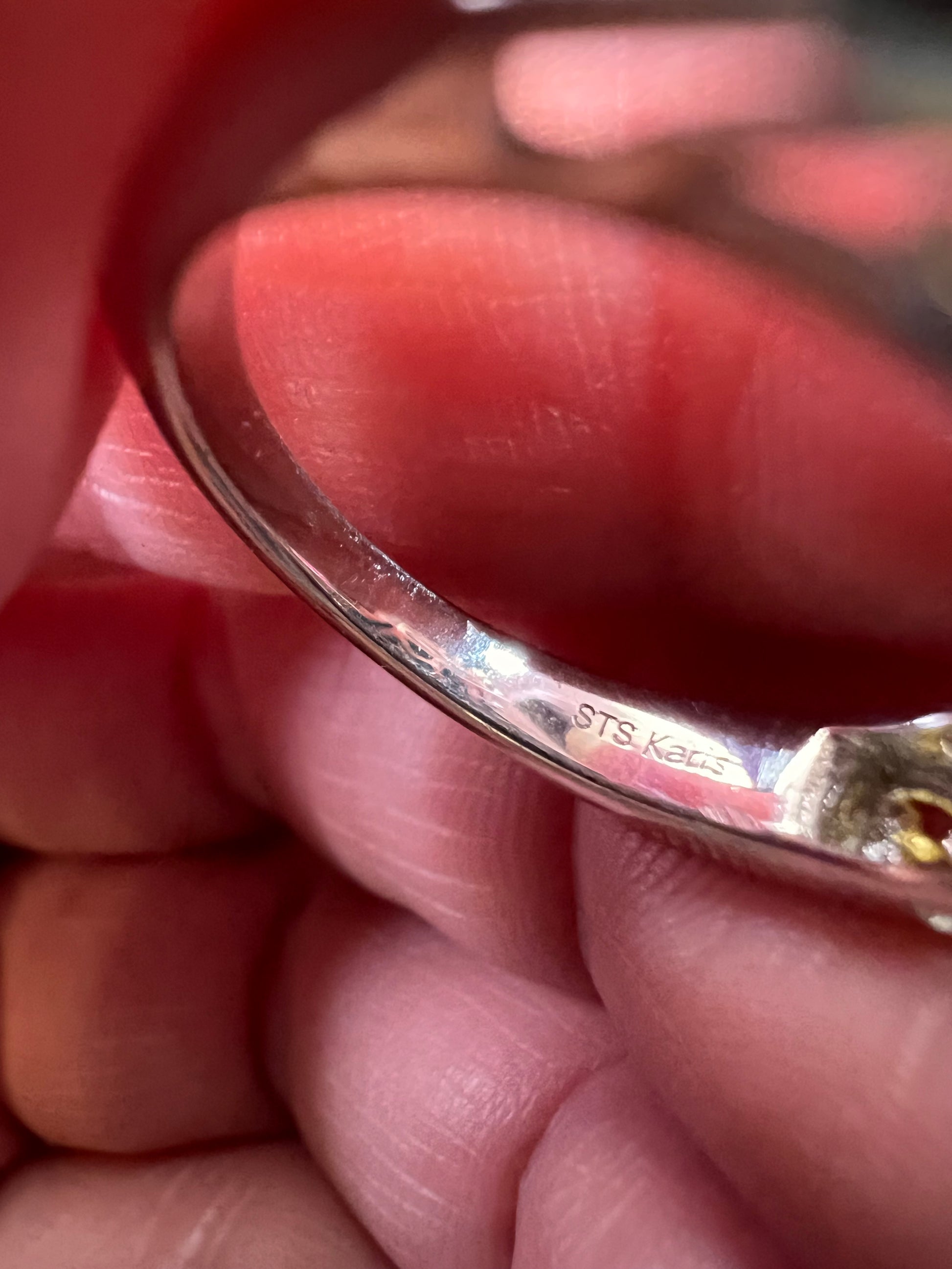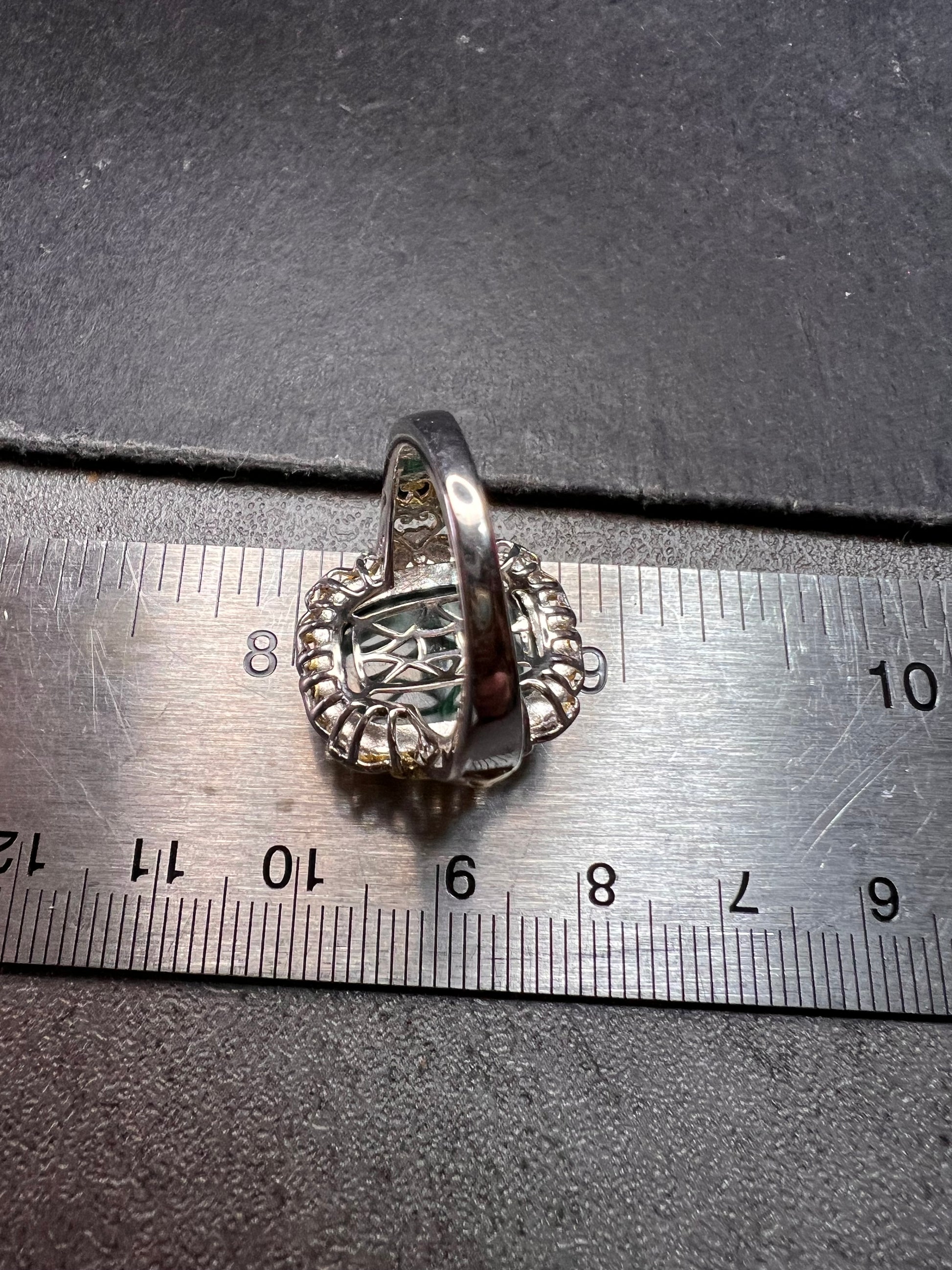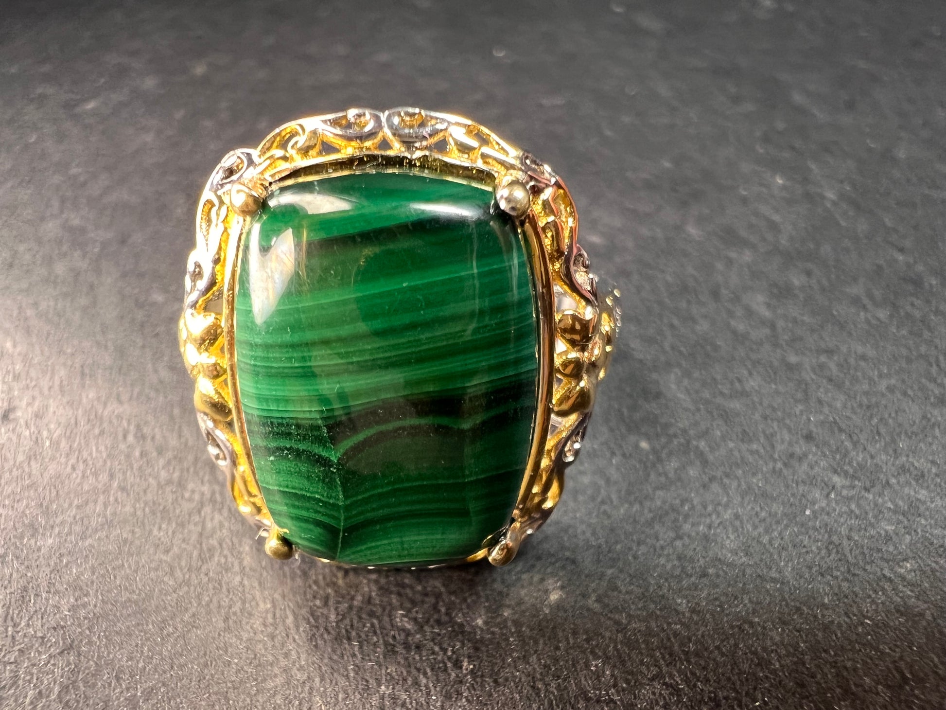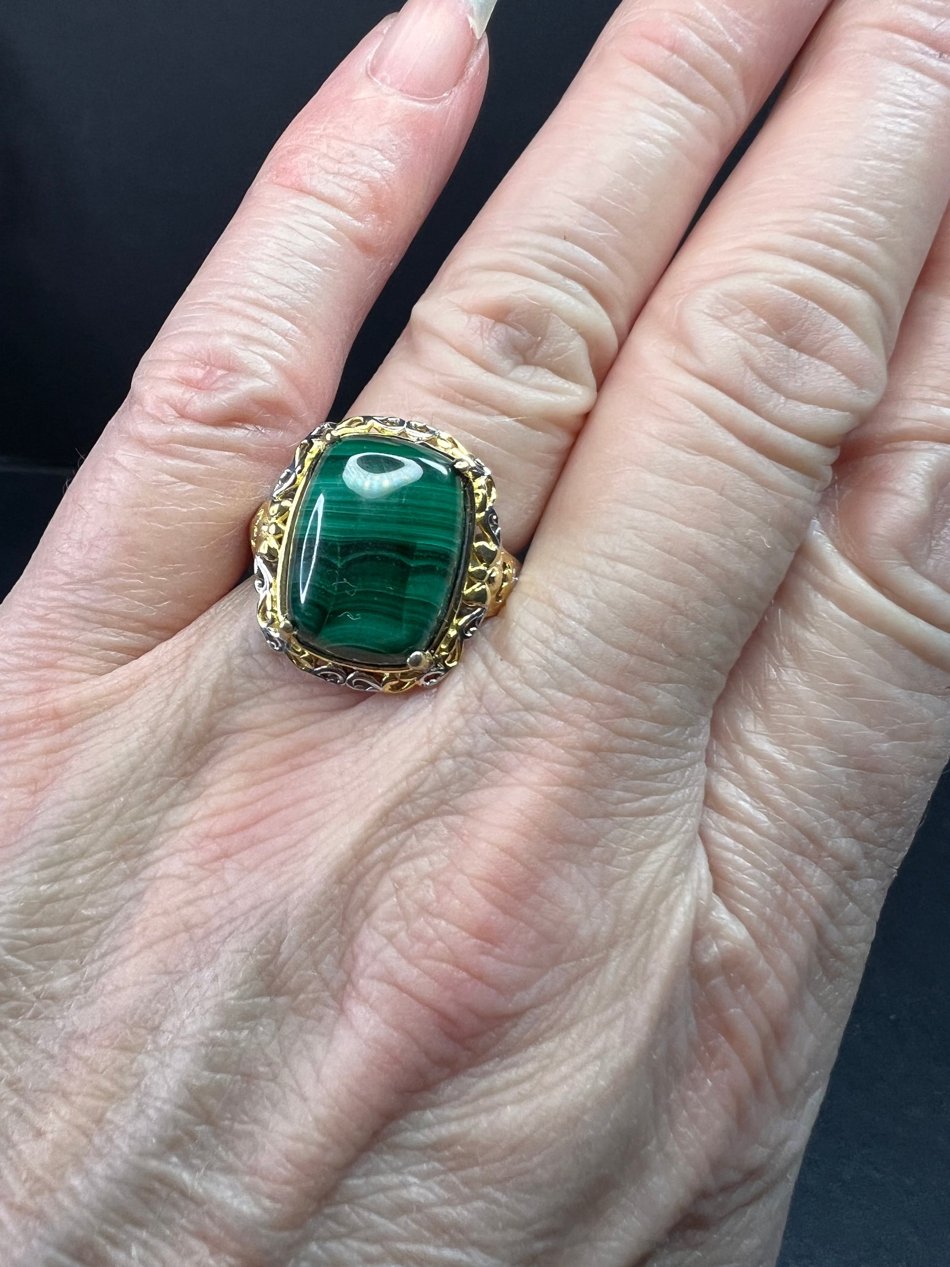 New without original tag or packaging. This striking Karis ring features a polished rectangular malachite cabochon displaying rich natural green banding and excellent surface shine. The ornate setting combines platinum plating with 18K yellow gold accents in an intricate scrollwork design that gives the piece a bold, upscale look. Expertly crafted and made in India, this size 7 ring weighs 6.63 grams and offers a beautiful statement presence on the hand. A standout piece for any jewelry collection.