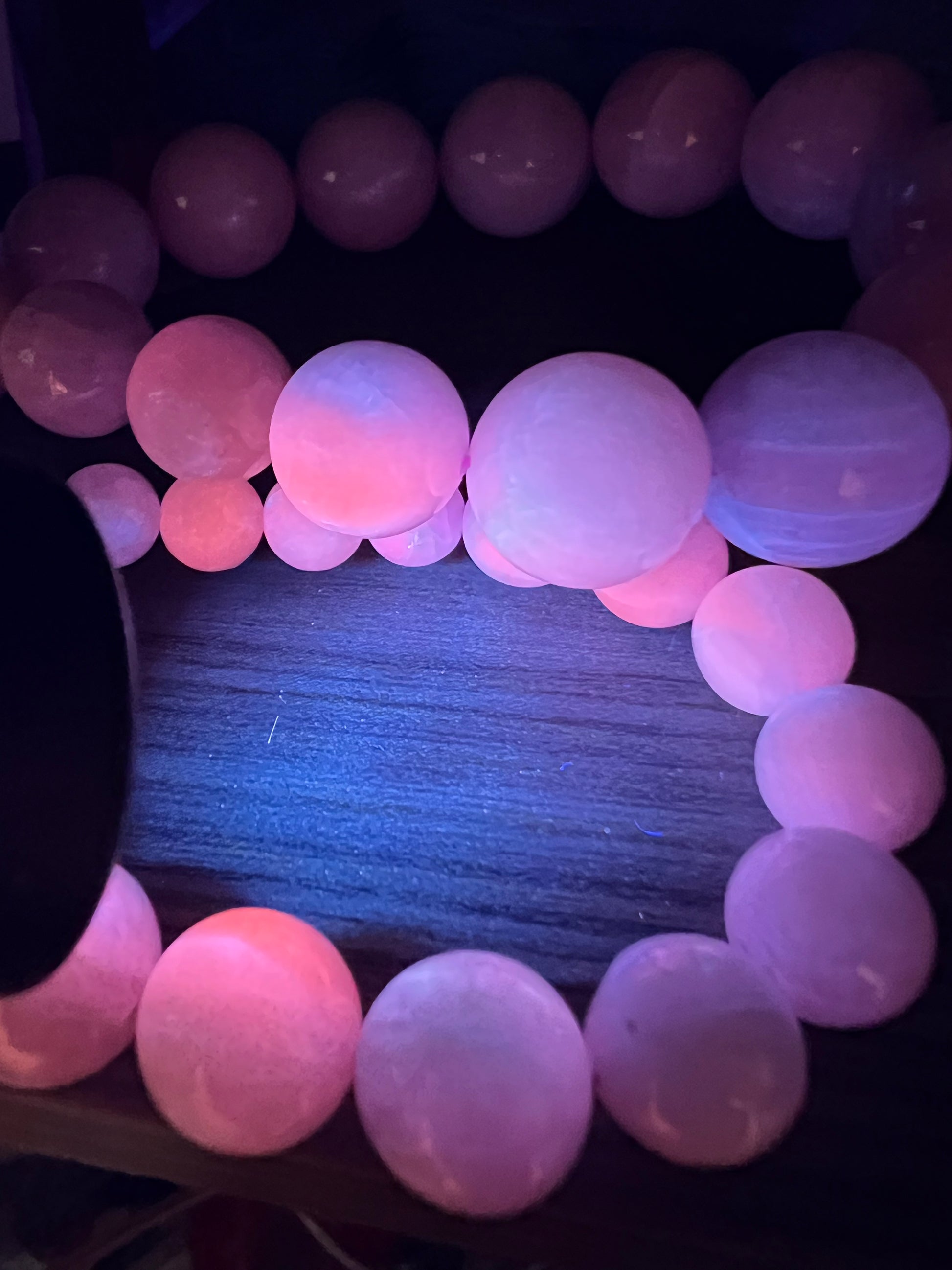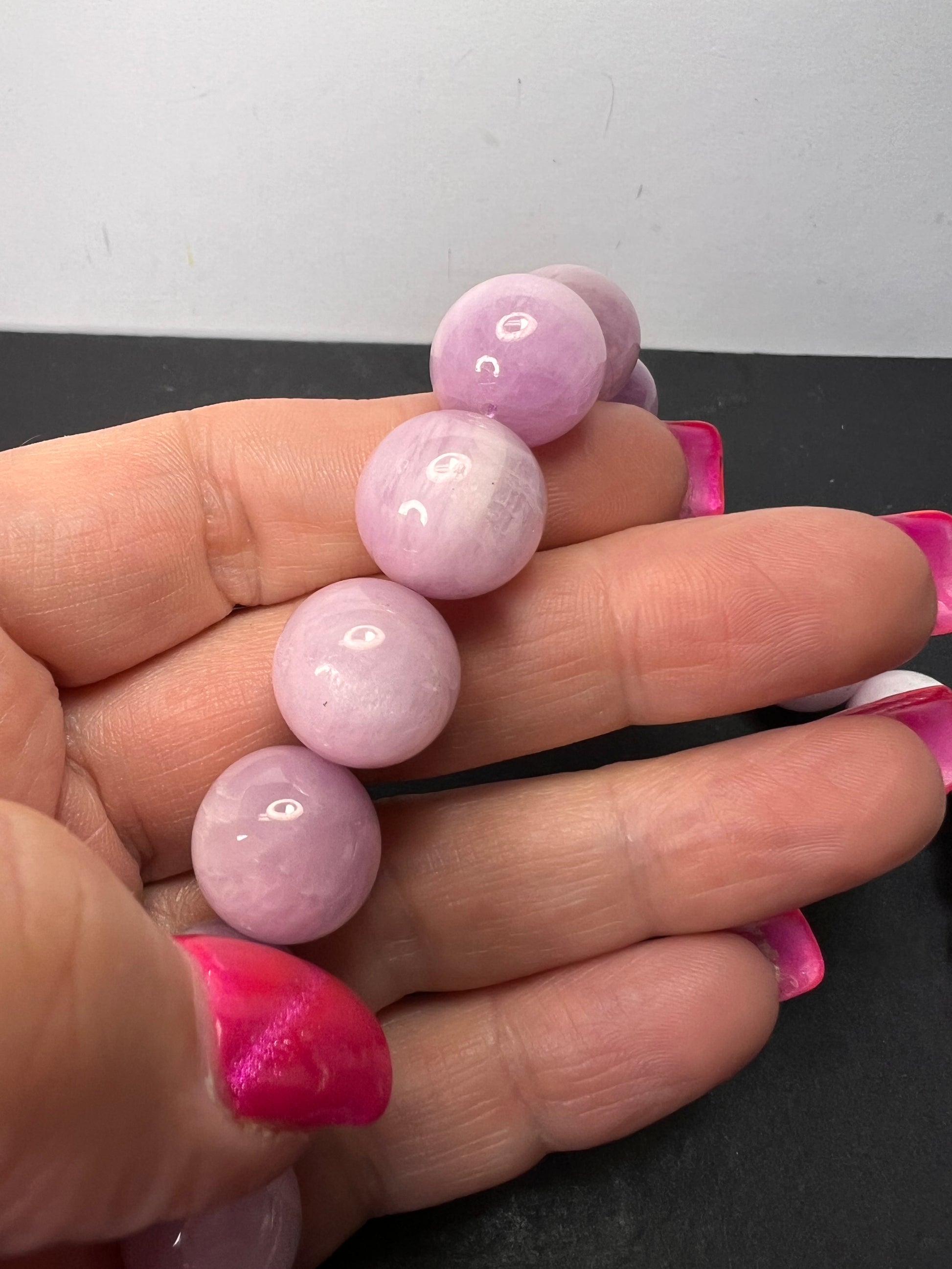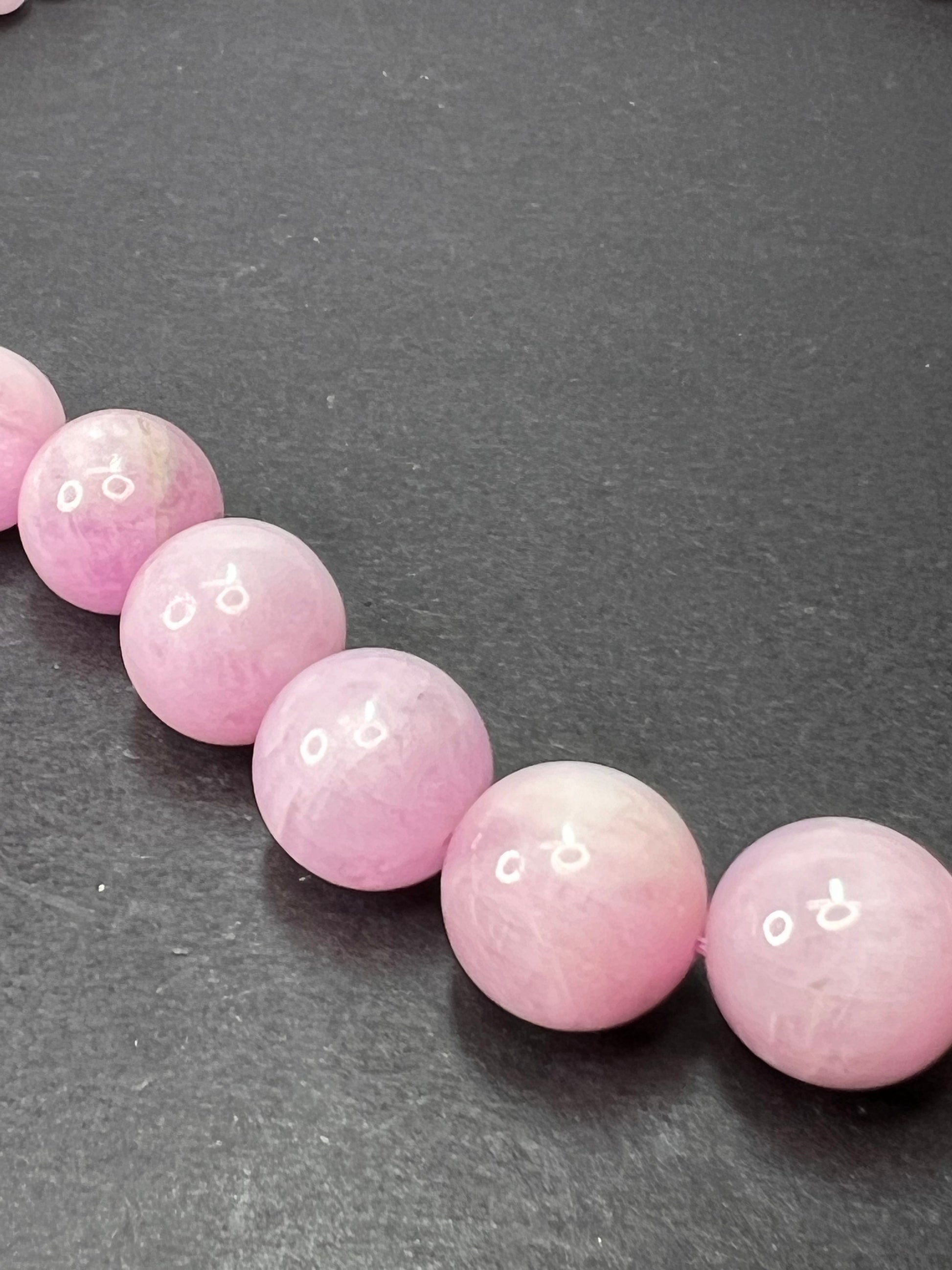 These are genuine high grade kunzite beads in graduated sizes from about 7-14mm. Measures about 20 inches in length. Class is magnetic rhodium plated over sterling silver. Stamped 925 . Some of these stones will glow under UV light.