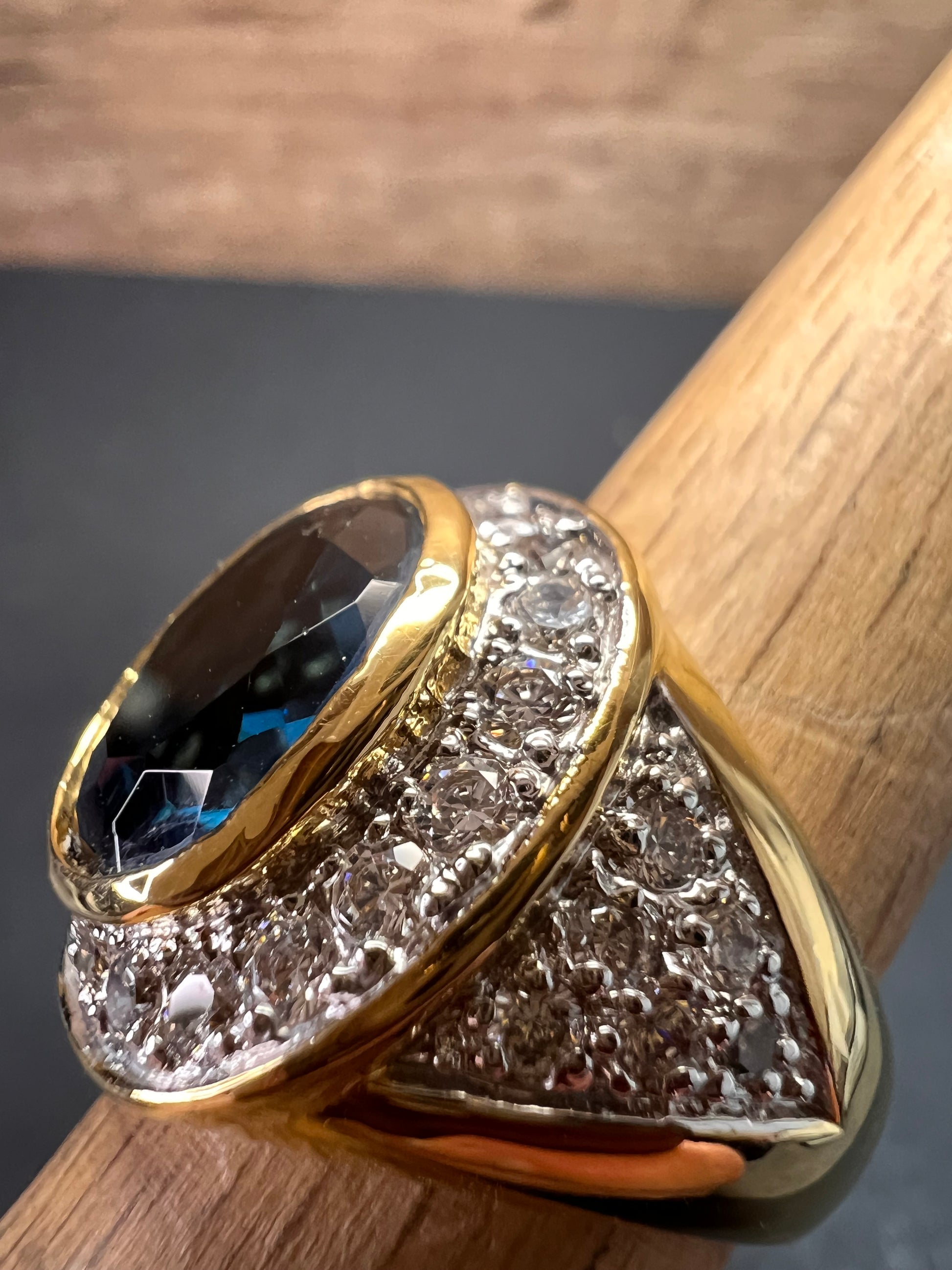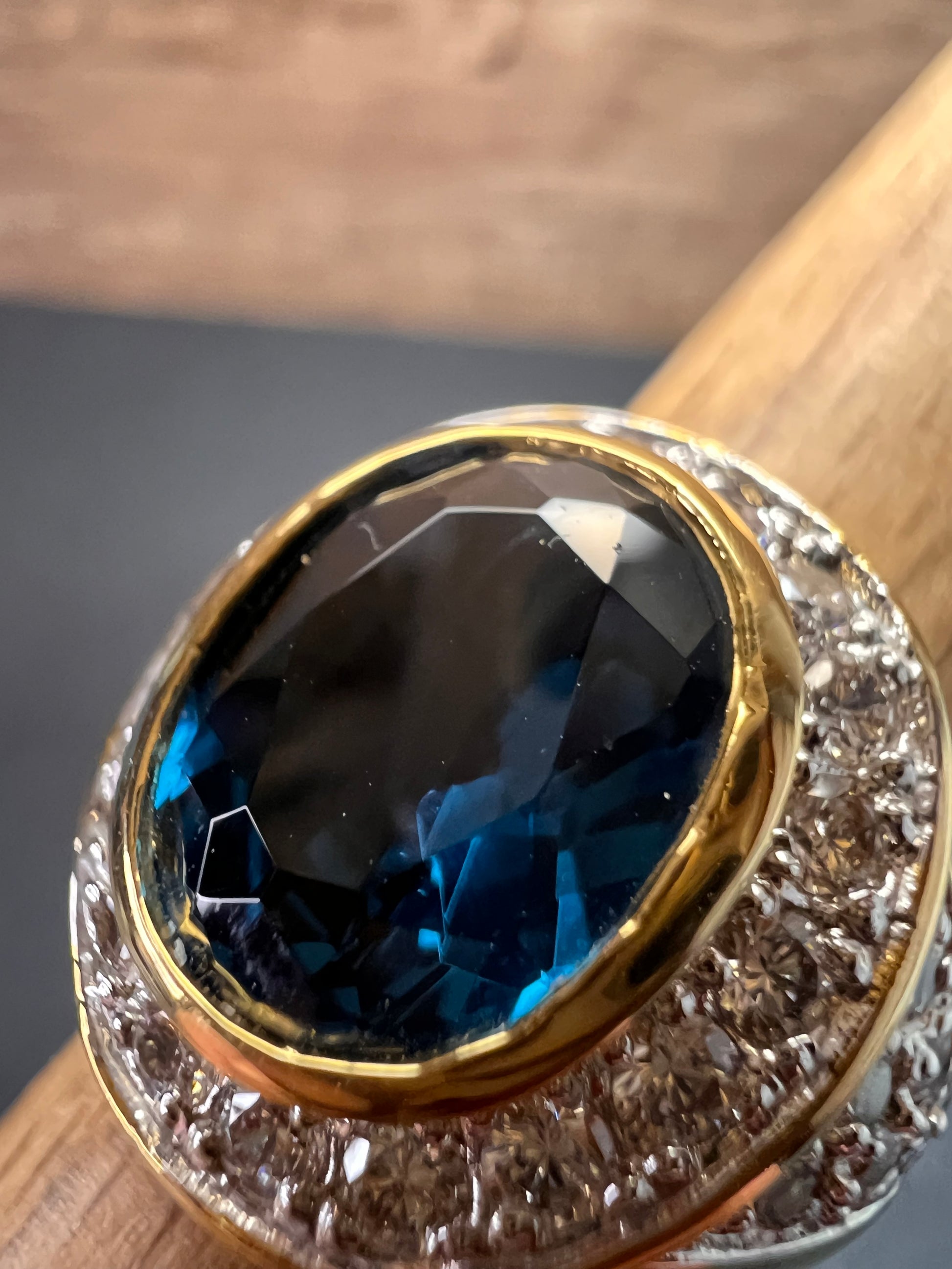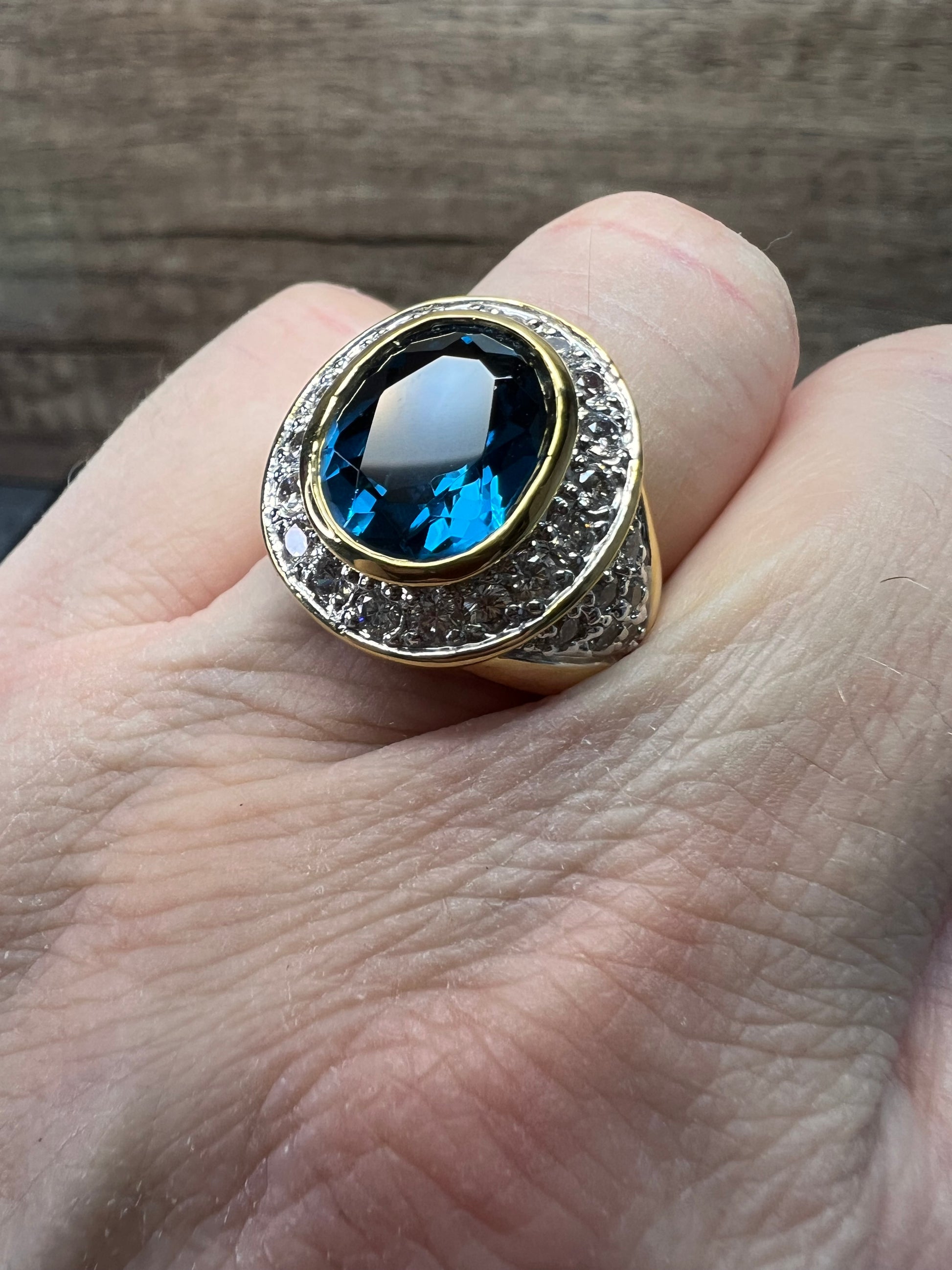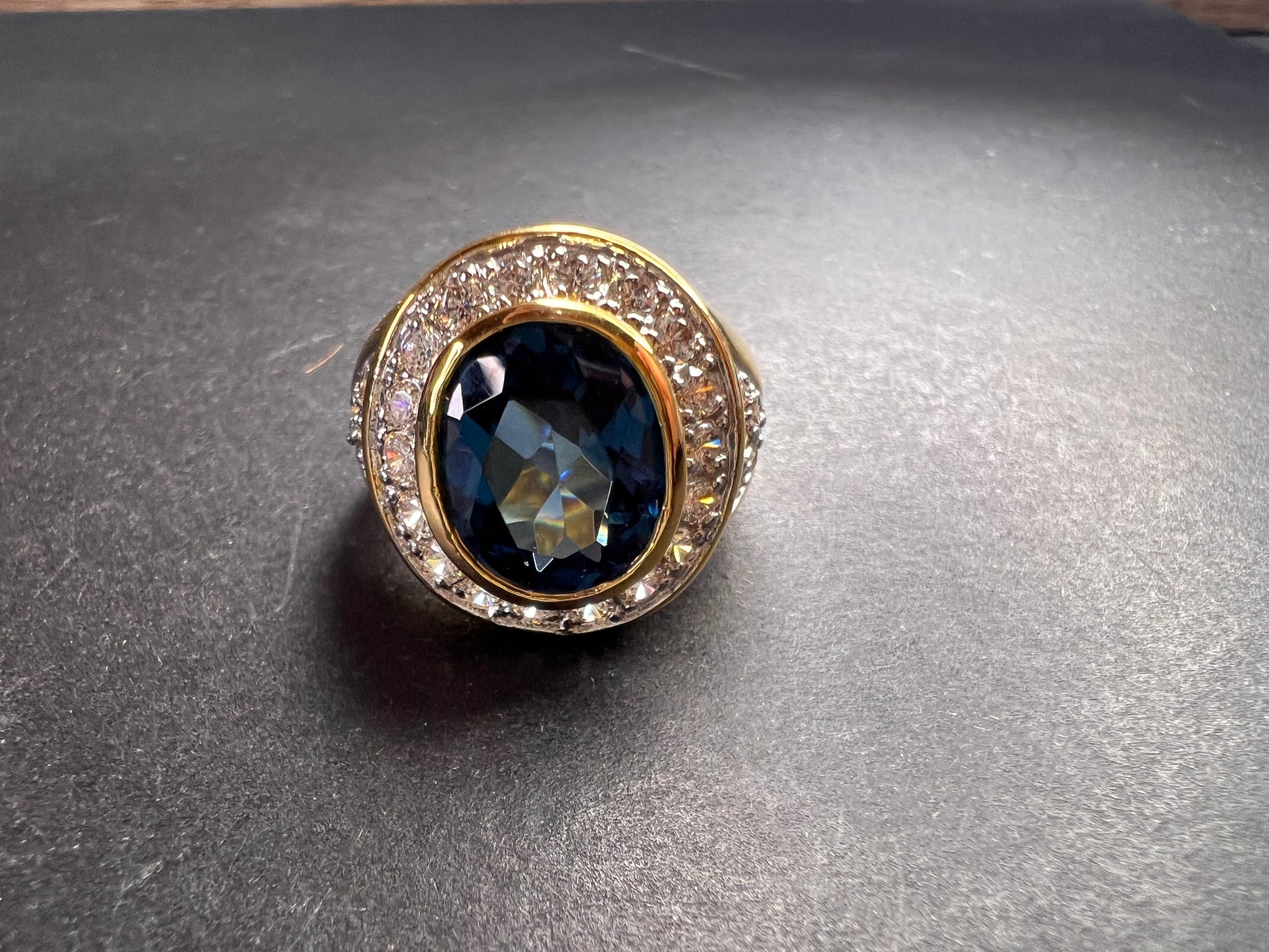 Big blue stone tests as spinel. Definitely a lab created one. White small accent stones test as cubic zirconia. Set in 18k yellow rolled gold (much thicker than vermeil but less than gold filled). It’s a heavier ring weighing 8.70 grams. No purity stamp. Only GR and Thailand. Measures a size 7. Fun durable ring !