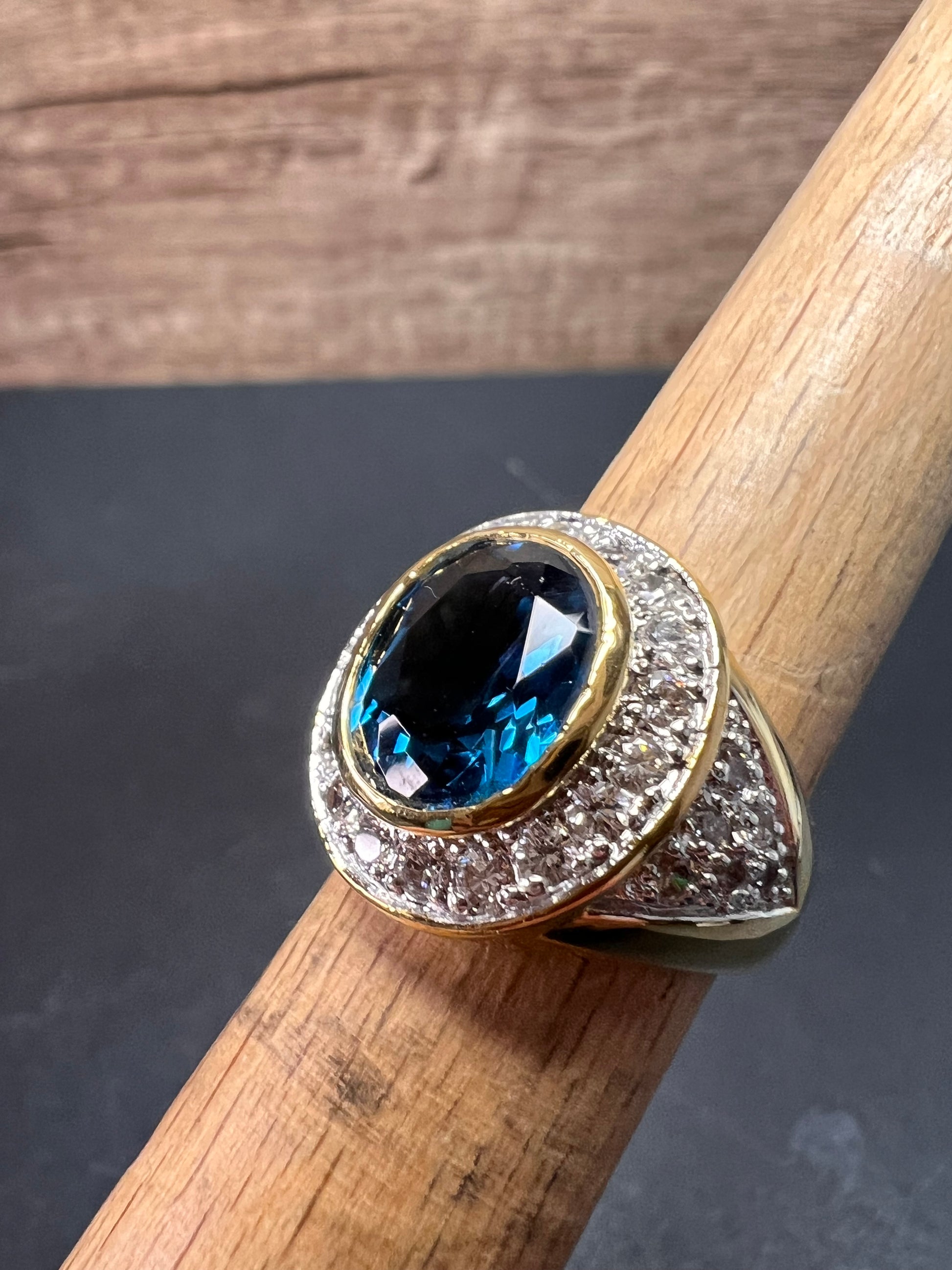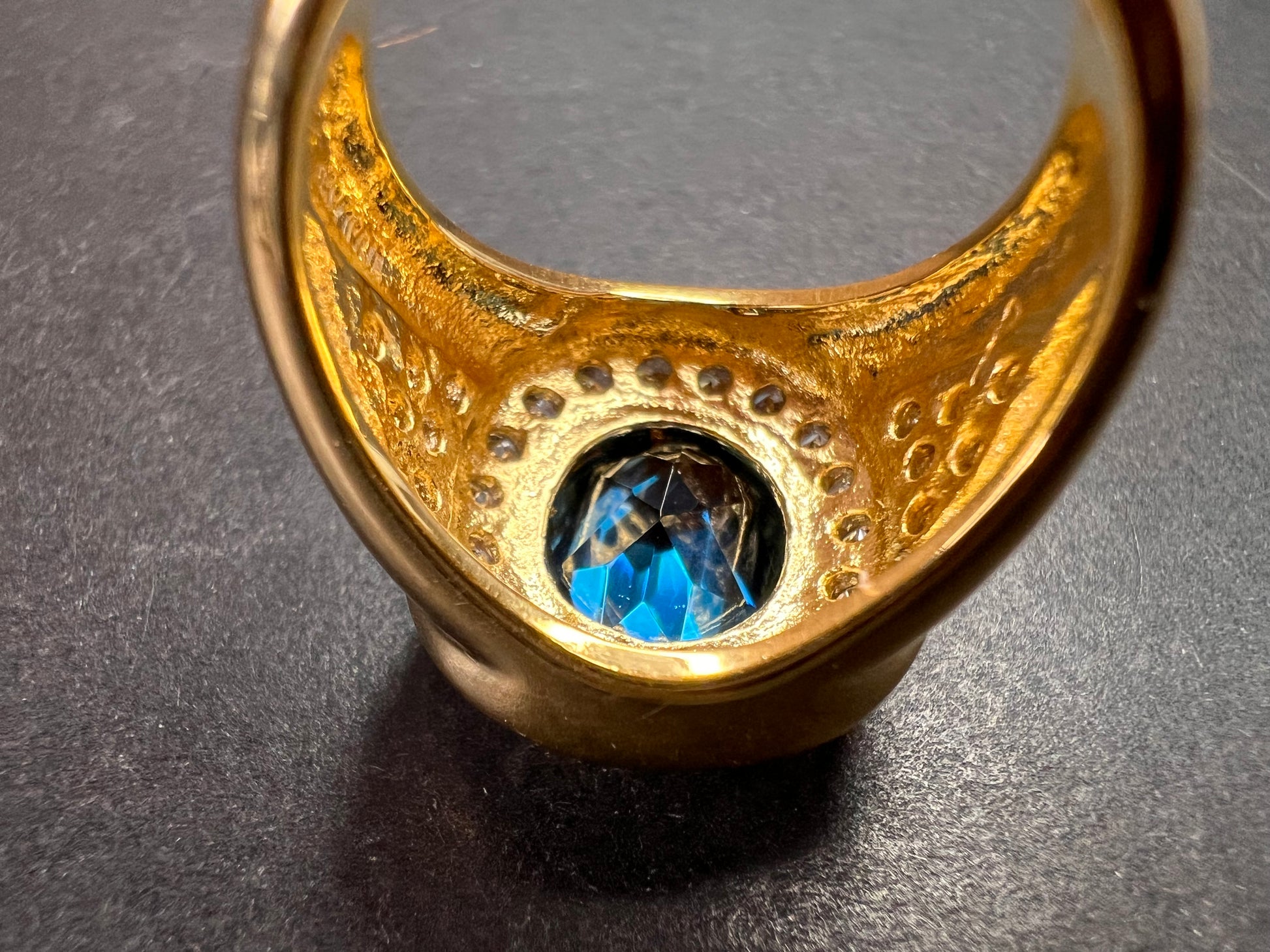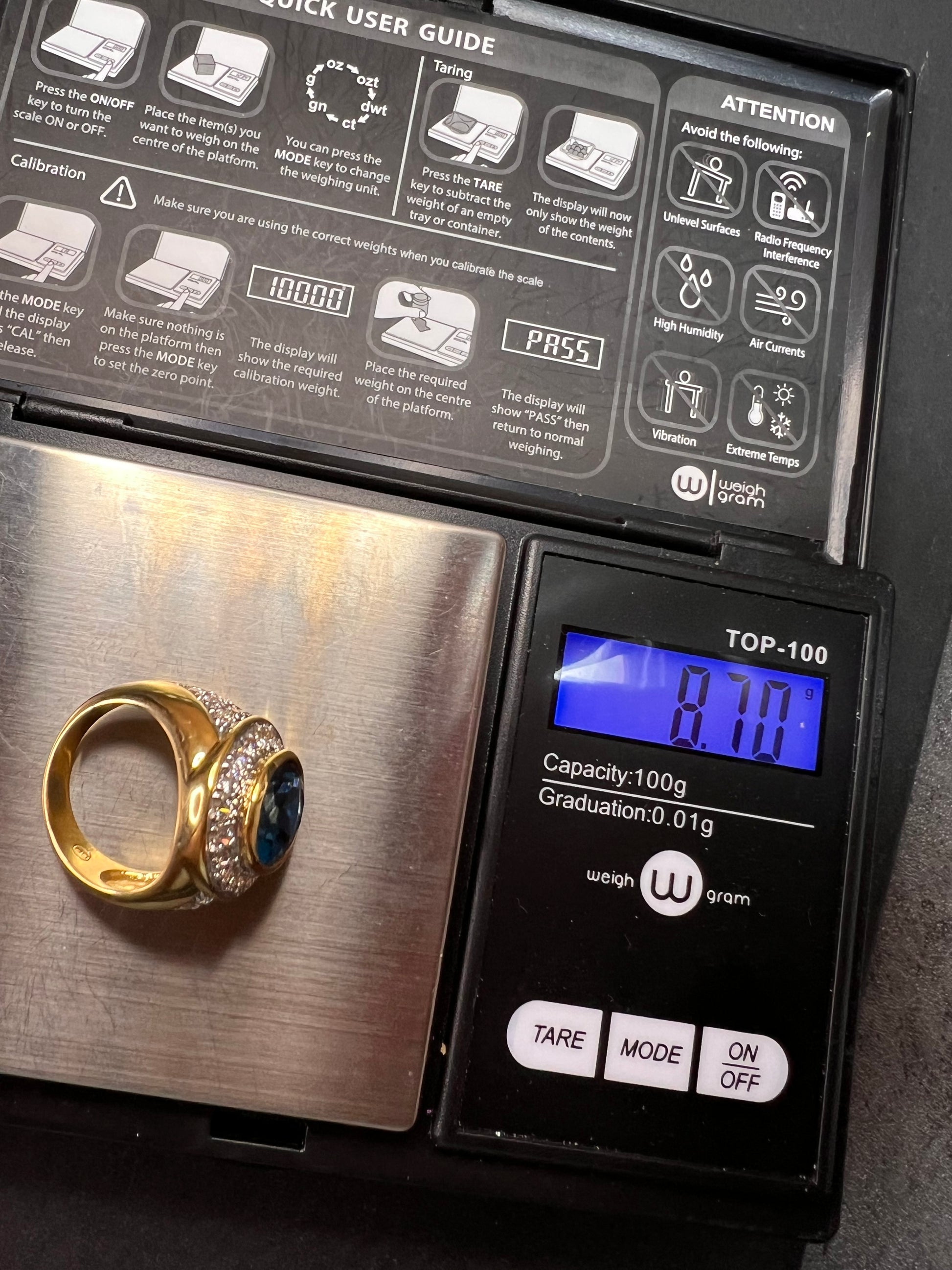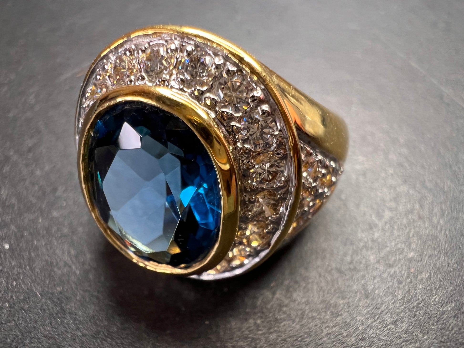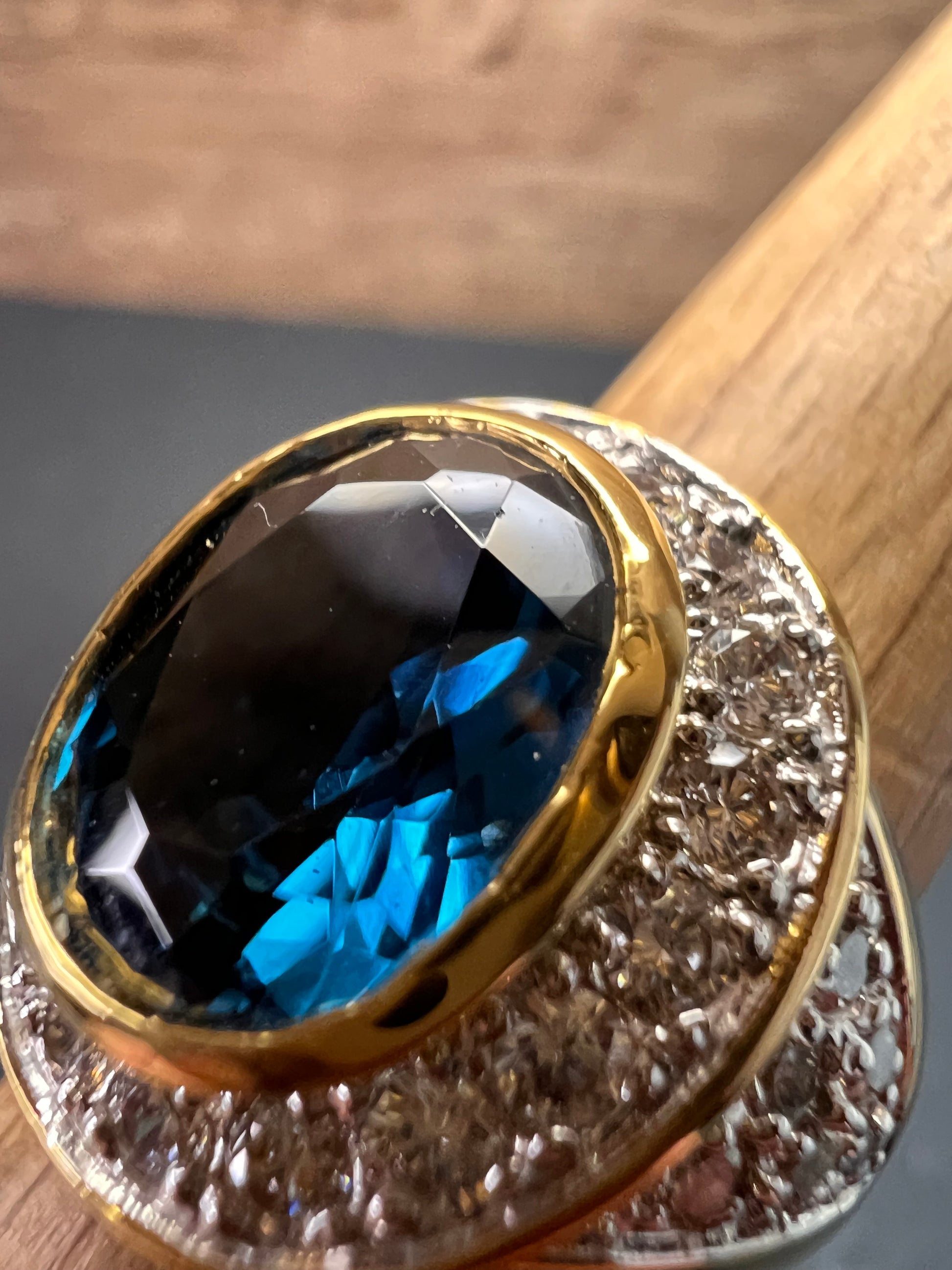 Big blue stone tests as spinel. Definitely a lab created one. White small accent stones test as cubic zirconia. Set in 18k yellow rolled gold (much thicker than vermeil but less than gold filled). It’s a heavier ring weighing 8.70 grams. No purity stamp. Only GR and Thailand. Measures a size 7. Fun durable ring !