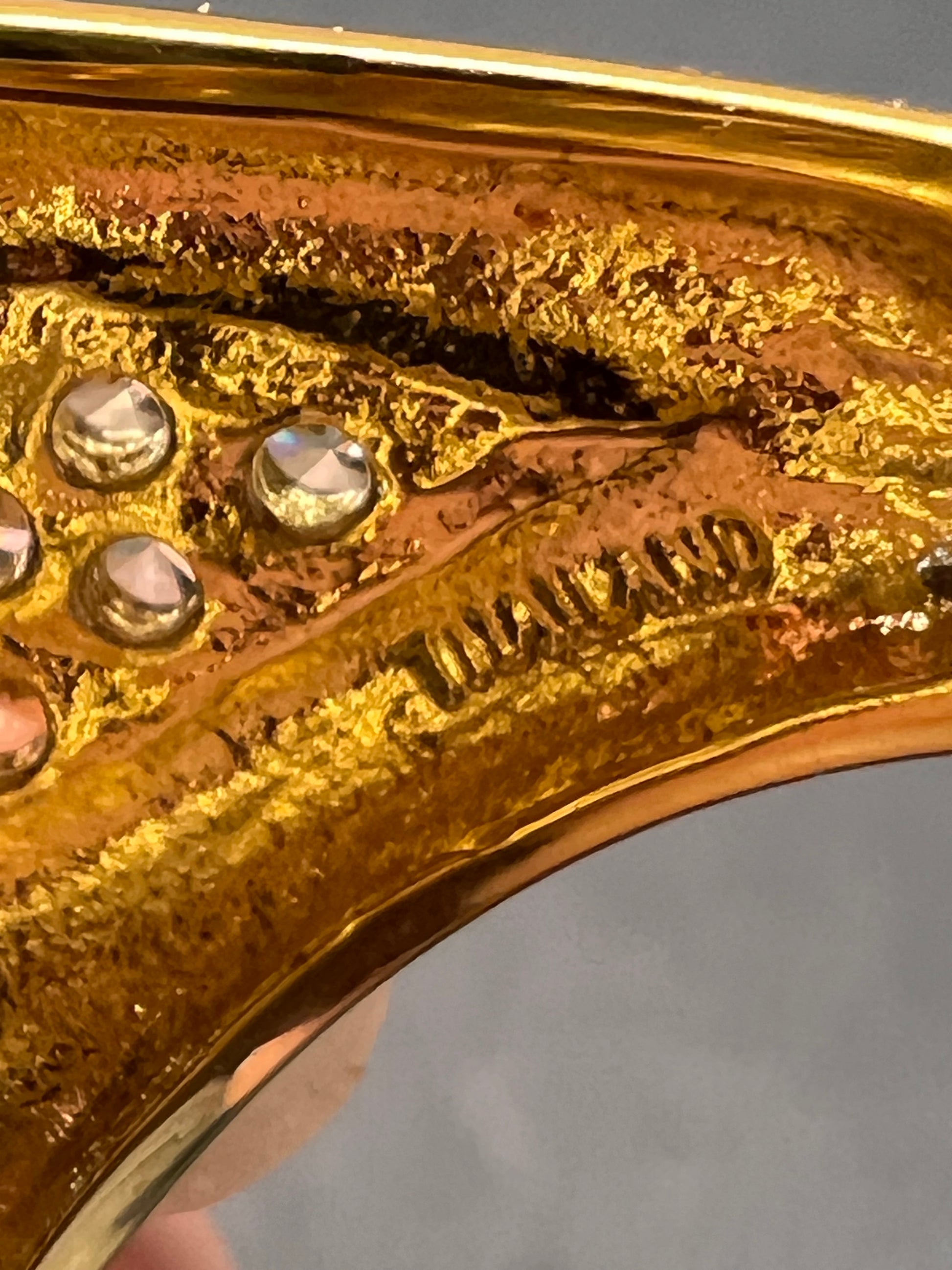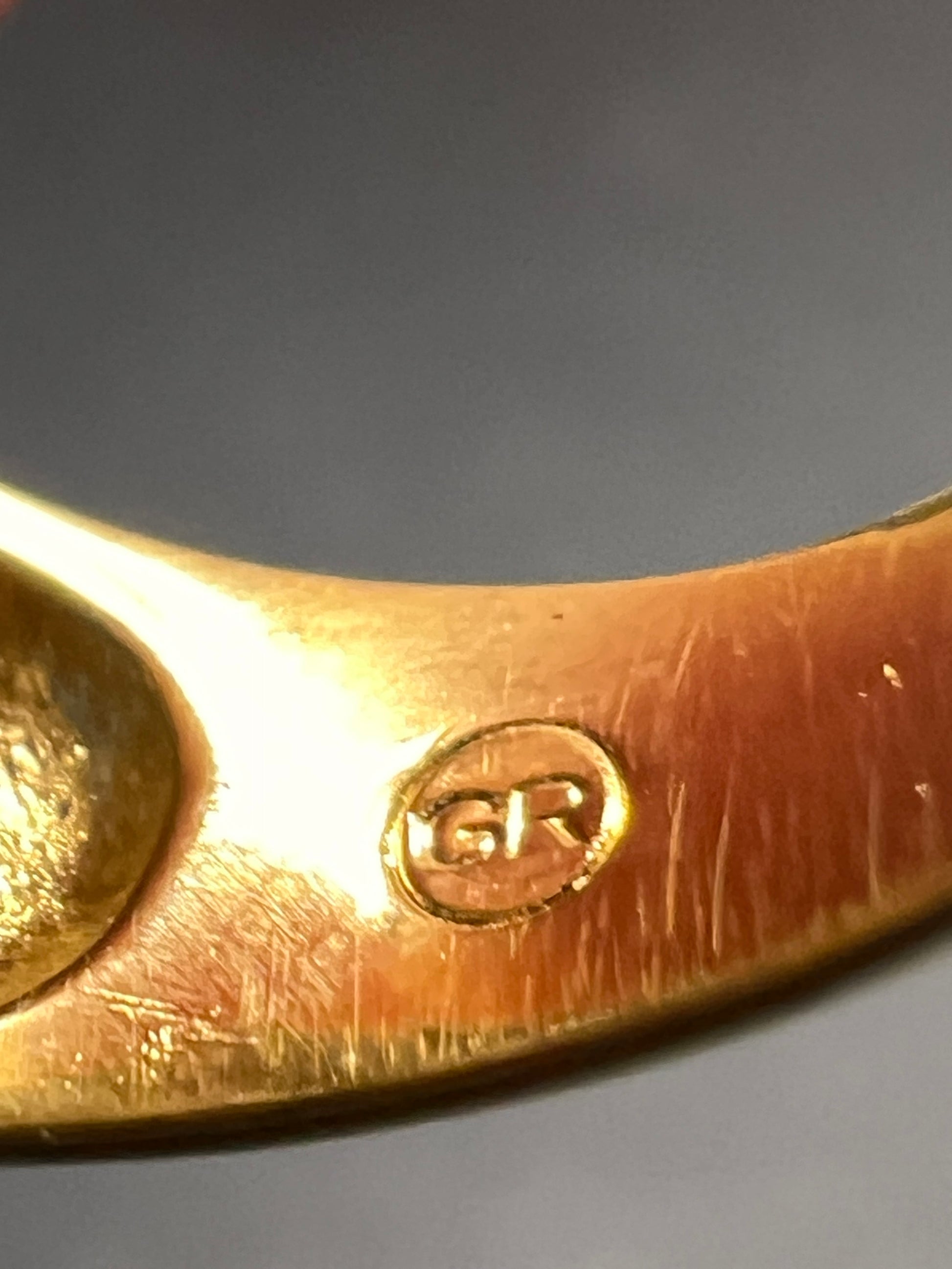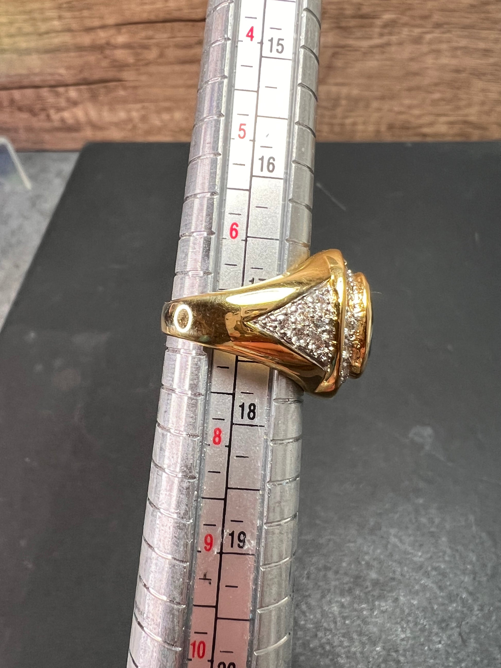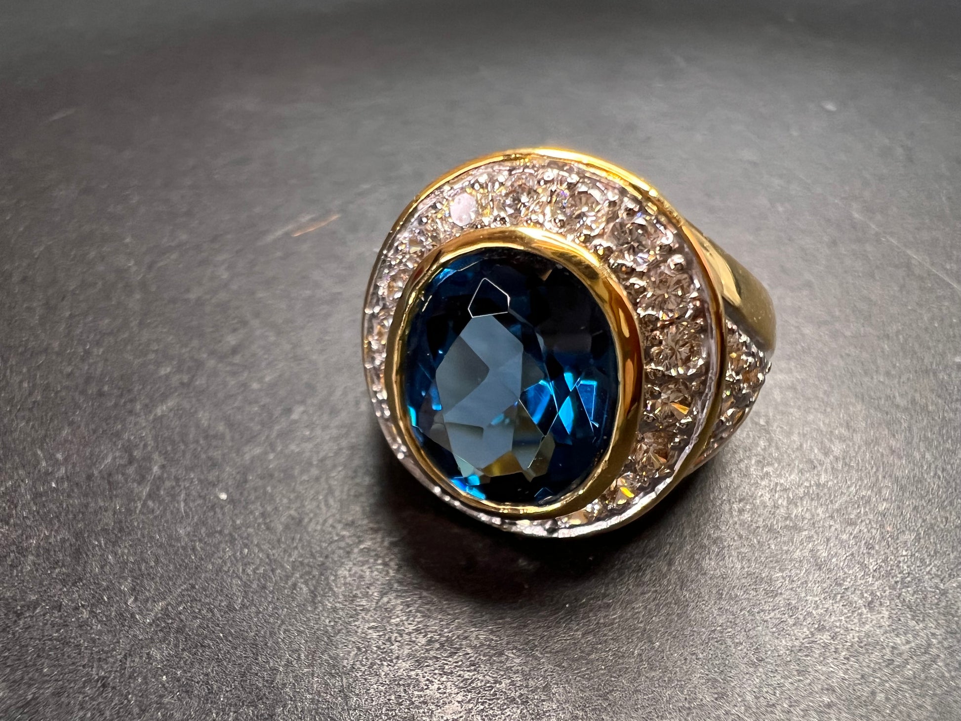Big blue stone tests as spinel. Definitely a lab created one. White small accent stones test as cubic zirconia. Set in 18k yellow rolled gold (much thicker than vermeil but less than gold filled). It’s a heavier ring weighing 8.70 grams. No purity stamp. Only GR and Thailand. Measures a size 7. Fun durable ring !