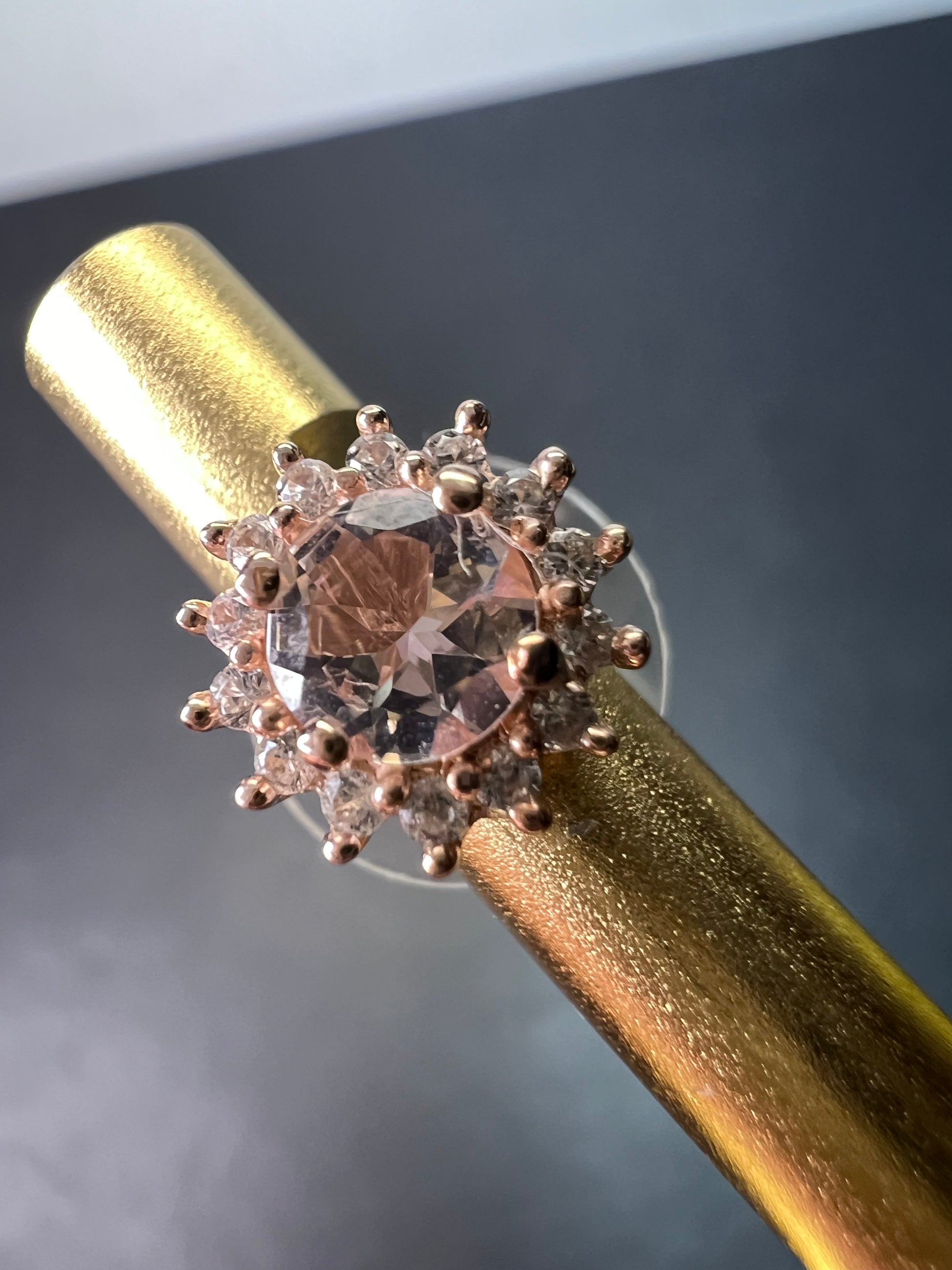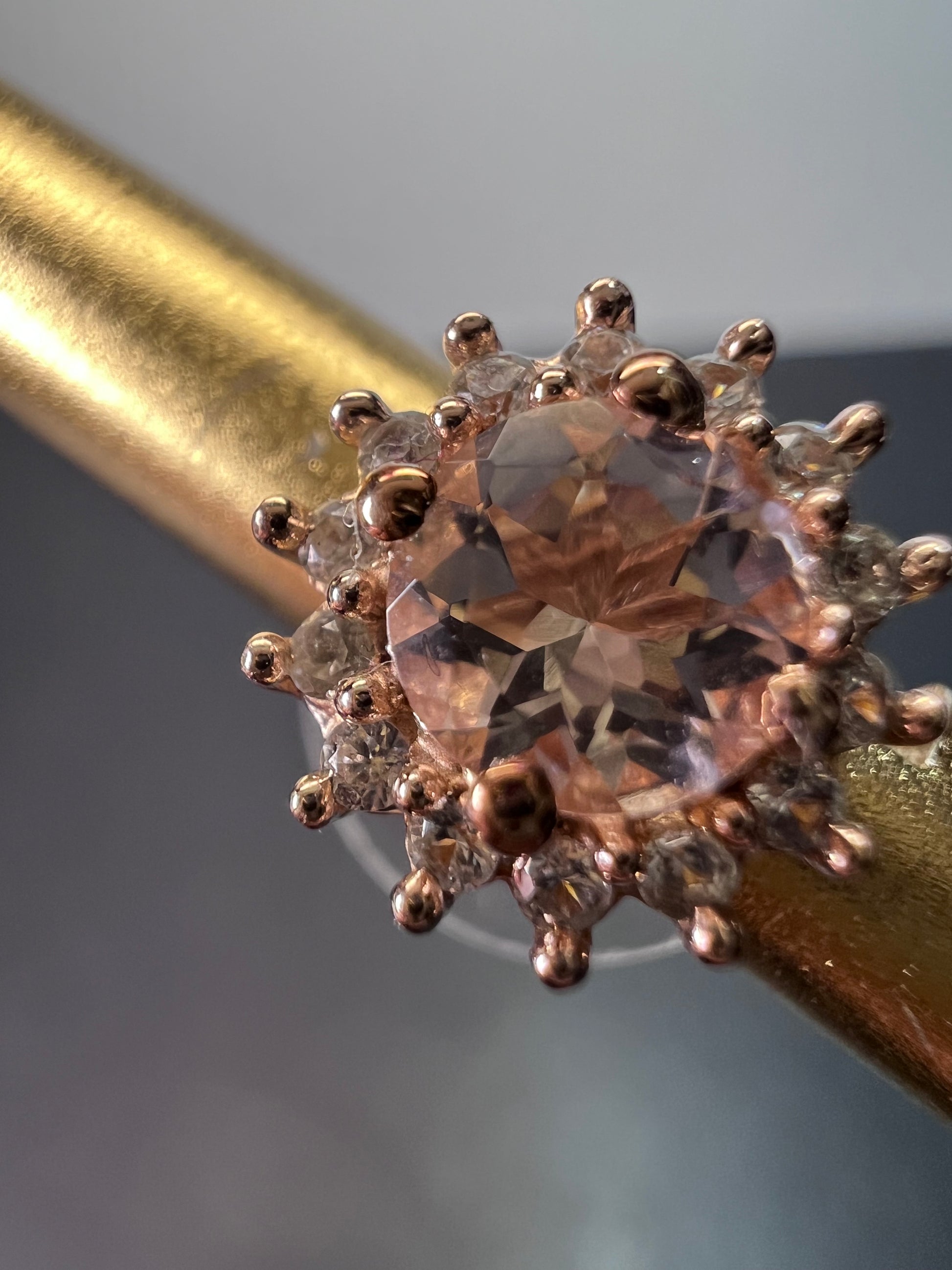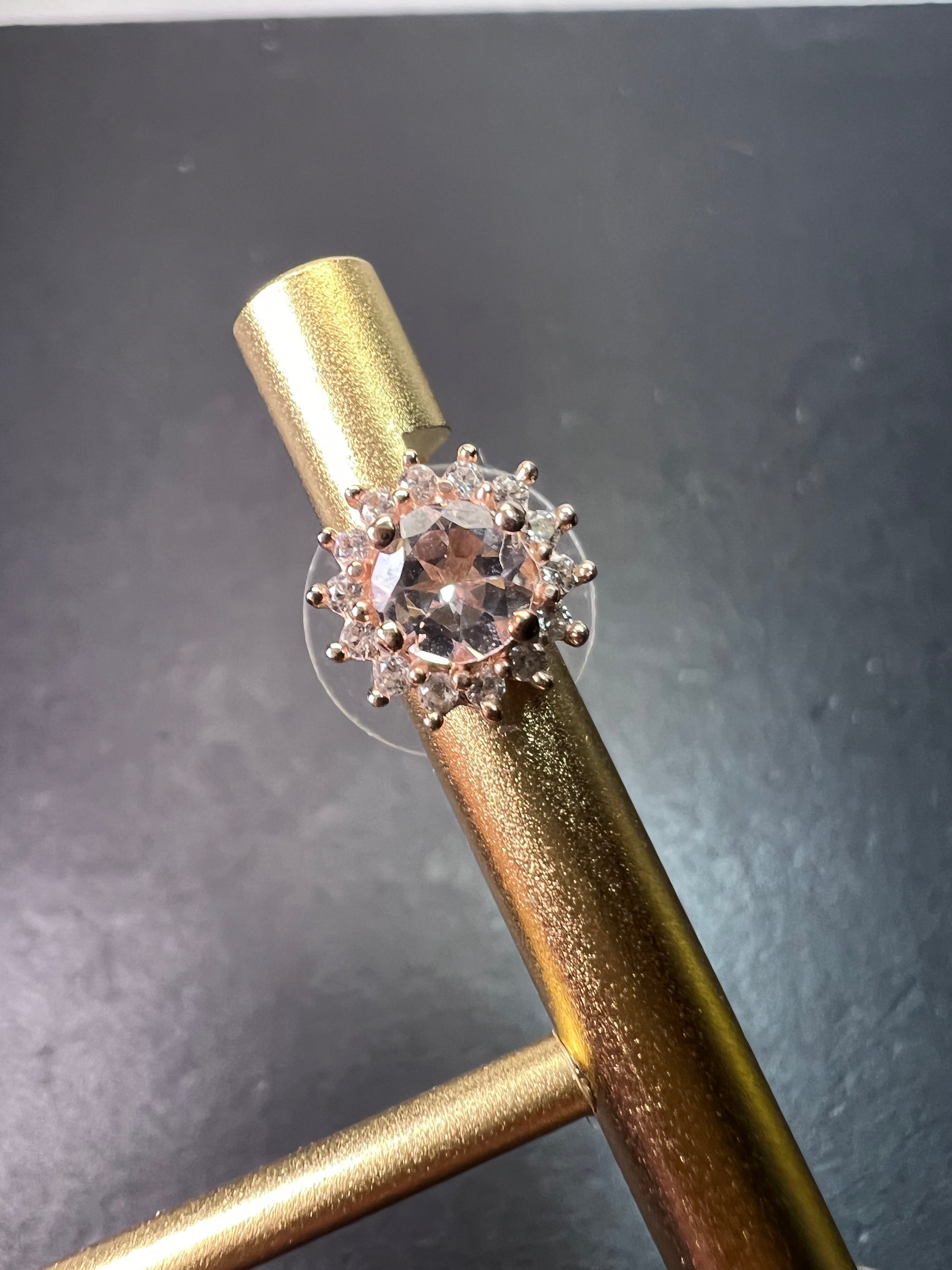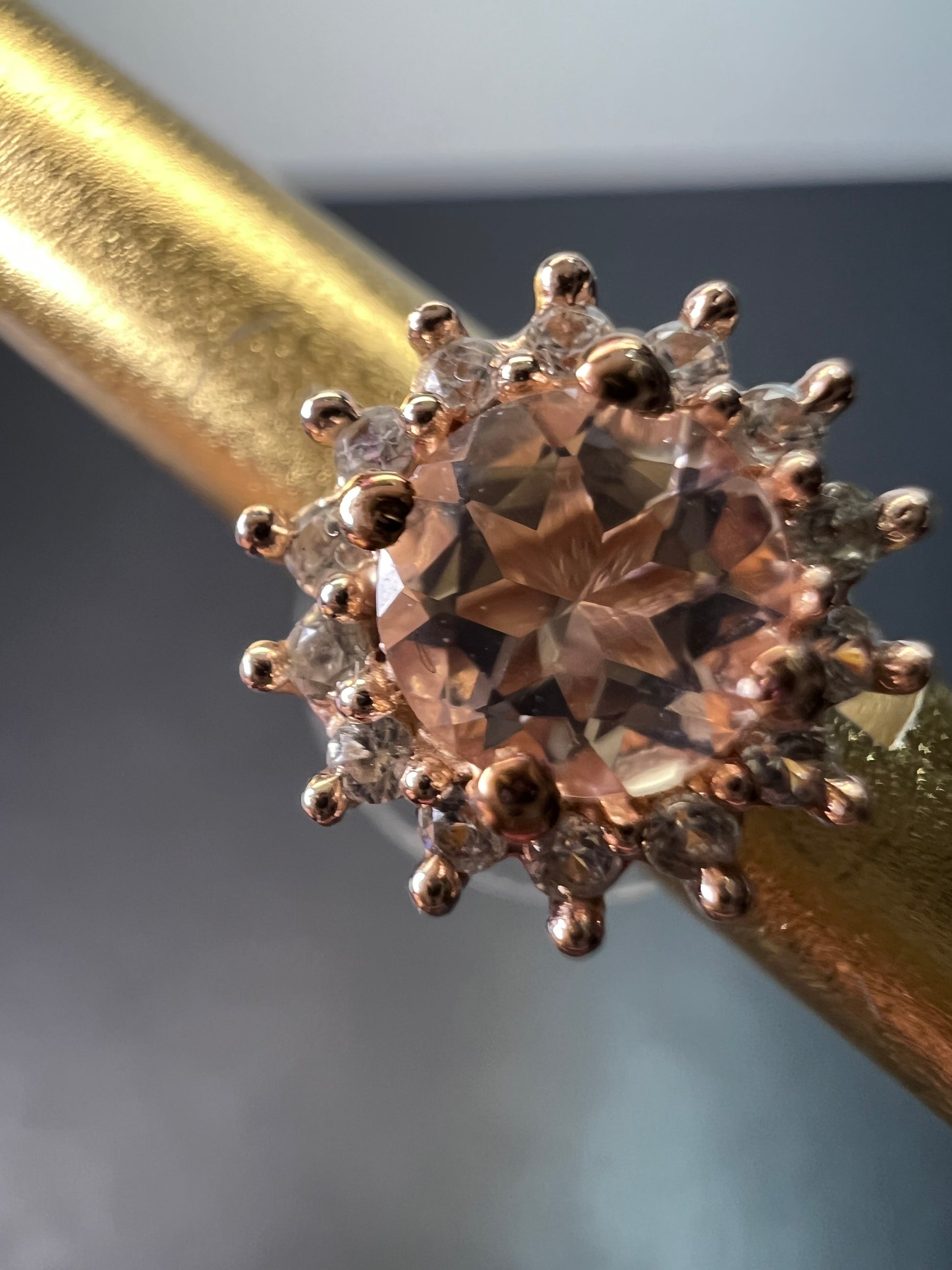 18k rose gold plated over sterling silver. morganite stones in the center surrounded by white topaz stones around the halo. No issues found.