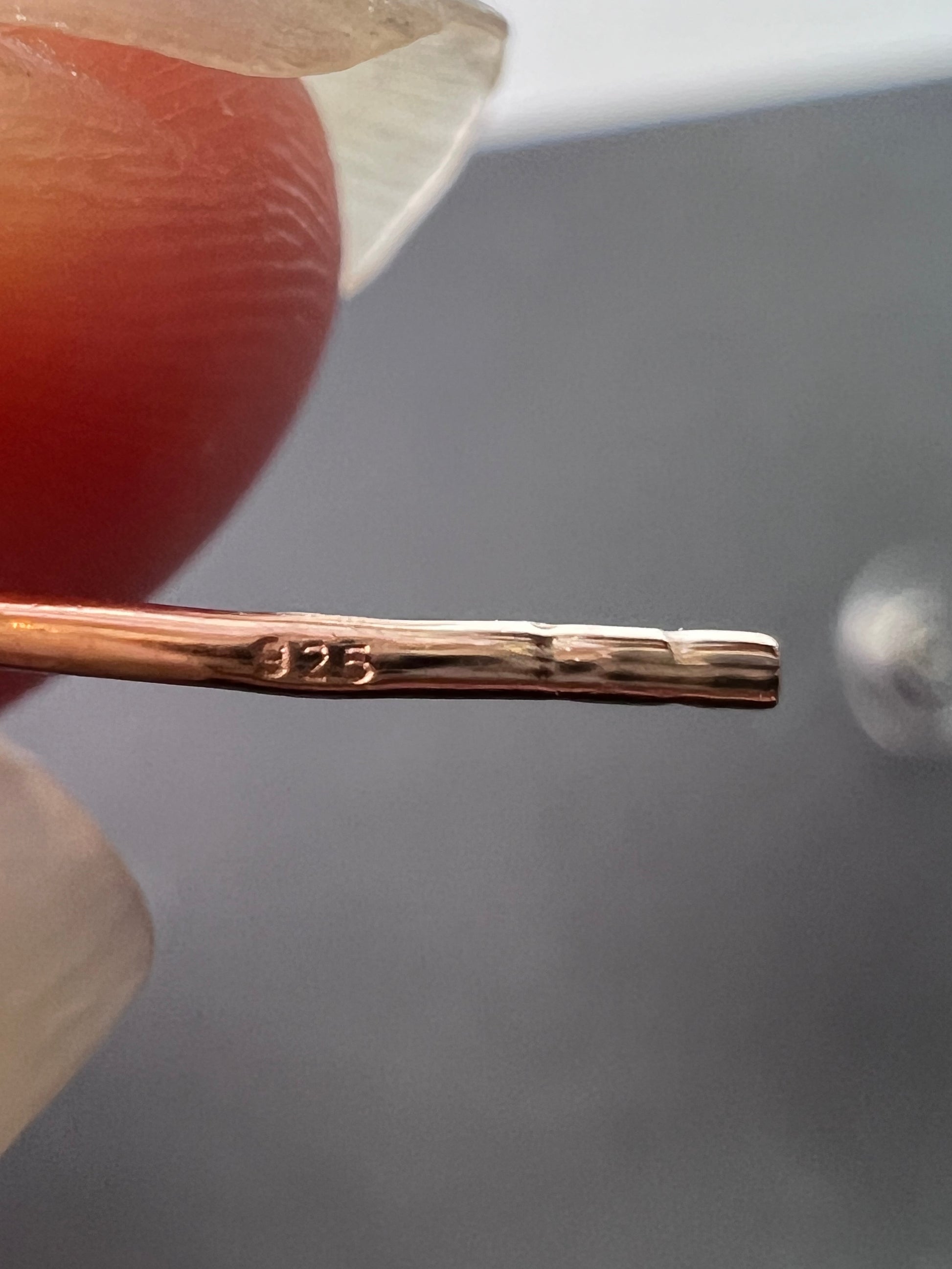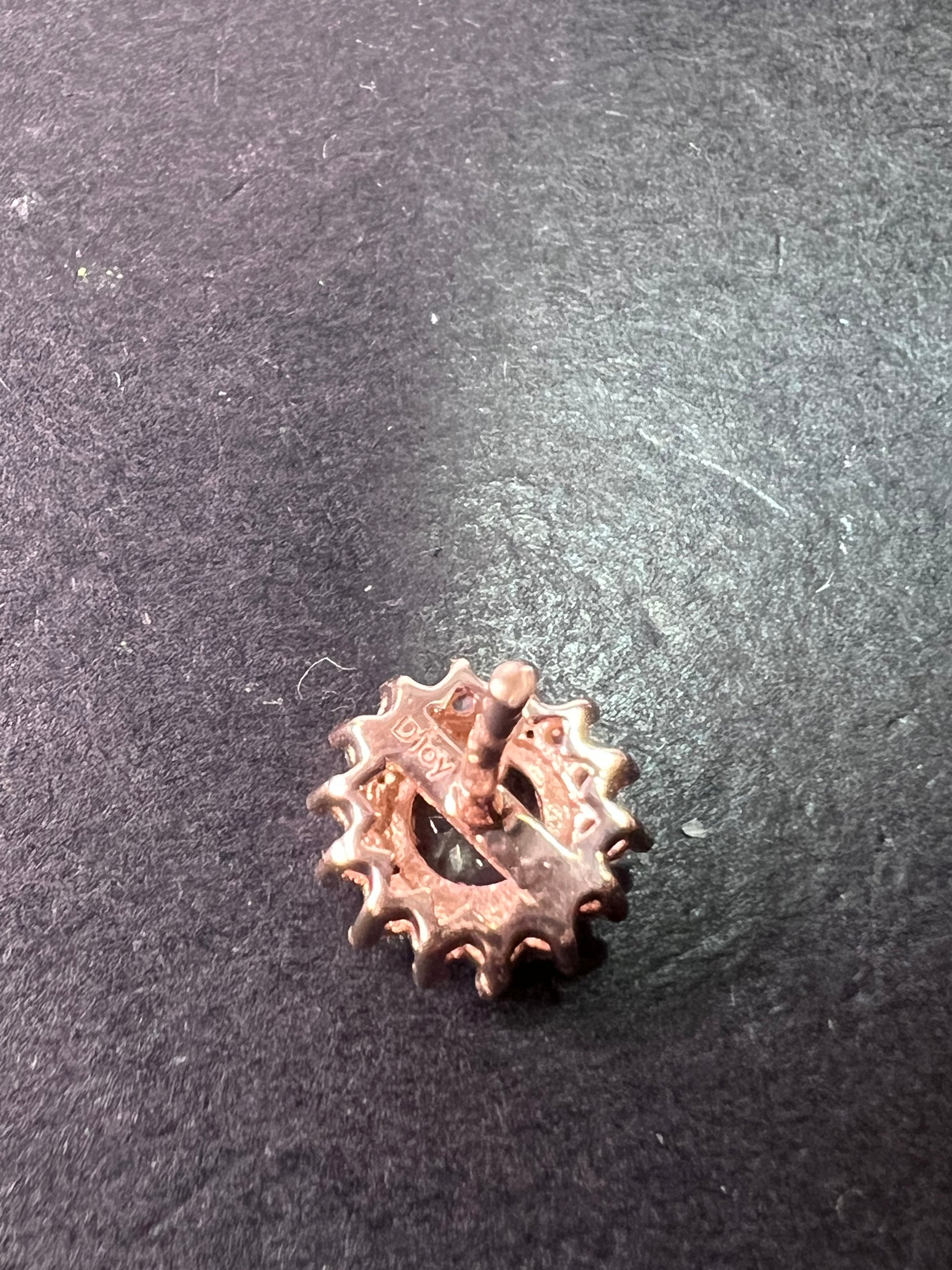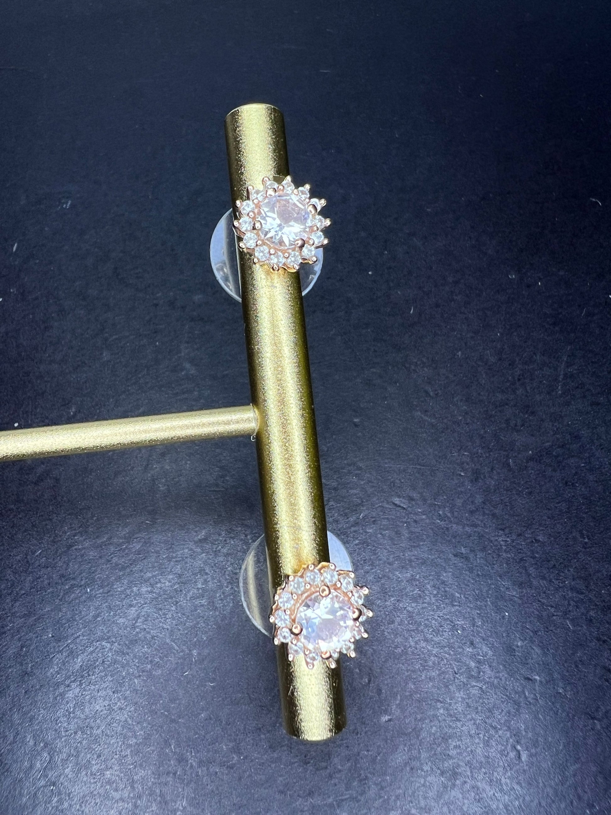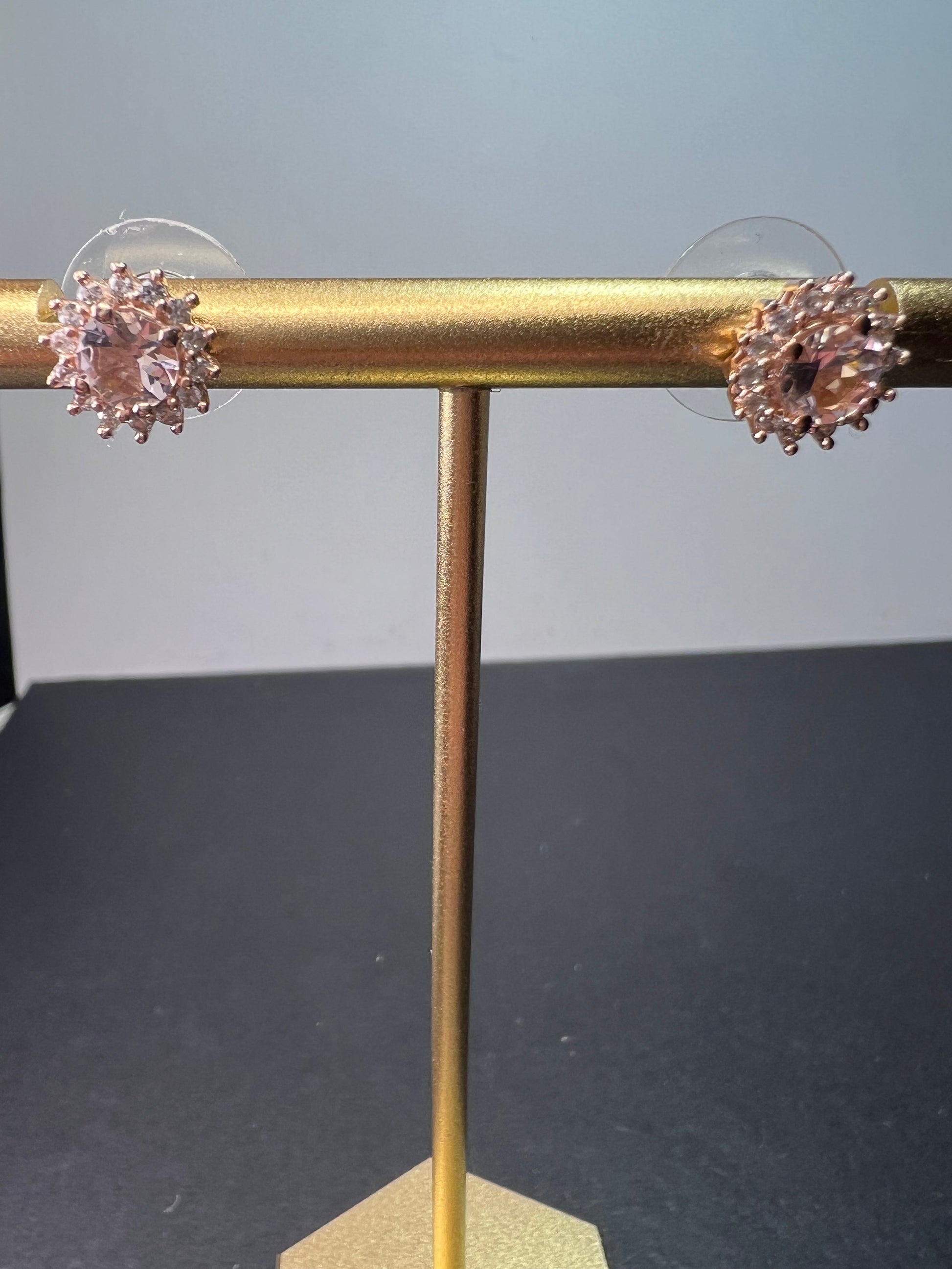 18k rose gold plated over sterling silver. morganite stones in the center surrounded by white topaz stones around the halo. No issues found.