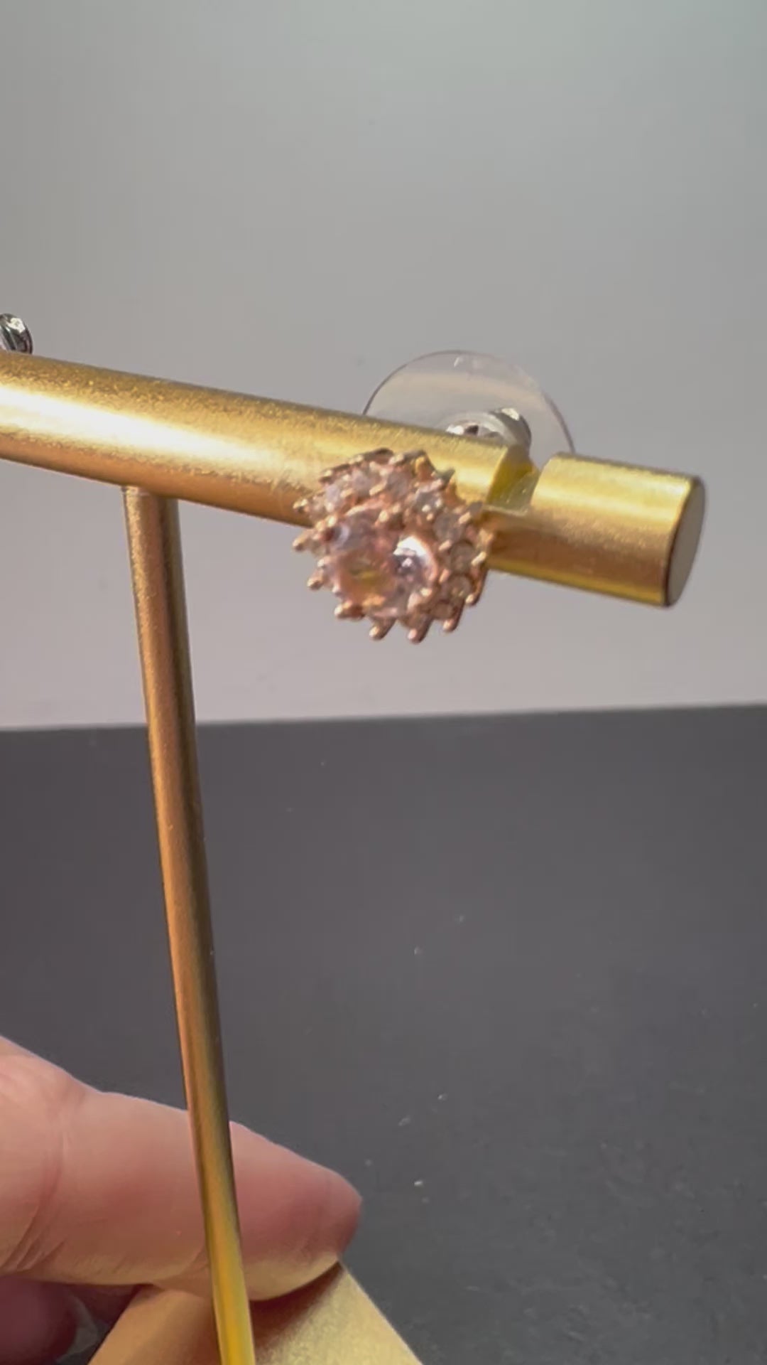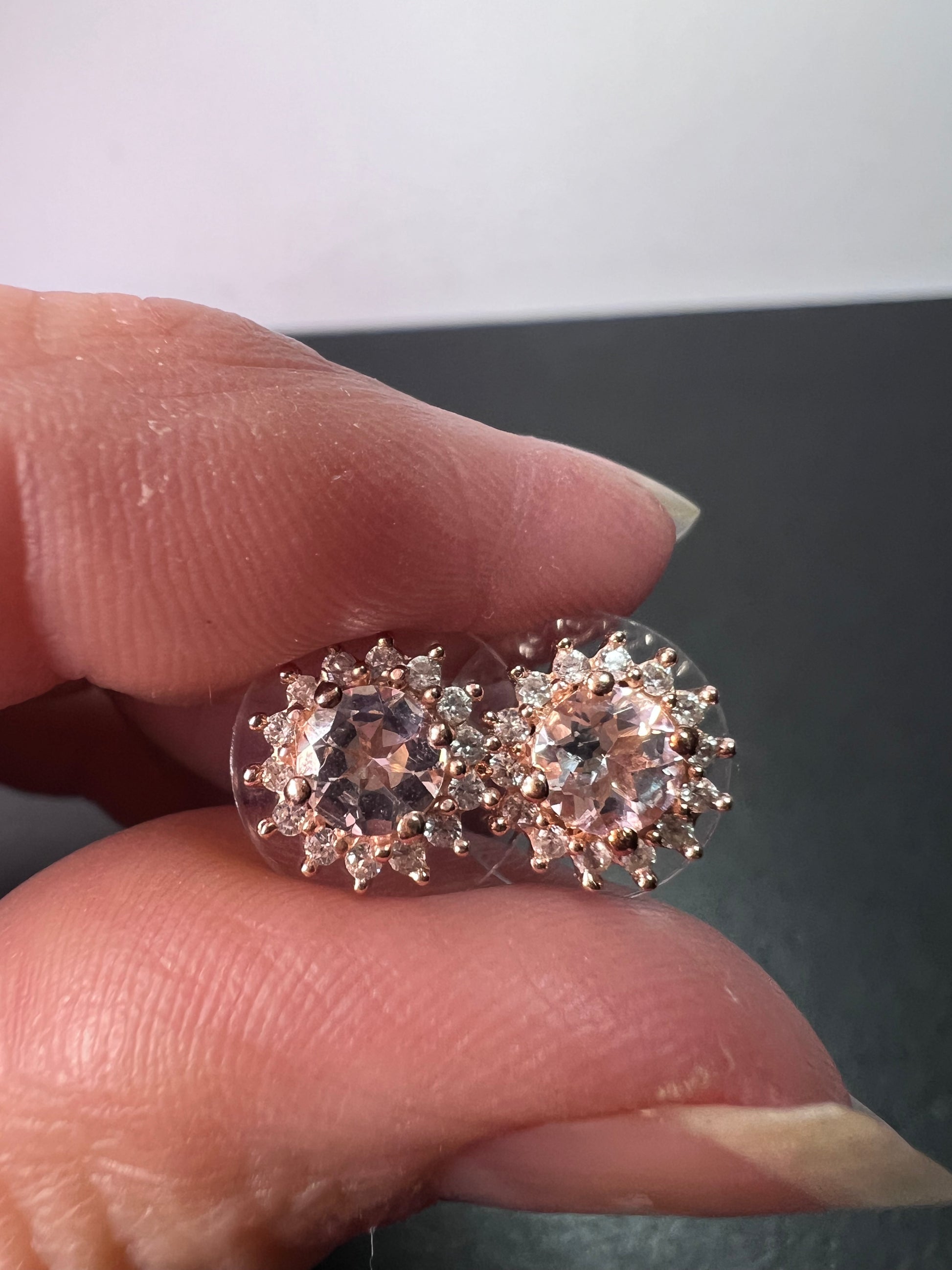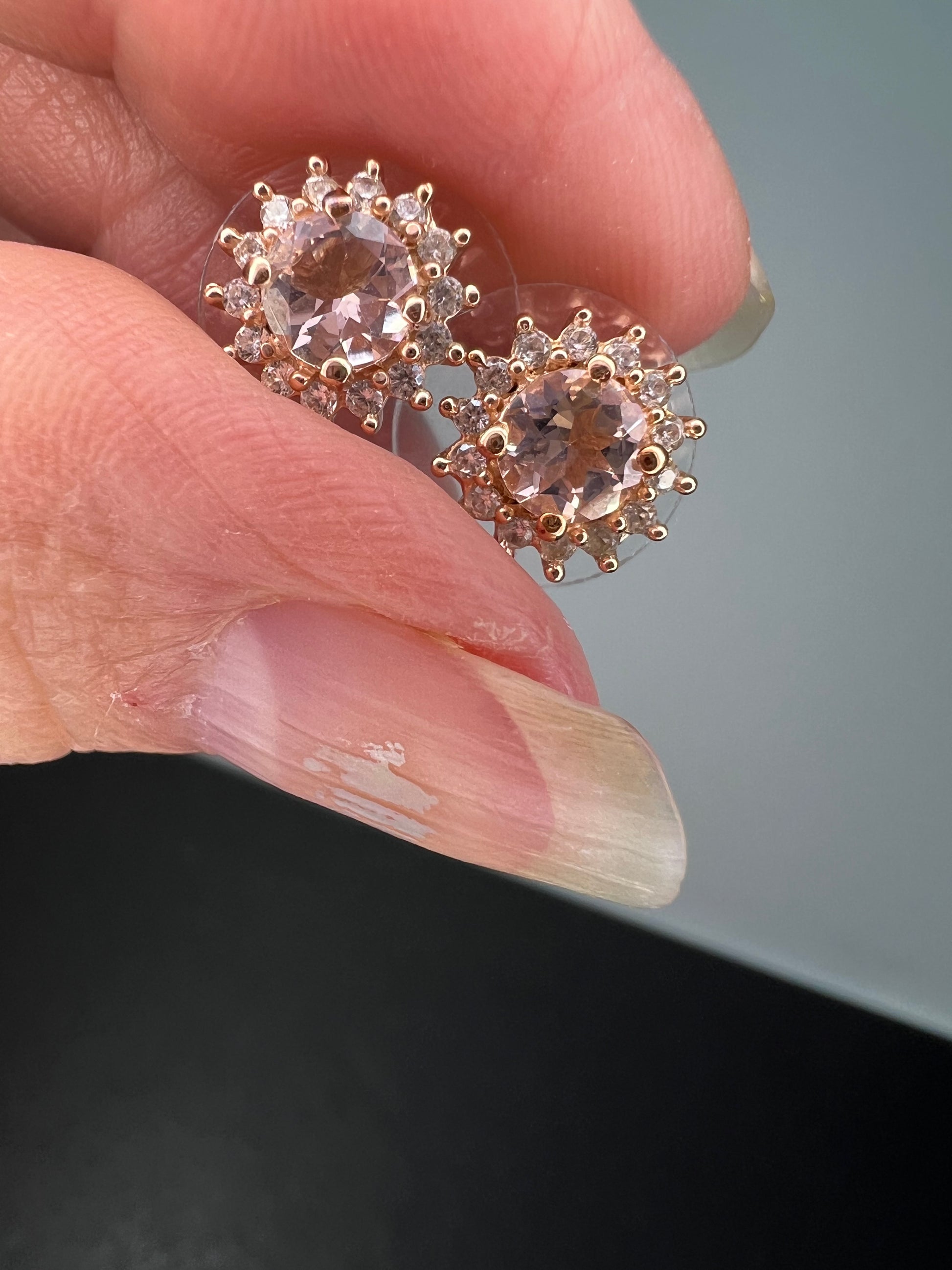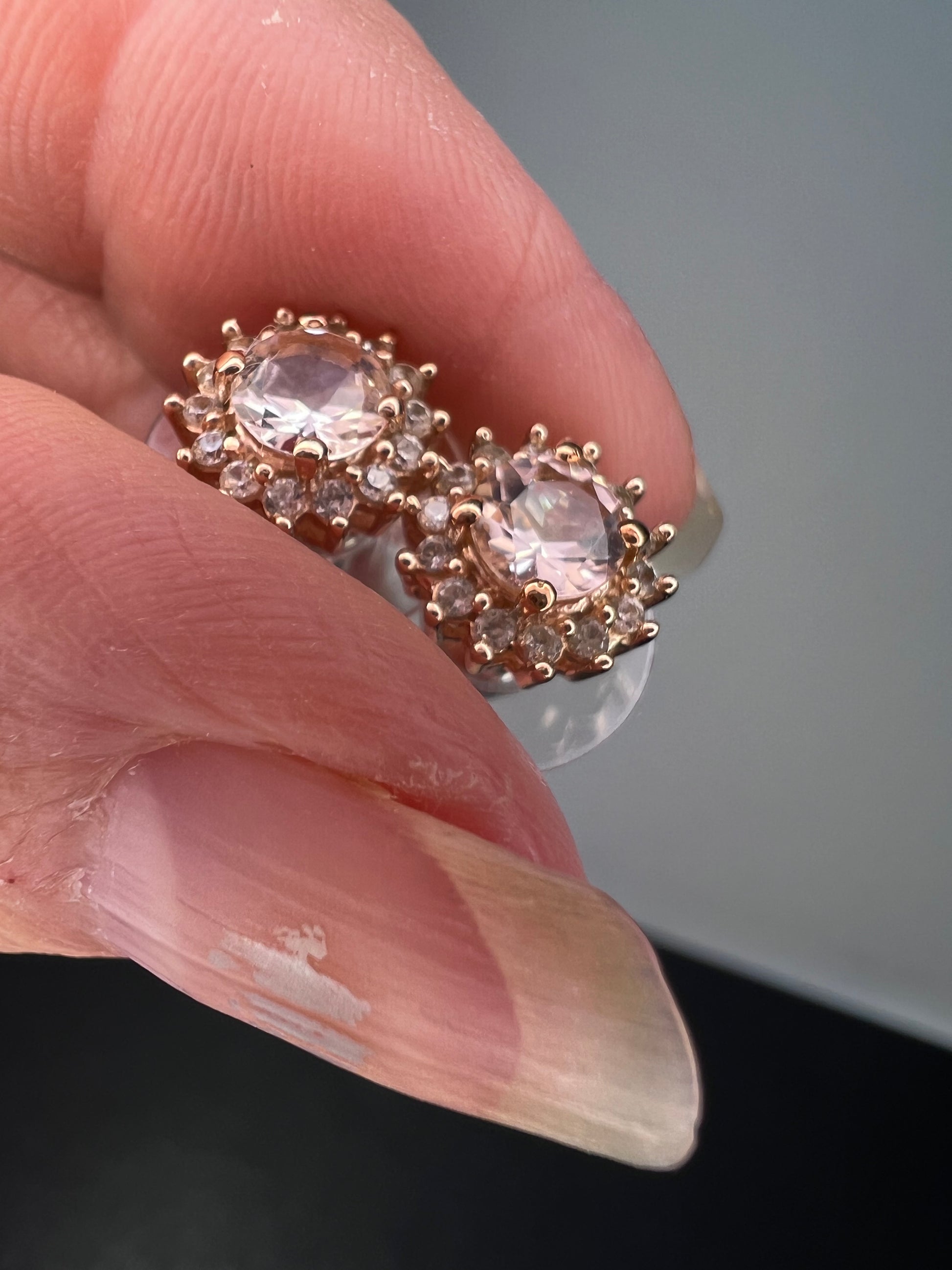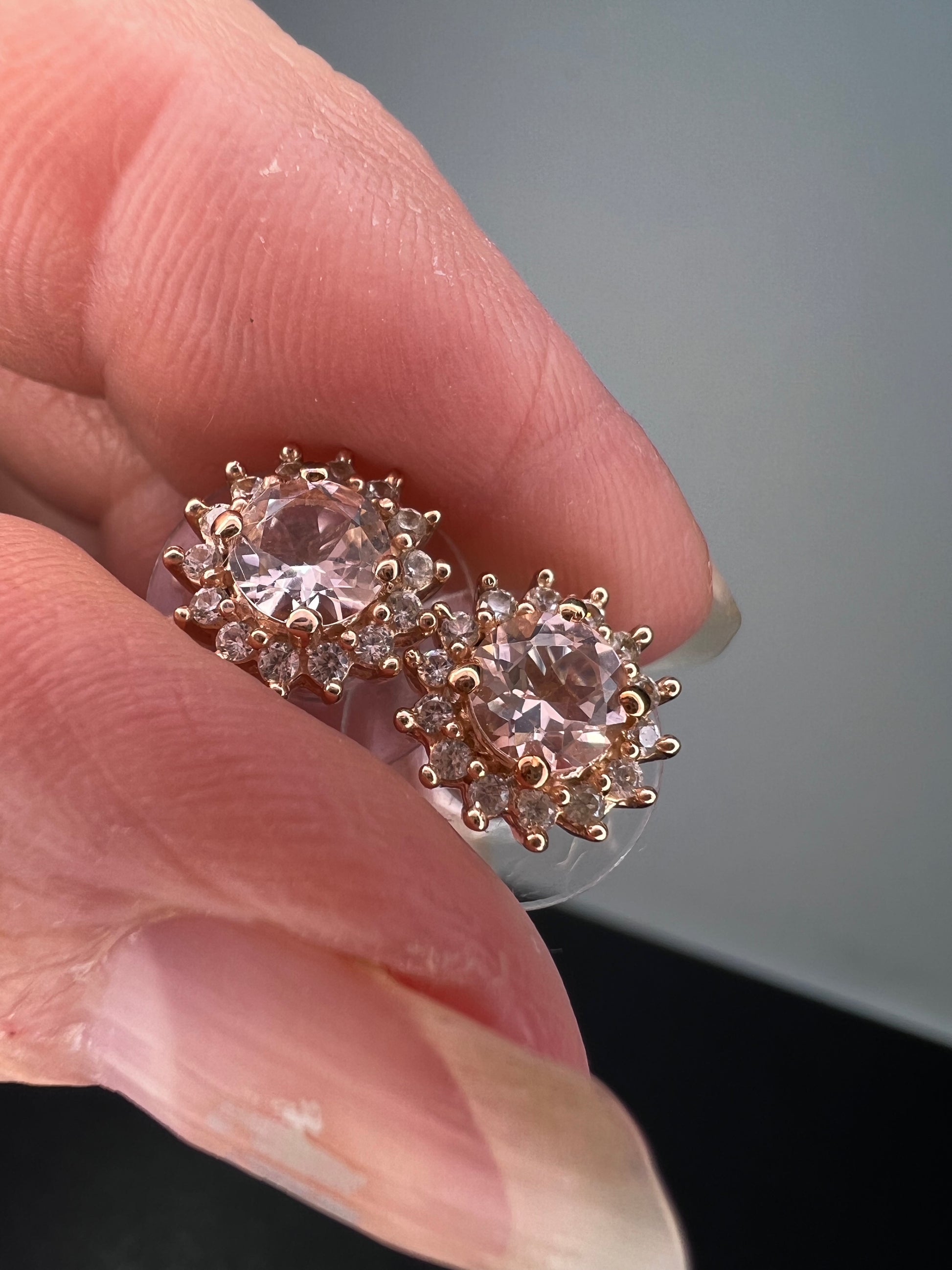 morganite and white topaz halo stud earrings in 18k rose gold over sterling
