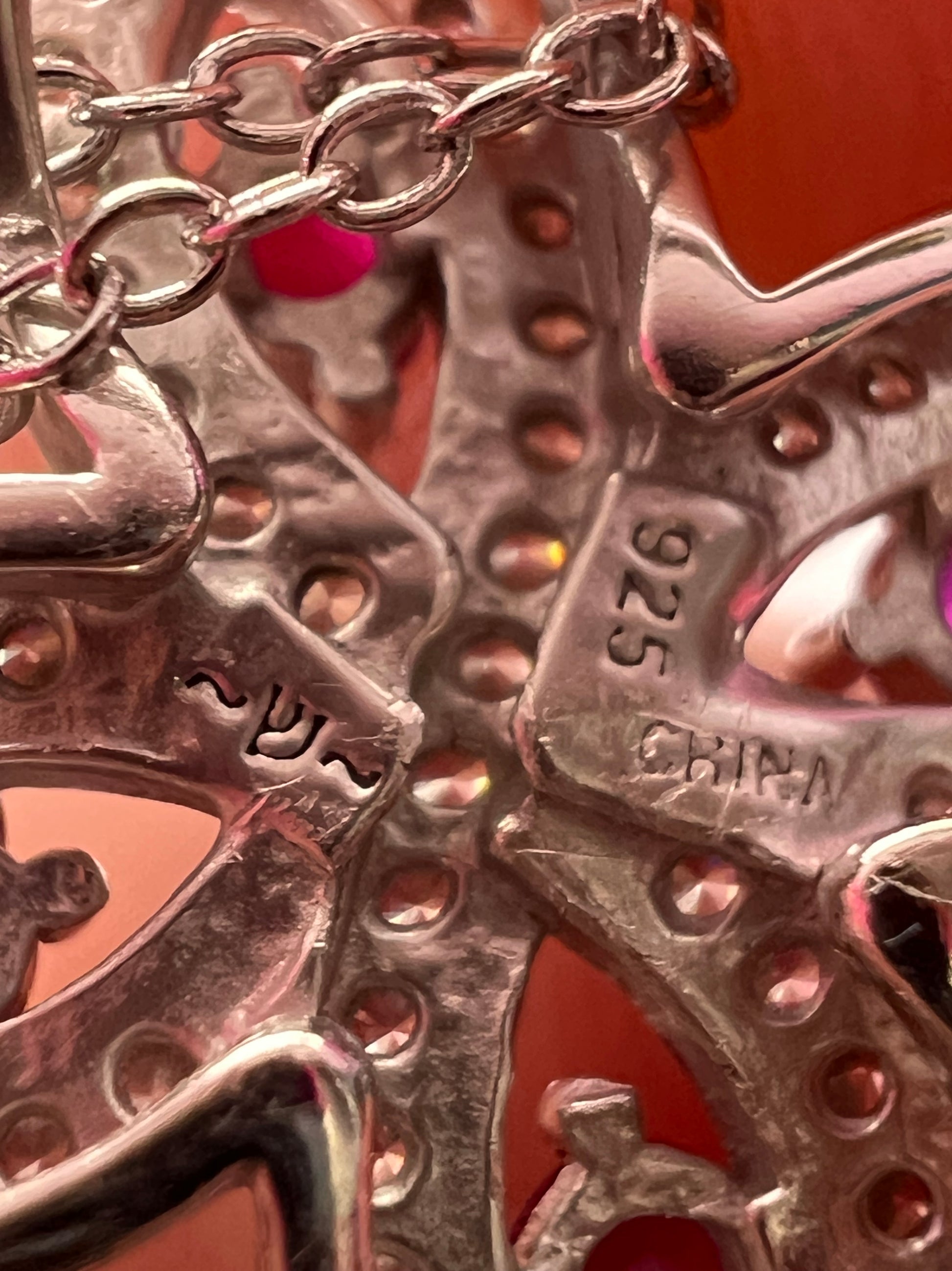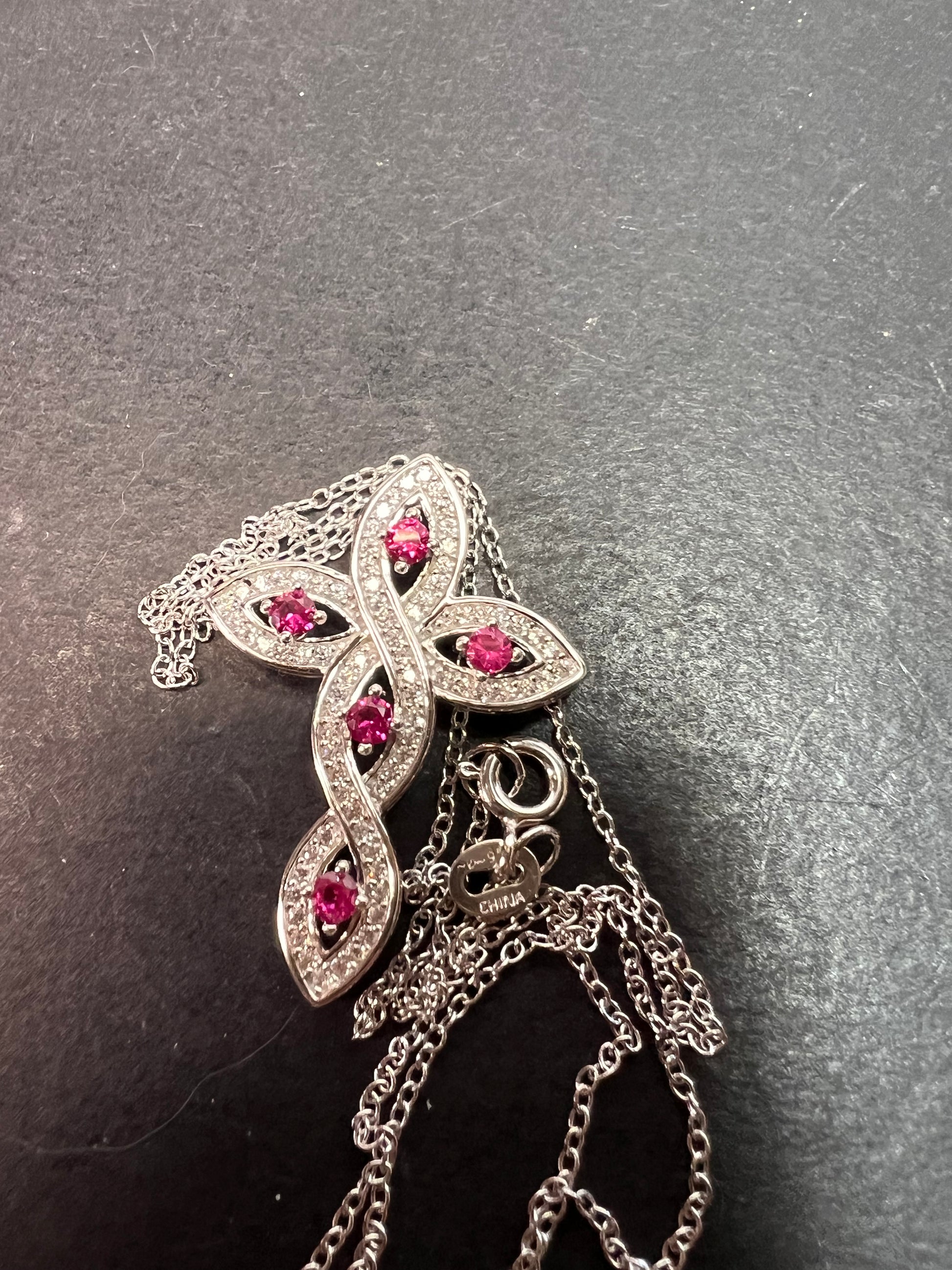 Pink gemstones are lab grown rubies. Tiny white accent stones are most likely CZ , although a couple tested as lab diamond. Chain is also 925 measuring 18 inches in length.