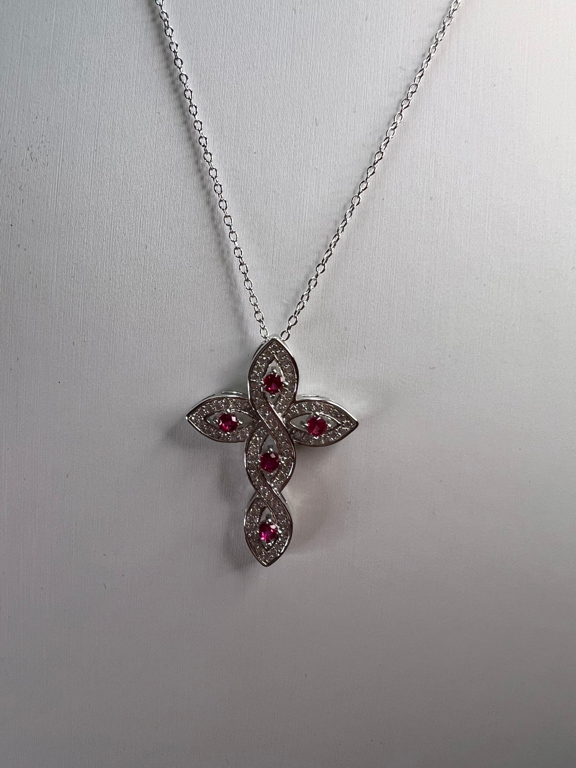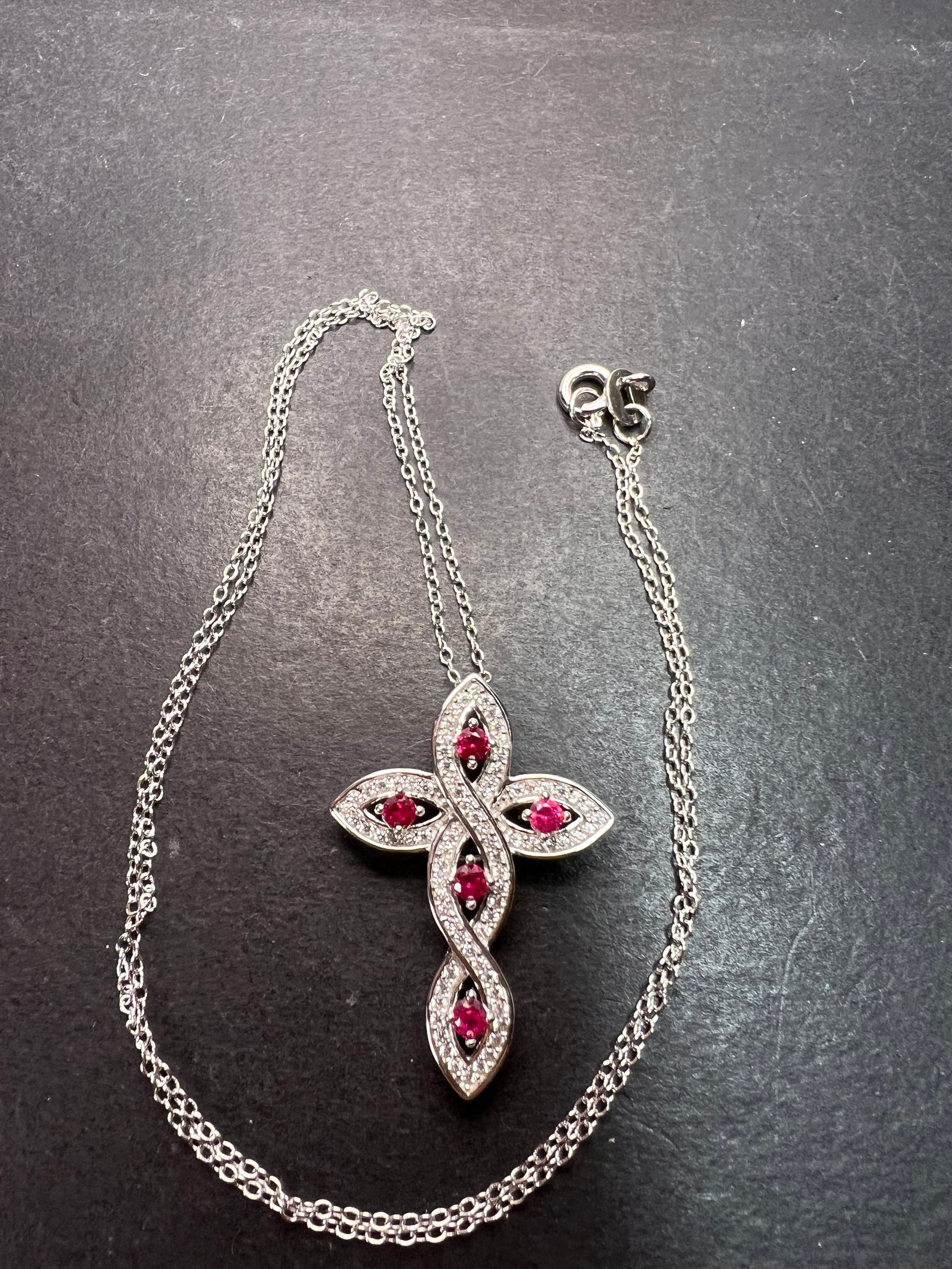Lab grown ruby and CZ cross pendant and chain necklace in rhodium over sterling silver 18 inch