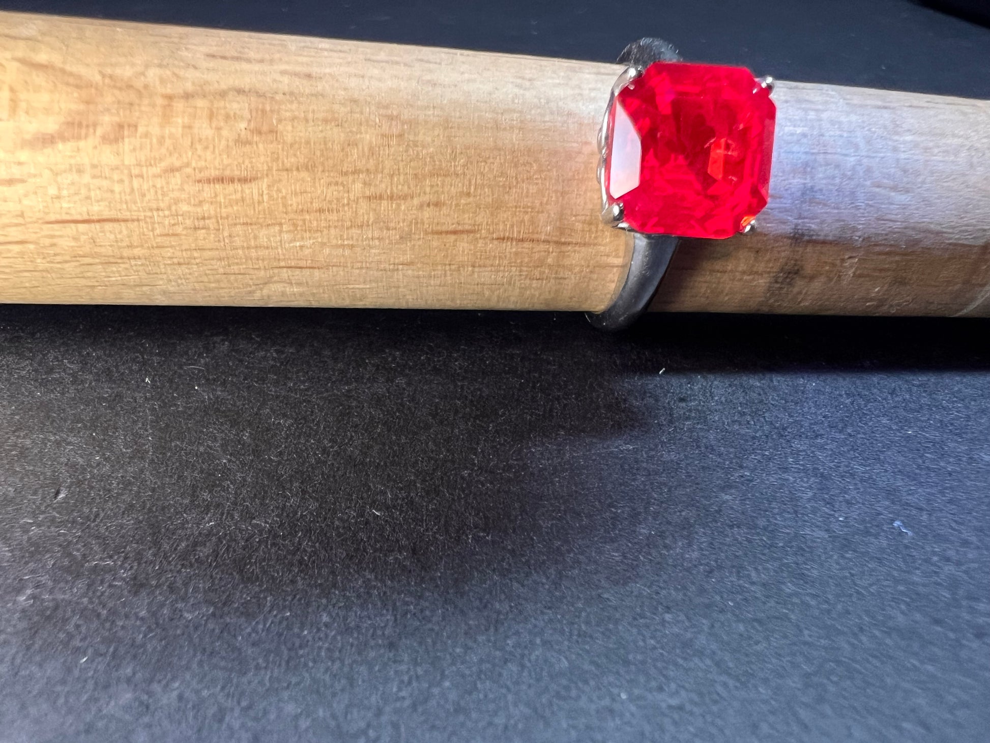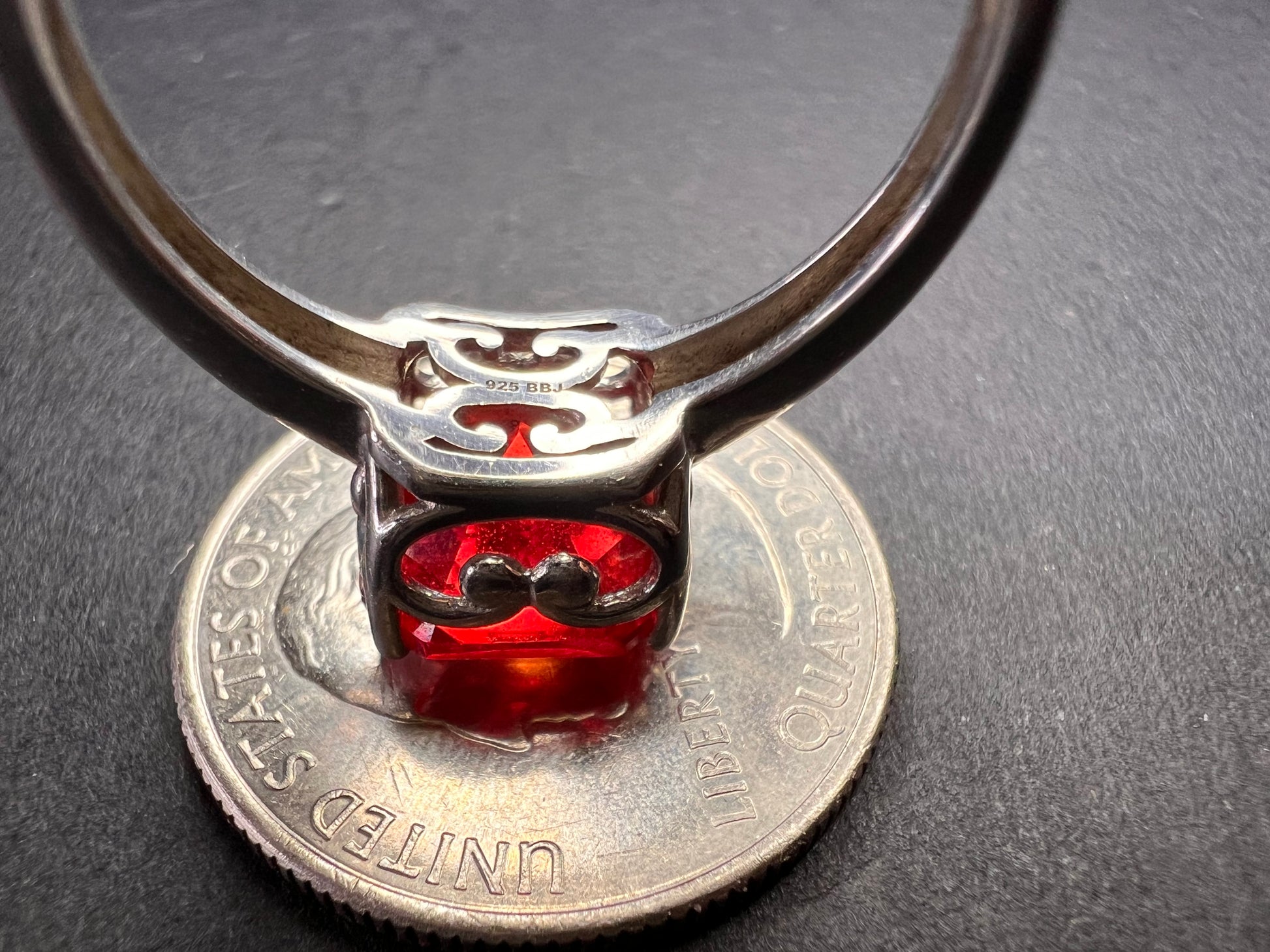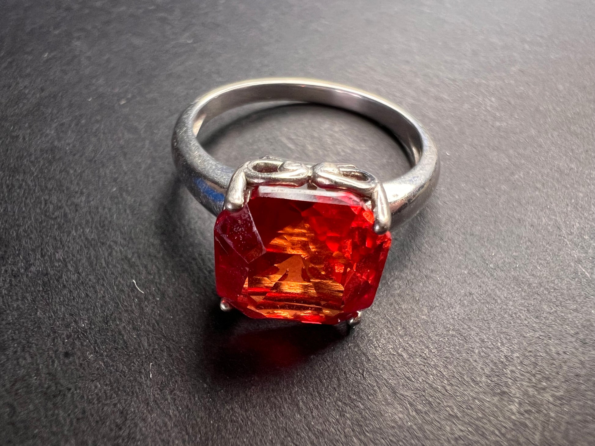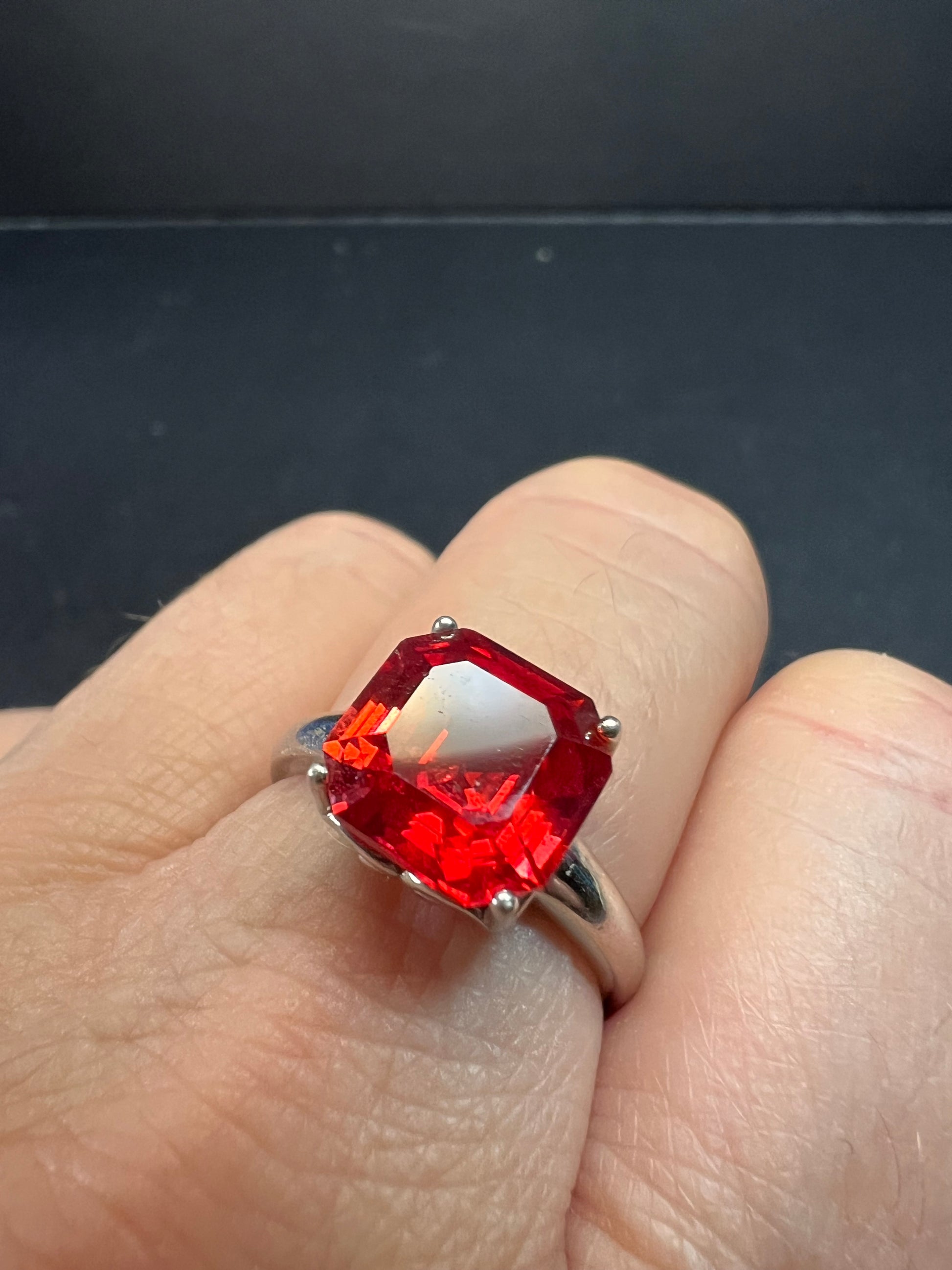 Featuring a big radiant square cut lab created padparadscha sapphire stone. Set in rhodium plated over sterling silver. Size 9 . This sapphire glows under UV light. Measures about 10 mm around. BBJ 925