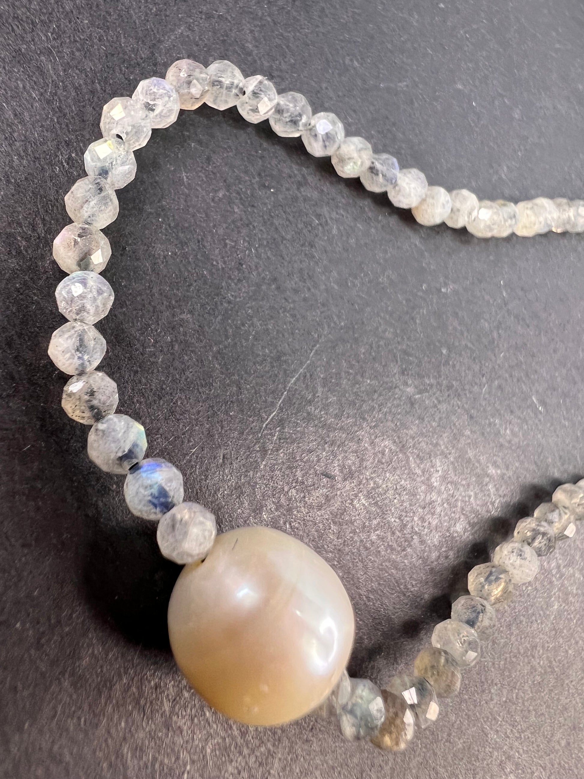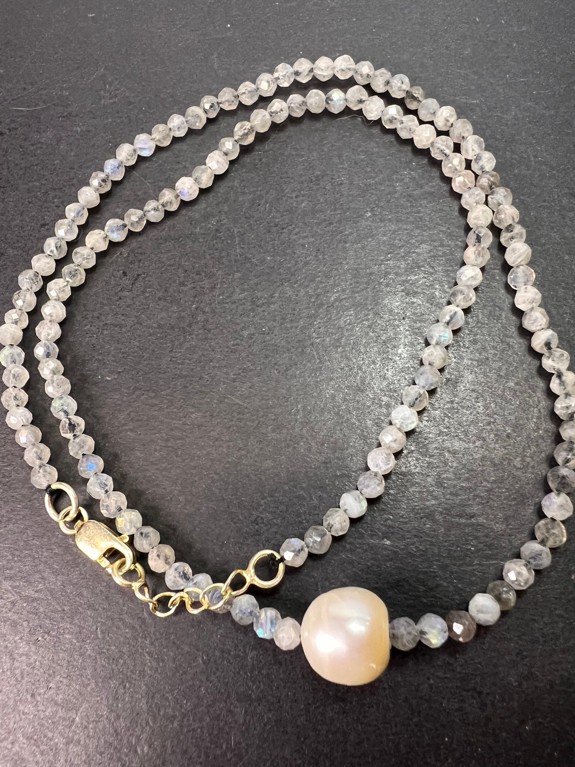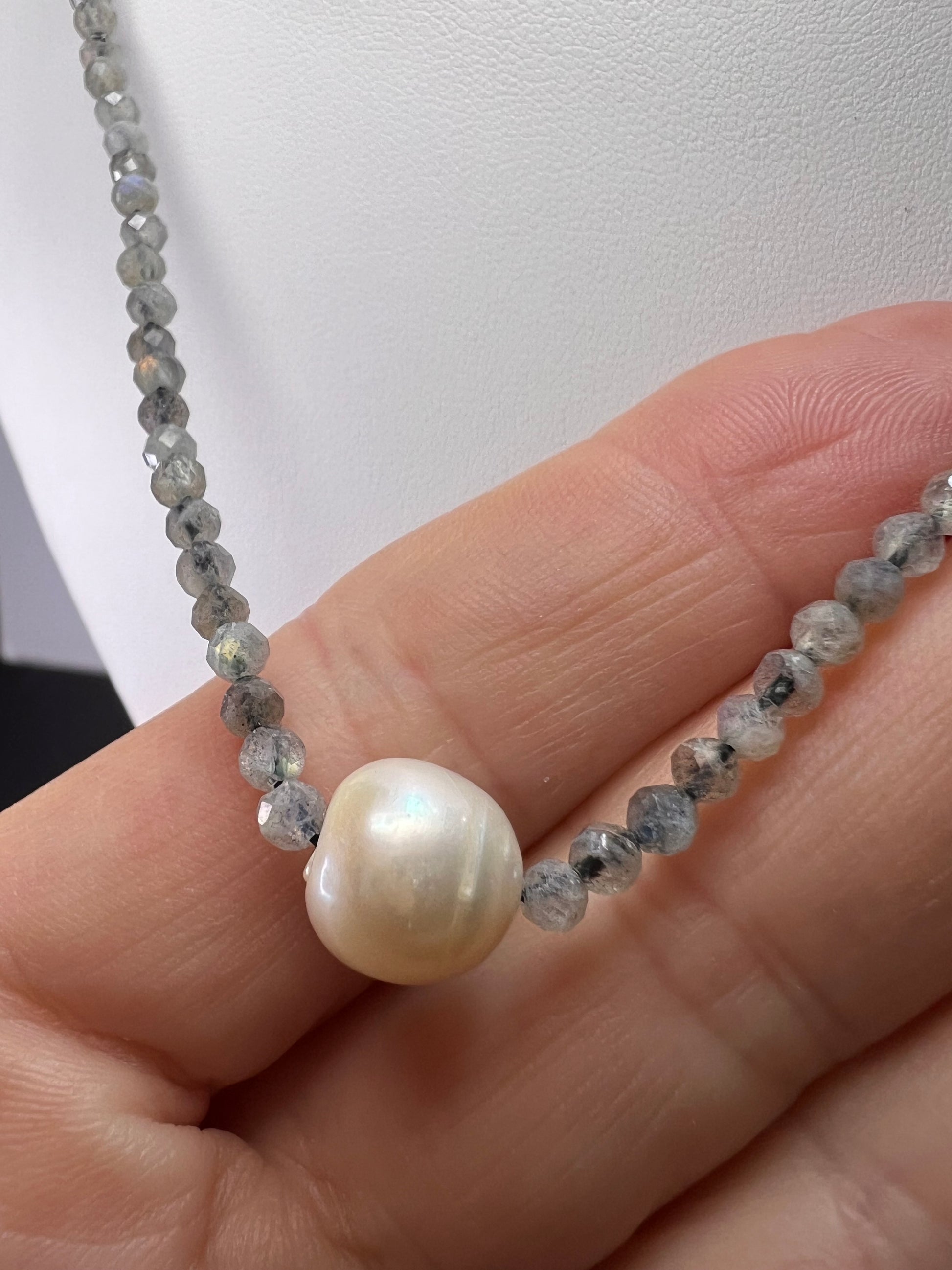 2mm faceted labradorite beads with a 10mm white cultured pearl in the center. Sterling silver lobster clasp with extension. Measures 18 inches in length