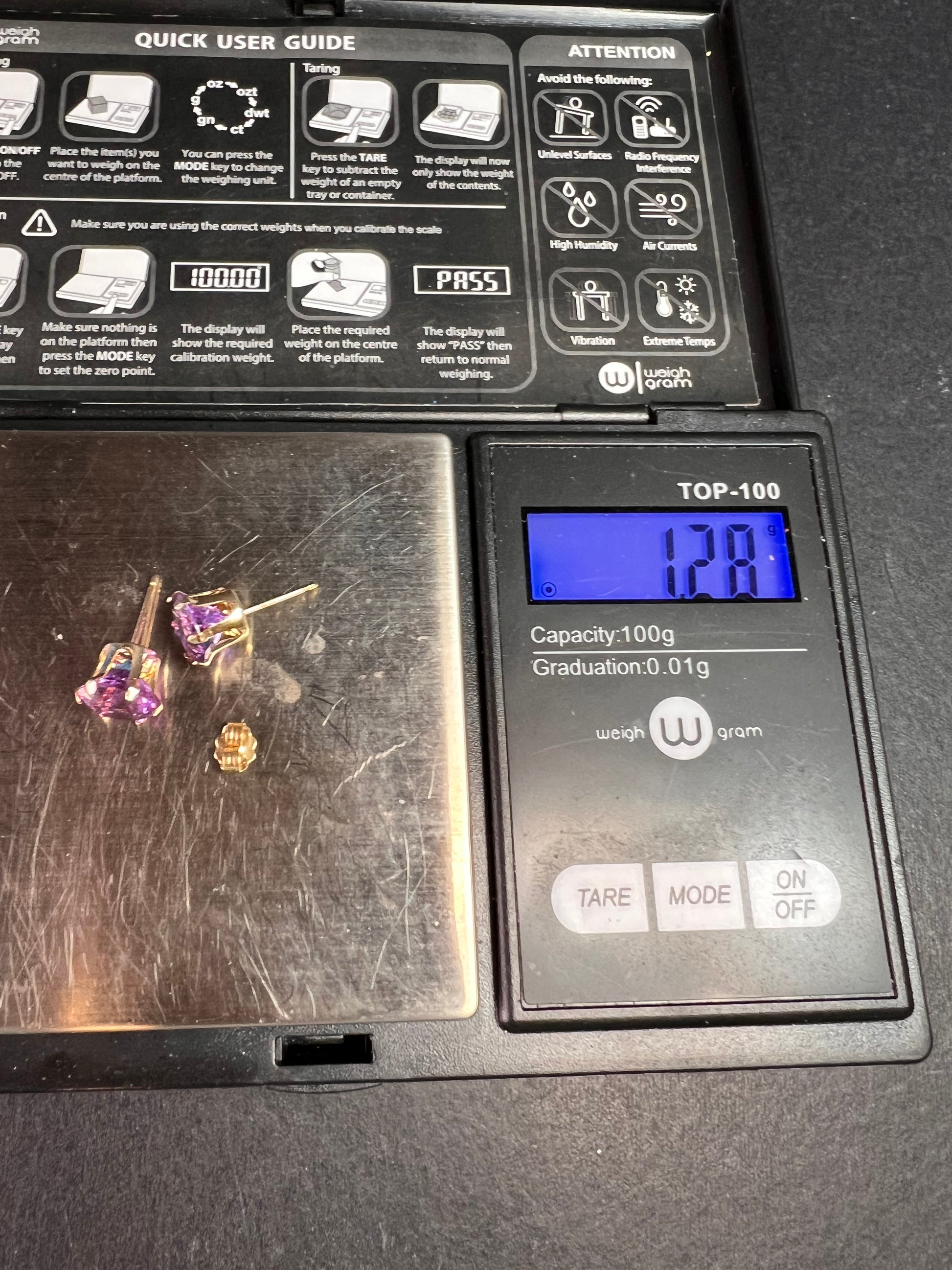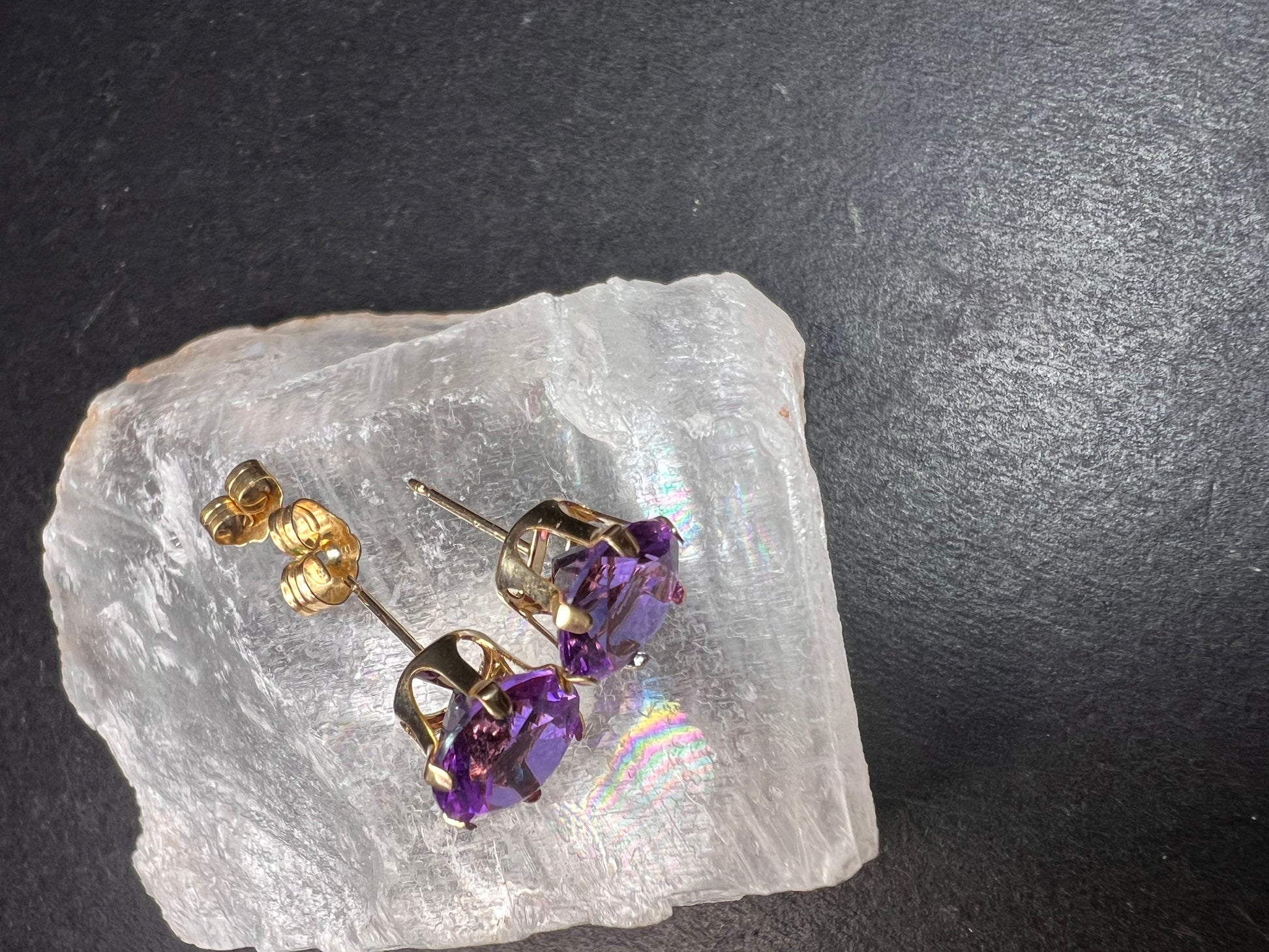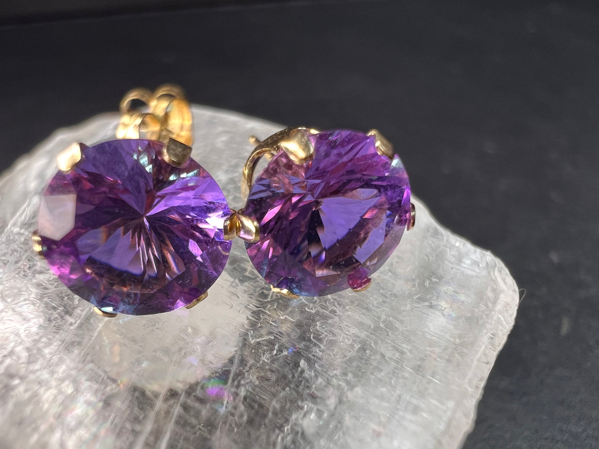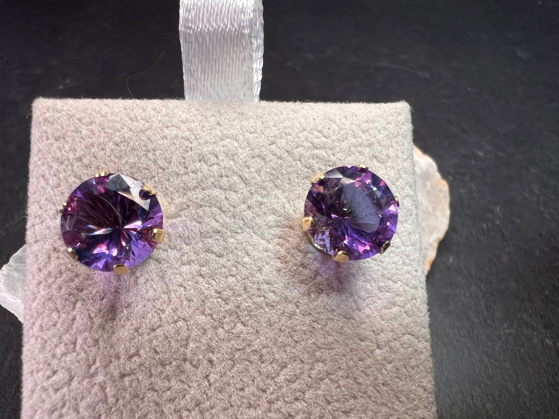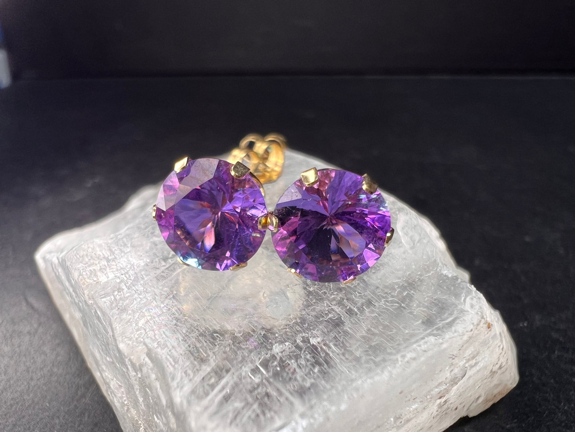 Pre owned, like new 14k yellow gold stud earrings set with vibrant color-shift CZ stones that flash purple, violet, pink, and blue in different lighting. The stones measure about 8.2mm each and sit in classic six-prong crown settings that give them a ton of sparkle. The earrings weigh 1.28 grams total, and that includes the stones and the single original 14k ear back. One ear back is original and stamped F1 14K to match the posts; the other back was replaced and is gold filled. The stones and settings are clean and bright with only very light wear. A bold, eye-catching pair with beautiful color play.