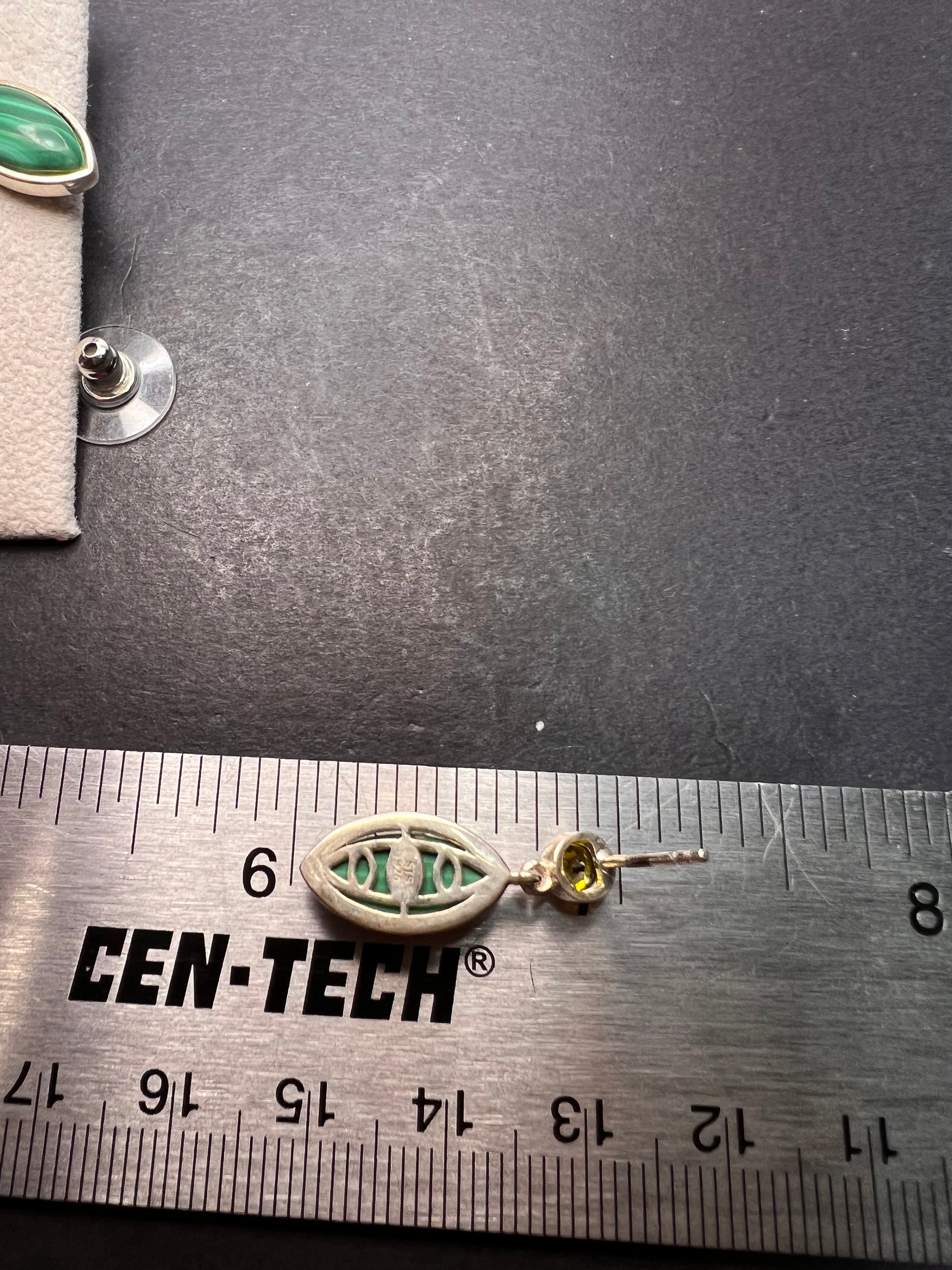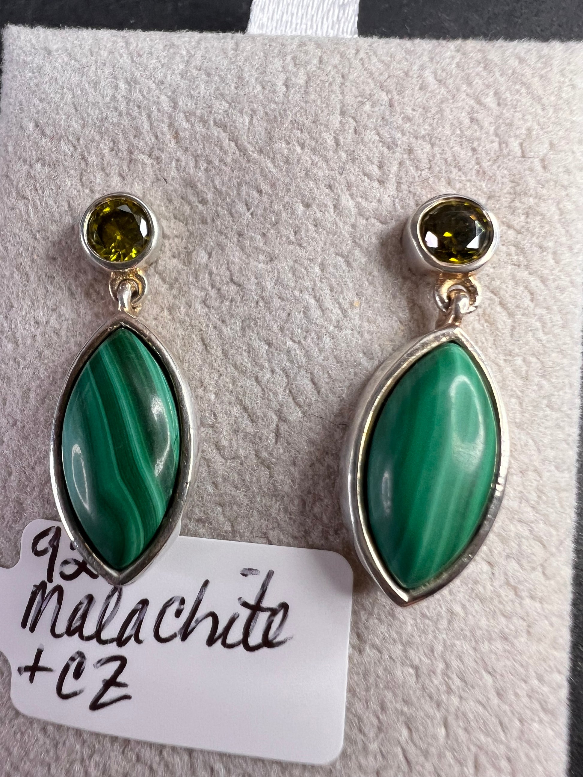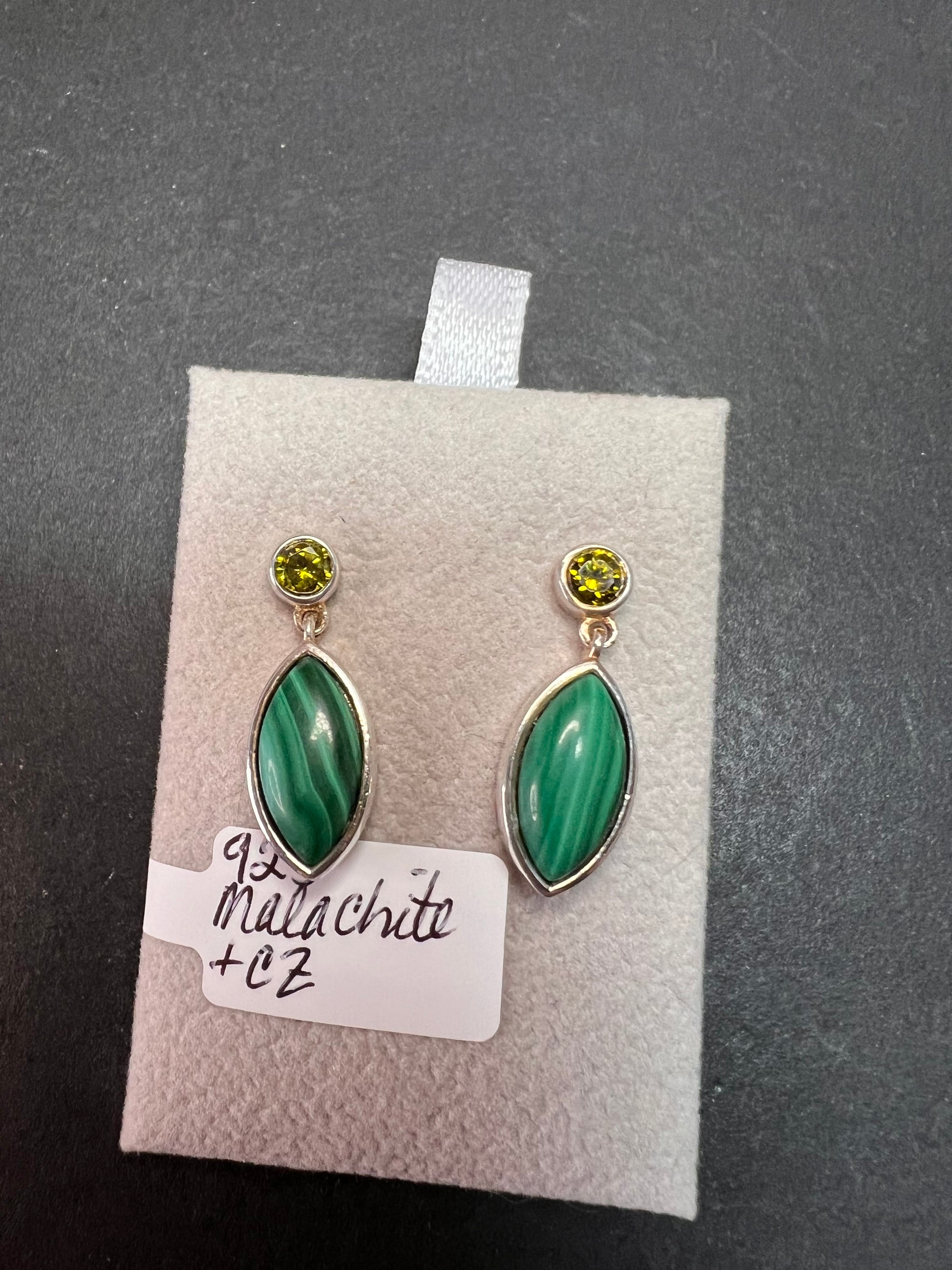 Genuine malachite marquise shaped stones set in rhodium plated over sterling silver. Olive colored gemstone accents are cubic zirconia. 925 STS