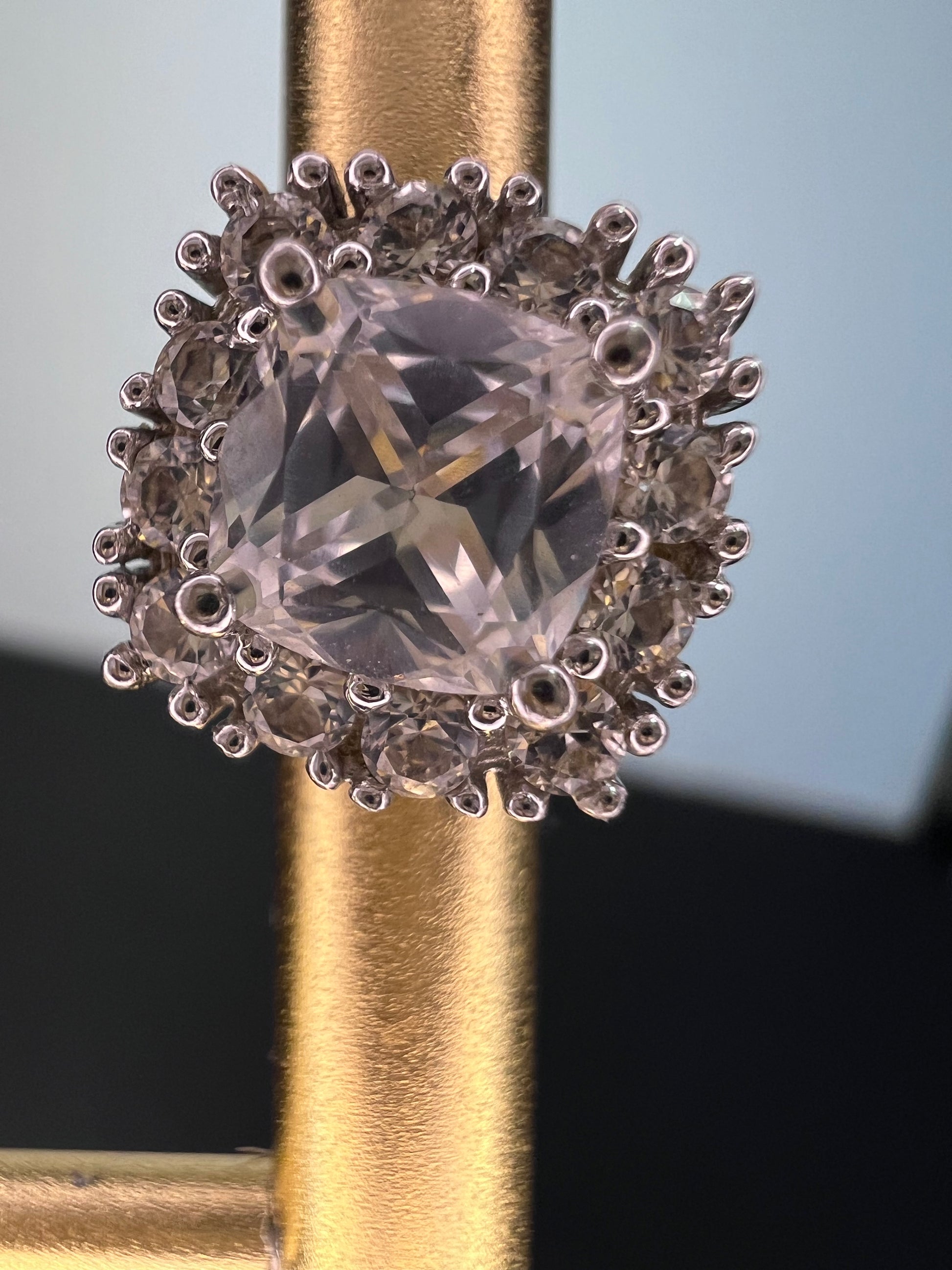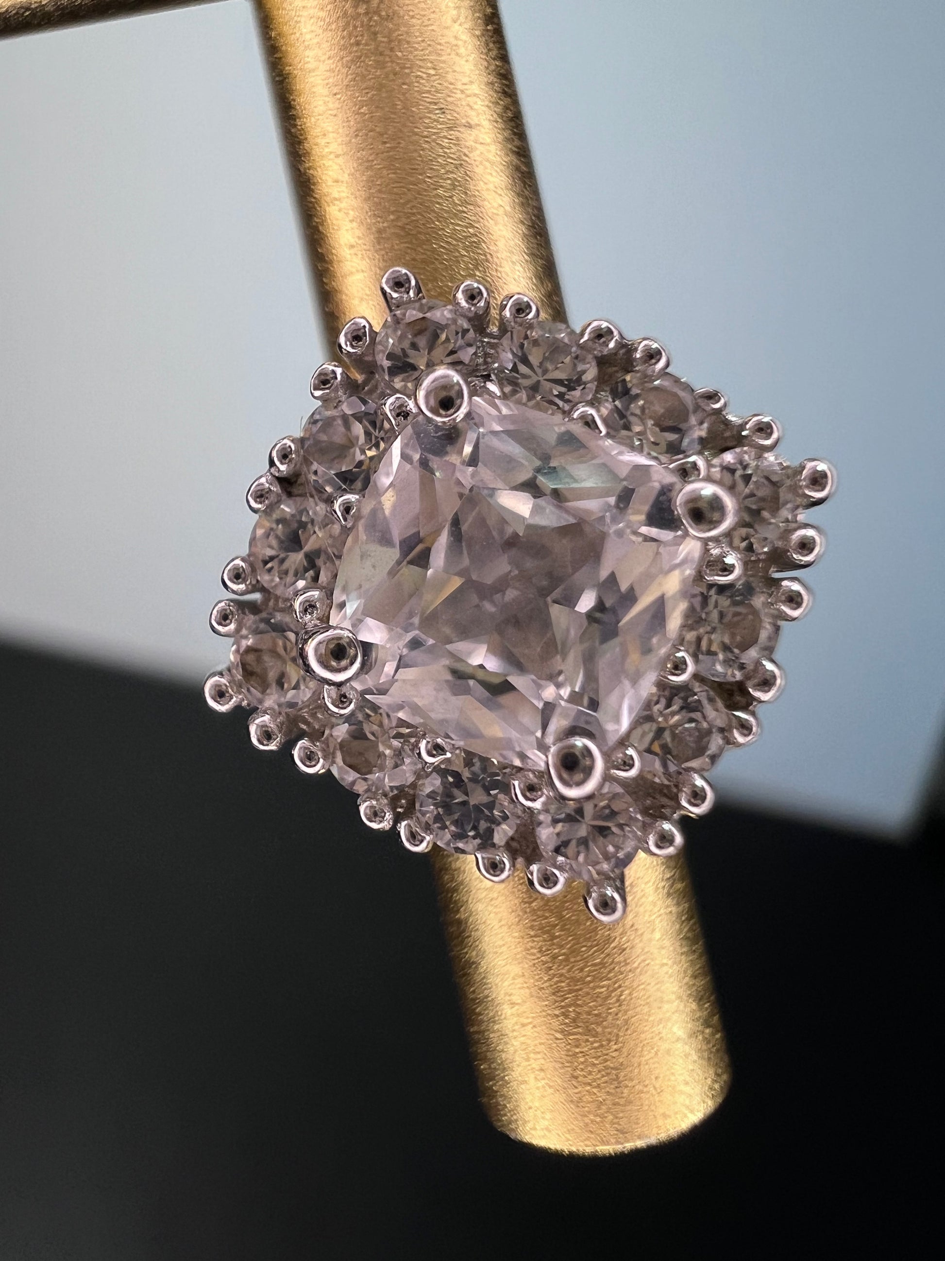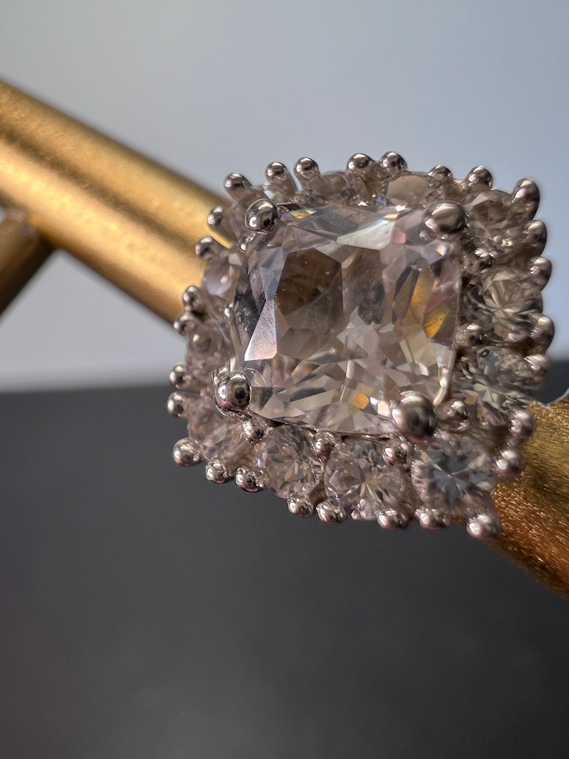 Lab created white sapphires in the center surrounded by white topaz accent stones. Rhodium plated over sterling silver.
