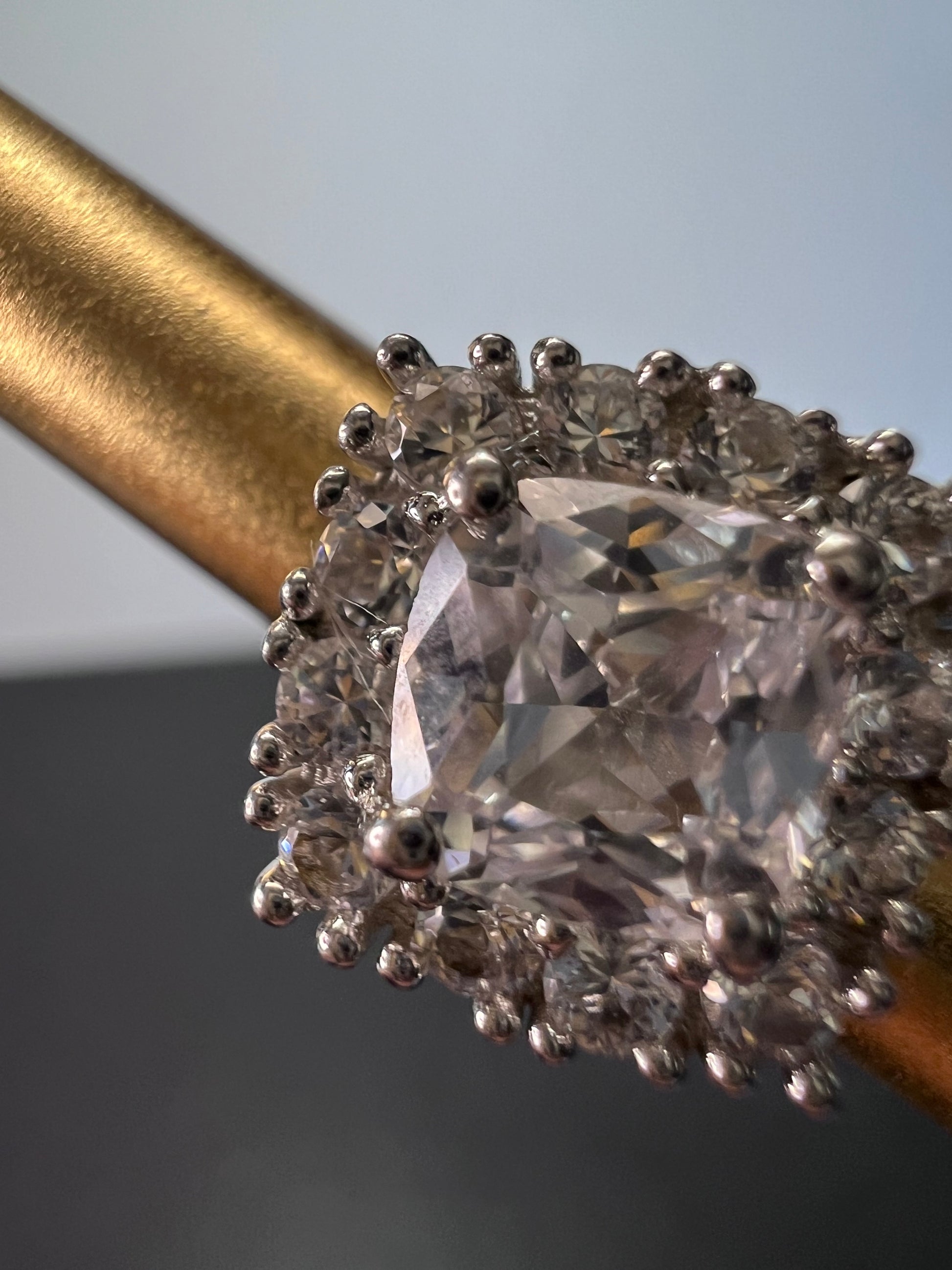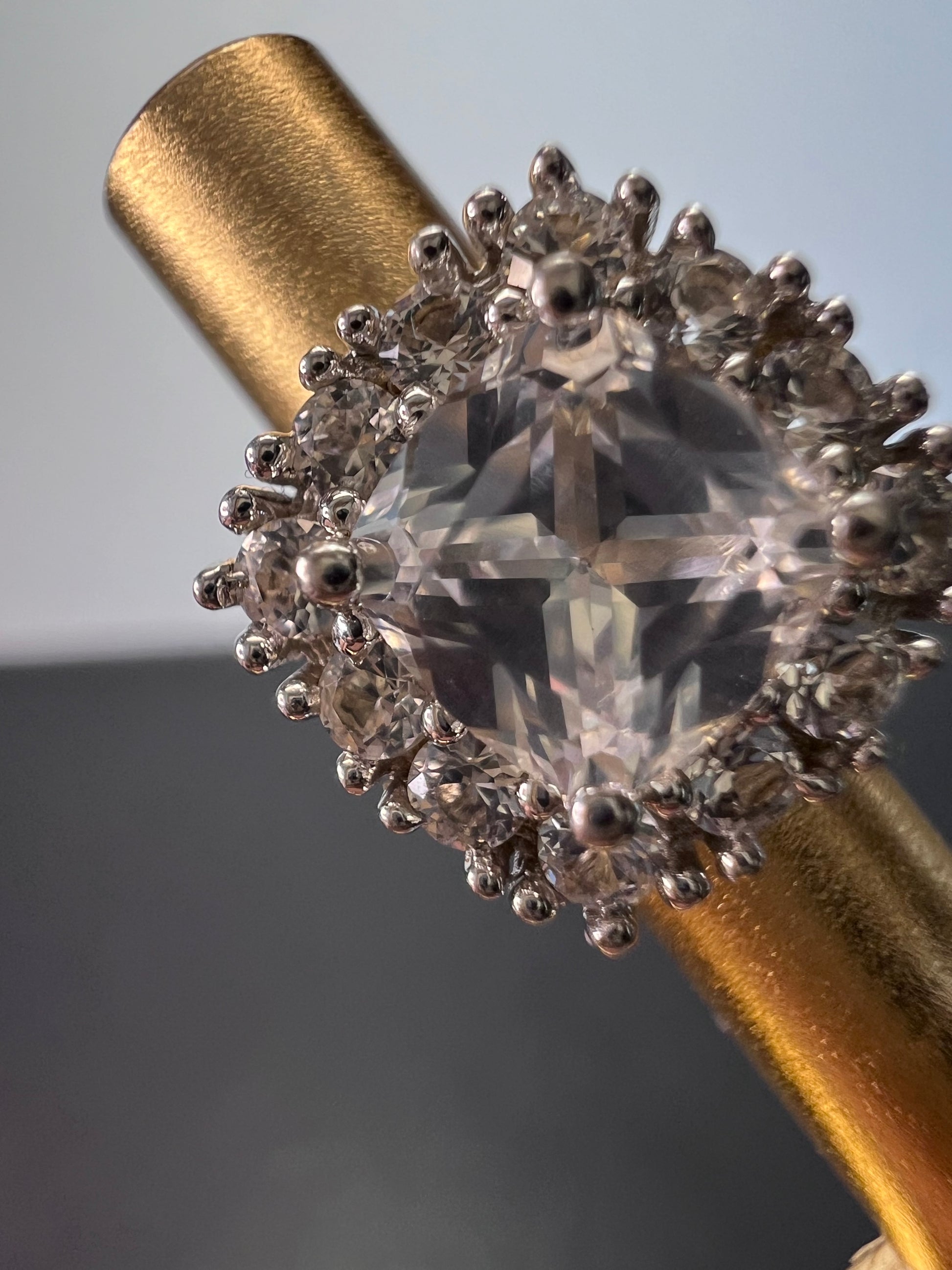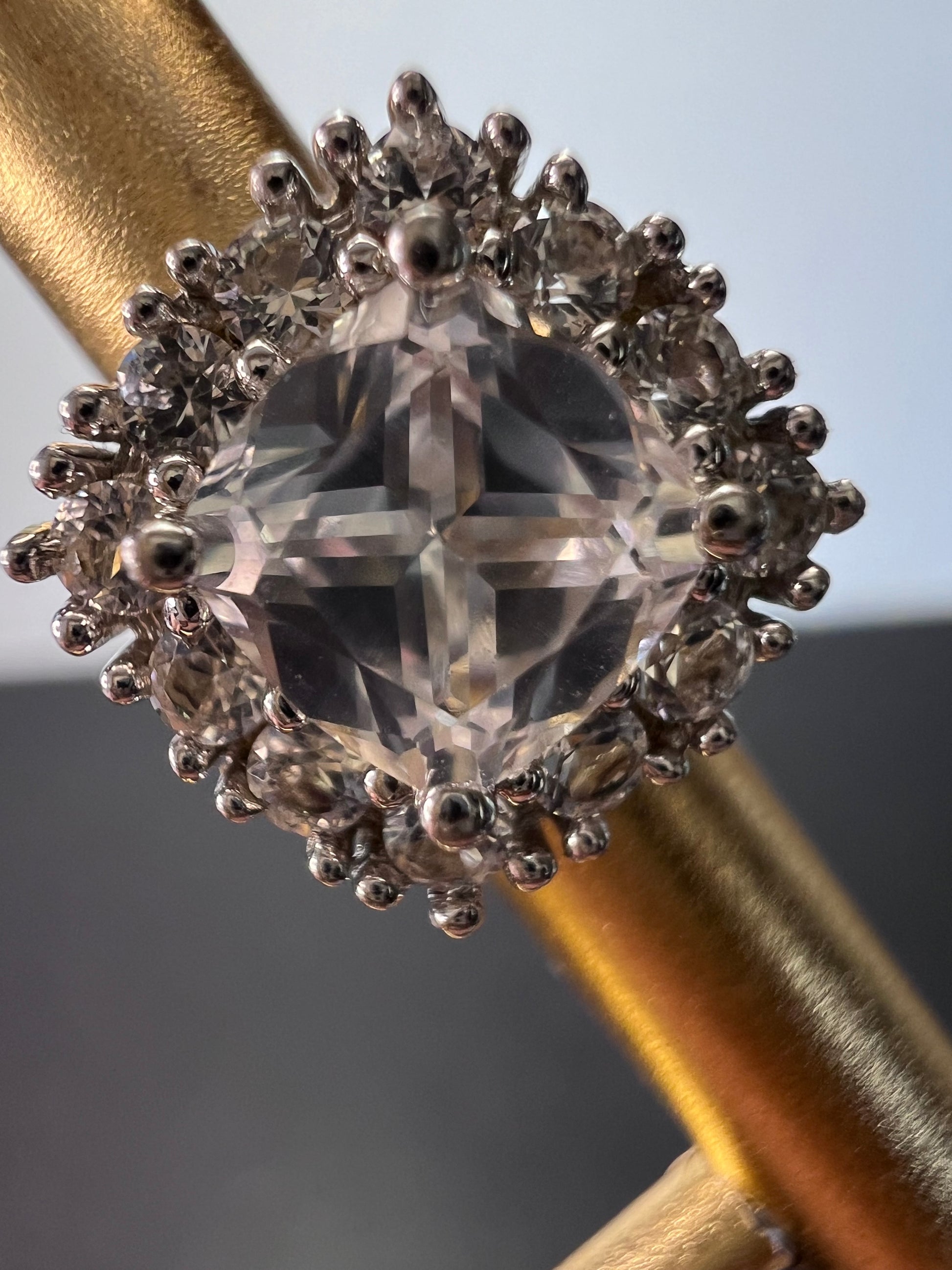 Lab created white sapphires in the center surrounded by white topaz accent stones. Rhodium plated over sterling silver.