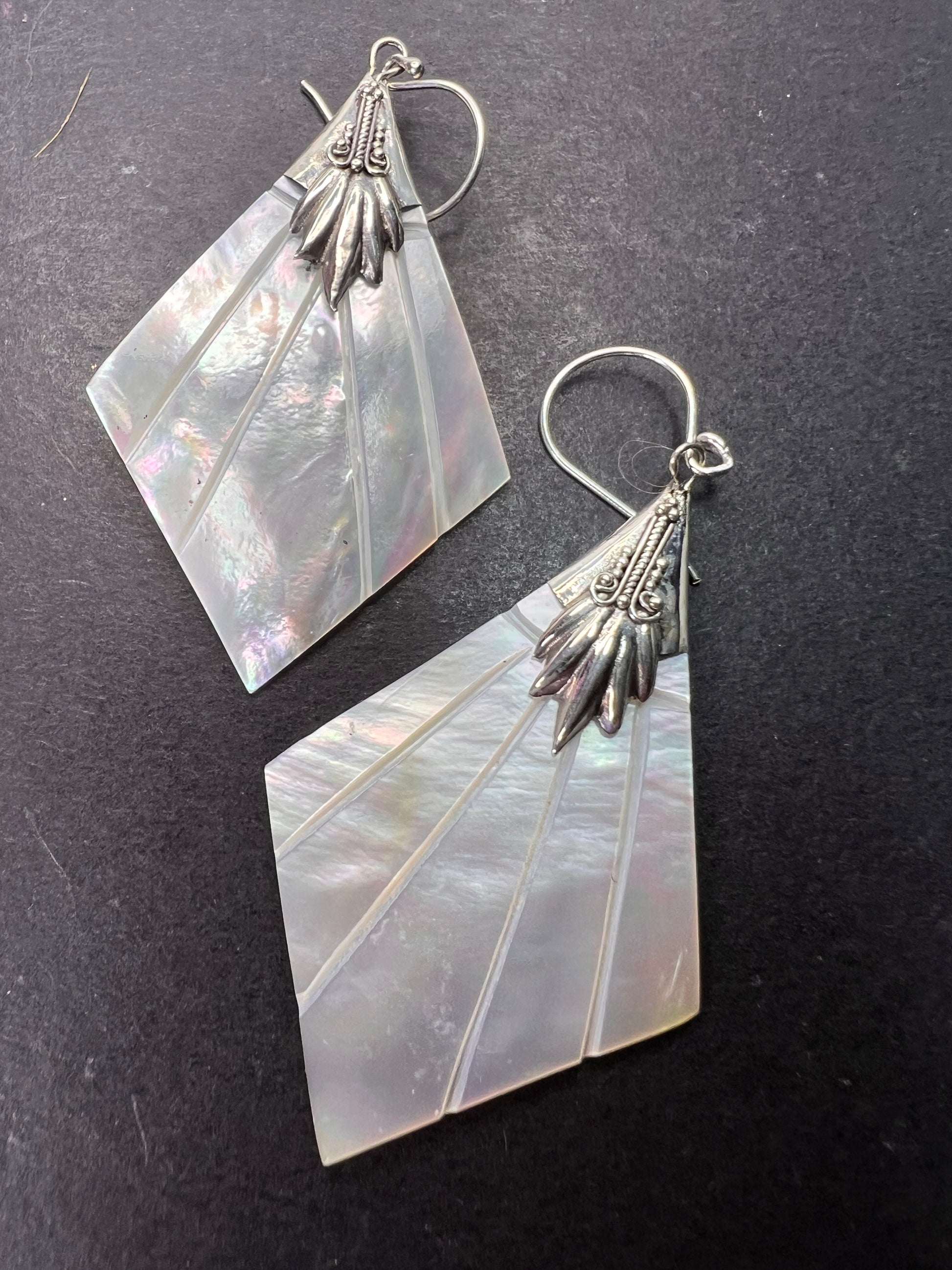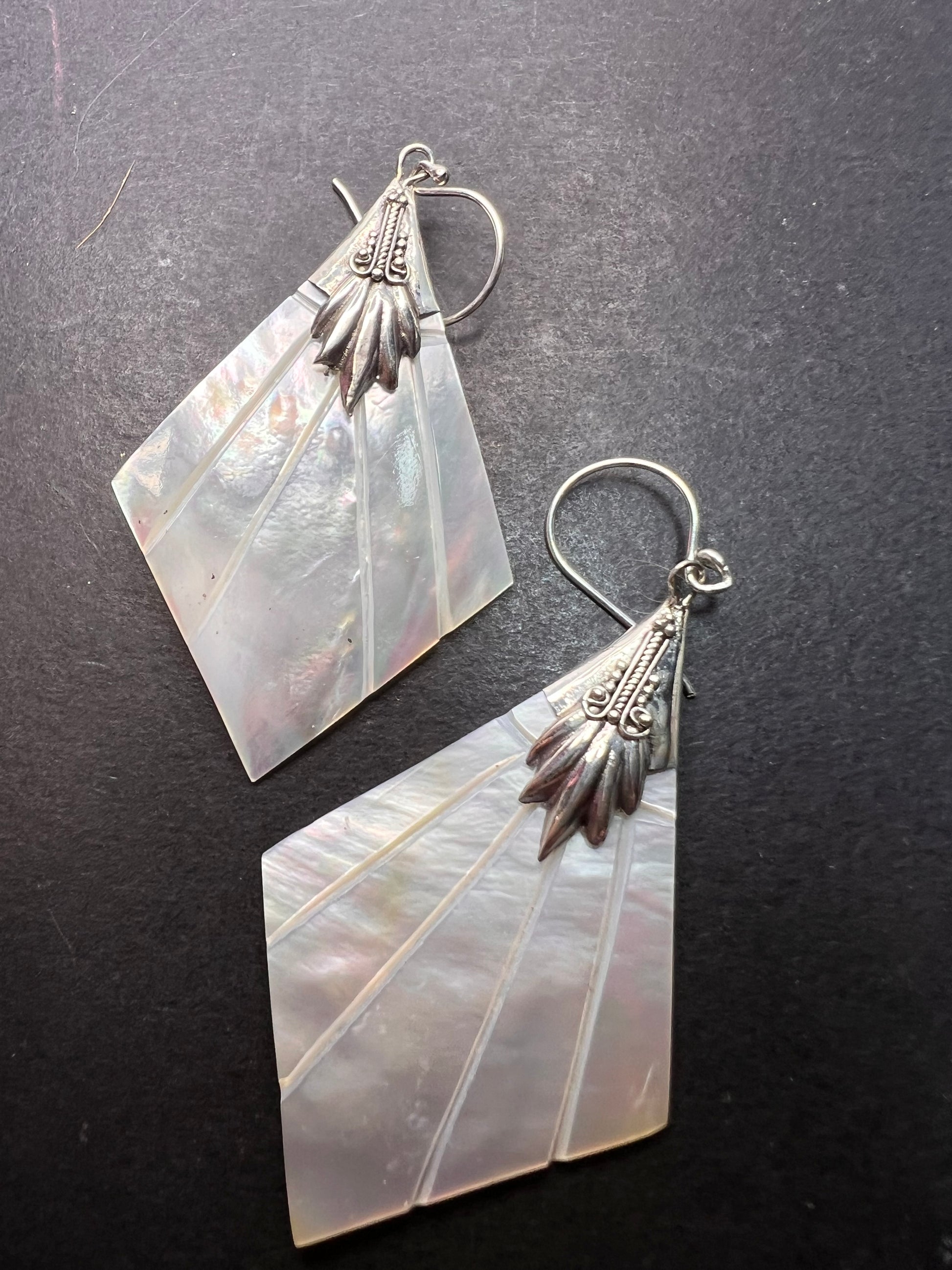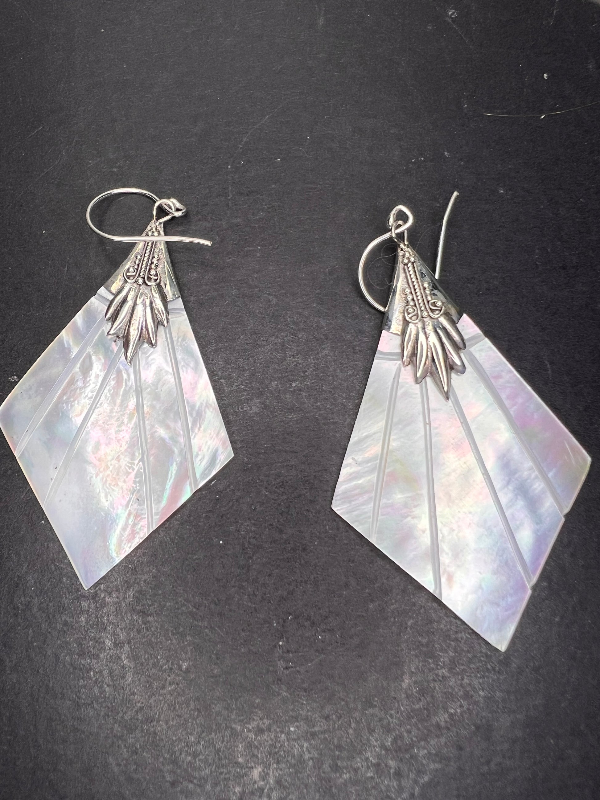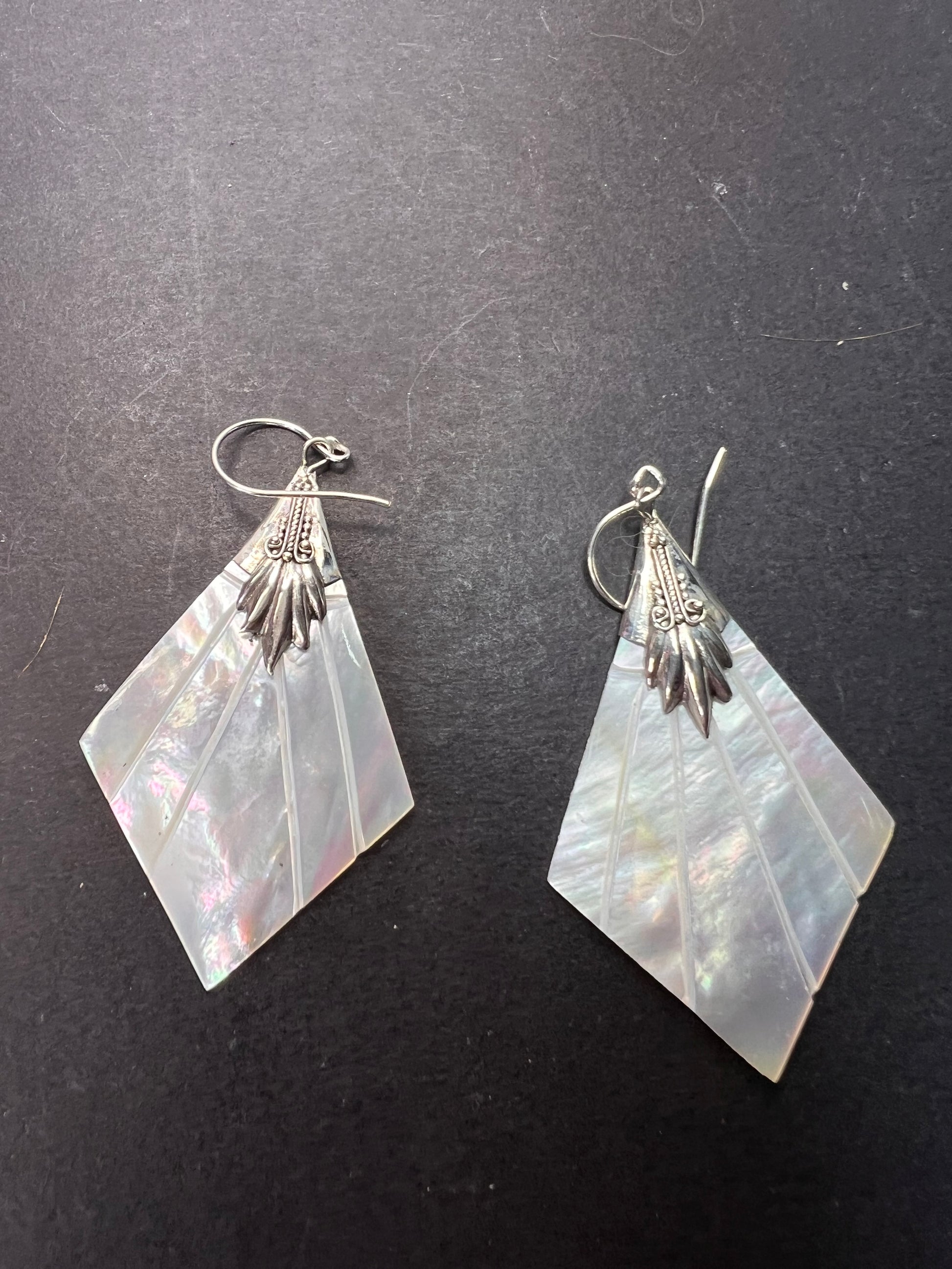 Diamond shape mother of pearl accented by sterling silver tops and wires.