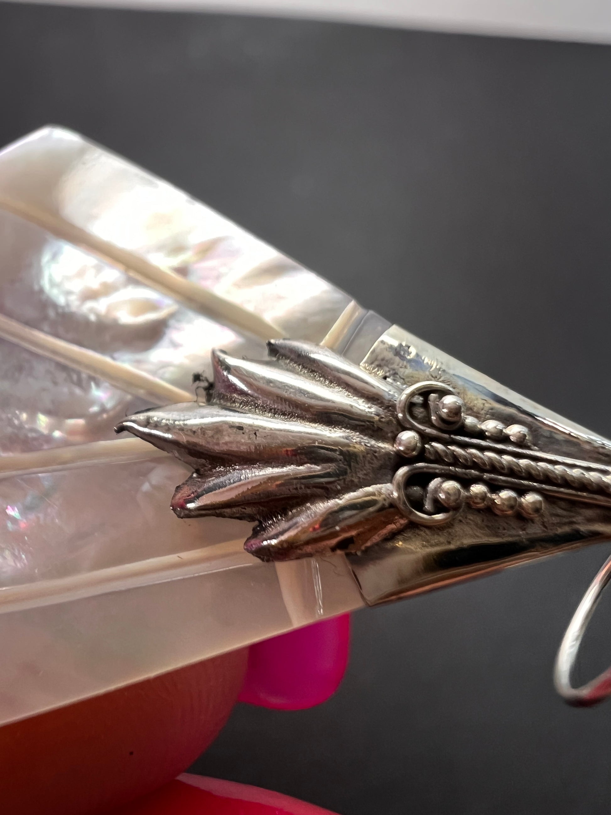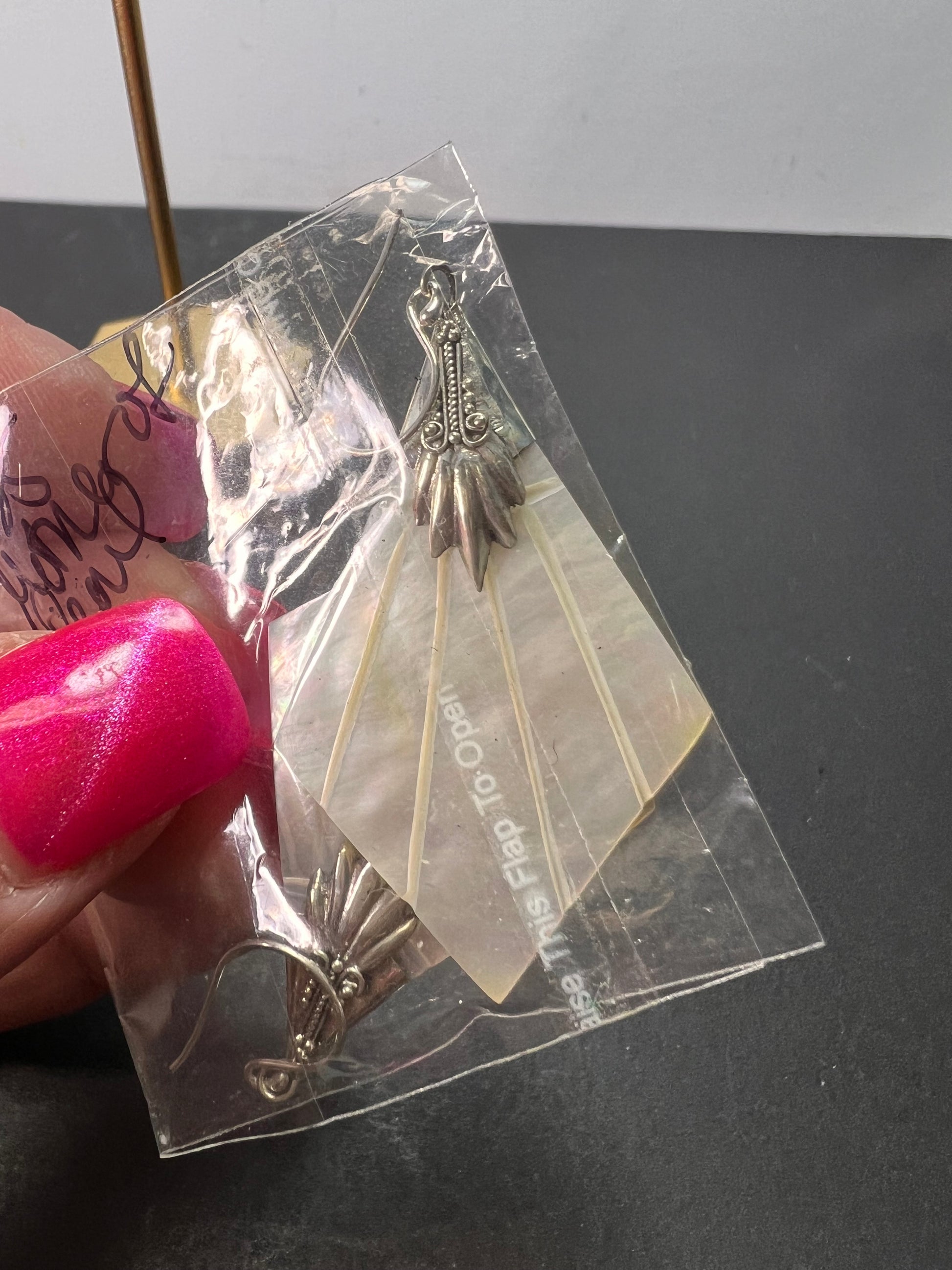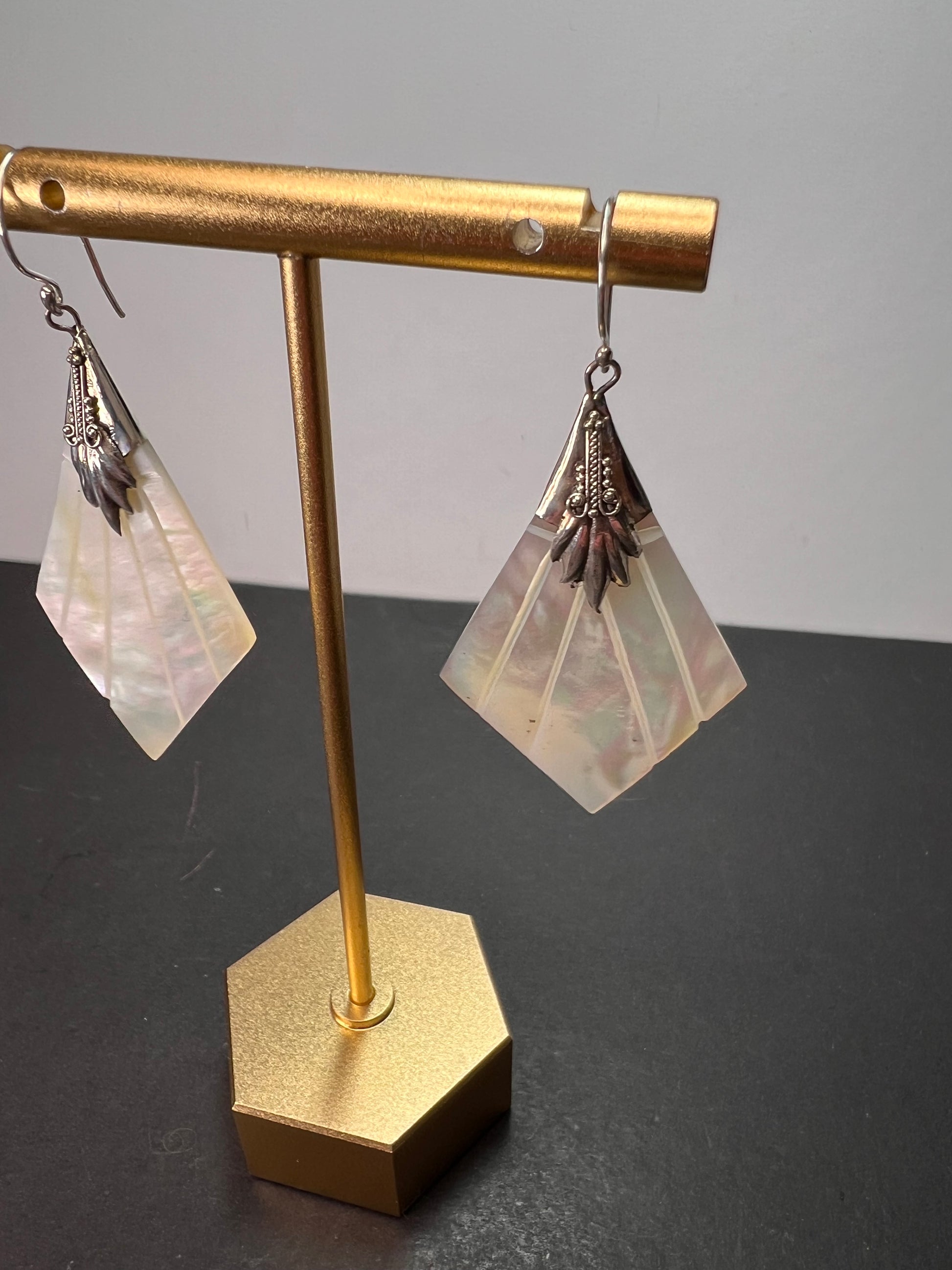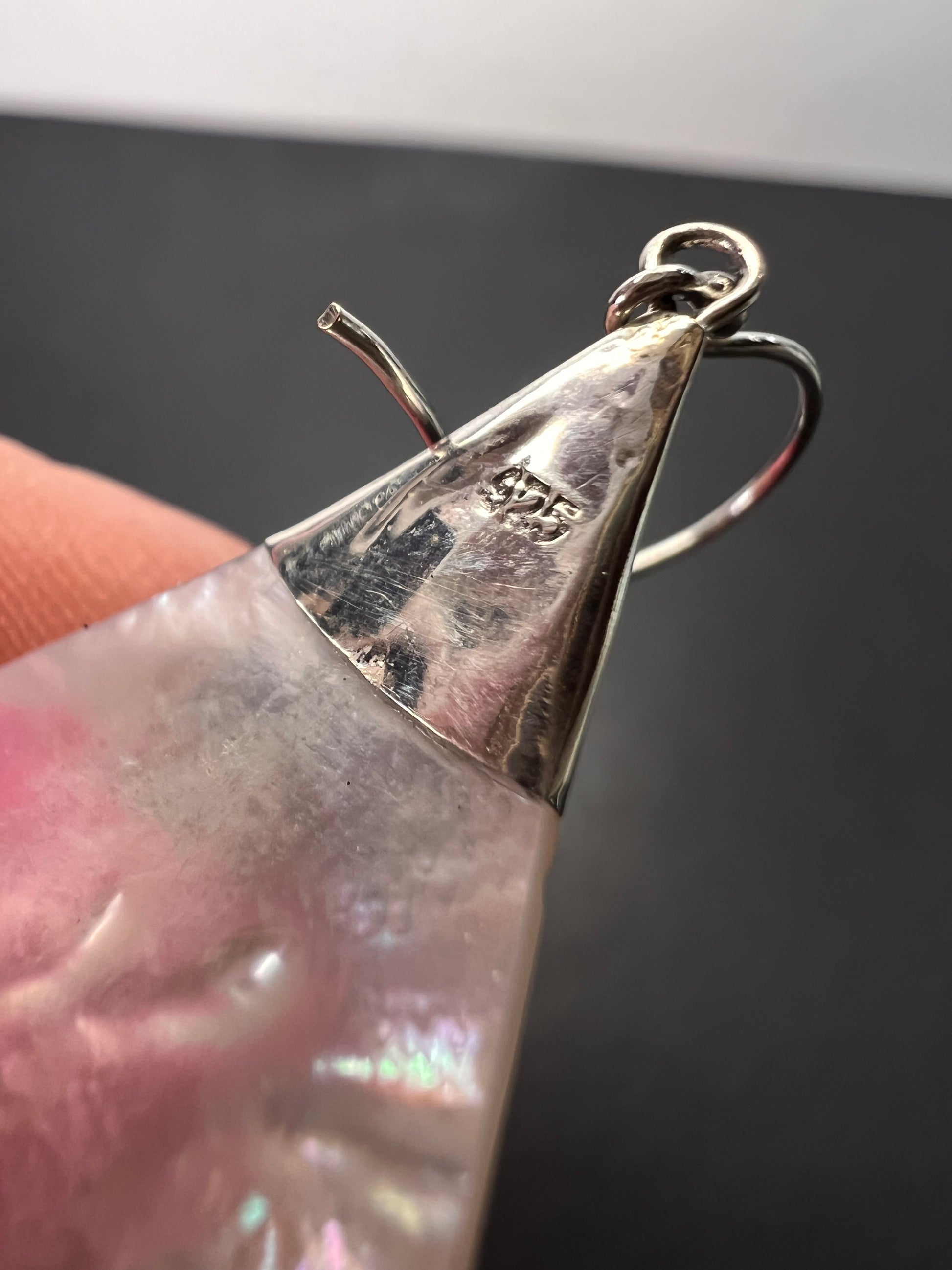 Diamond shape mother of pearl accented by sterling silver tops and wires.