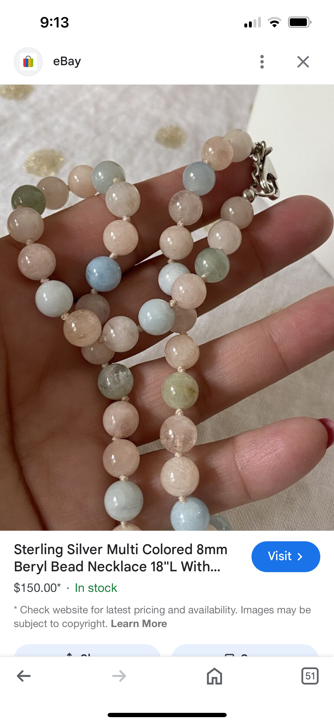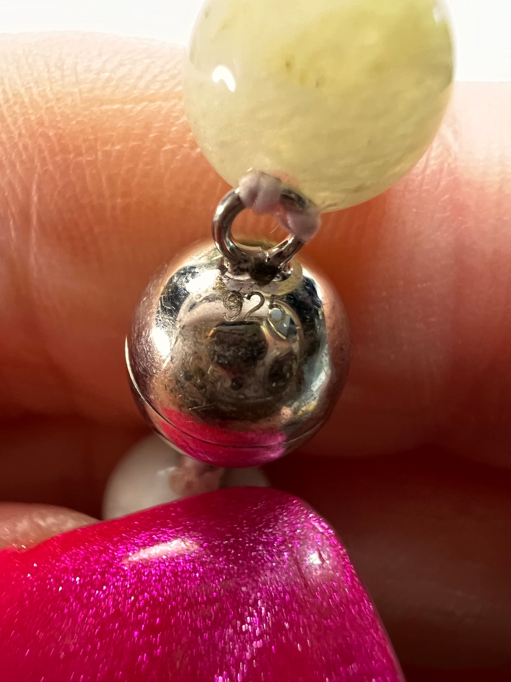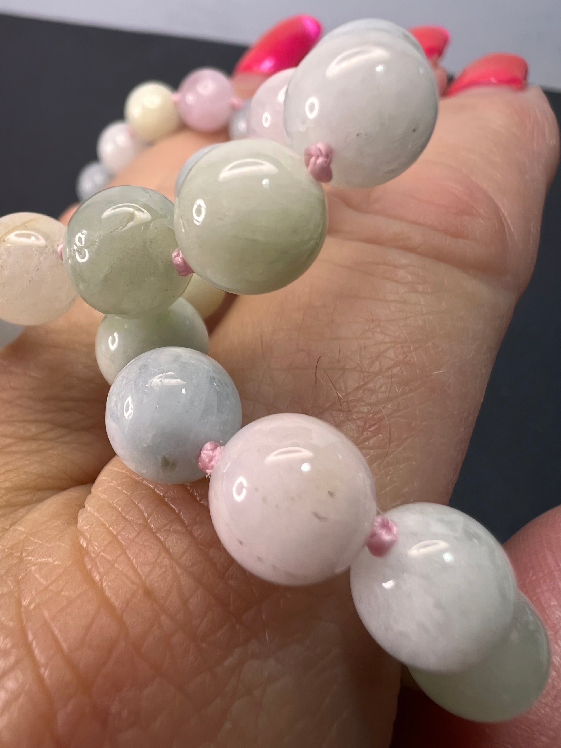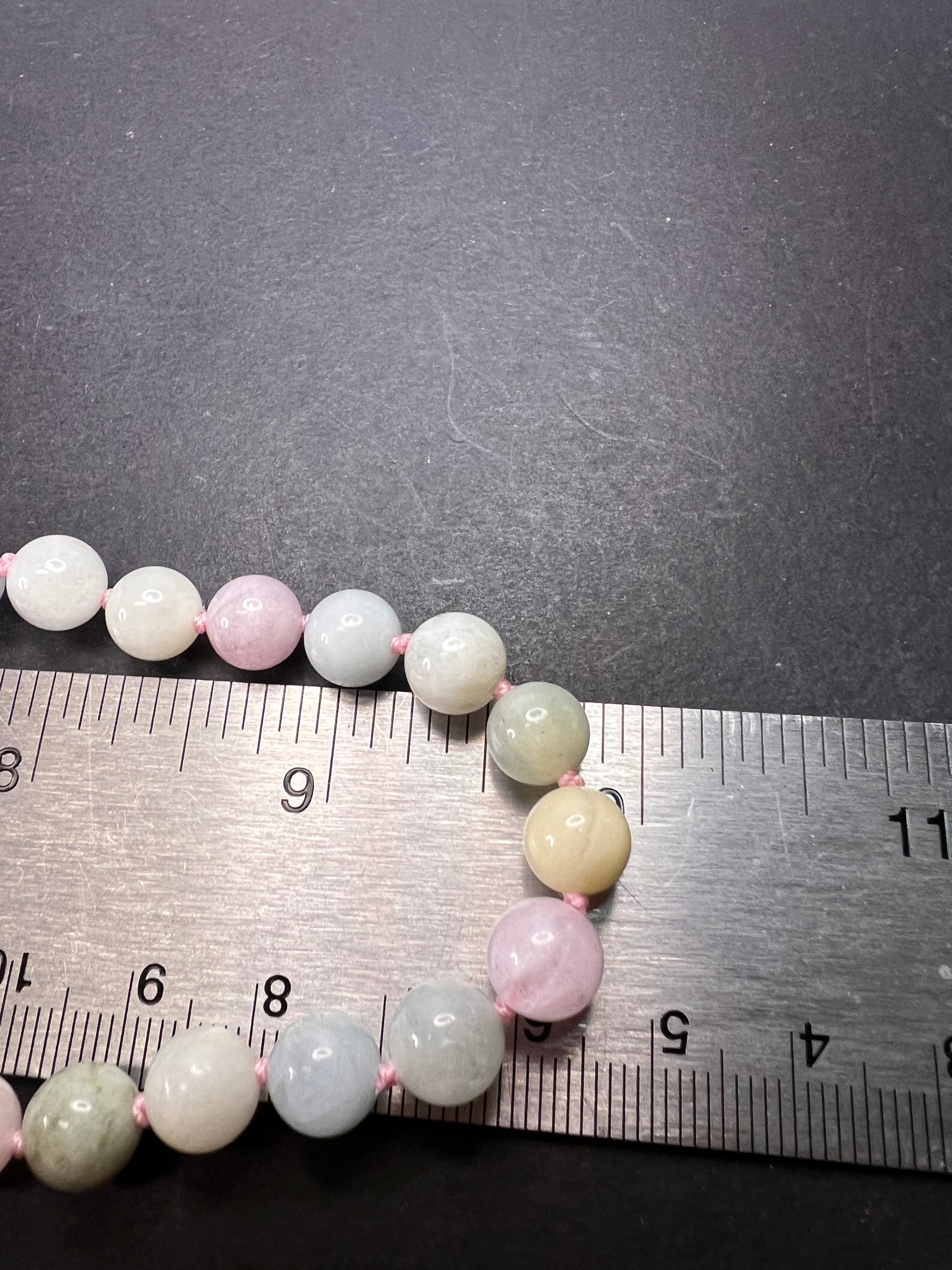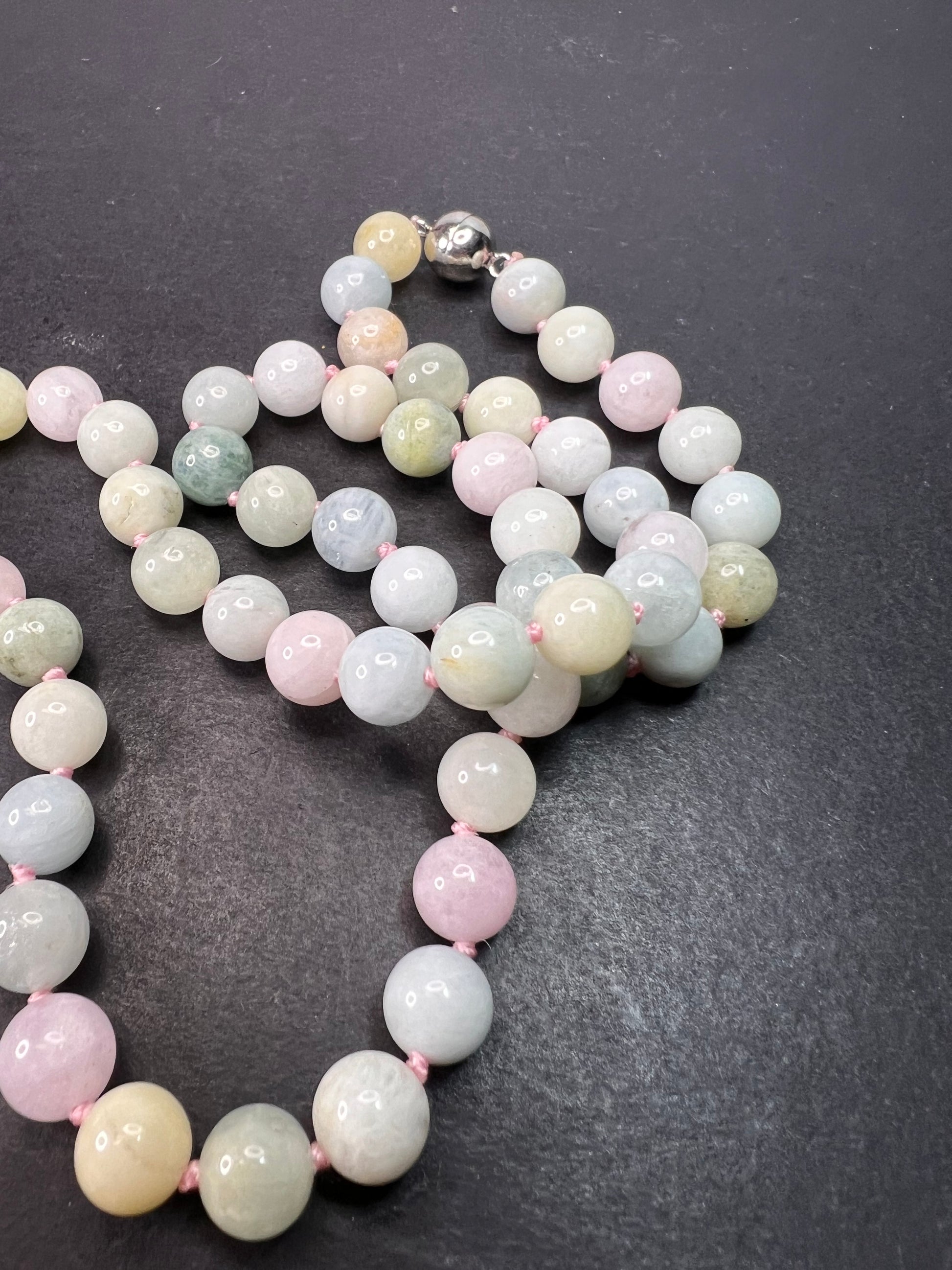 8mm multi colored varieties of beryl stone beads including aquamarine, morganite, heliodor (golden beryl). Double knotted in between each bead. Magnet clasp is rhodium plated over sterling silver. Necklace measures about 20 inches in length. 925