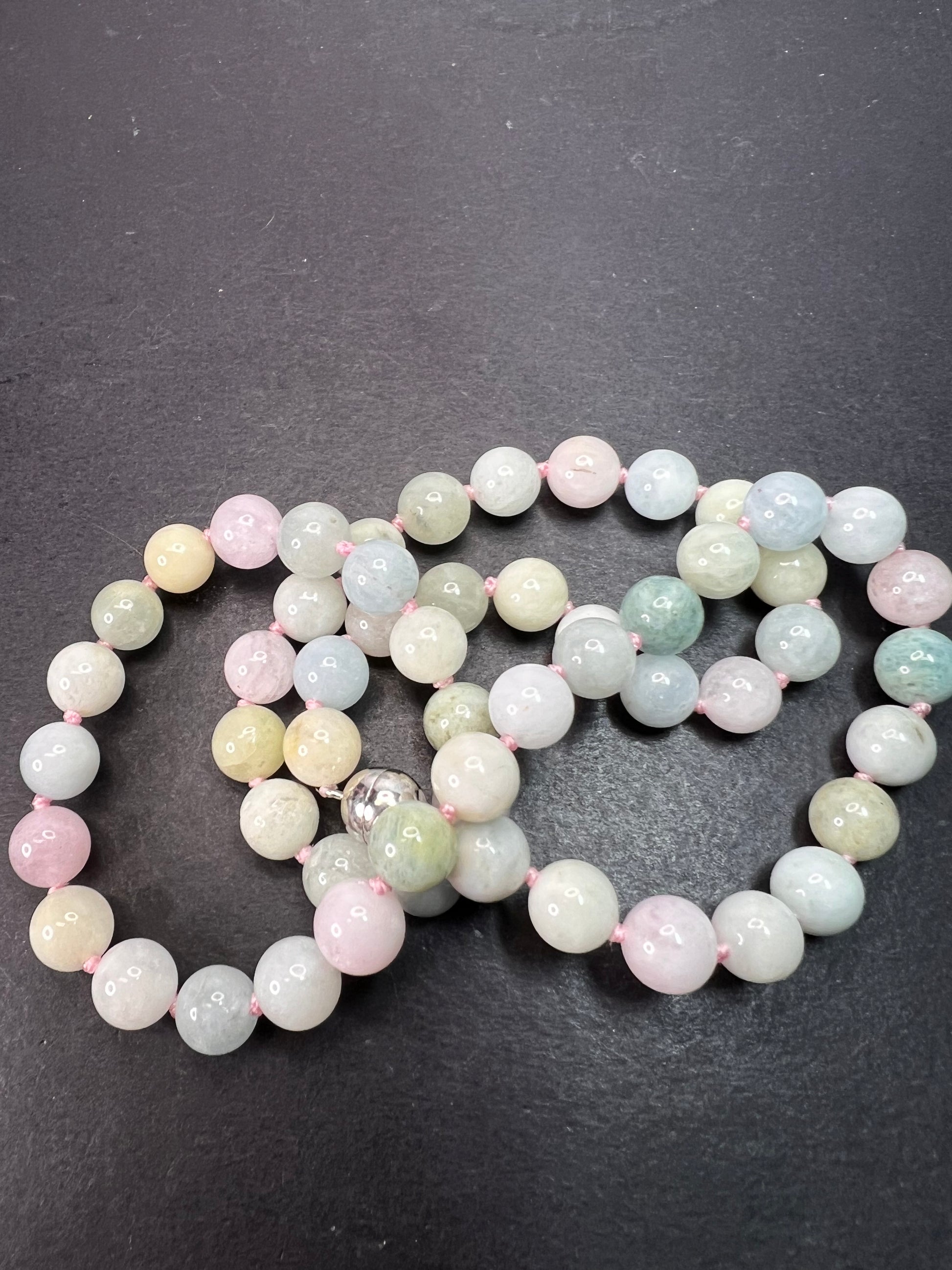 Multi beryl aquamarine morganite knotted necklace with sterling silver magnetic clasp