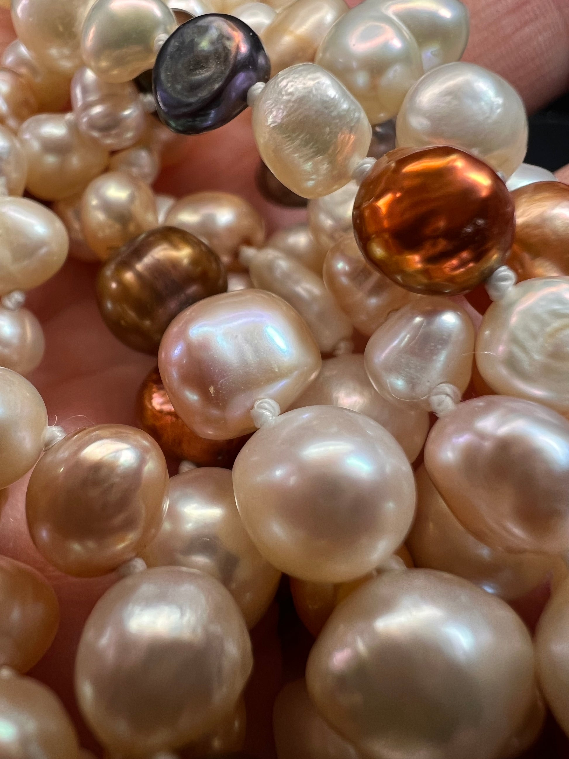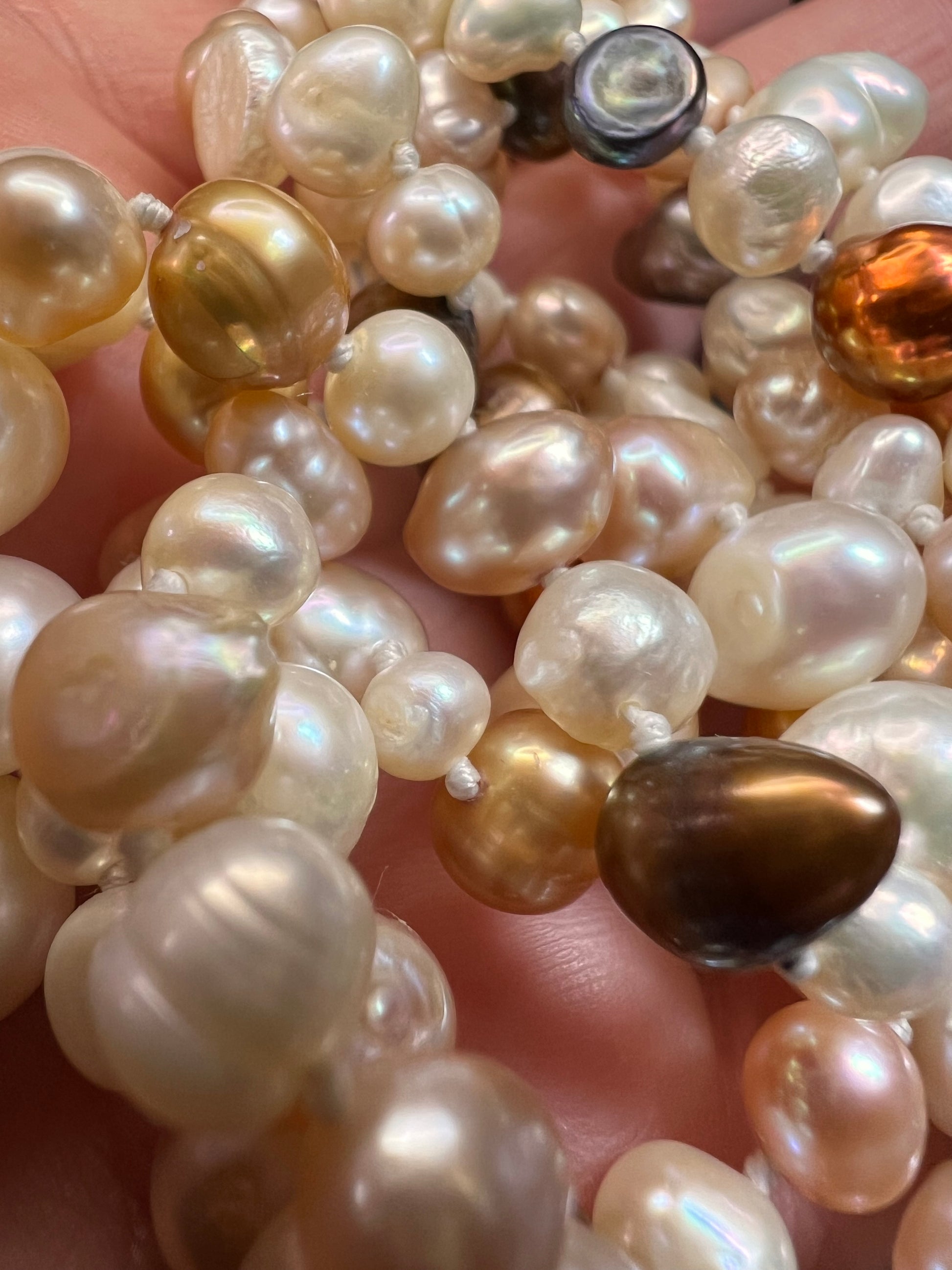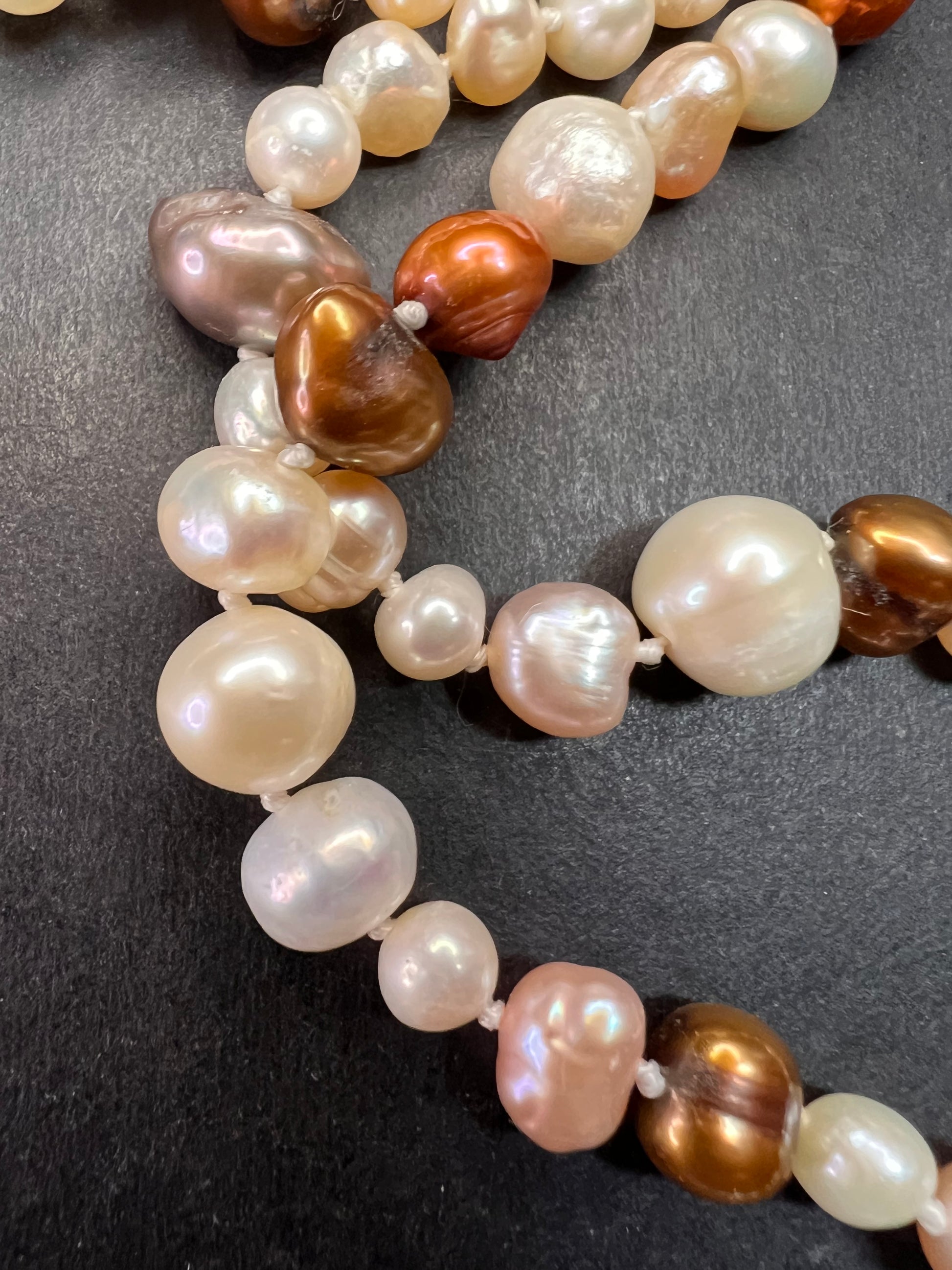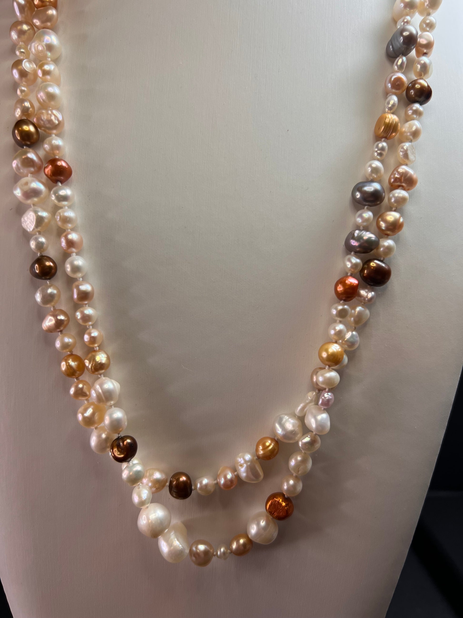 Genuine freshwater levels in multi colors, shapes and sizes. Knotted in between each one measuring 50 inches with no clasp. These have a beautiful luster to them for a timeless piece of jewelry to add to your collection.