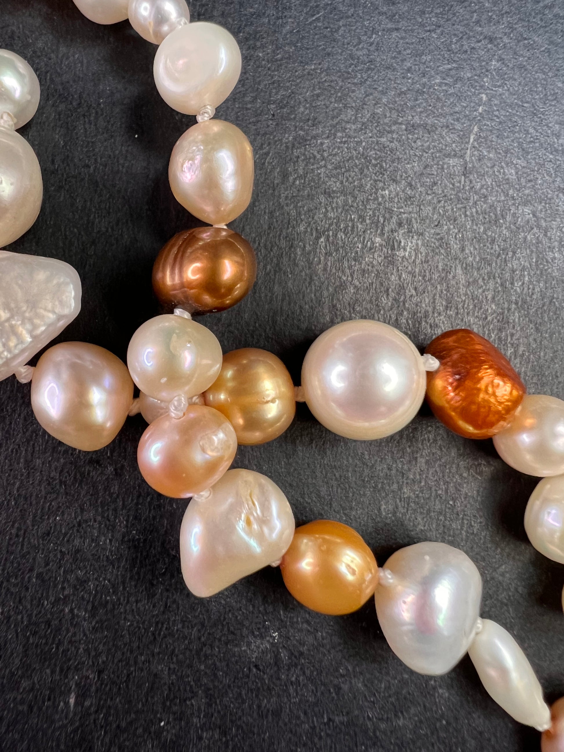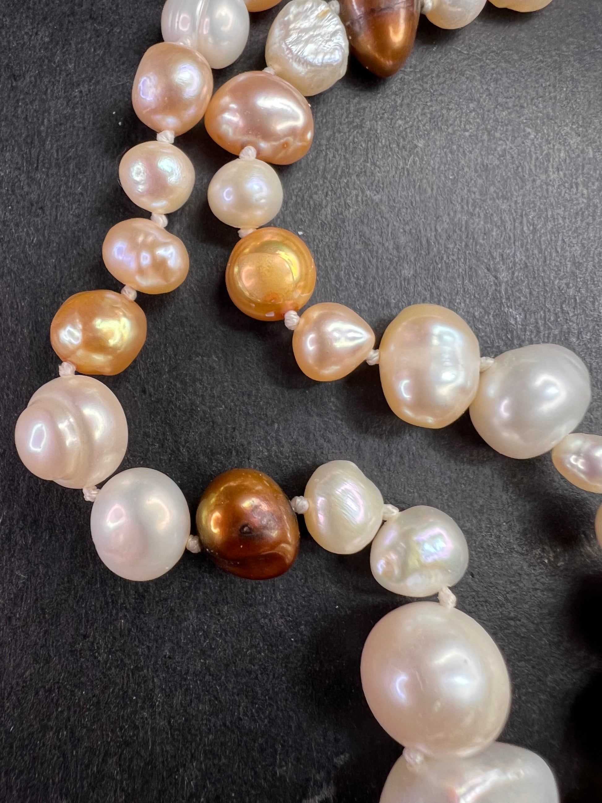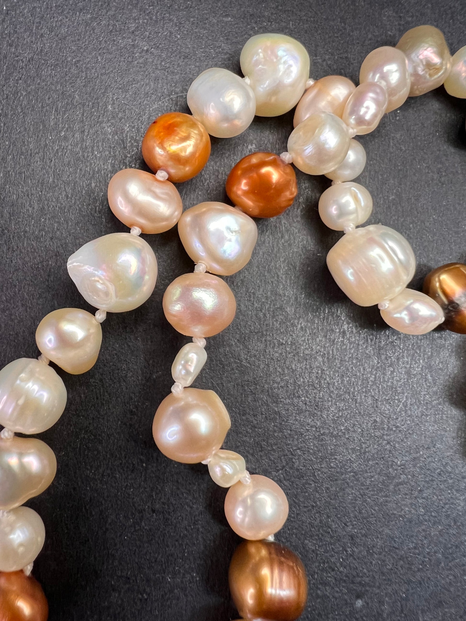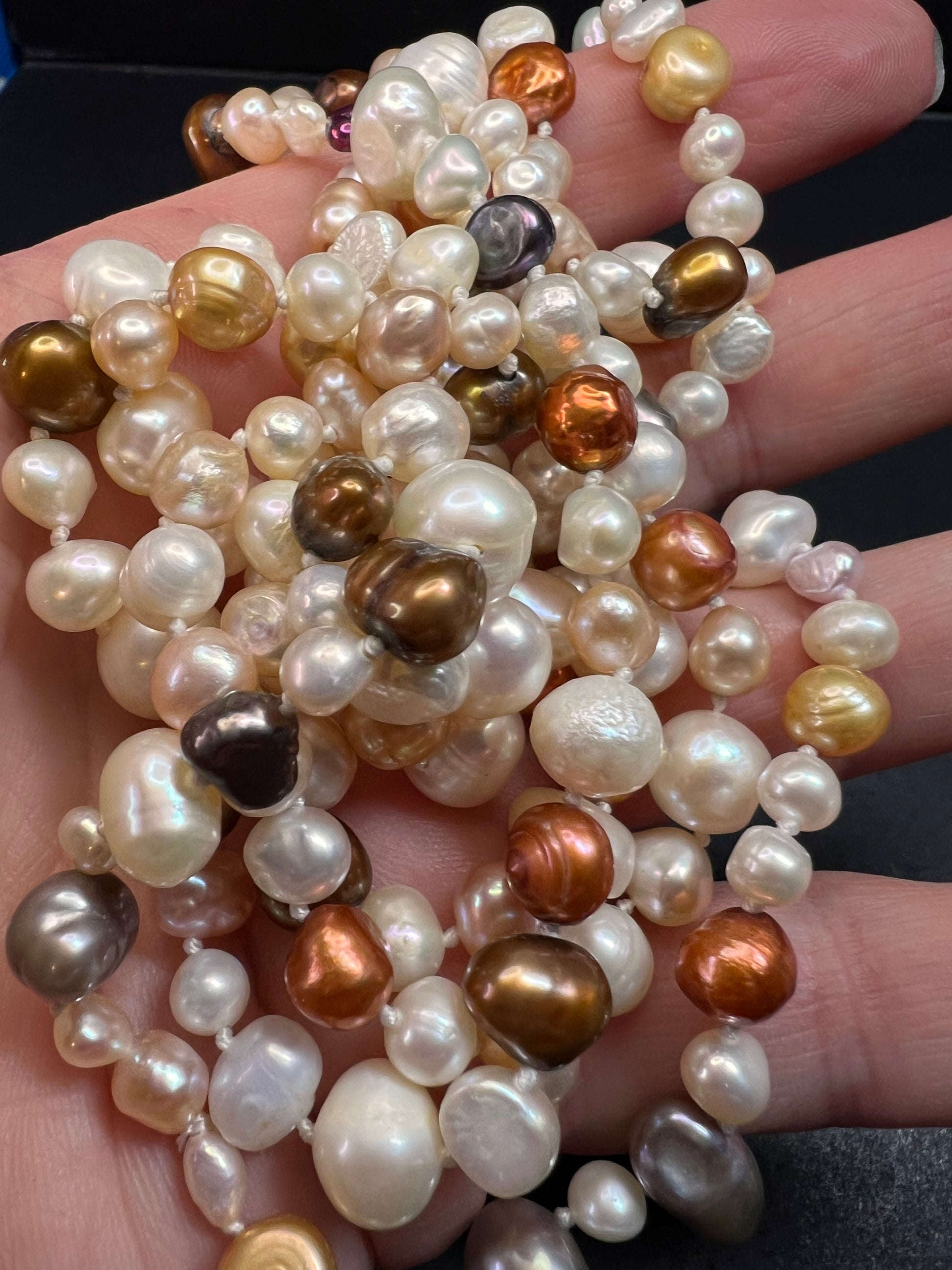Genuine freshwater levels in multi colors, shapes and sizes. Knotted in between each one measuring 50 inches with no clasp. These have a beautiful luster to them for a timeless piece of jewelry to add to your collection.