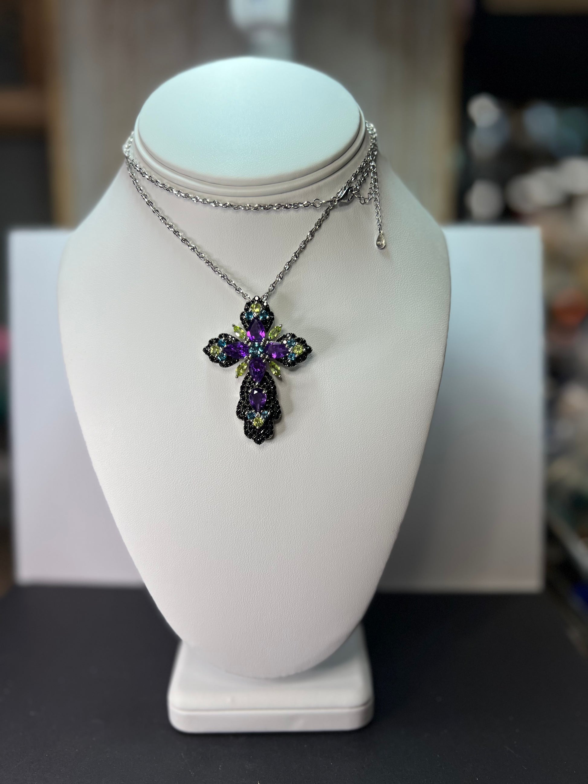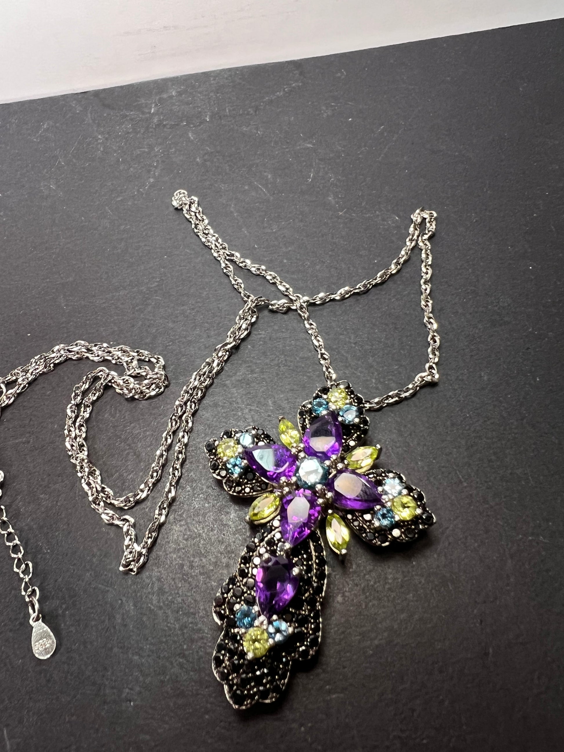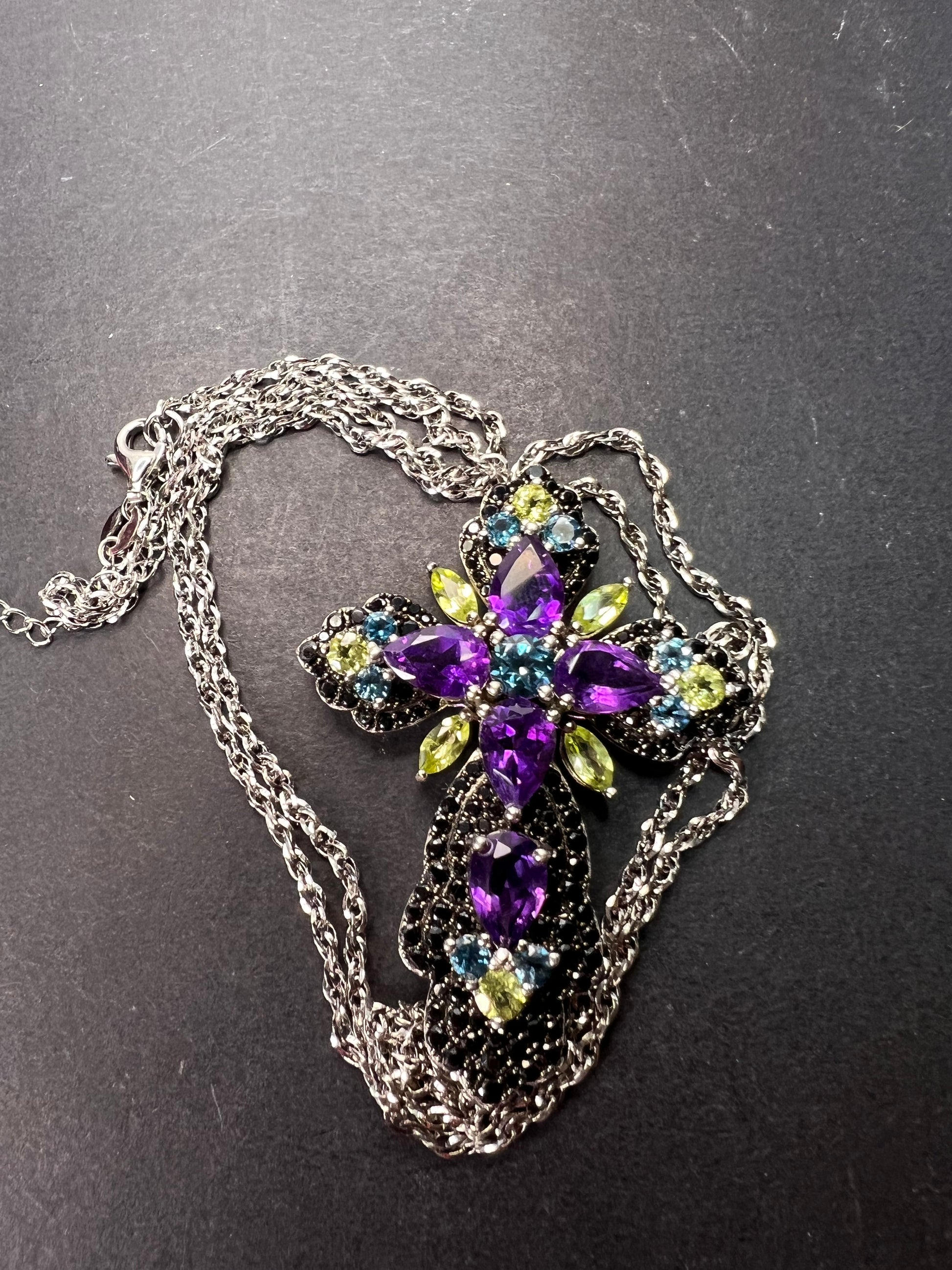 5.65ctw pear shape African amethyst, 2.27ctw round black spinel, 1.56ctw round and marquise Manchurian Peridot™, and 1.47ctw round London blue topaz rhodium over sterling silver Beautiful Faith™ cross pendant with 24" singapore chain. Measures approximately 2 1/16"L x 1 1/2"W. 2mm bail. Lobster clasp. .Black rhodium. 2" extender. 925