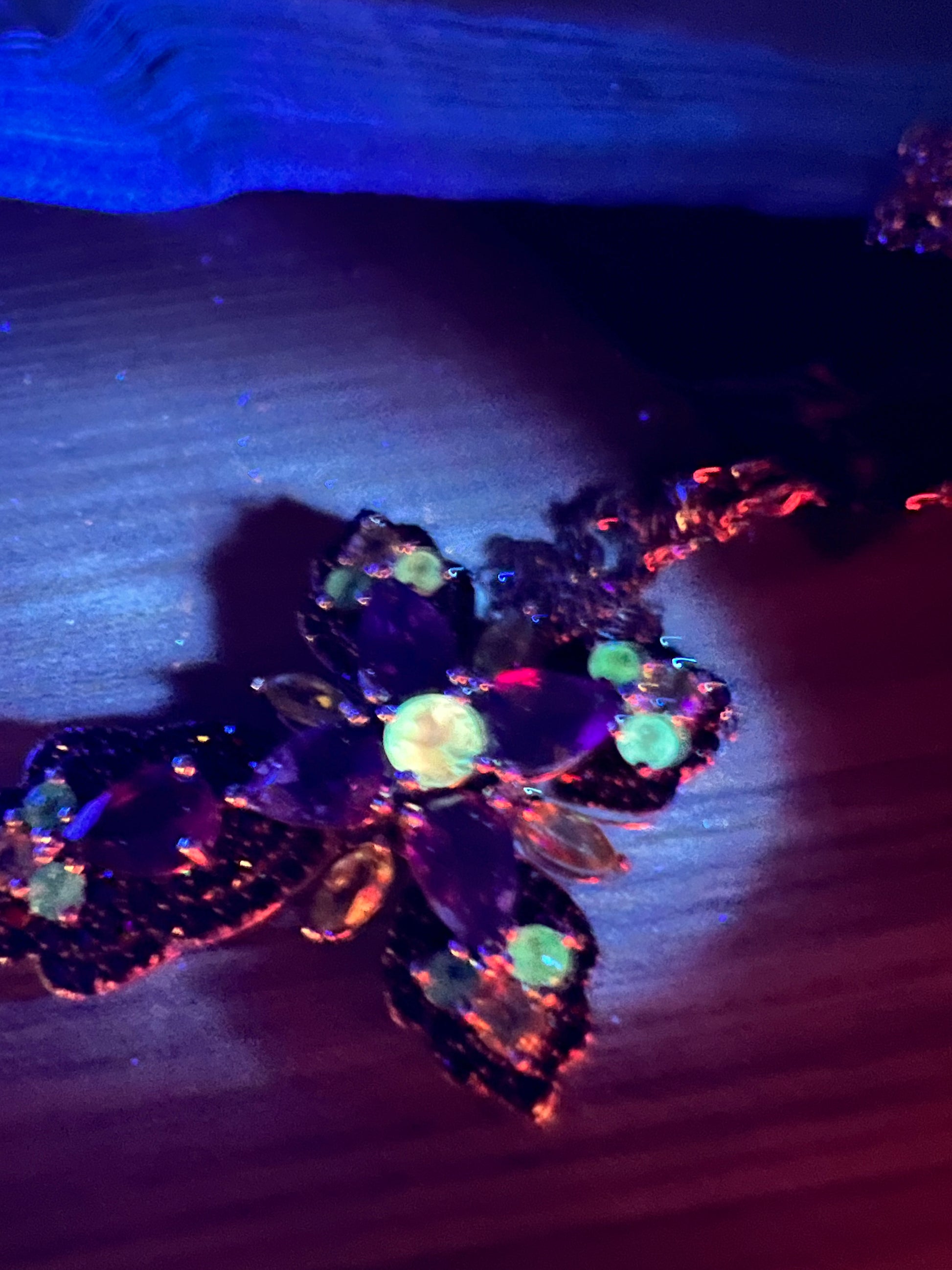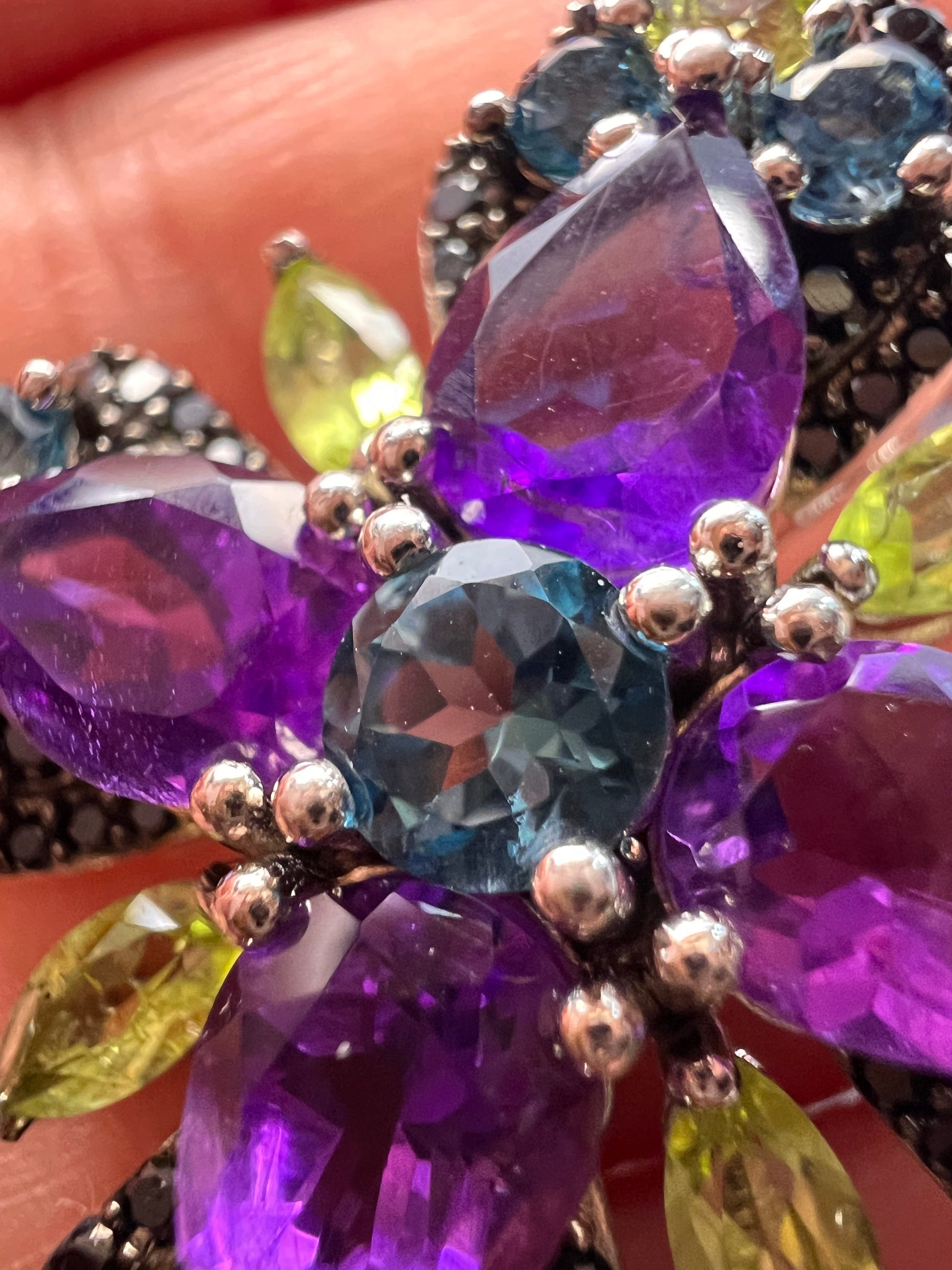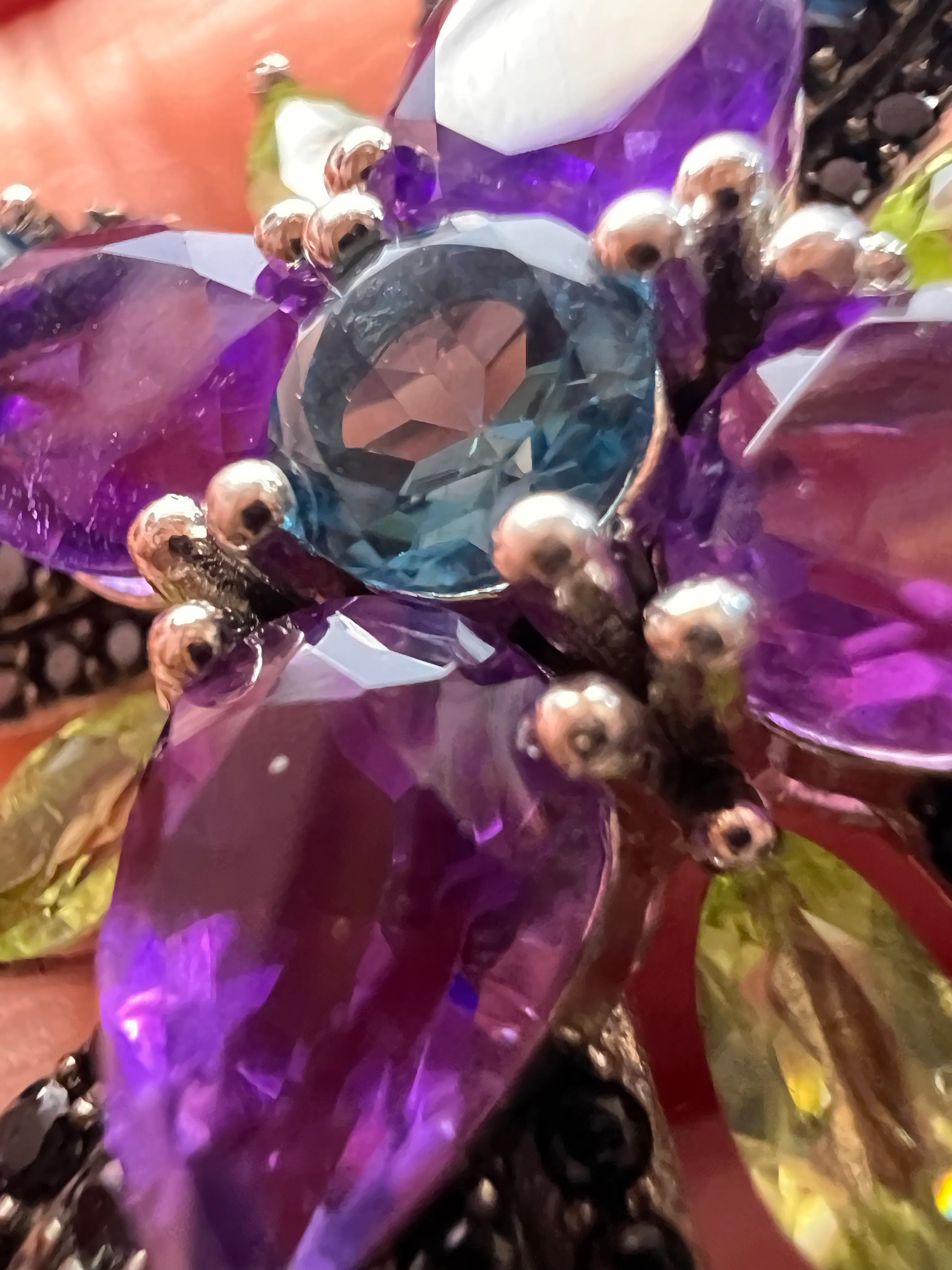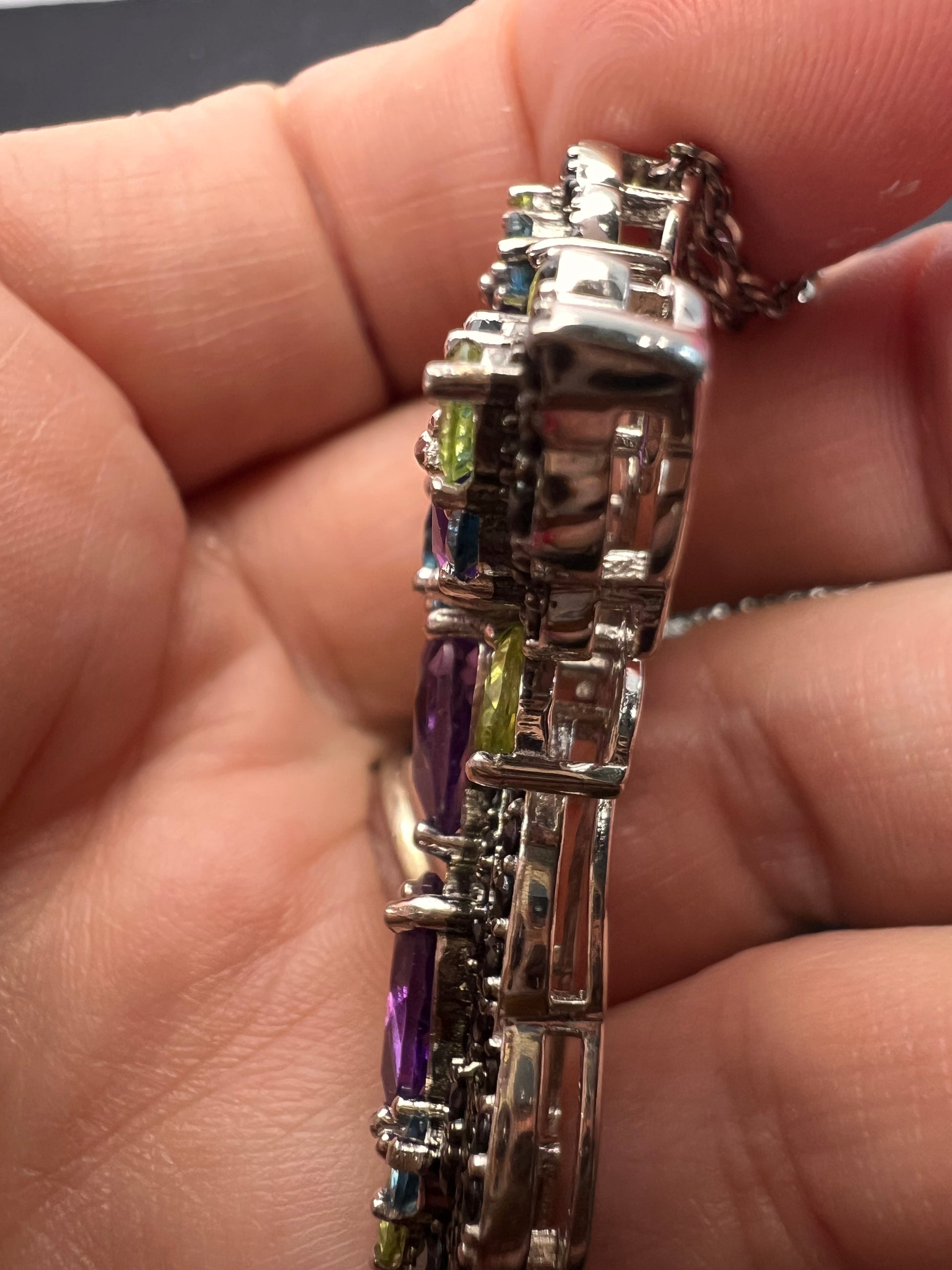 5.65ctw pear shape African amethyst, 2.27ctw round black spinel, 1.56ctw round and marquise Manchurian Peridot™, and 1.47ctw round London blue topaz rhodium over sterling silver Beautiful Faith™ cross pendant with 24" singapore chain. Measures approximately 2 1/16"L x 1 1/2"W. 2mm bail. Lobster clasp. .Black rhodium. 2" extender. 925