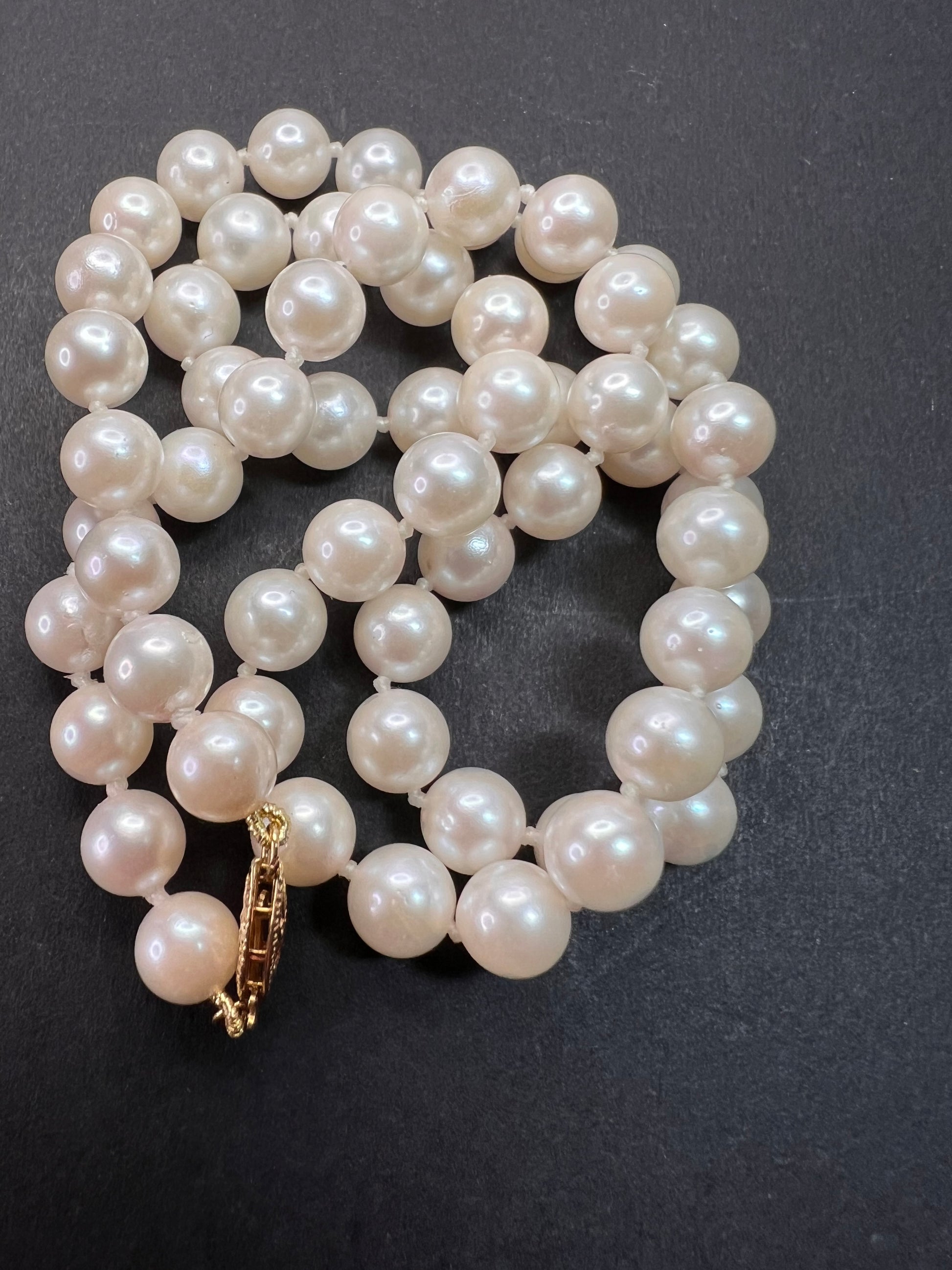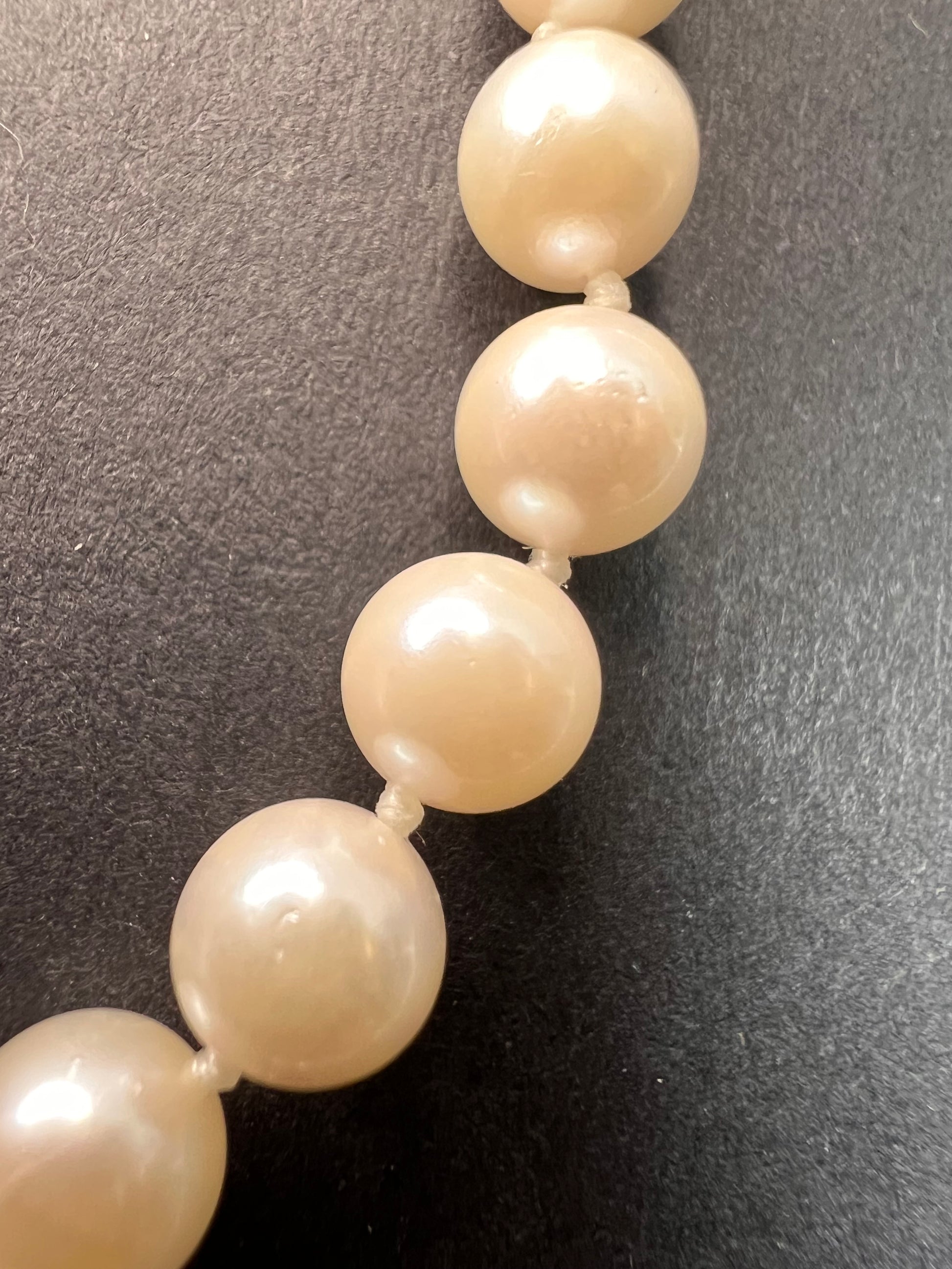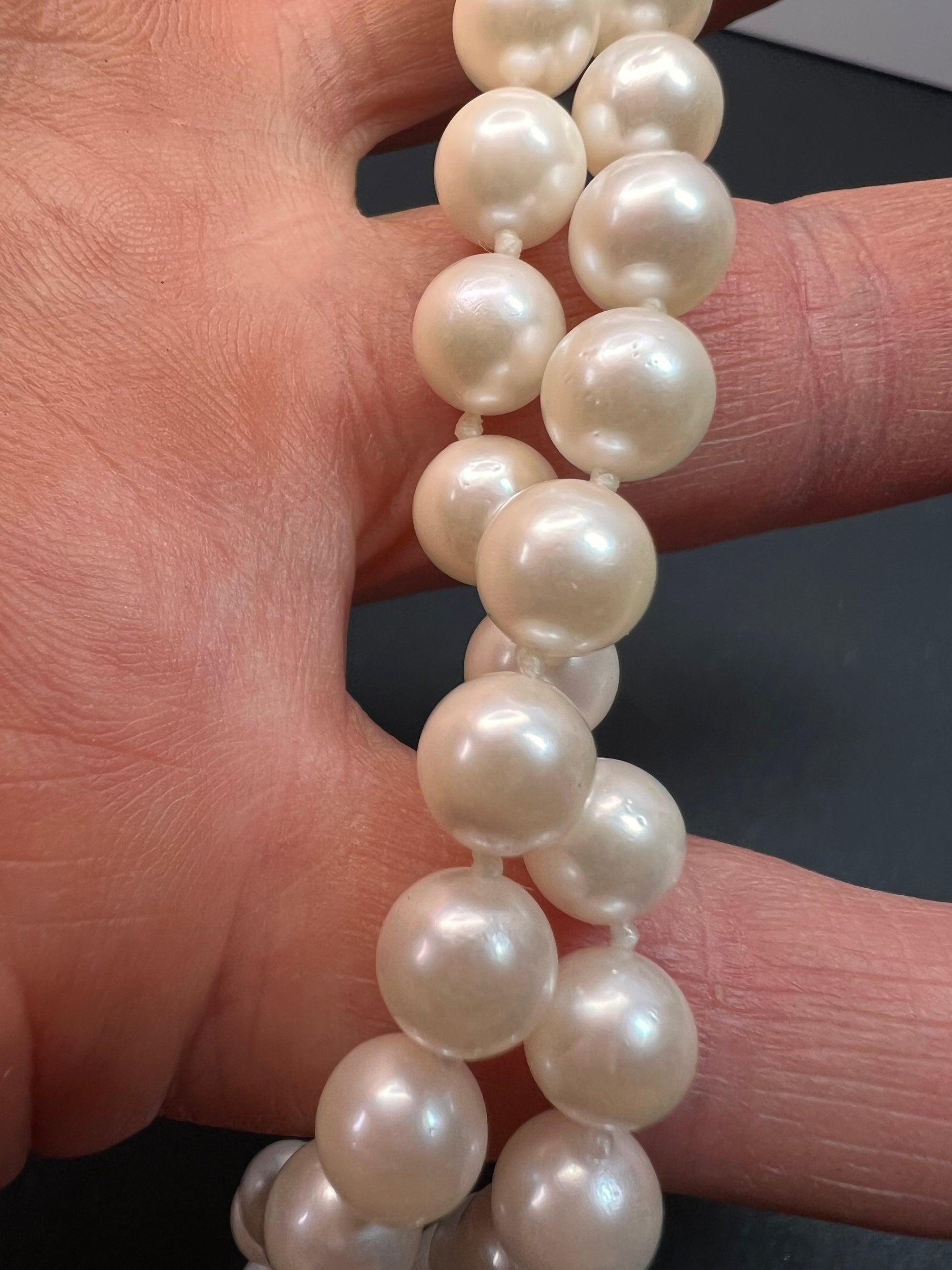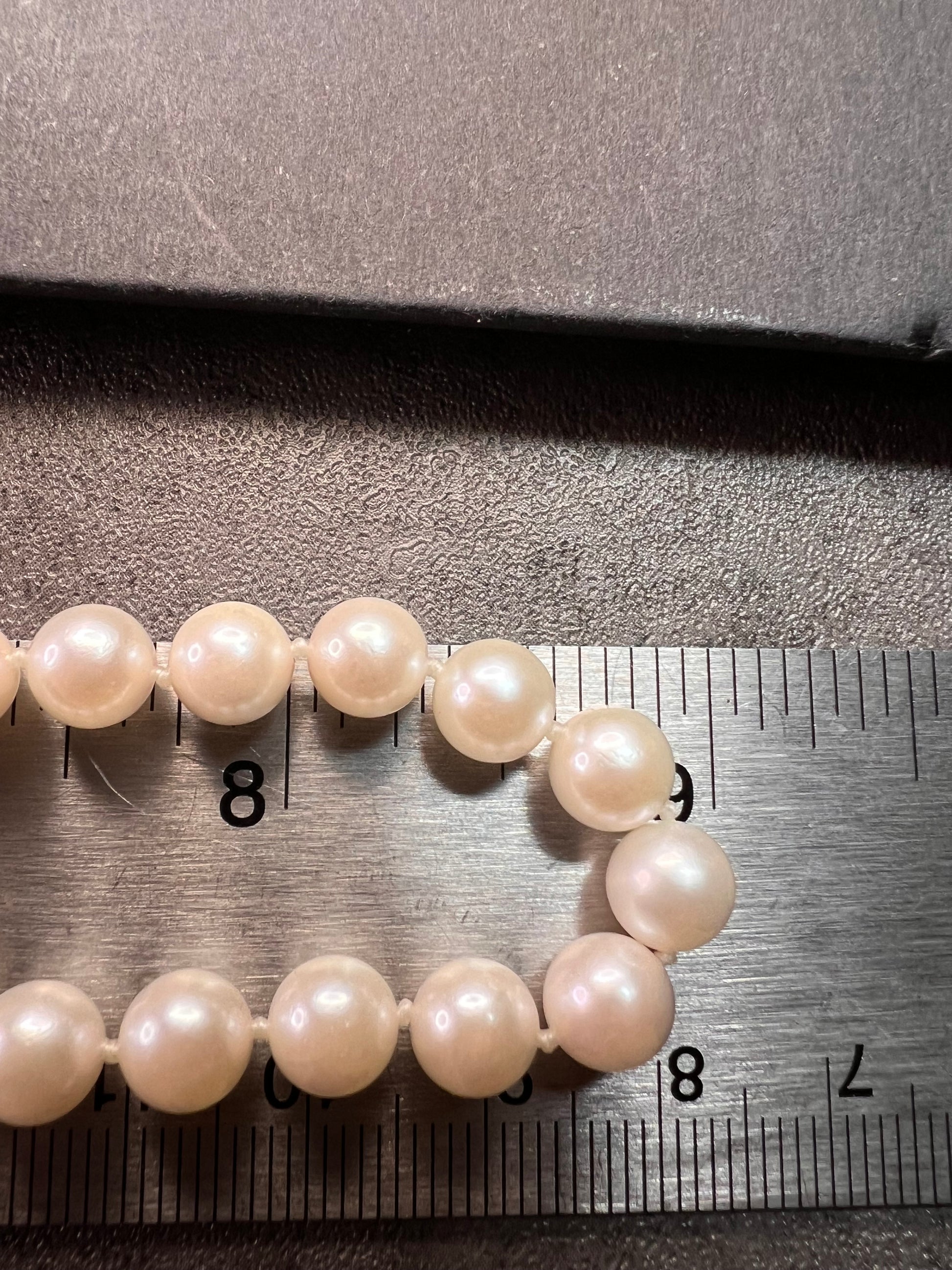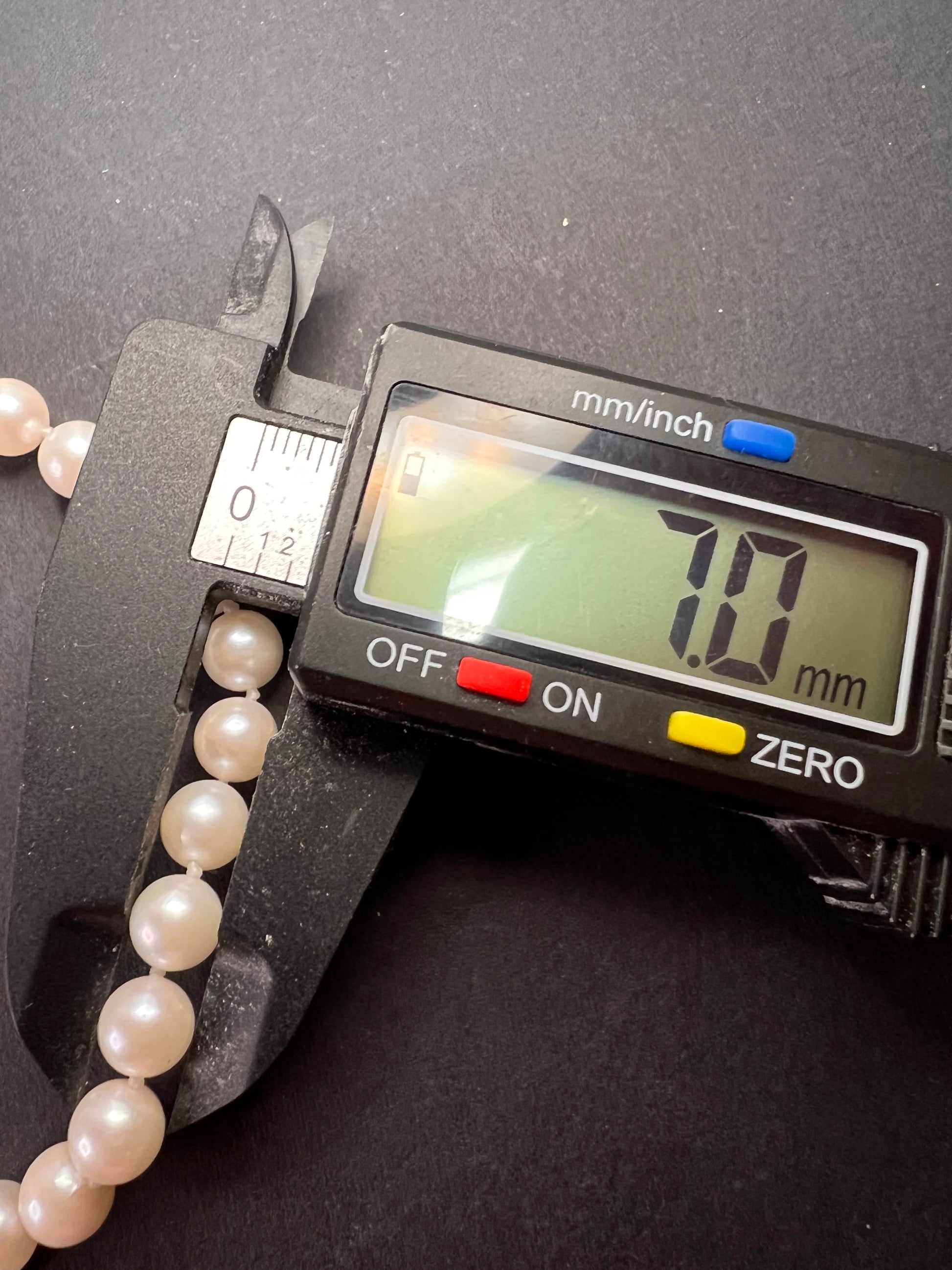 7 mm white cultured genuine pearls knotted in between each one for a total of 18 inches. Finished with a 14k yellow gold fishhook clasp. I wish I had taken before photos of this strand cause they look completely different now in all the best of ways. This strand is ready for a new owner, and what I consider an heirloom piece to pass down.