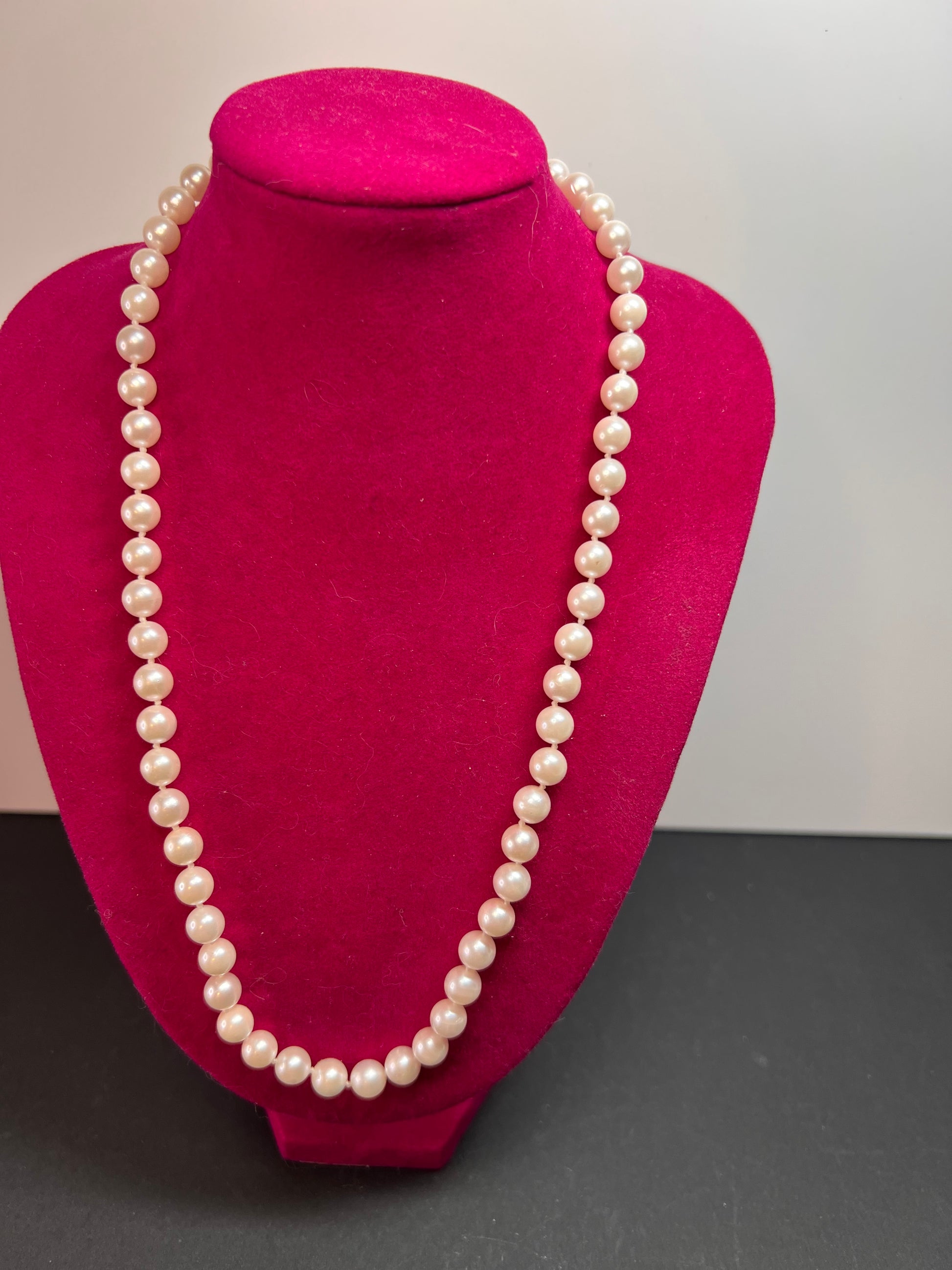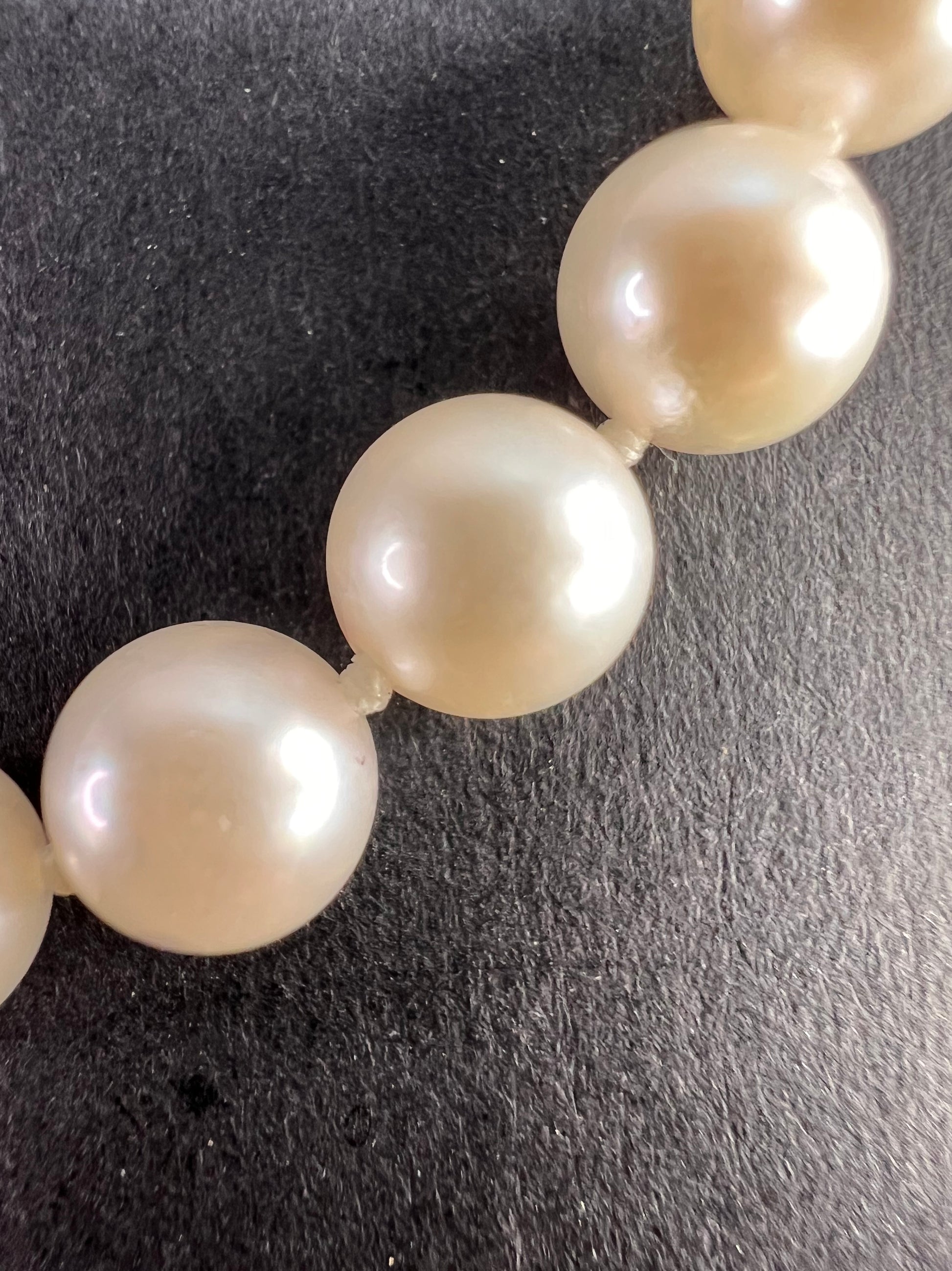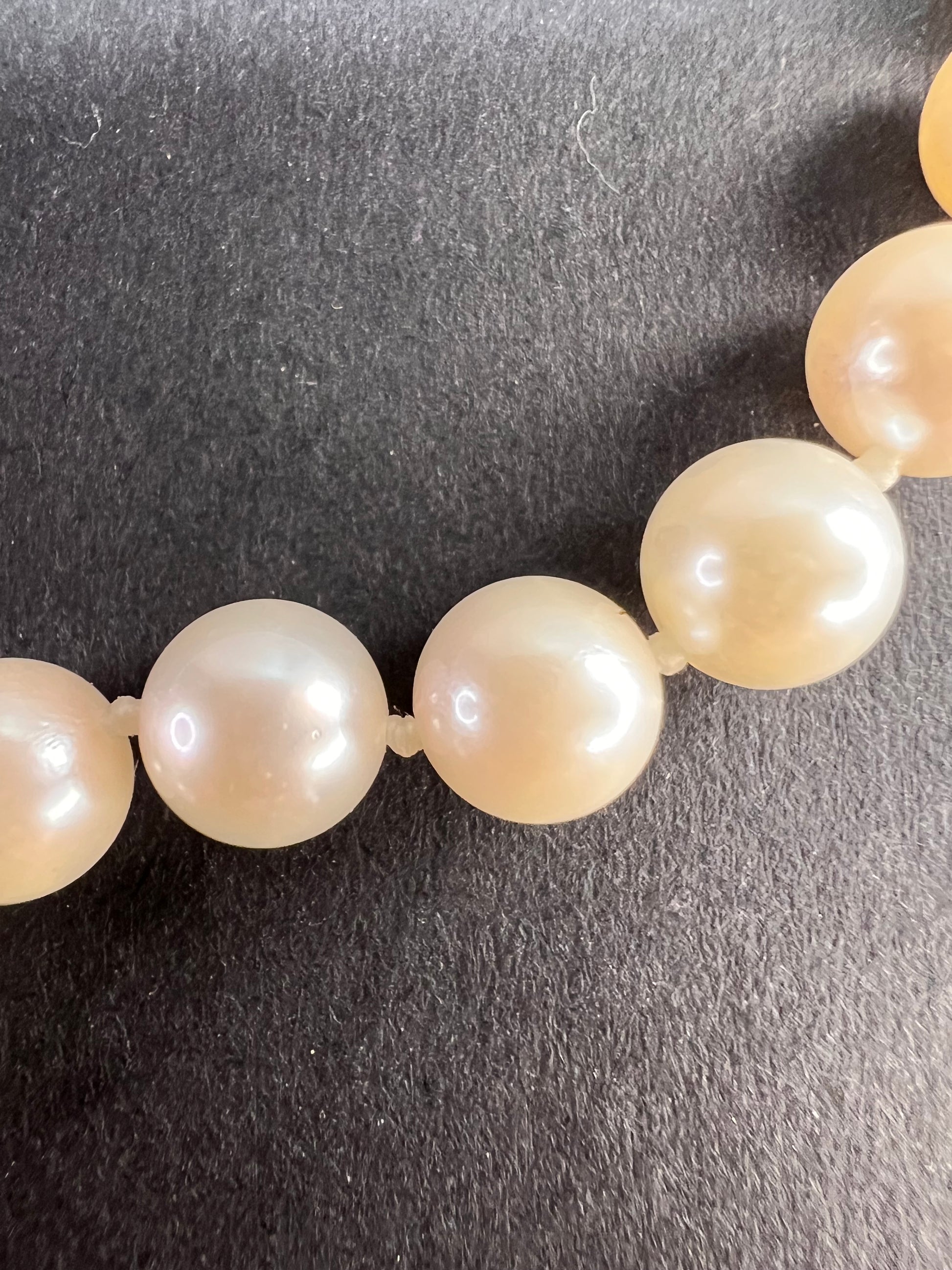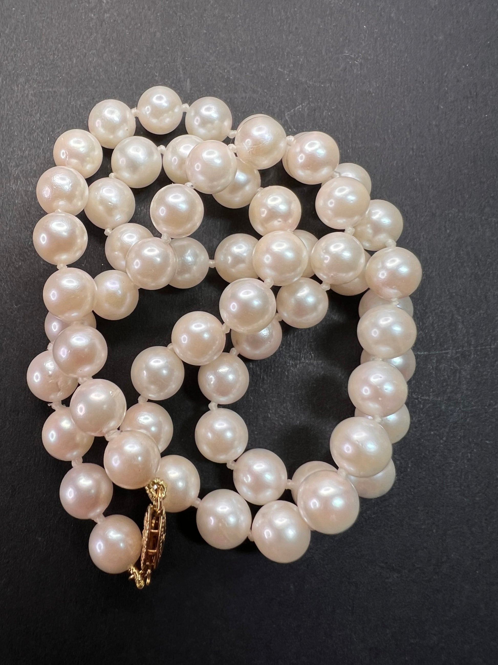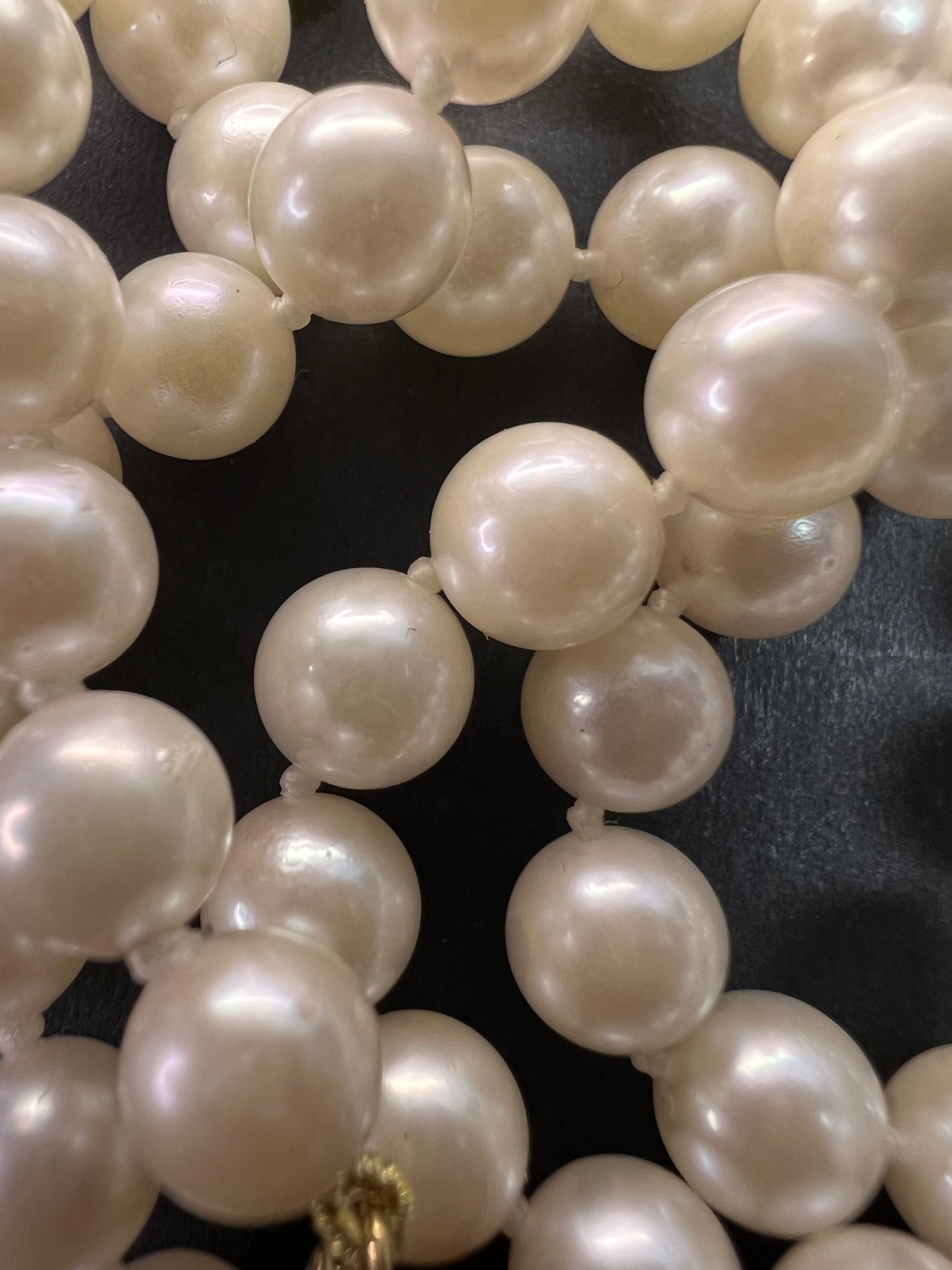 7 mm white cultured genuine pearls knotted in between each one for a total of 18 inches. Finished with a 14k yellow gold fishhook clasp. I wish I had taken before photos of this strand cause they look completely different now in all the best of ways. This strand is ready for a new owner, and what I consider an heirloom piece to pass down.