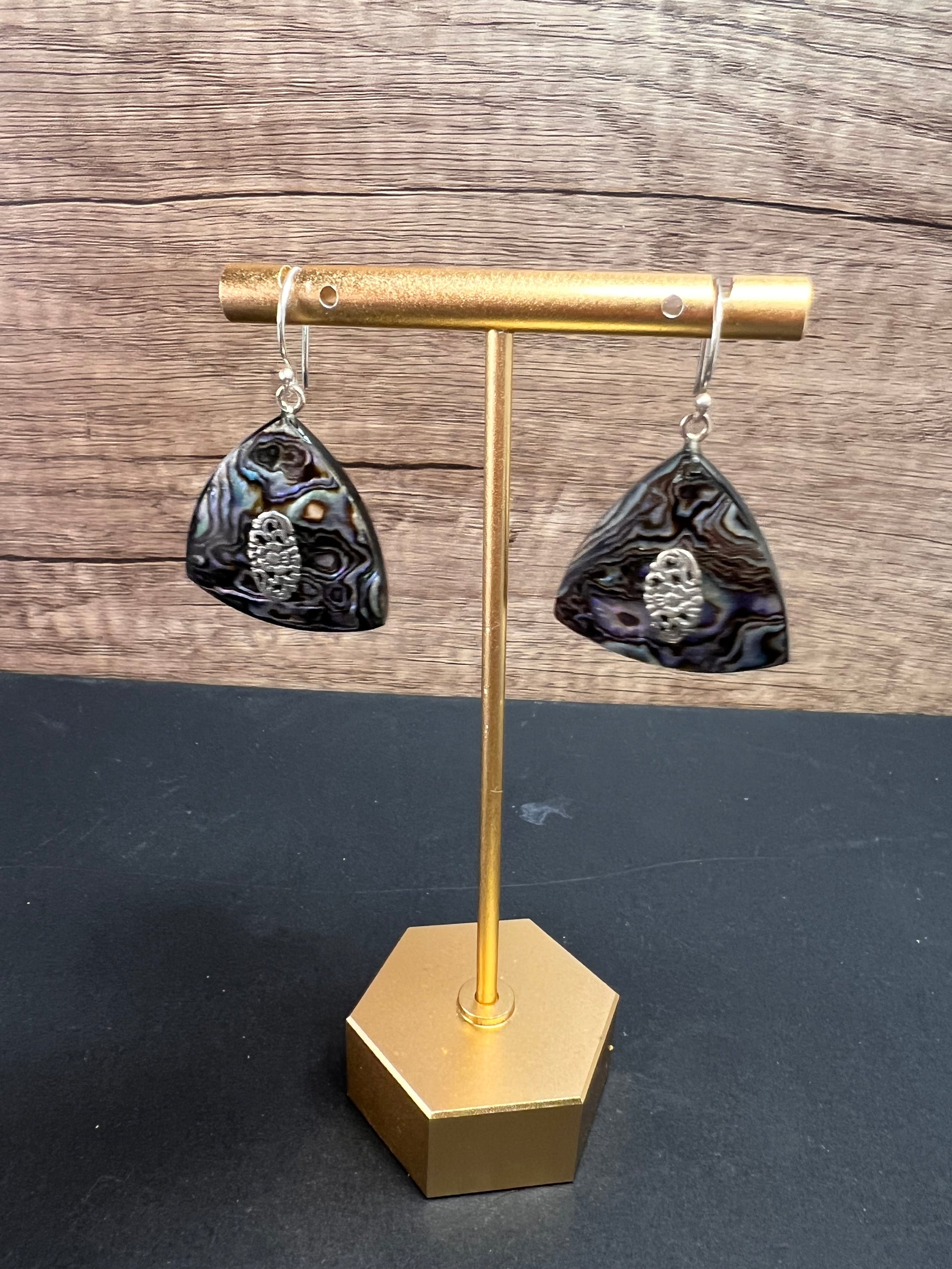 Trillion shaped abalone shell with sterling silver hooks and accents.
