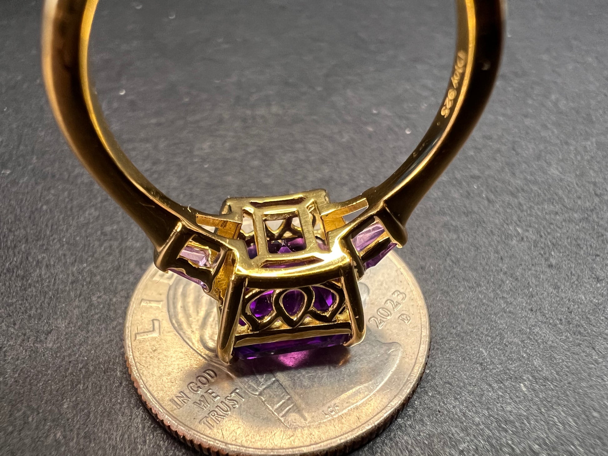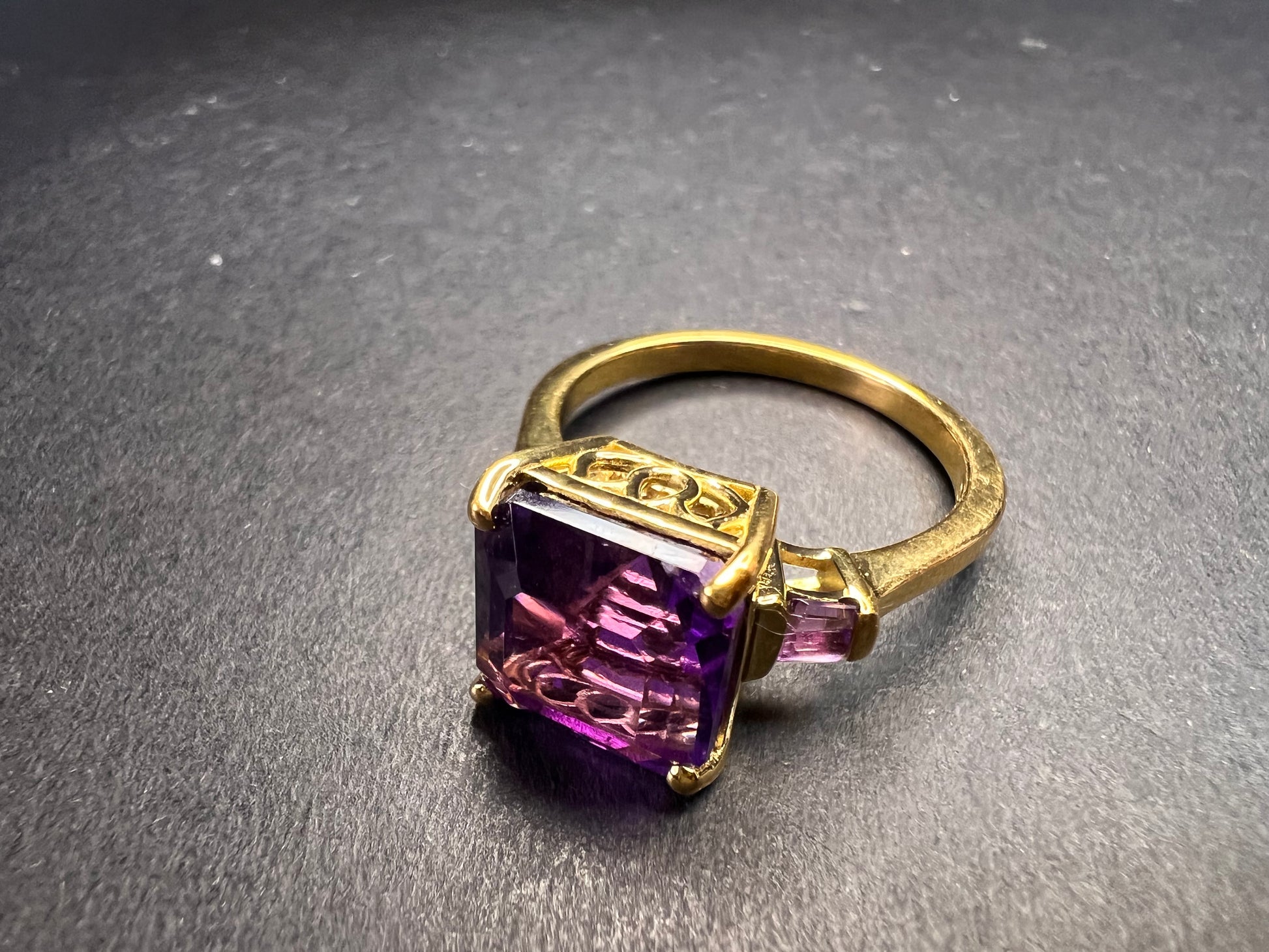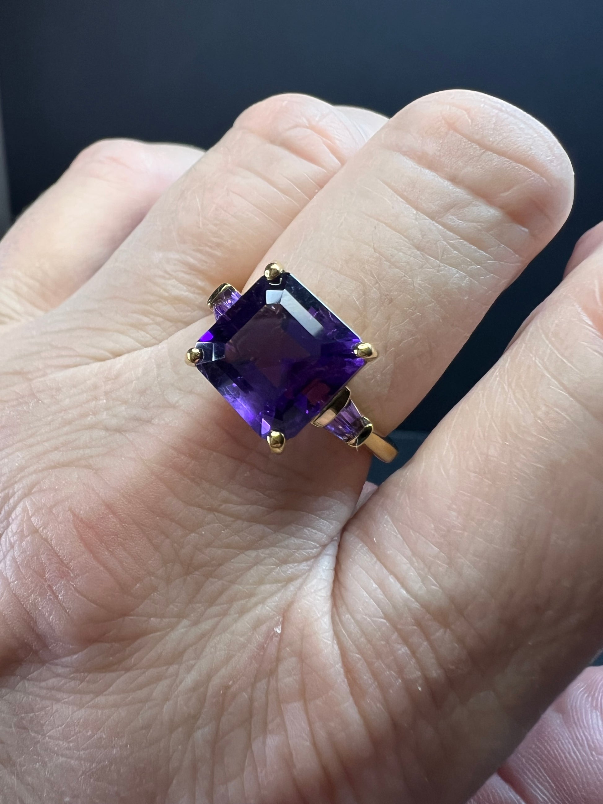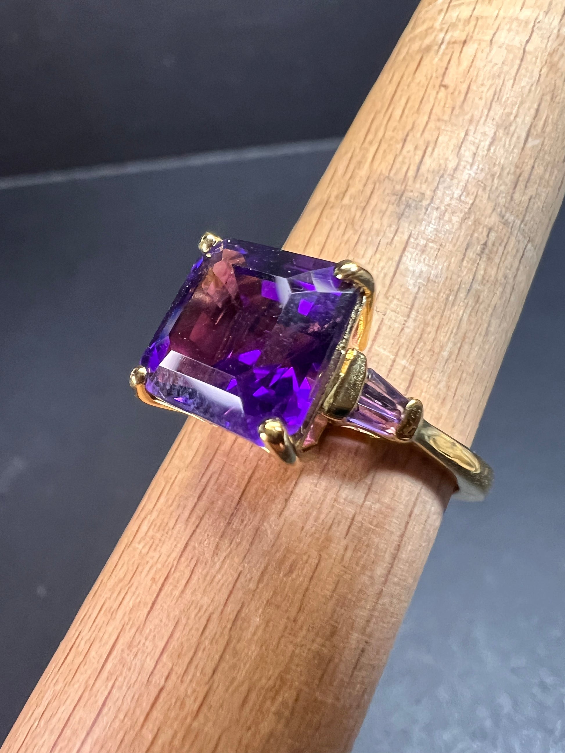 Genuine deep purple African amethyst octagon cut gemstone measuring 10x10mm in a prong setting. Two accent tapered baguette amethyst gemstones on shank are channel set. Ring is in authentic 925 sterling silver base with a 18k yellow gold vermeil plating. Measures a size 9 and has a total weight of 5.0 grams. All amethyst gemstones are earth mined and heat treated. 925 Djoy. Made in India. Estimated retail value is $410.