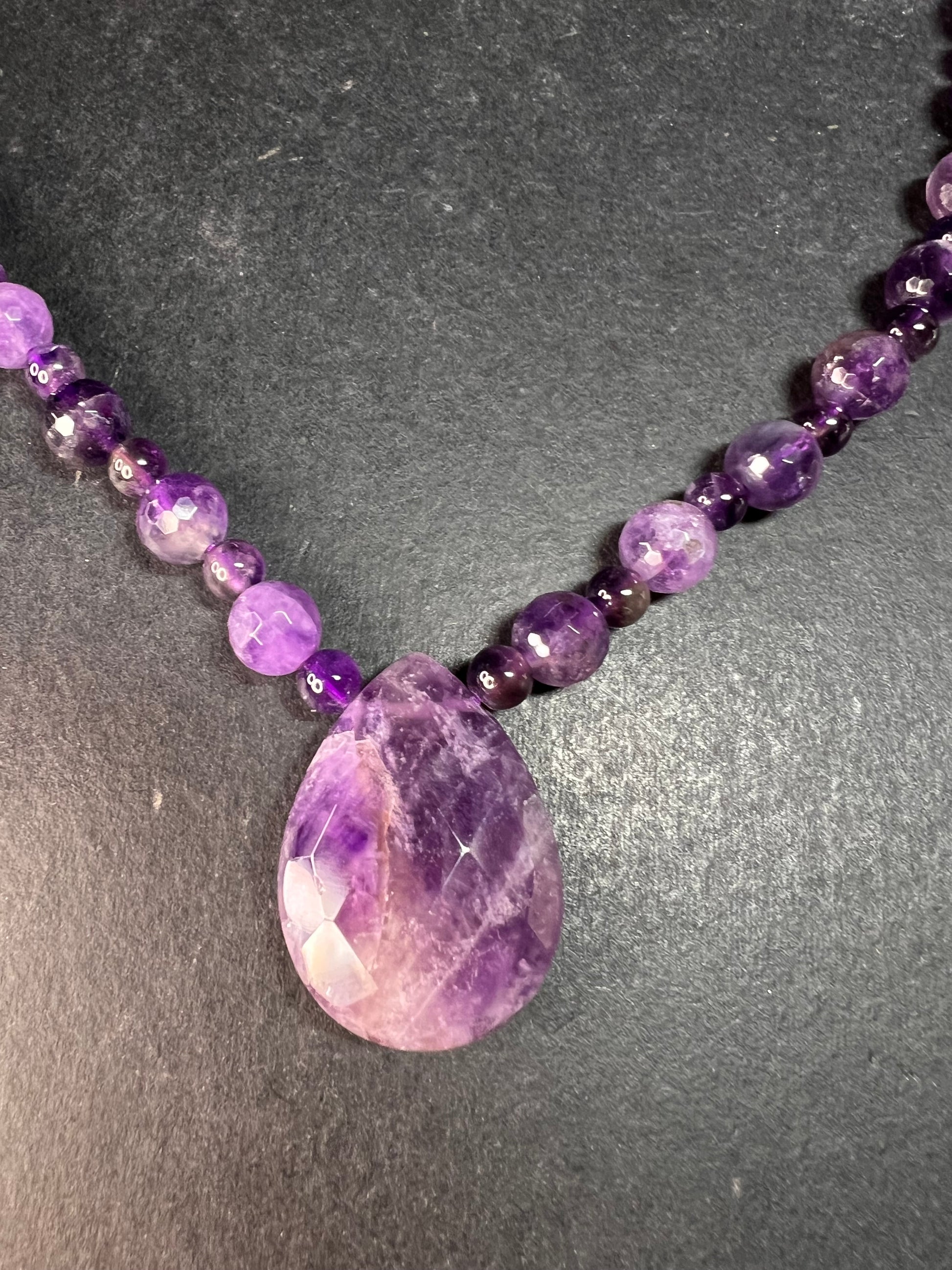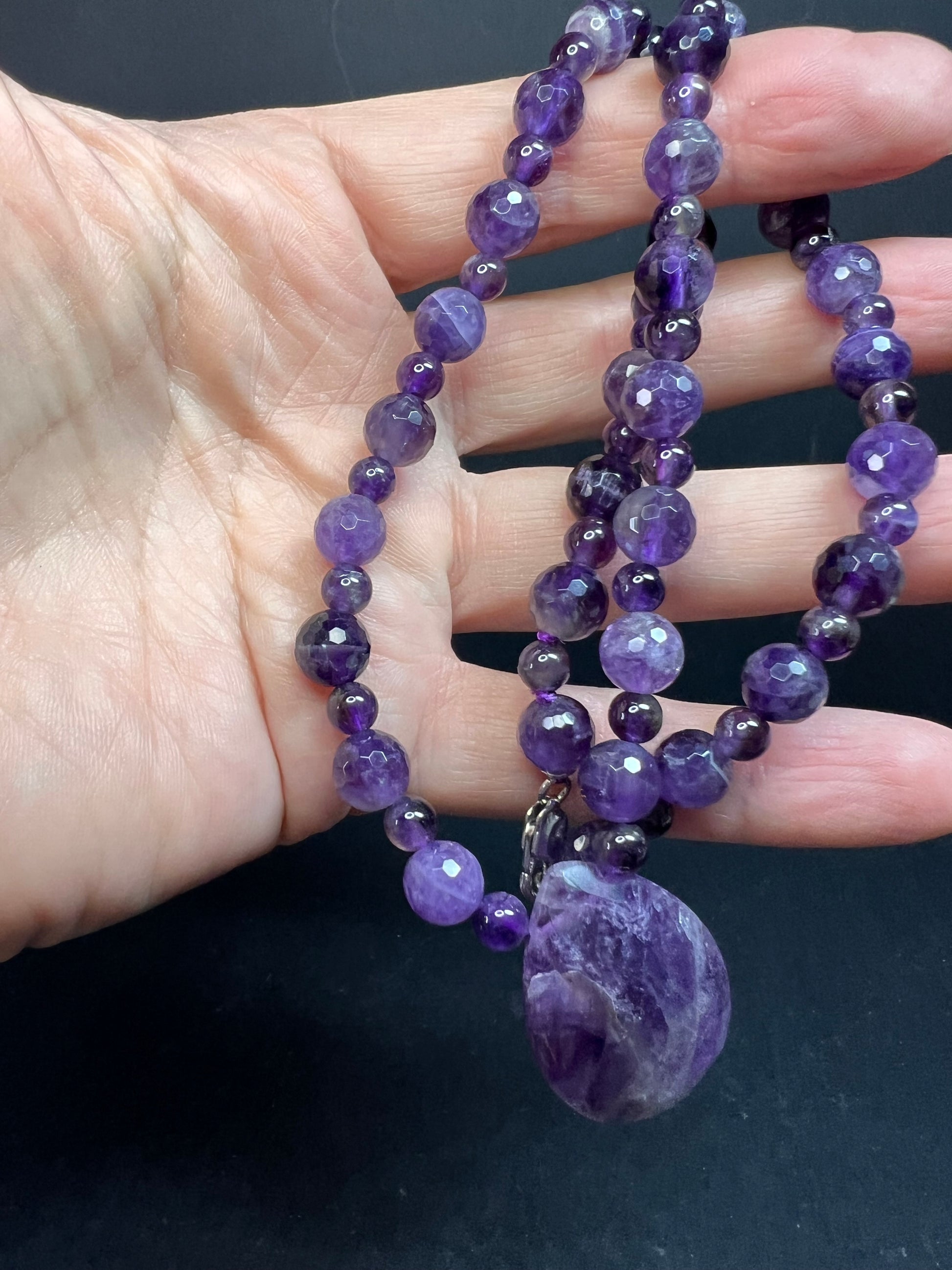 Genuine purple amethyst stone beads in varying sizes and shapes measuring 18 inches in length with a teardrop faceted amethyst pendant in the center. 925 sterling silver lobster clasp. Strung on purple cord.