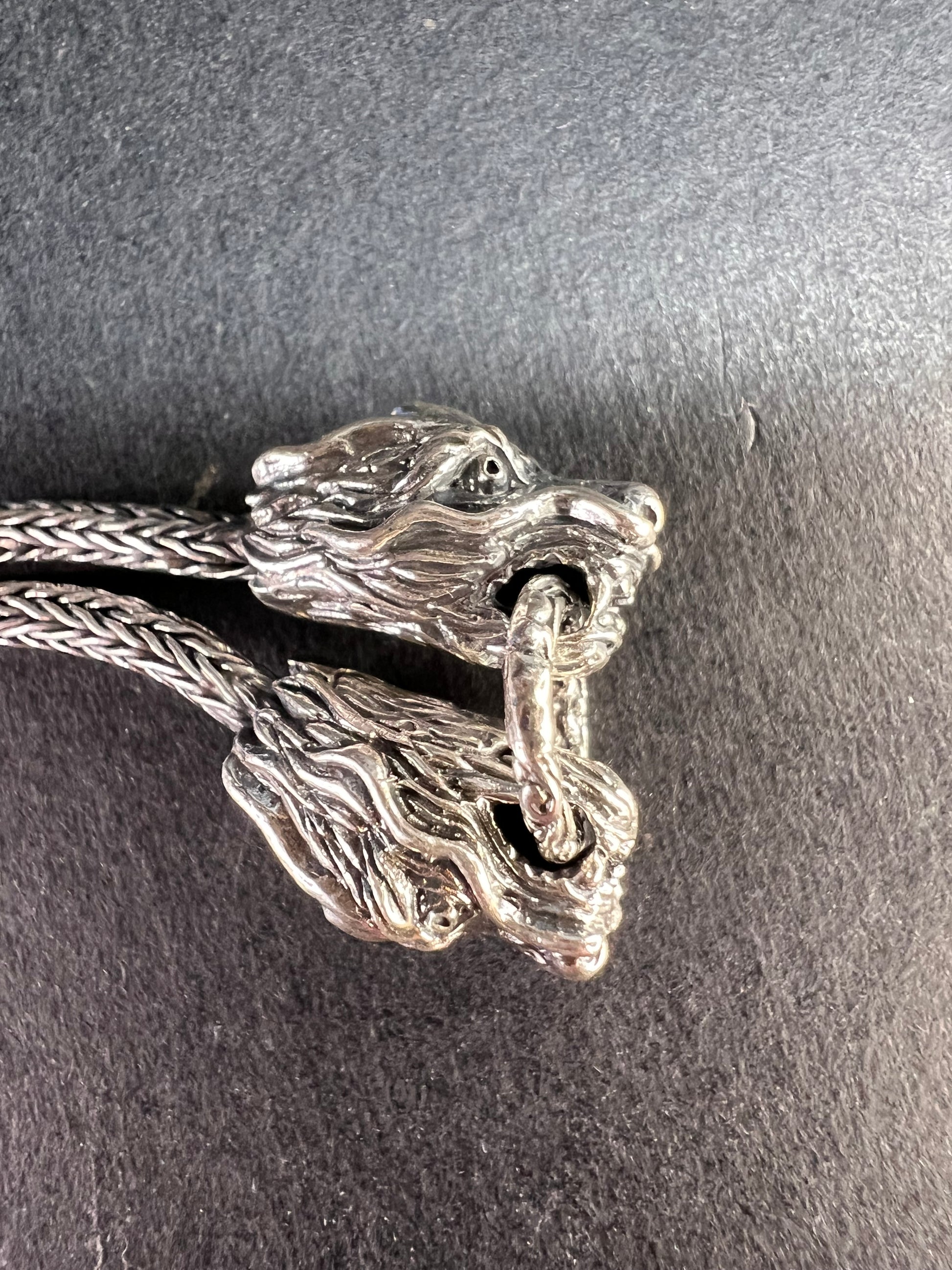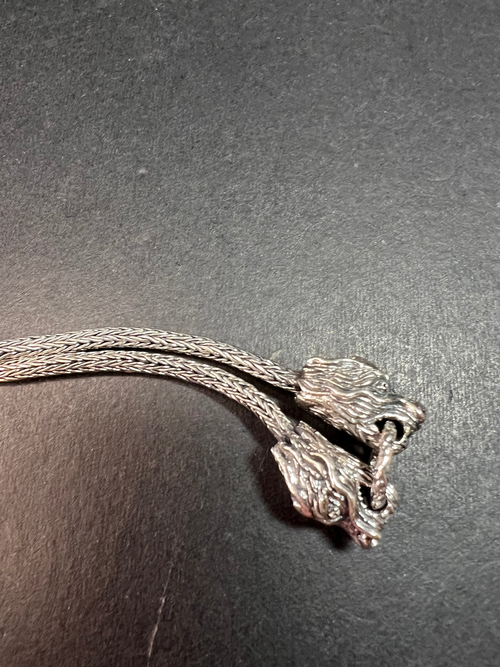 Authentic 925 Bali sterling silver with two dragon heads face to face in the middle holding a ring. Measures about 8 inches in length. Total weight is 12.59 grams with toggle clasp to wear at shorter lengths. STS 925. Made in Indonesia. Estimated retail value is $700.