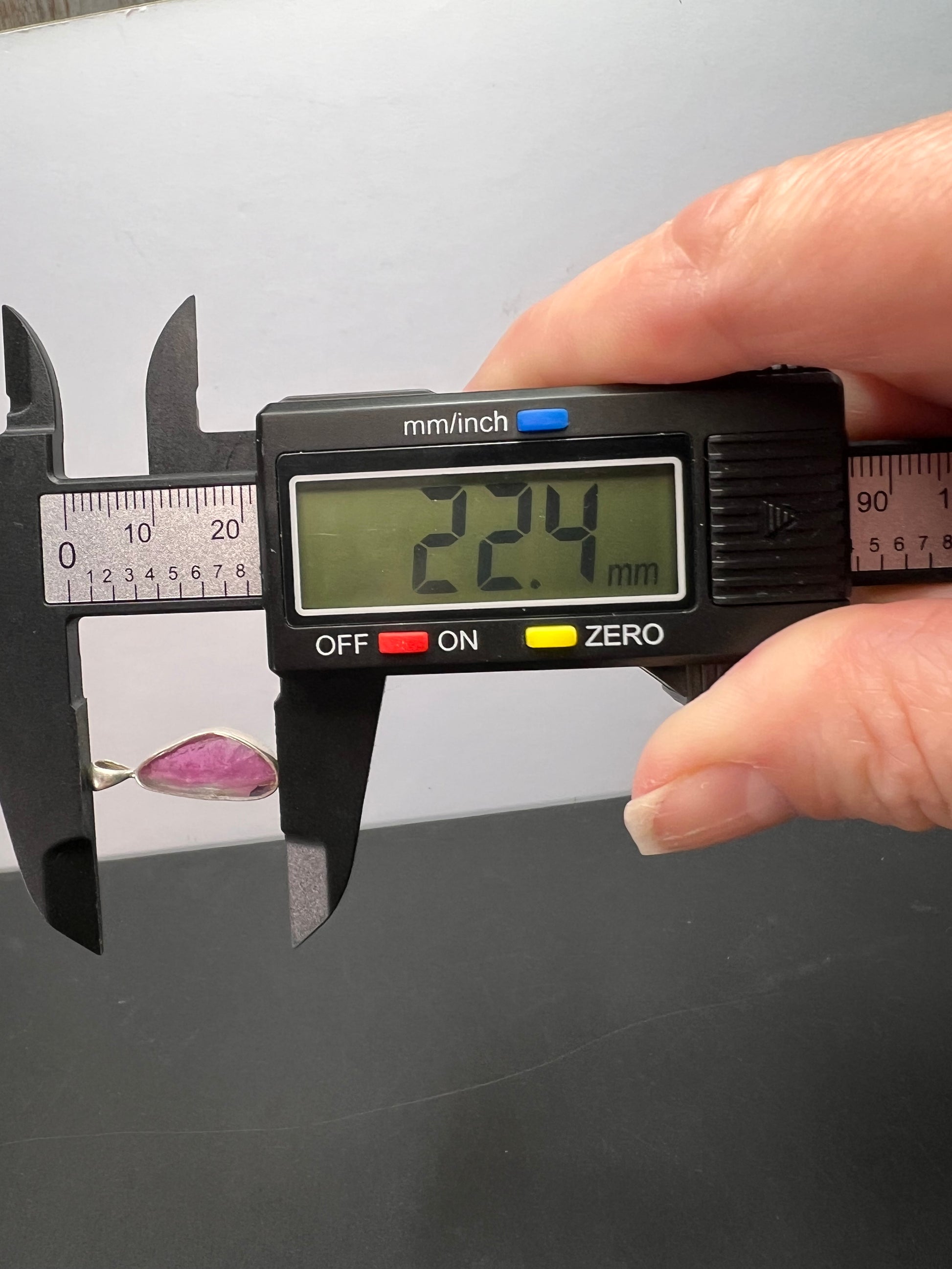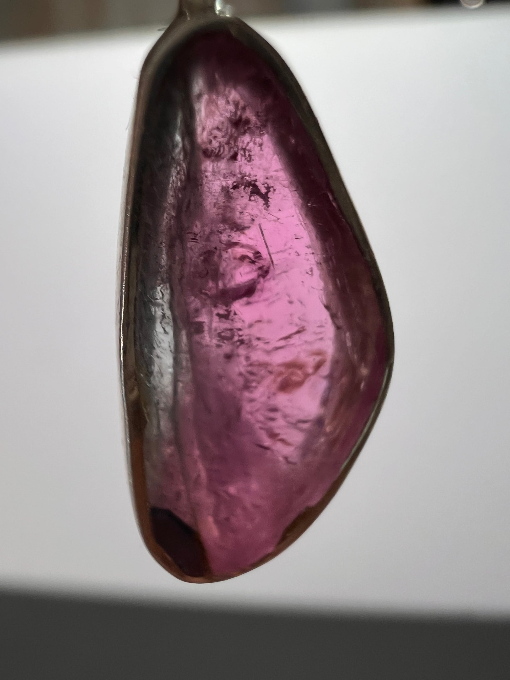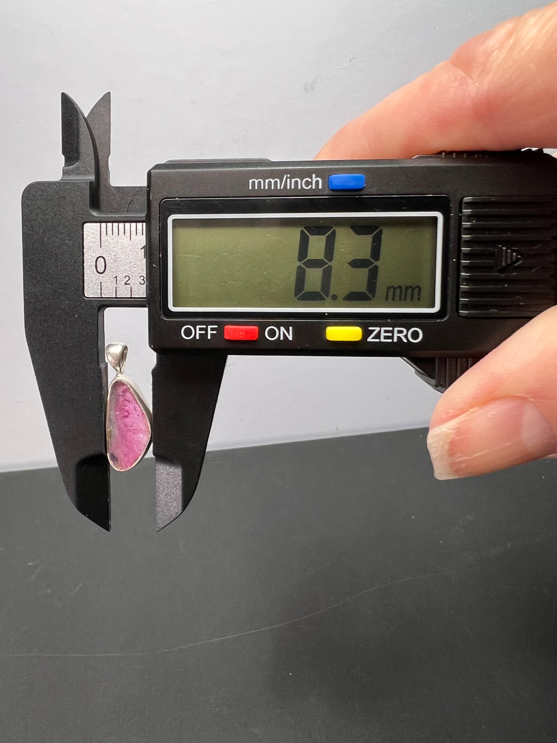 Genuine pink tourmaline with a sliver of pale blue on the side and a spot of what appears to be schorl towards the bottom. Set in authentic 925 sterling silver. Total weight is 1.37 grams. Measurements are 8.3x22.4 grams. This is for the pendant only. Chain not included.