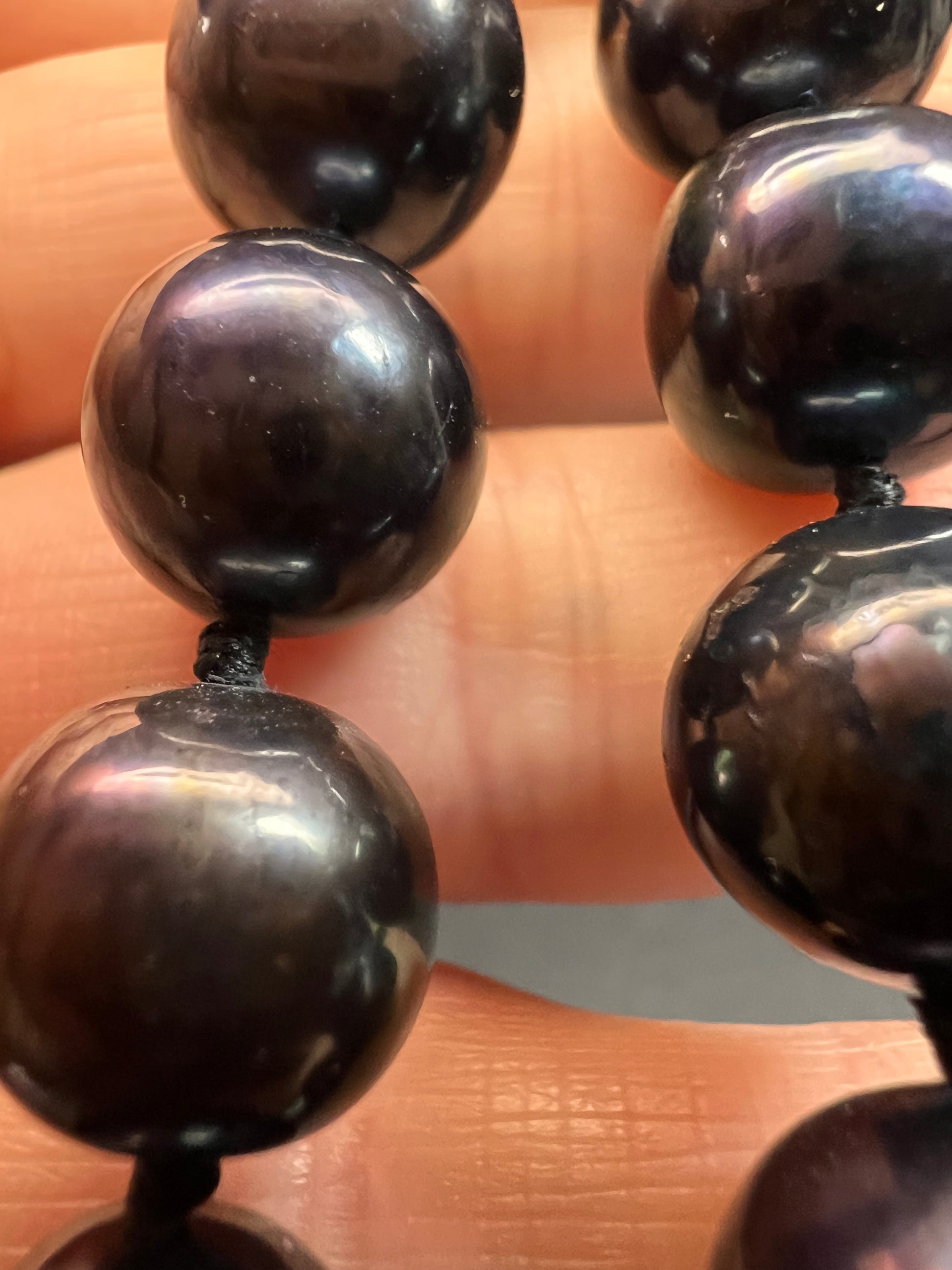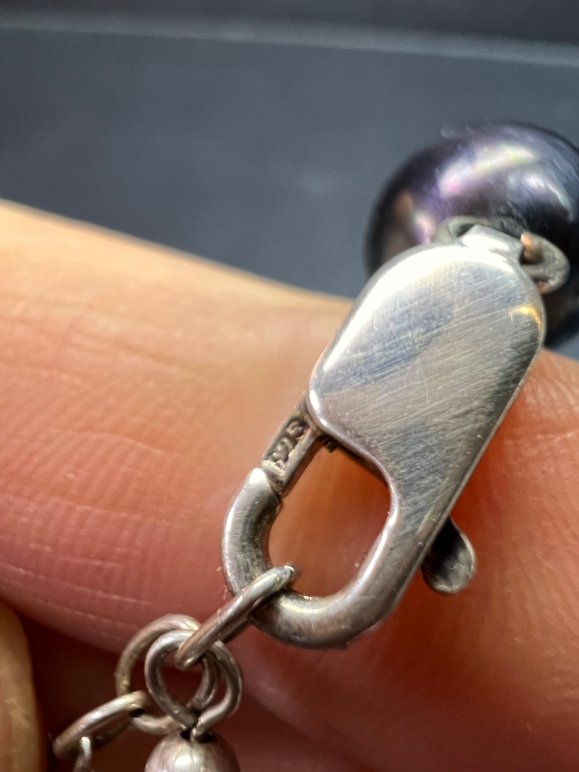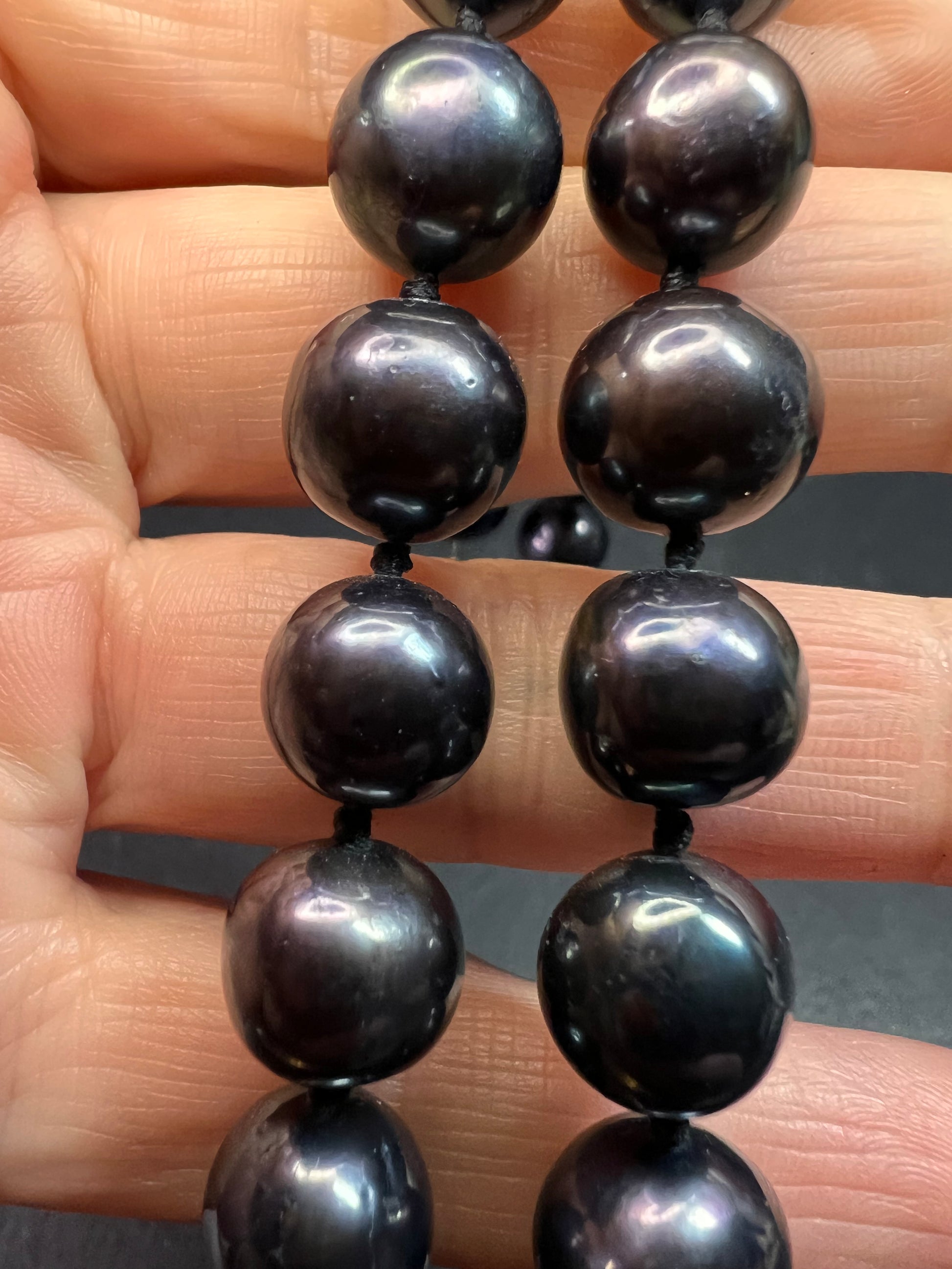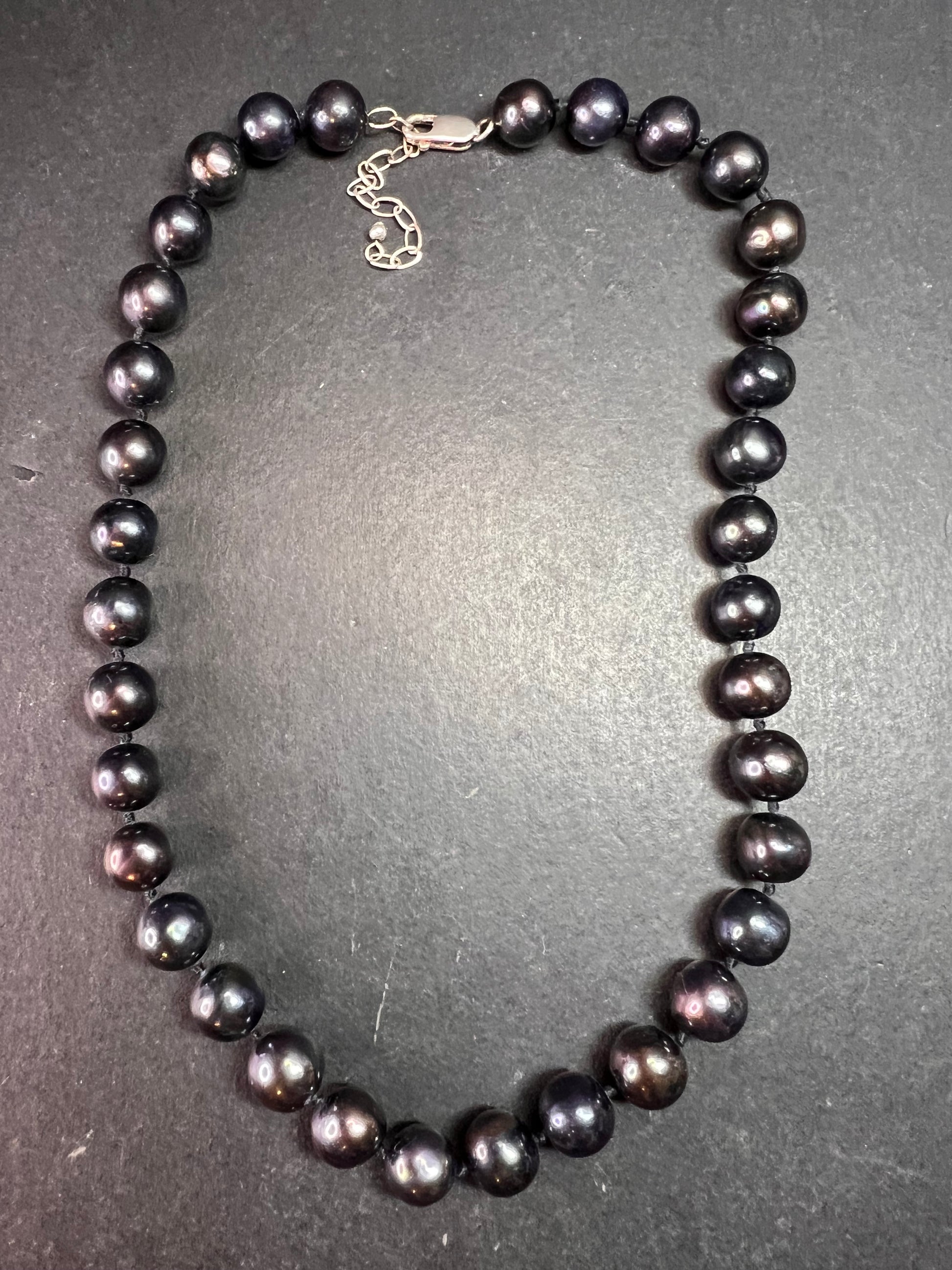 New without tag. This elegant necklace features genuine cultured freshwater pearls in a deep black tone with peacock flashes of violet, blue, and bronze. Pearls average ~11mm and are near-round with medium–high luster and natural surface texture typical of larger freshwater pearls. Individually knotted on black cord for durability. Measures 18–20 inches with extender. Finished with a 925 sterling silver clasp and chain (tested/stamped). Excellent condition with no signs of wear—bold, classic, and gift-worthy.