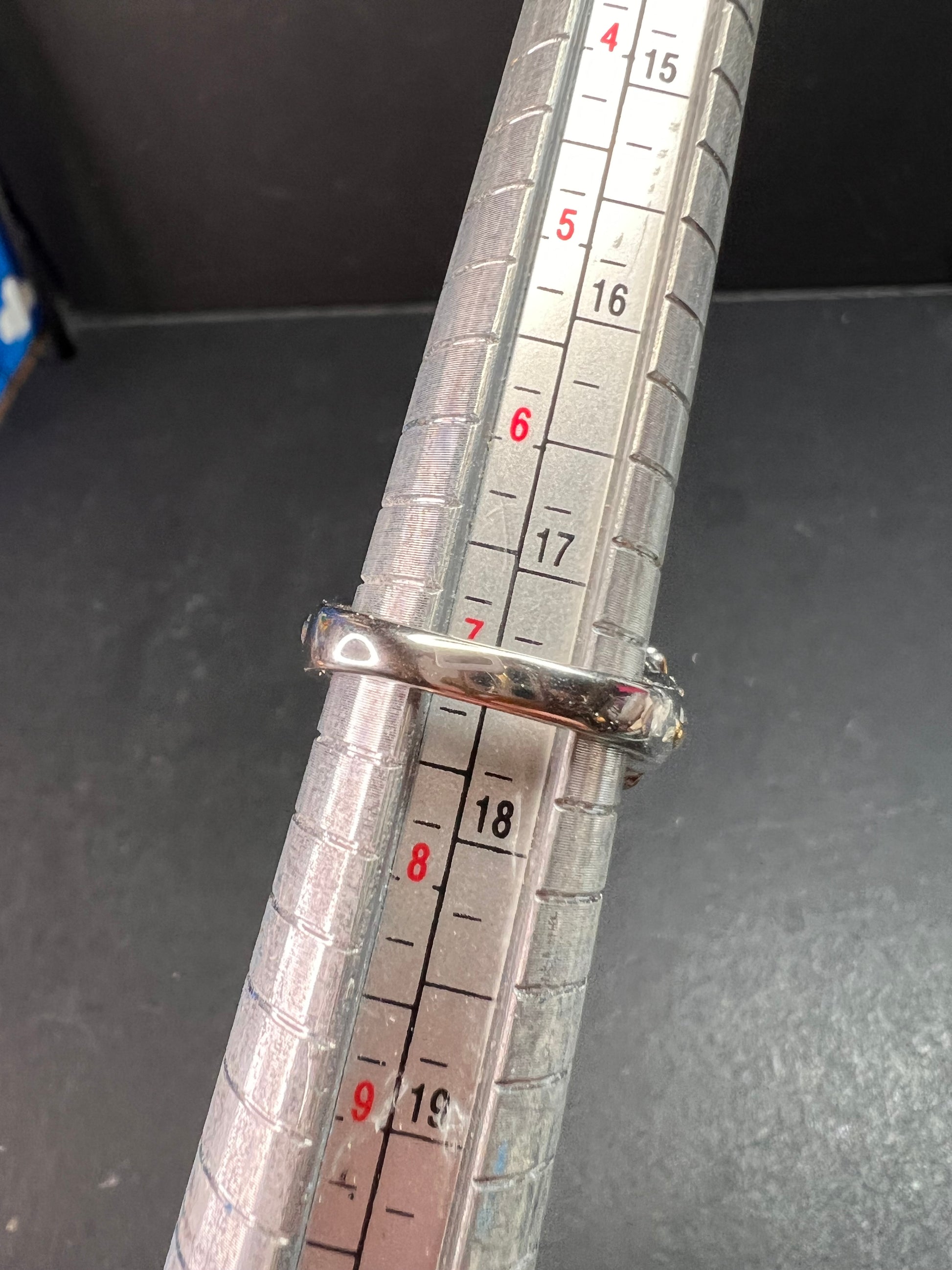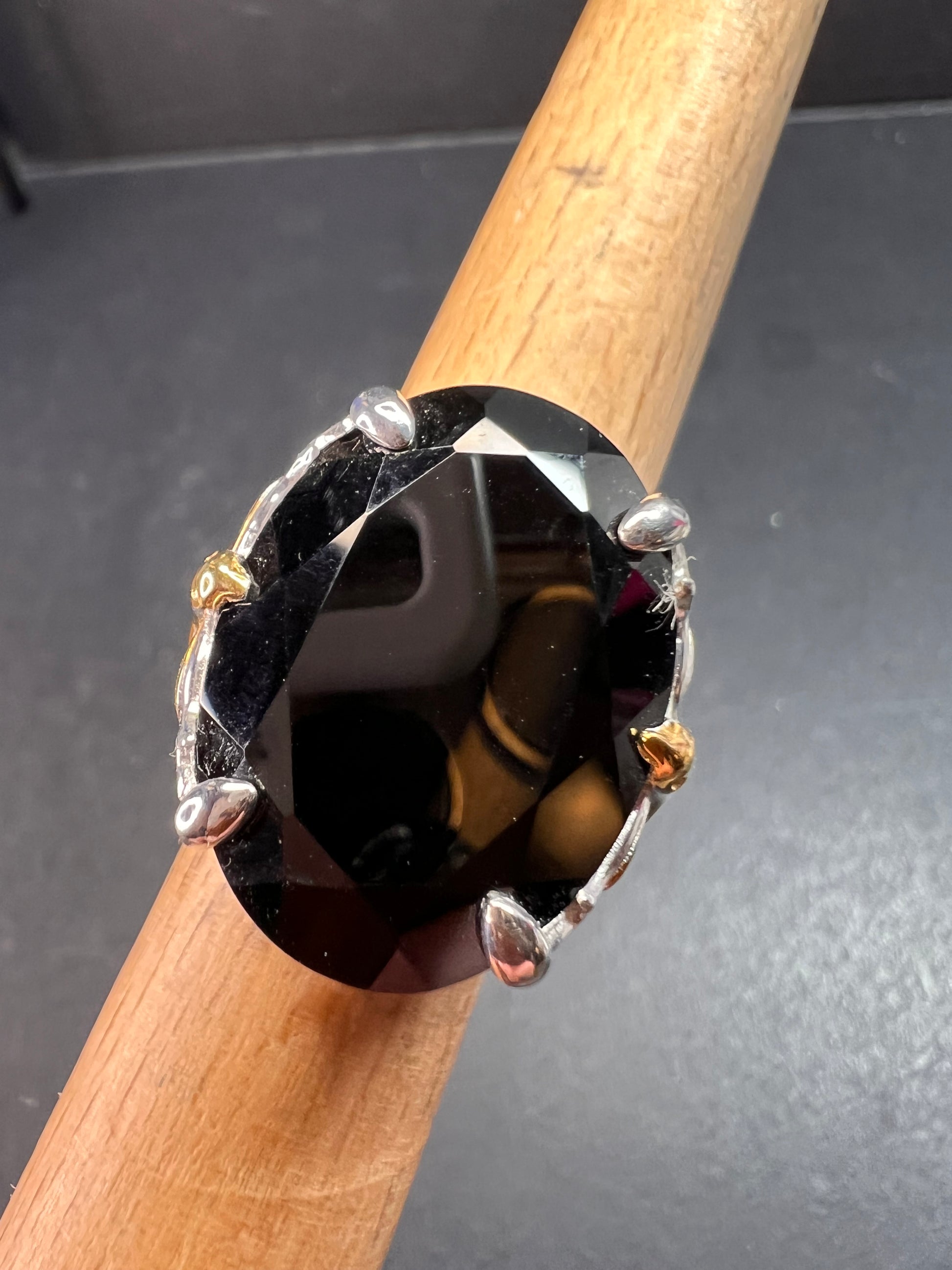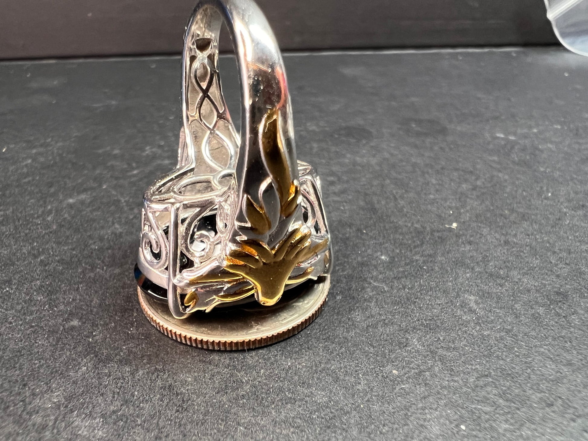 Genuine Thai black spinel oval cut gemstone weighing over 34 carats and measuring about 25x18mm. Prong set in an authentic 925 sterling silver base plated with rhodium and vermeil yellow gold for a two toned finish with a phoenix design down the shank on both sides. Total weight is 17.23 grams. Measures a size 7. This is a well made interesting ring that that definitely makes a statement. Just the kind you’d like to inherit from your great aunt that traveled the world. I’d definitely chalk this one up to being heirloom worthy. Black spinel gemstone is mined and 100% natural with no treatment. Djoy. Made in India. Estimated retail value is $600.