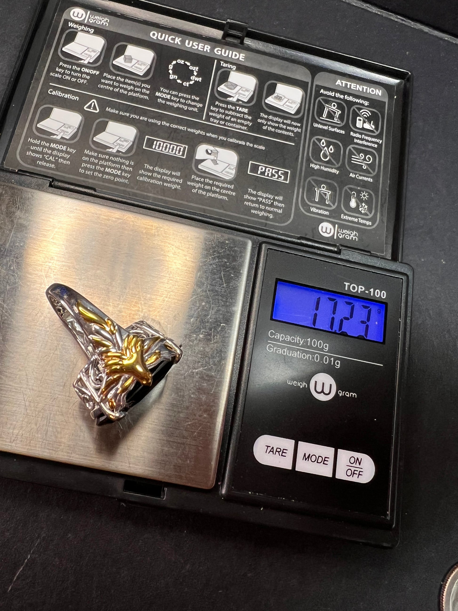 NEW Black spinel Phoenix ring in rhodium and gold vermeil over sterling silver size 7