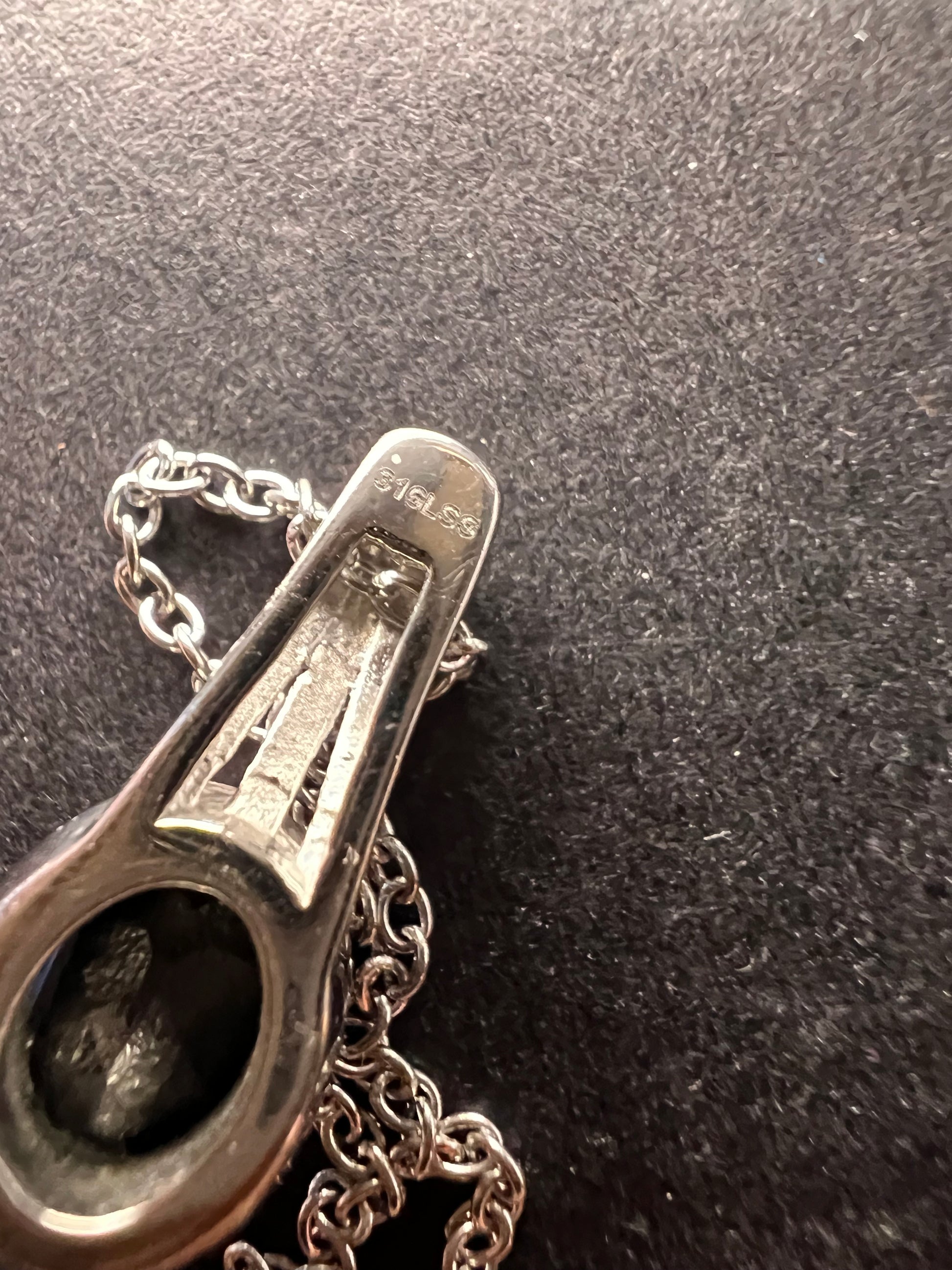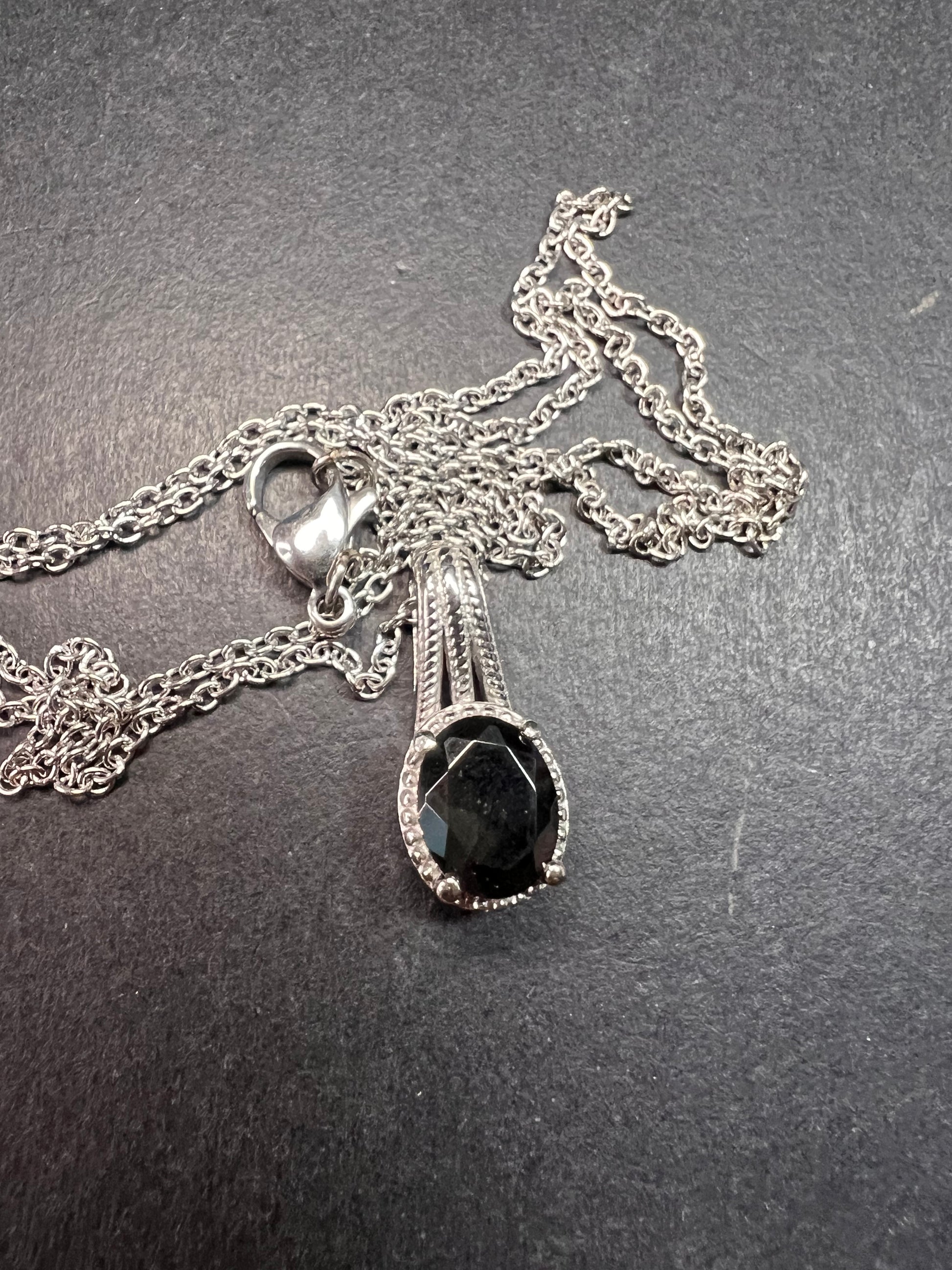 Genuine black tourmaline gemstone prongset in a stainless steel pendant with 20 inch chain with lobster claw clasp. Made in India.