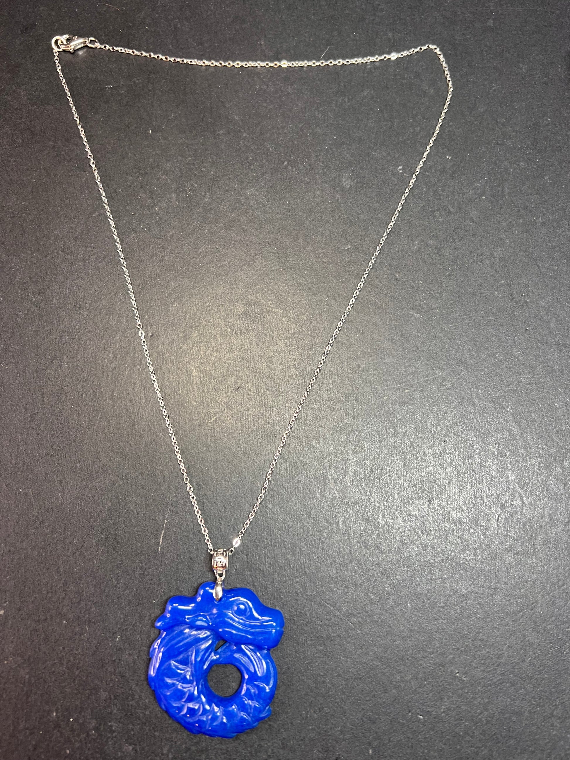 Genuine jade carved dragon that’s been dyed blue. 925 sterling silver bale and 20 inch 925 sterling silver chain with lobster claw clasp plated with rhodium. Estimated retail value is $410. Djoy.